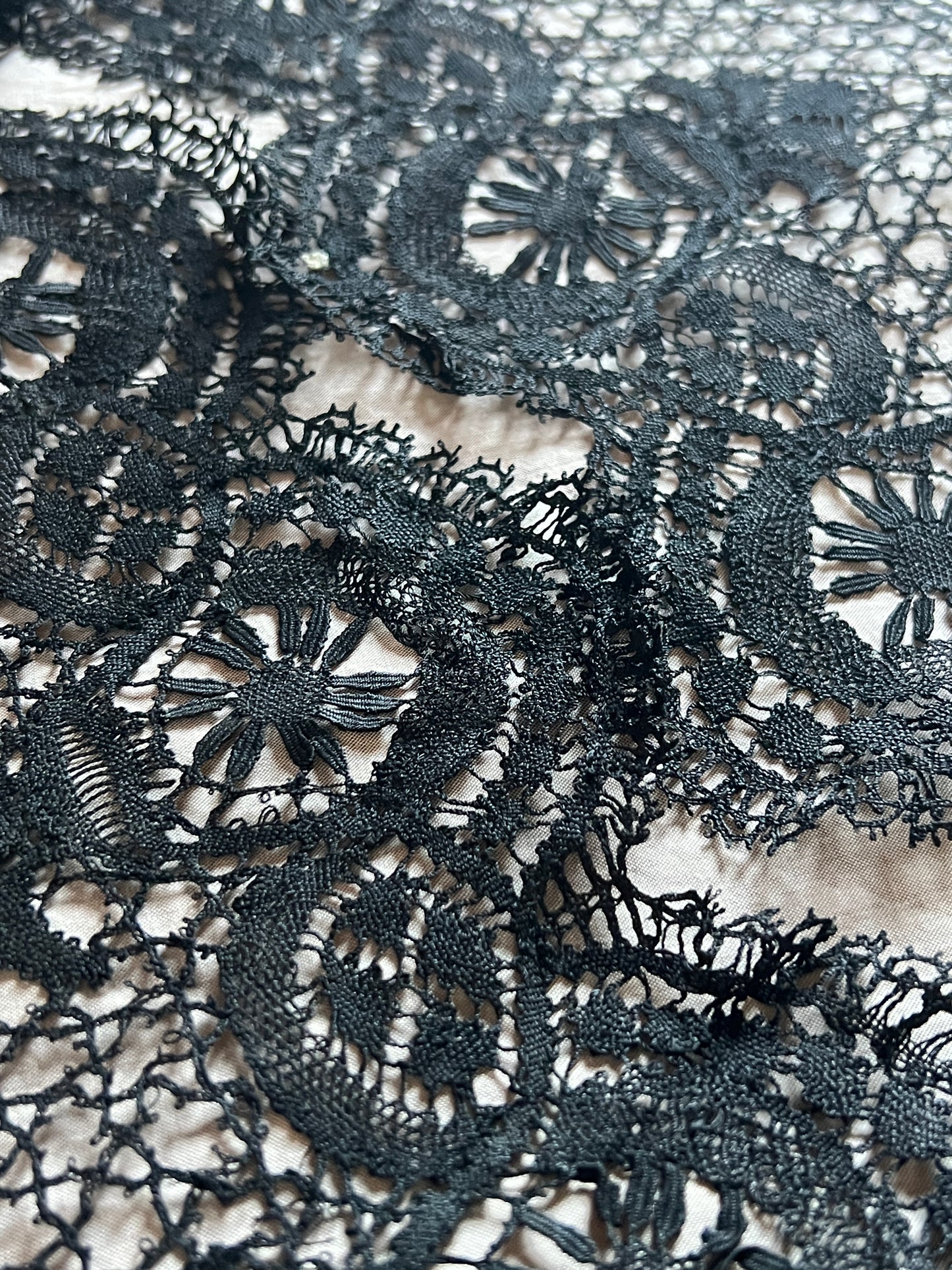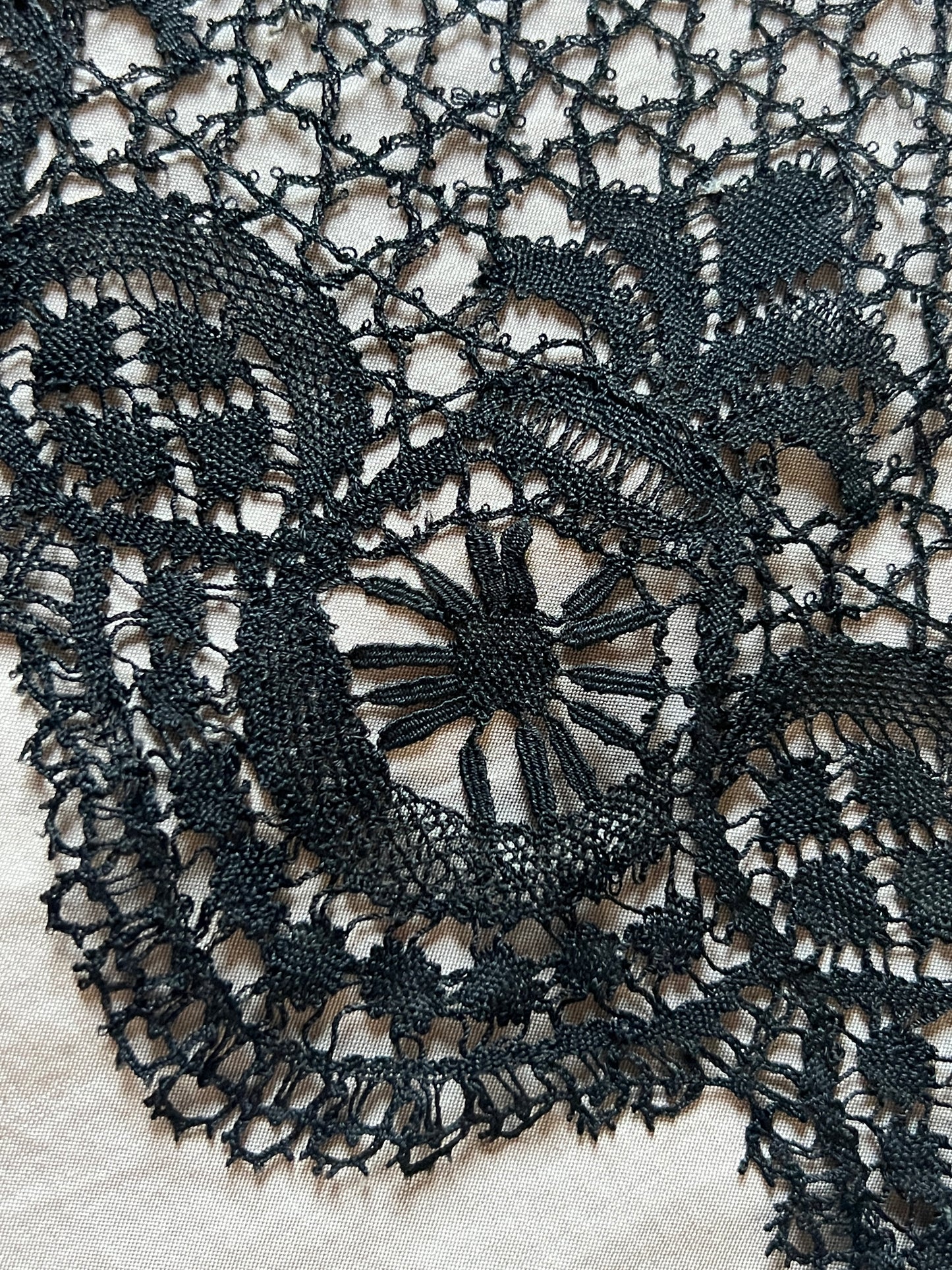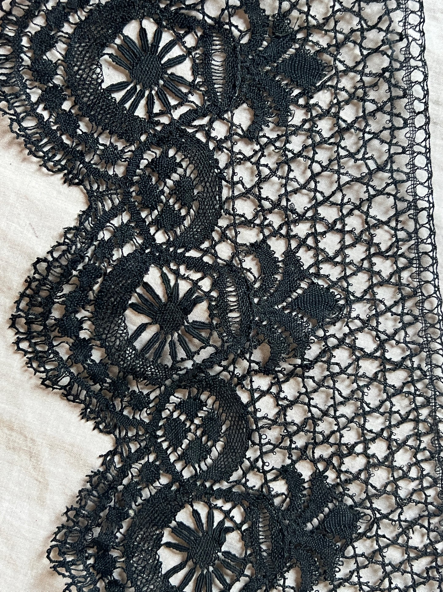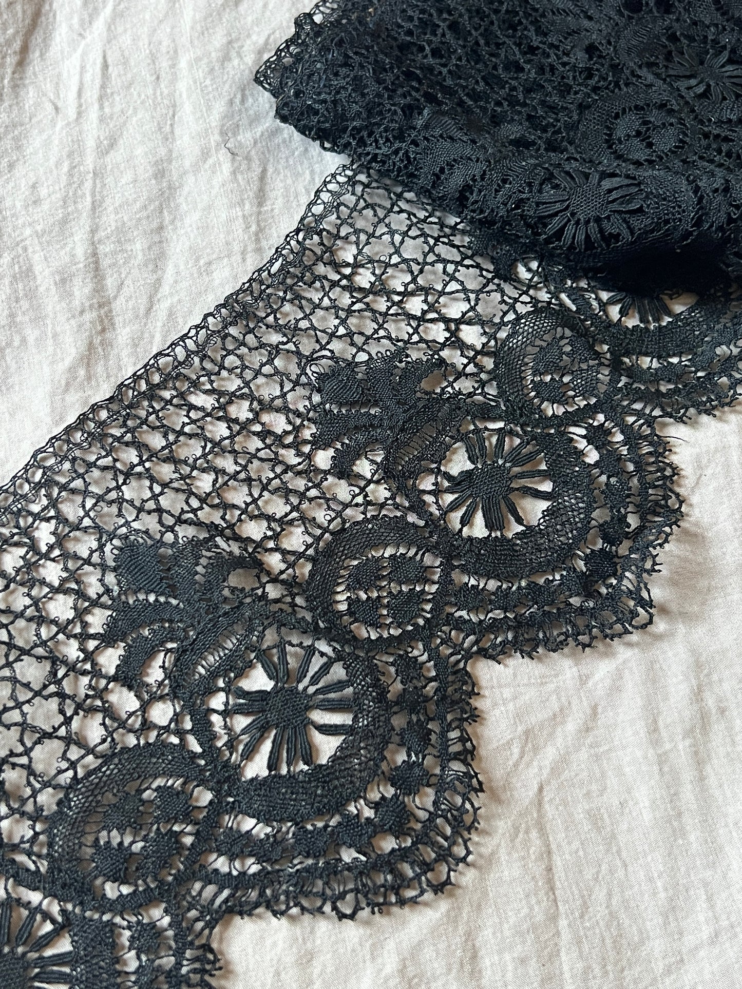 14.5cm幅×220cm 50gh スカラップの縁取りが美しい黒のボビンレースです。 幅広で存在感がある、ドレスの裾を飾っていたレースです。
