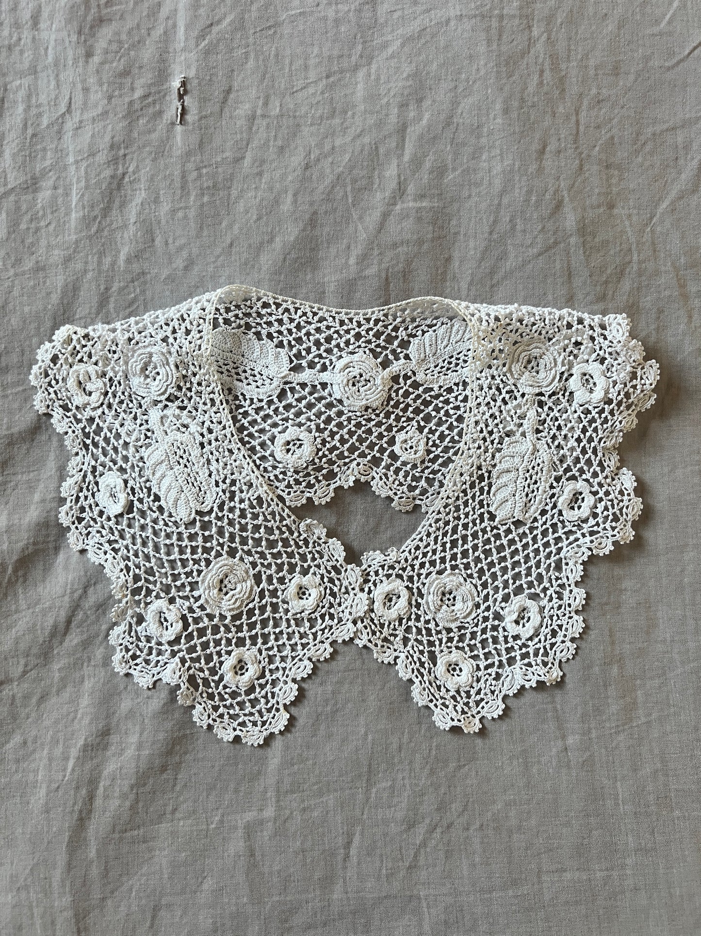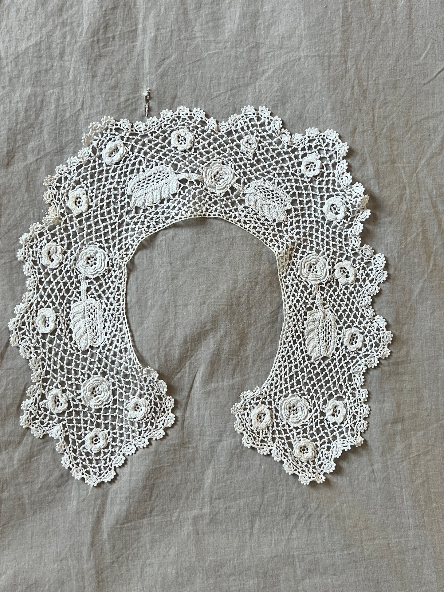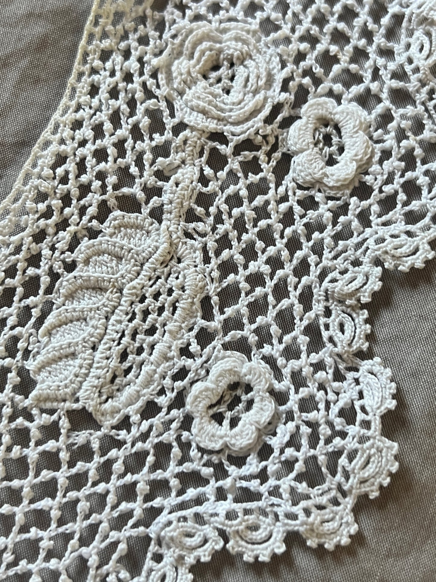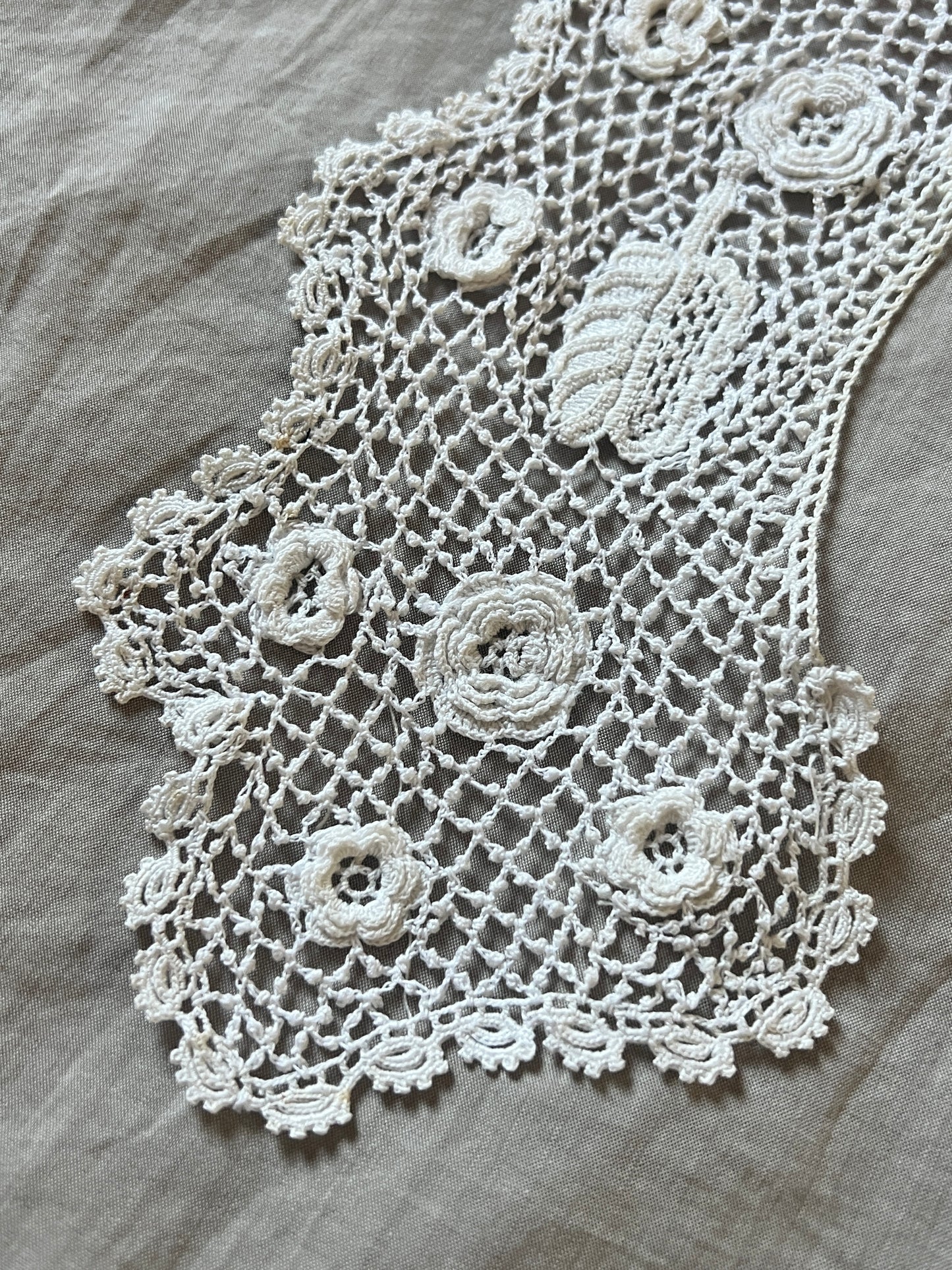 立体的な花びらや葉のモチーフでデザインされたアイリッシュクロシェレースの飾り襟。