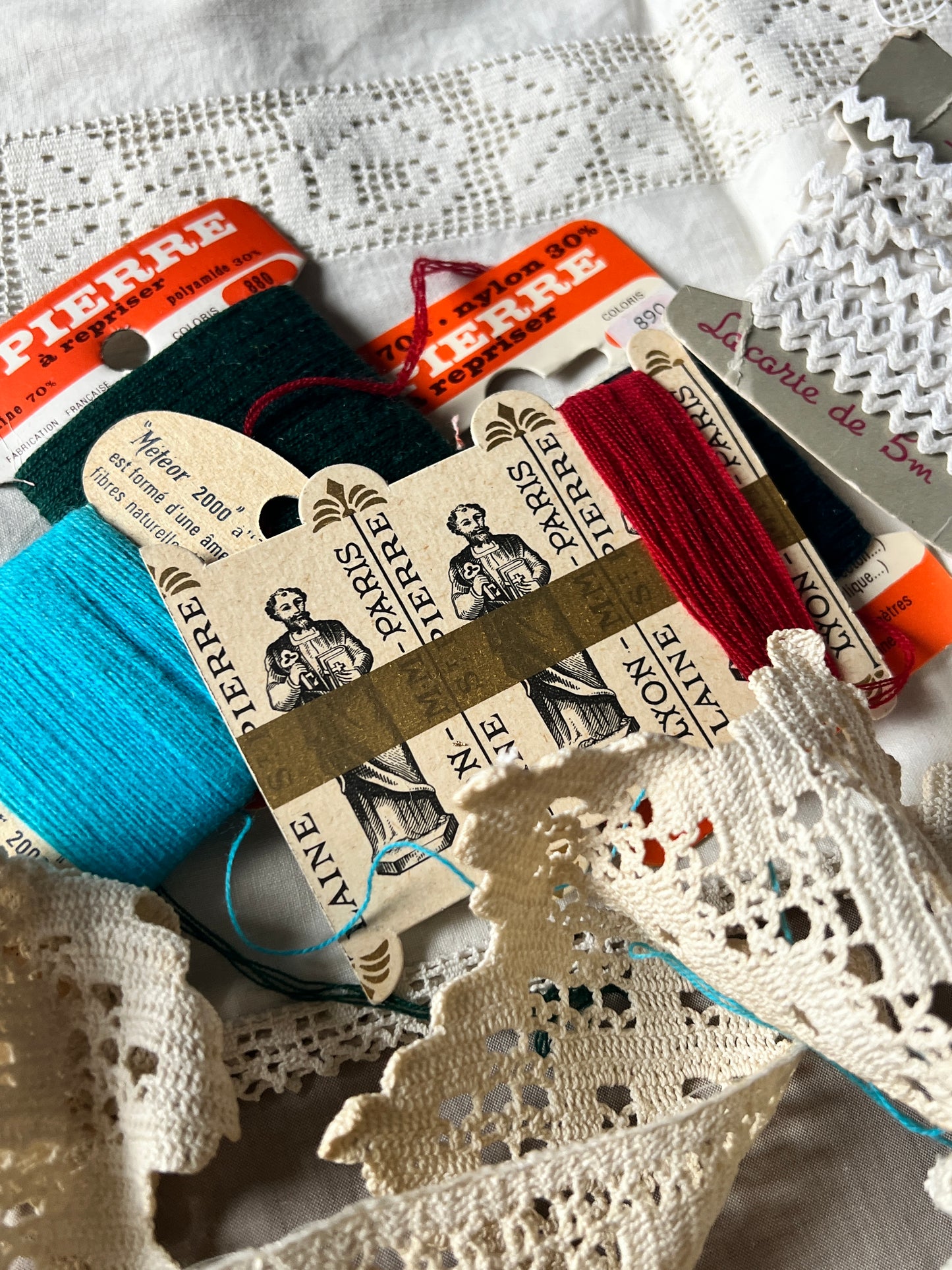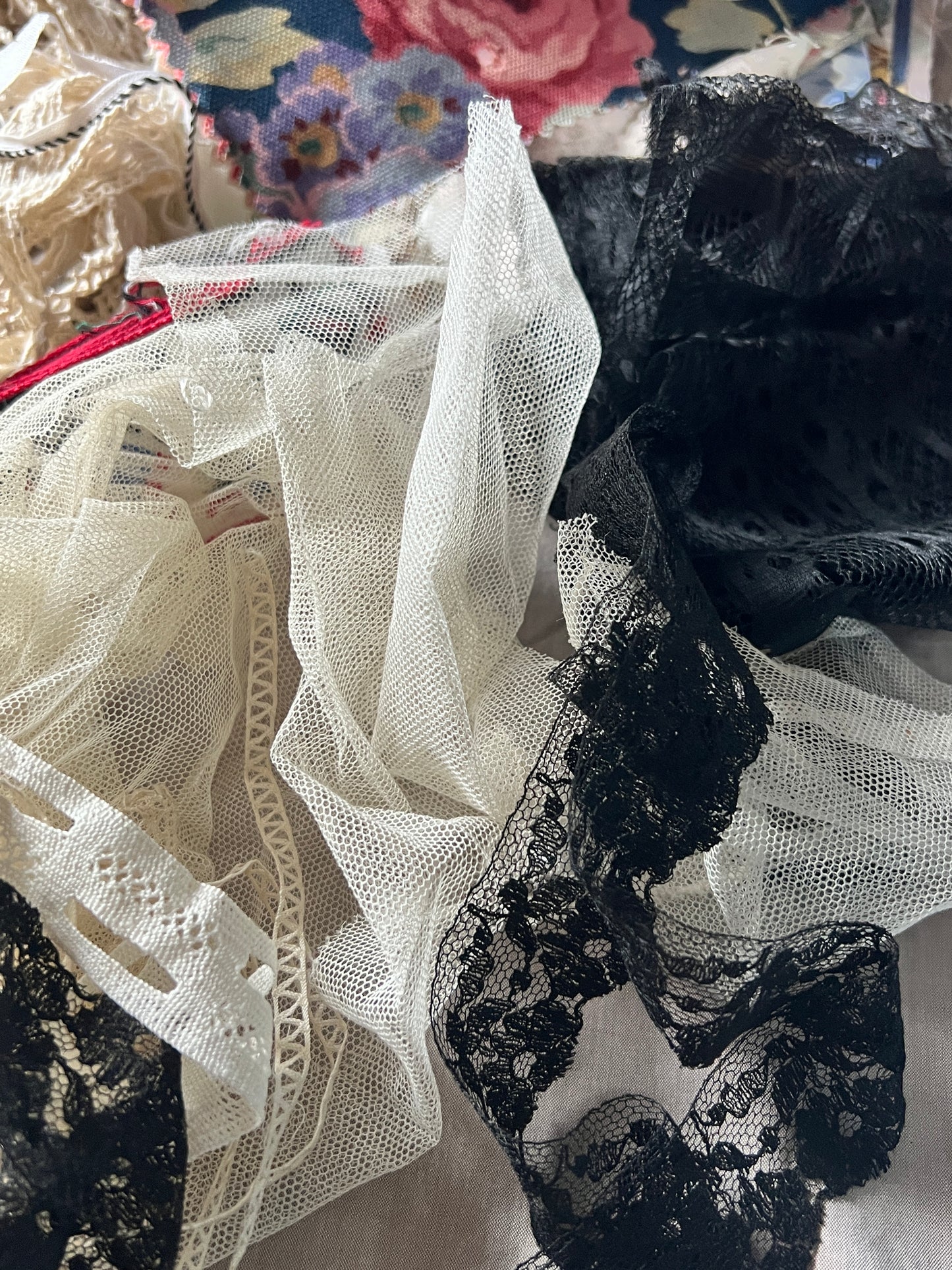 レースの切れ端や刺繍リネンの端布、ダメージ品などを袋詰めにしています。