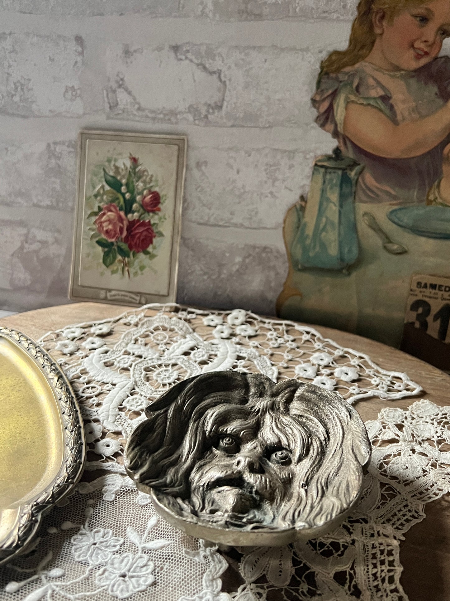 毛むくじゃらな犬の顔を形どった真鍮製のトレイです