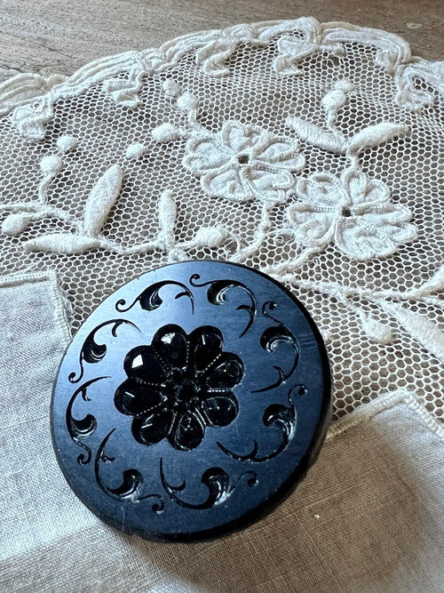 黒ガラスに繊細な細工が施されたボタンです。 19世紀のヴィクトリアン期にフレンチジェットと呼ばれ人気があったタイプです。