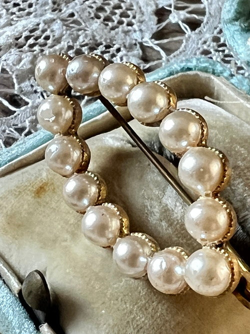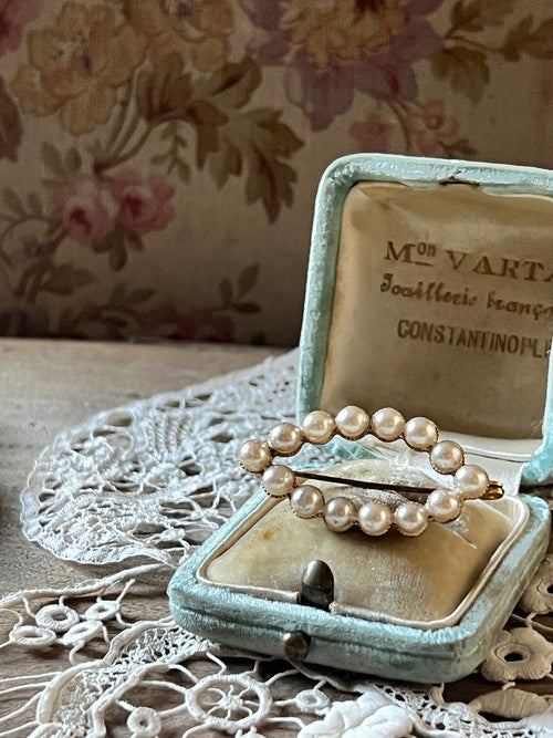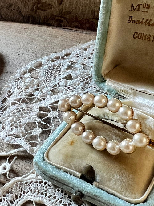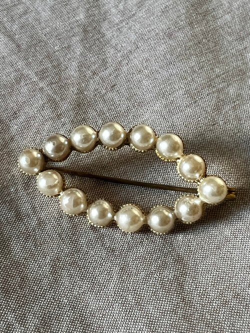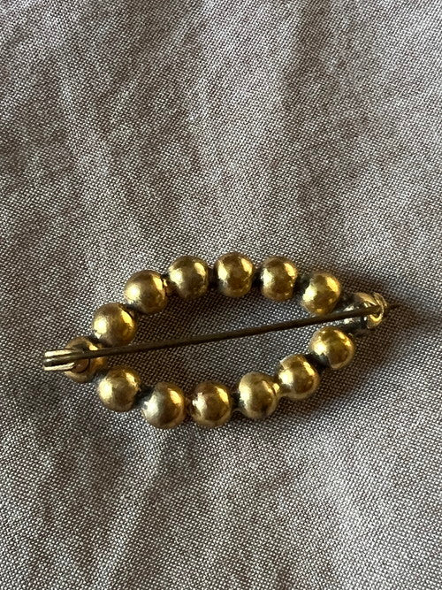 木の葉型に行儀よく並べられたパールがかわいらしいブローチ。