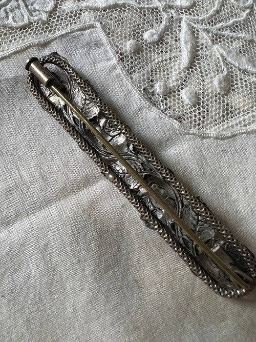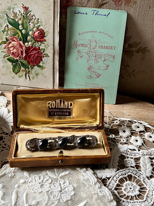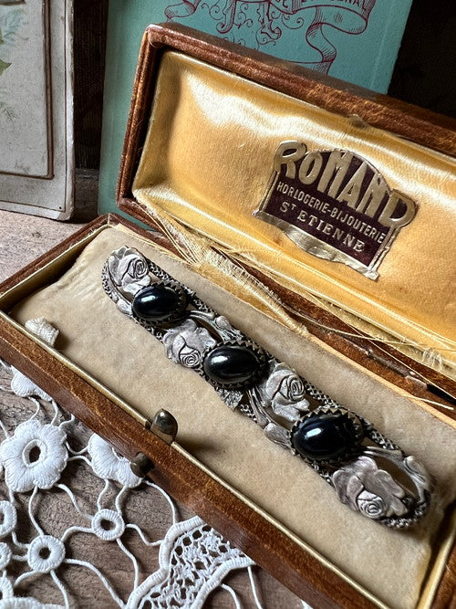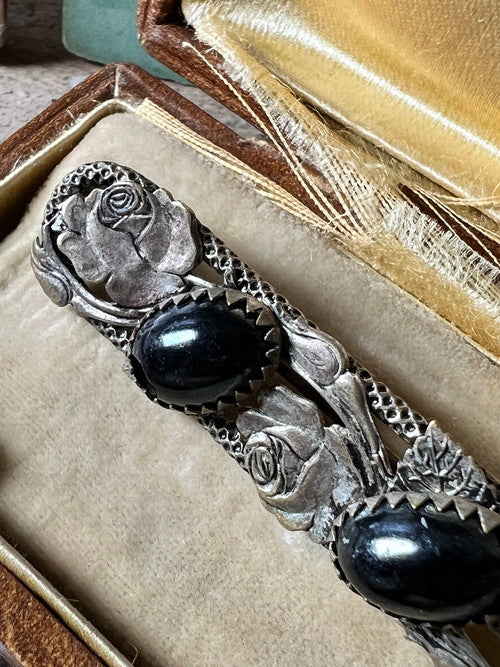7cm×1.2cm 薔薇の模様の台座に黒いカボッションパーツが嵌め込まれたシックで上品なブローチです。カボッションのひとつにカケがあります。