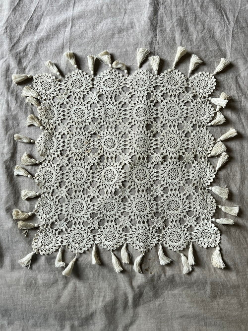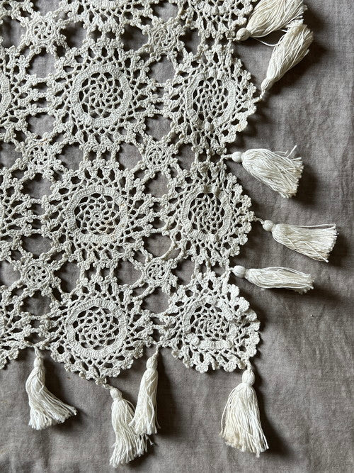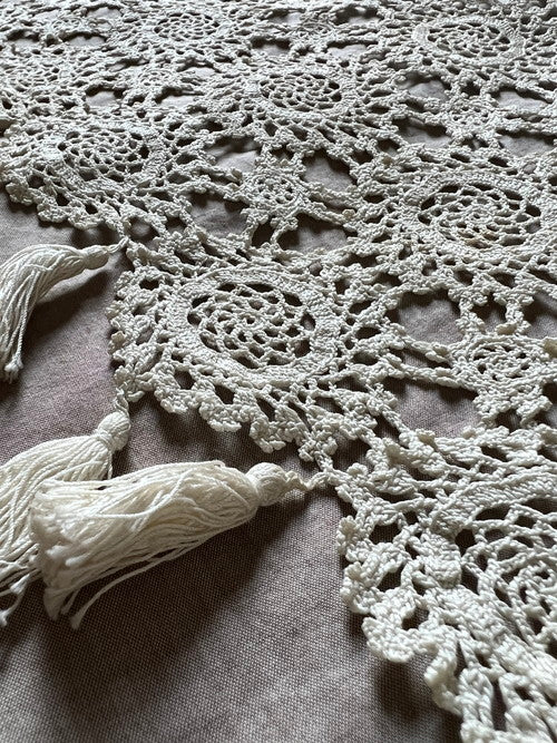 周囲の房飾りが美しいクロシェモチーフのクロスです。