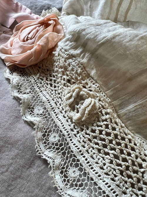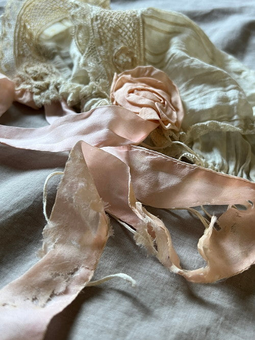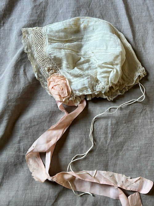 淡い桃色のリボンのお花がかわいらしいボネです。