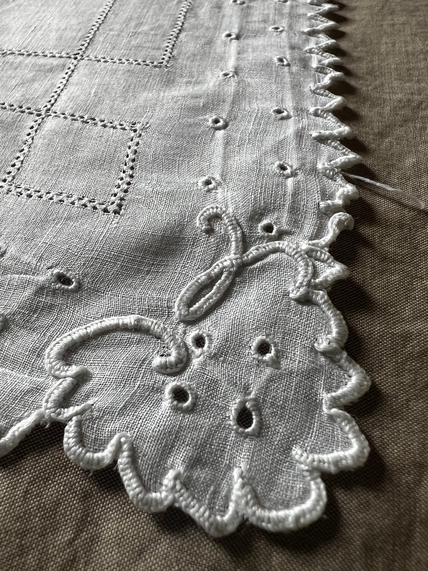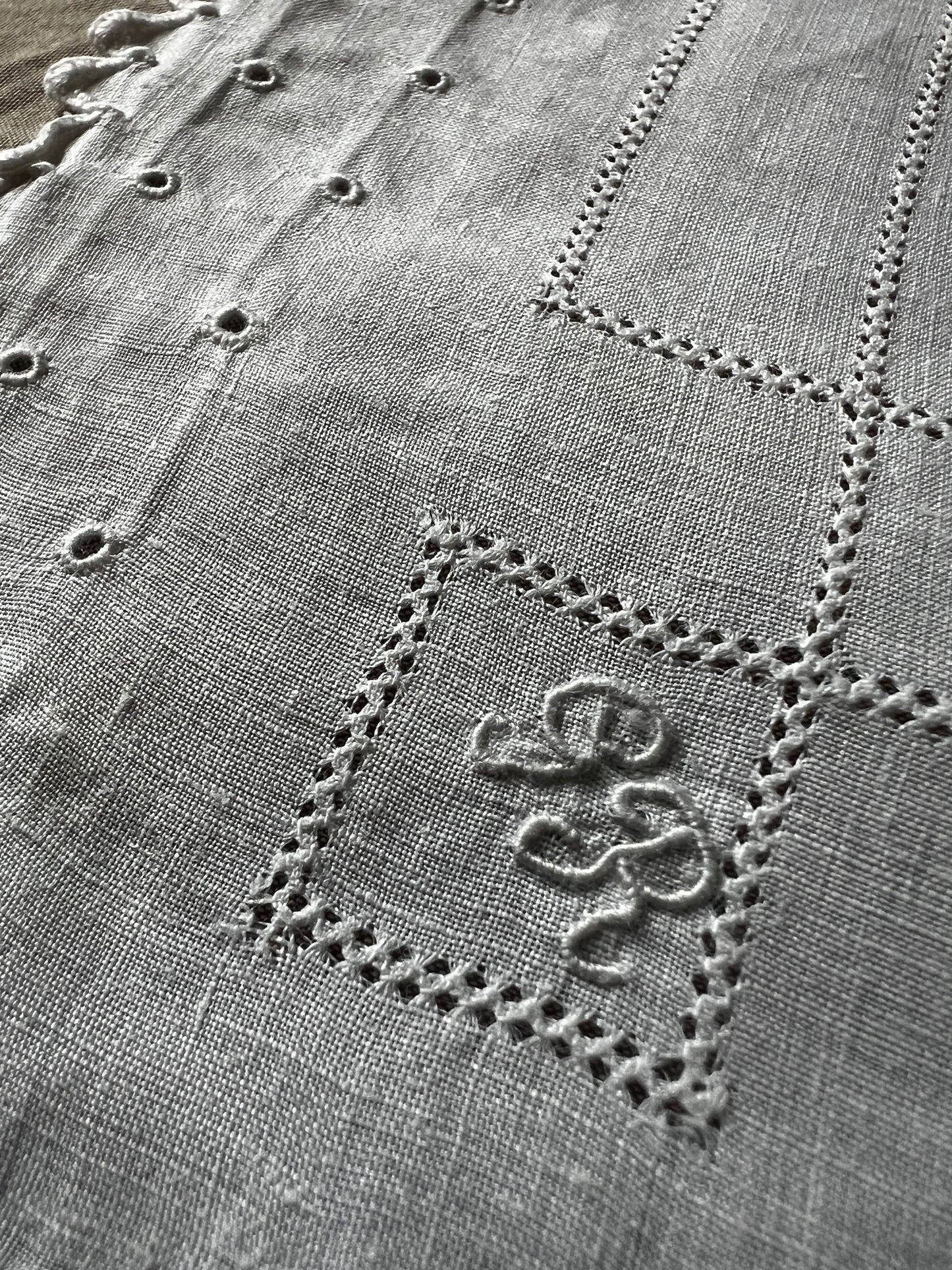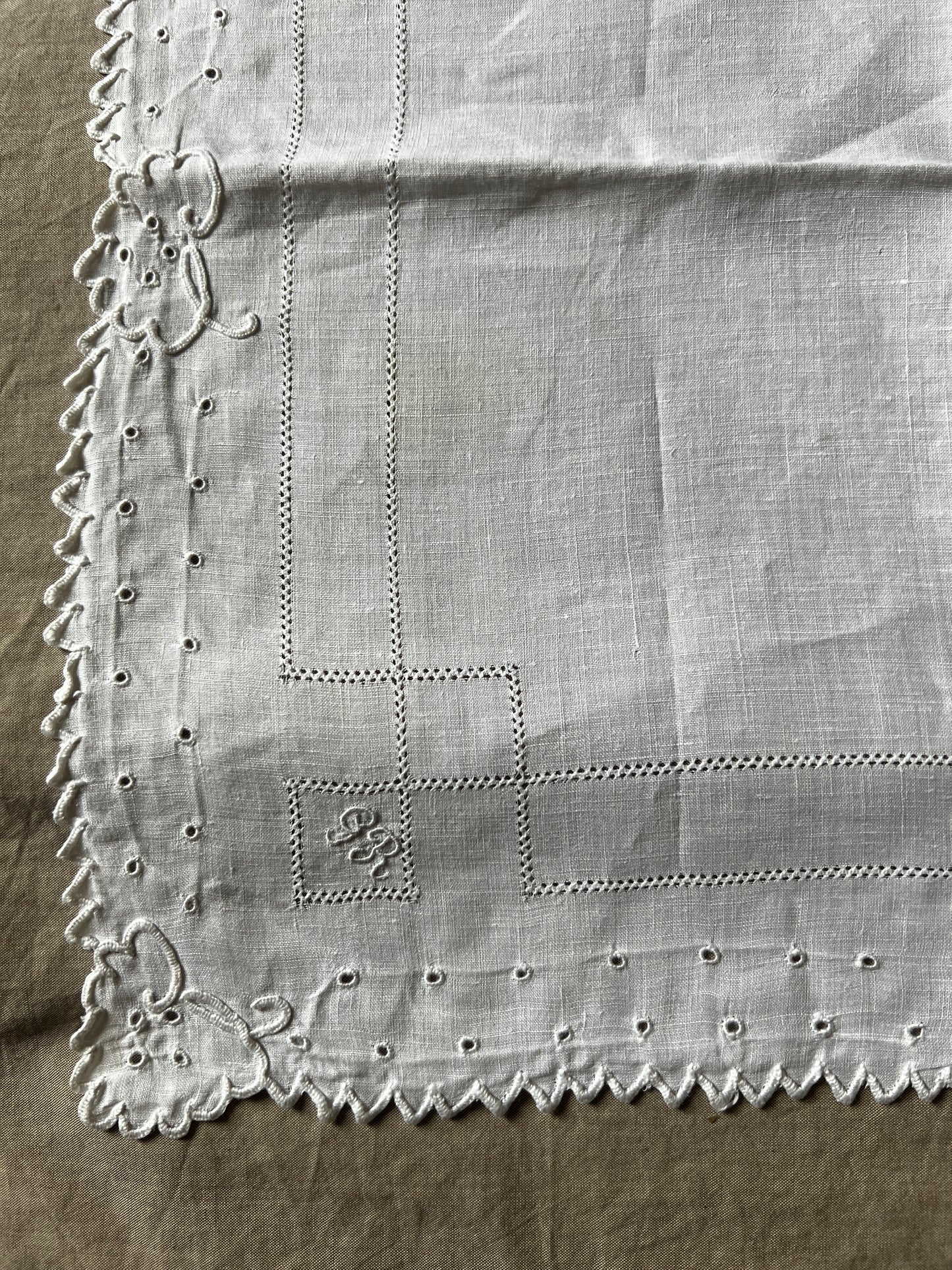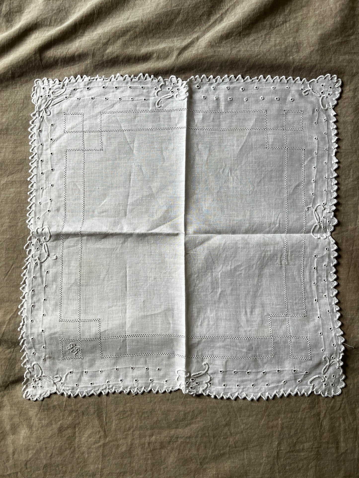 葉っぱのような縁取りの刺繍と小さなイニシャル刺繍がかわいらしい雰囲気です