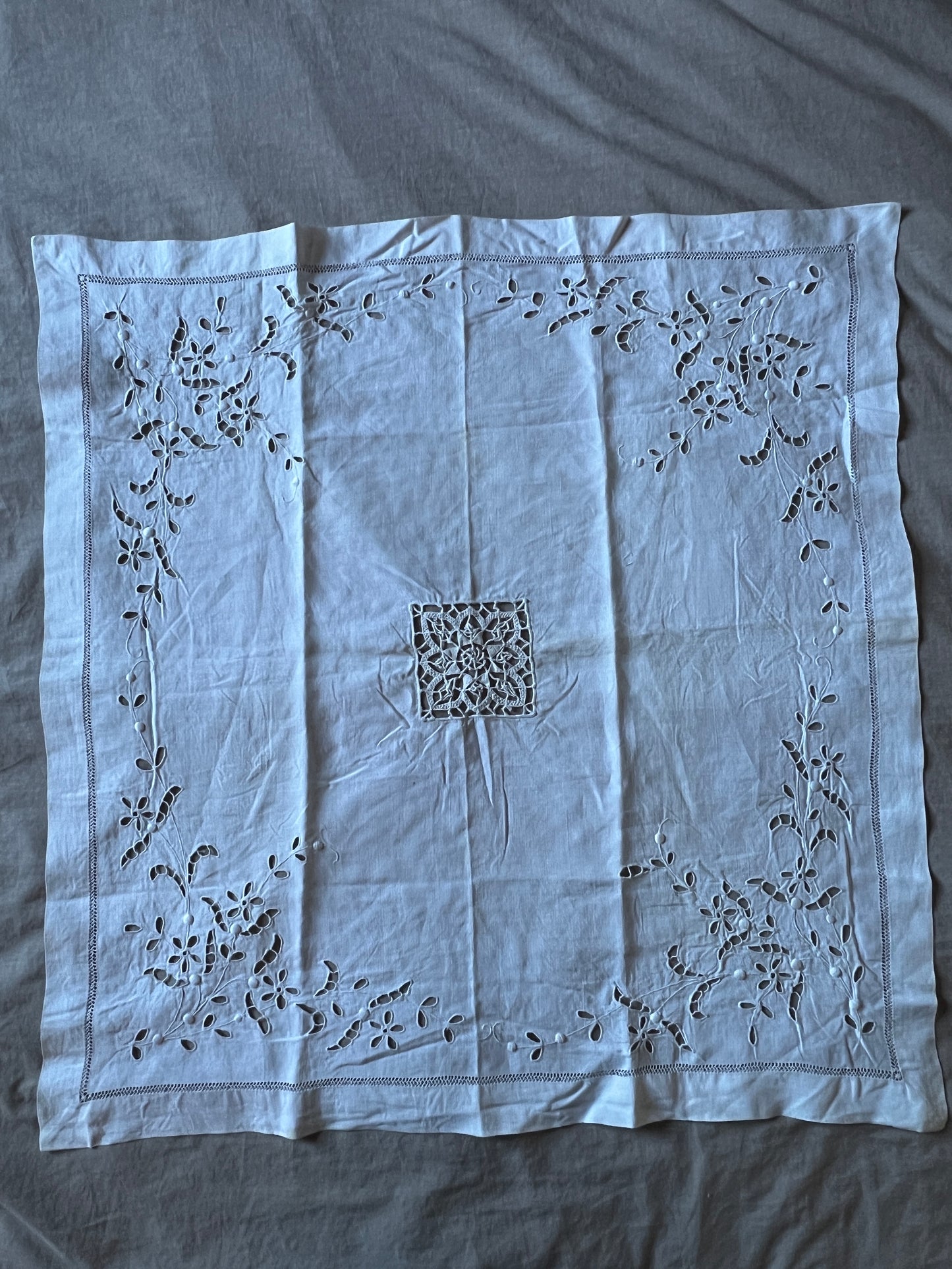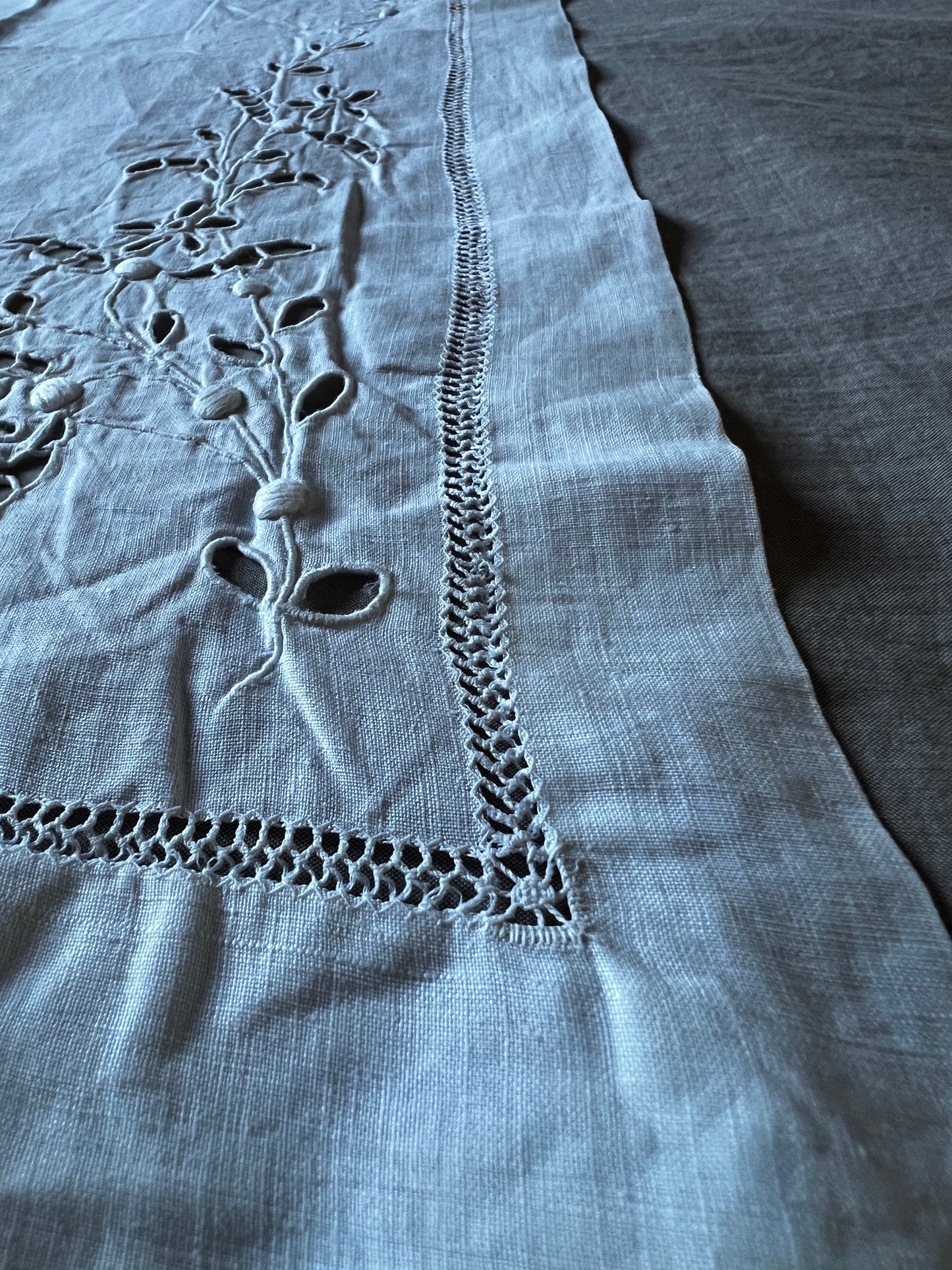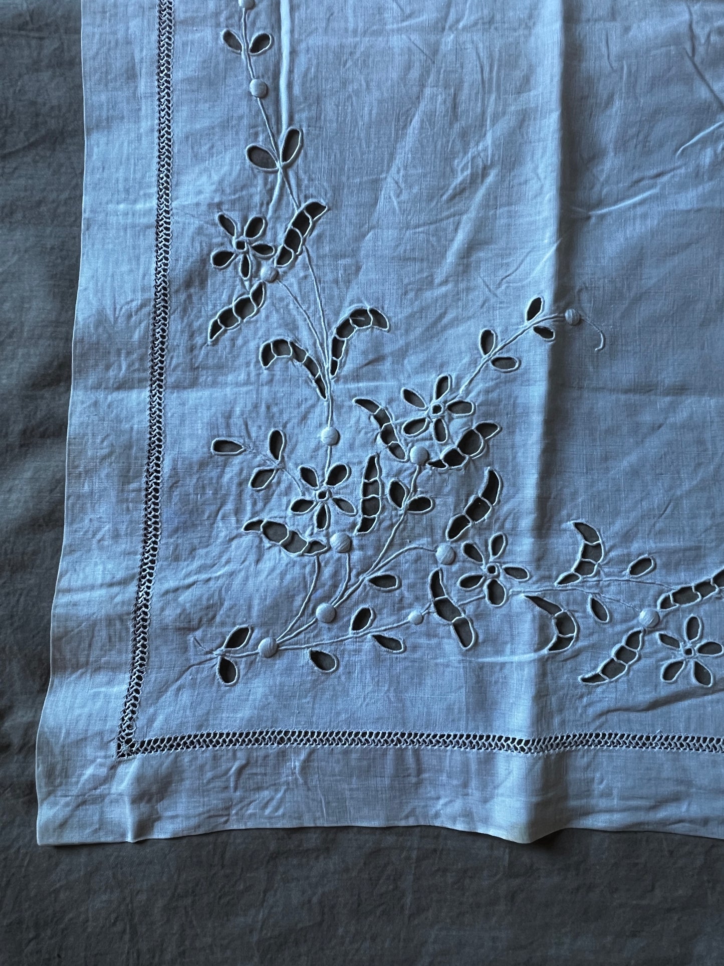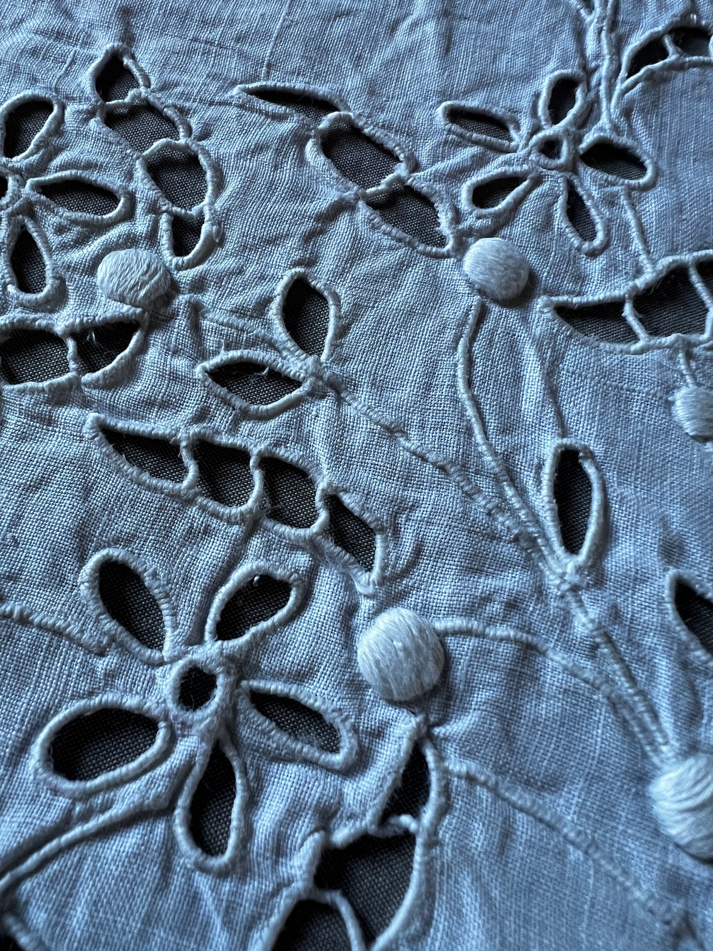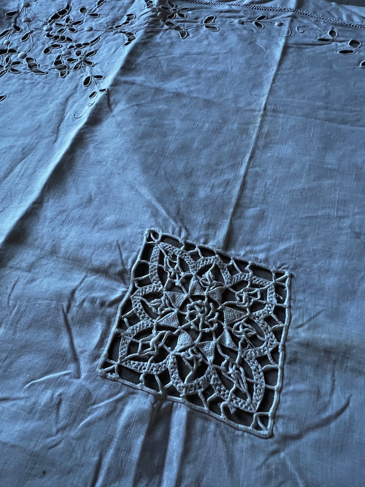 中央にニードルレースのモチーフがインサートされており、周囲はカットワークとドロンワークでデザインされています