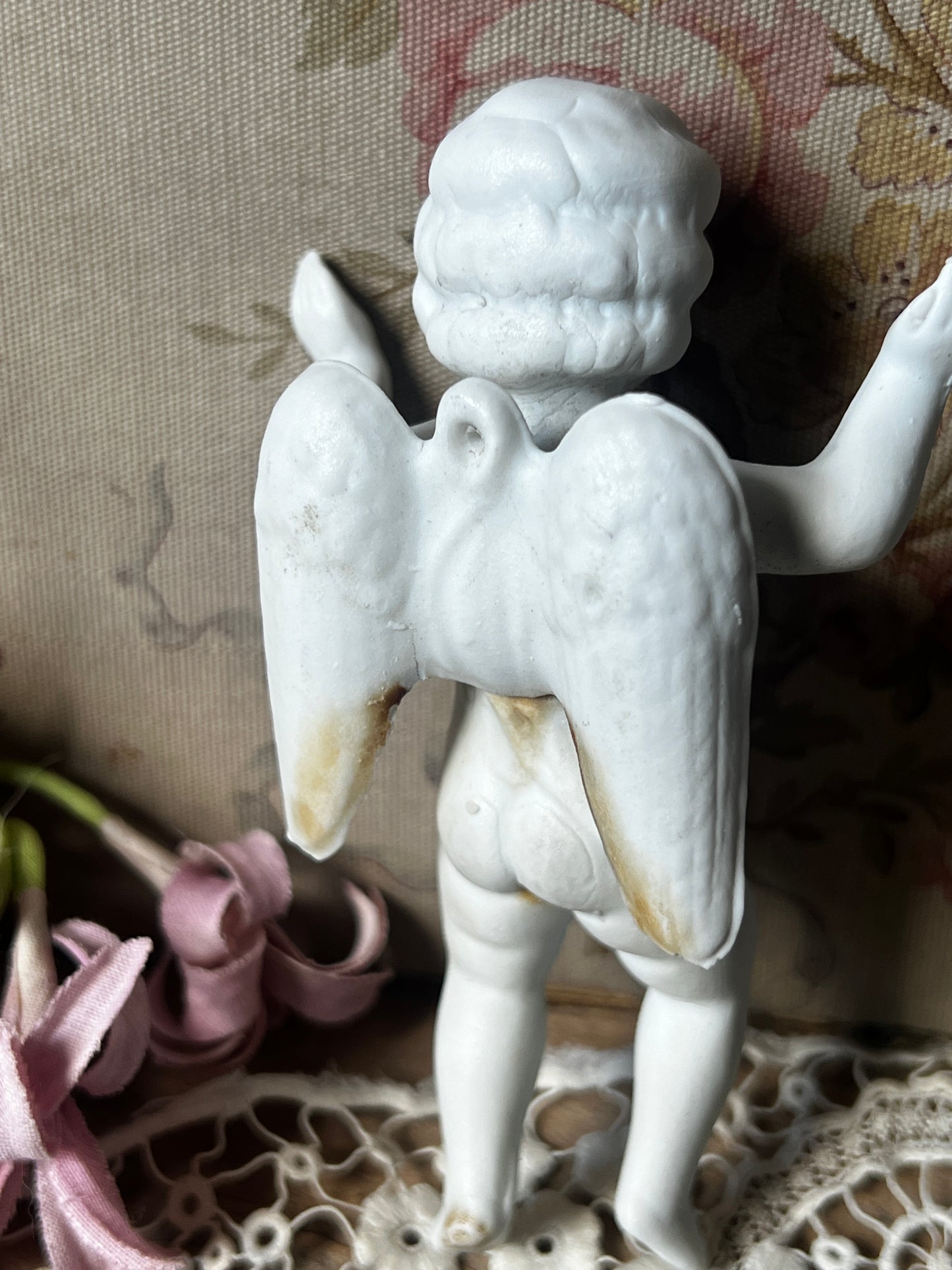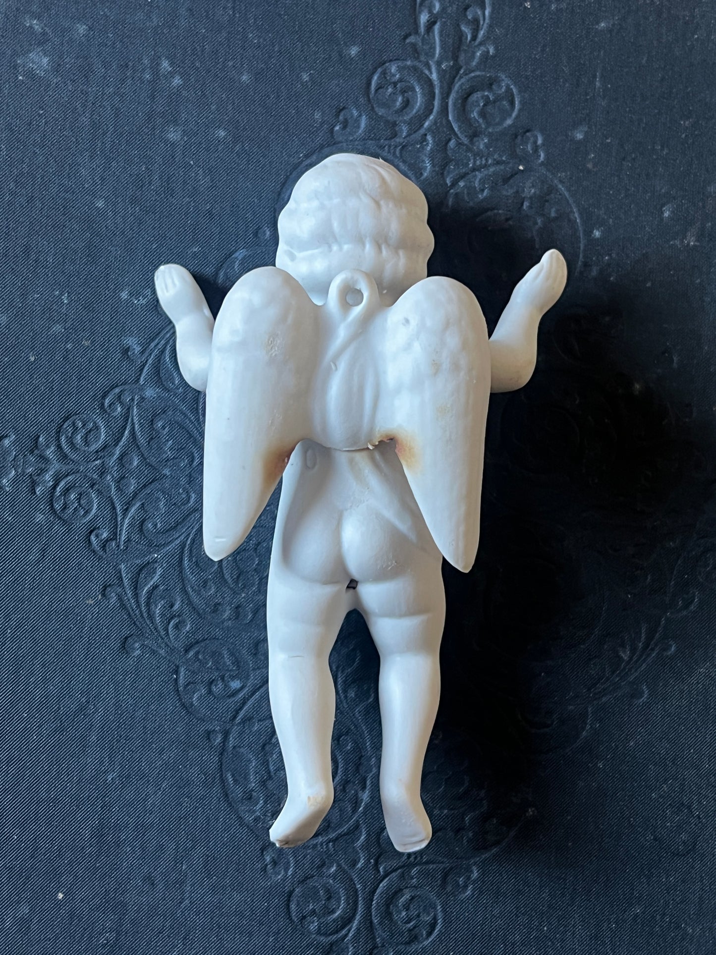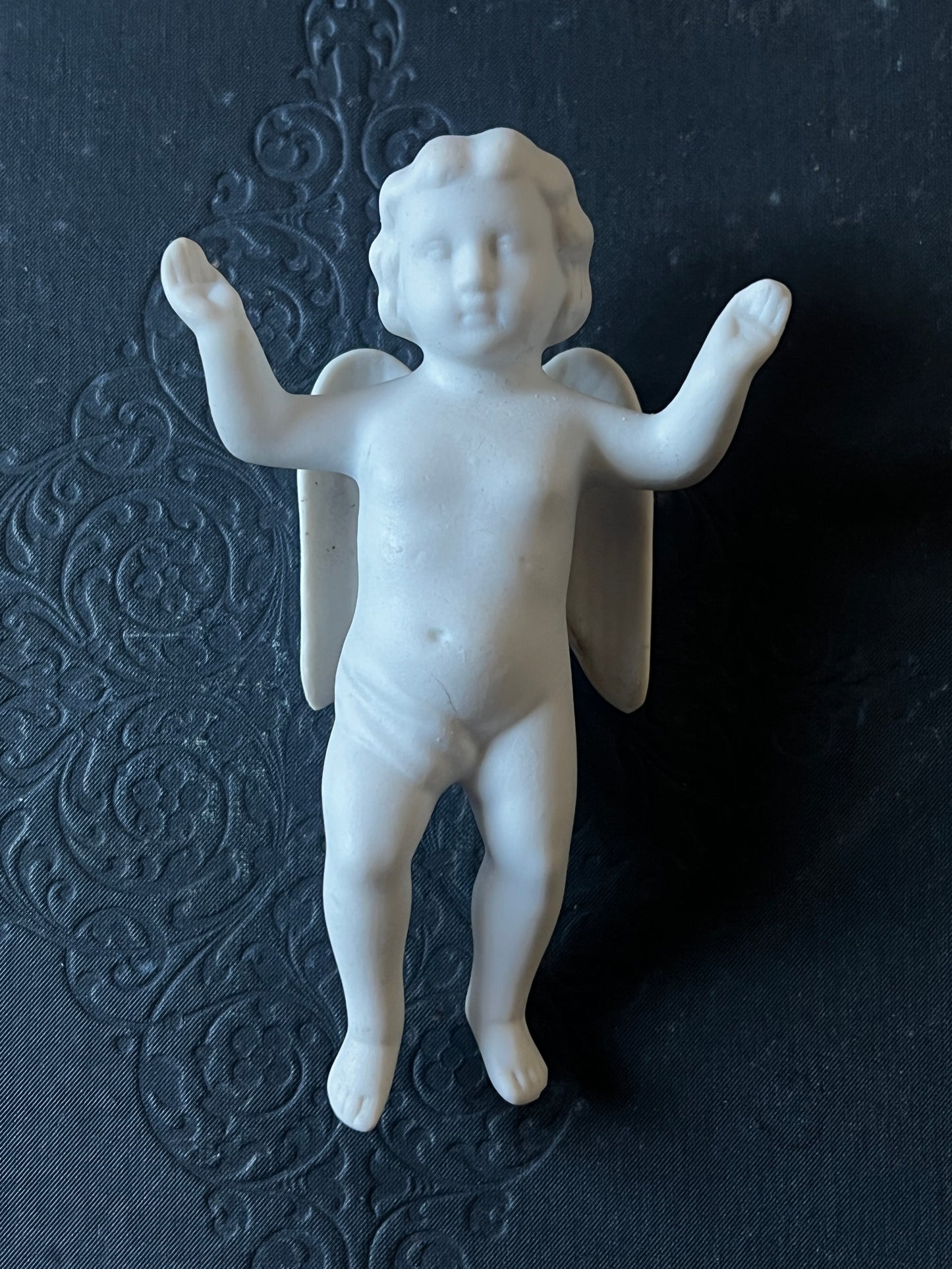 両手を広げ掲げたポーズの天使をかたどった飾りです。背面の羽の部分に壁掛け用の穴があります。背面にやや汚れが残っていますがお顔などはきれいな状態です。※天使1体ずつの販売です。