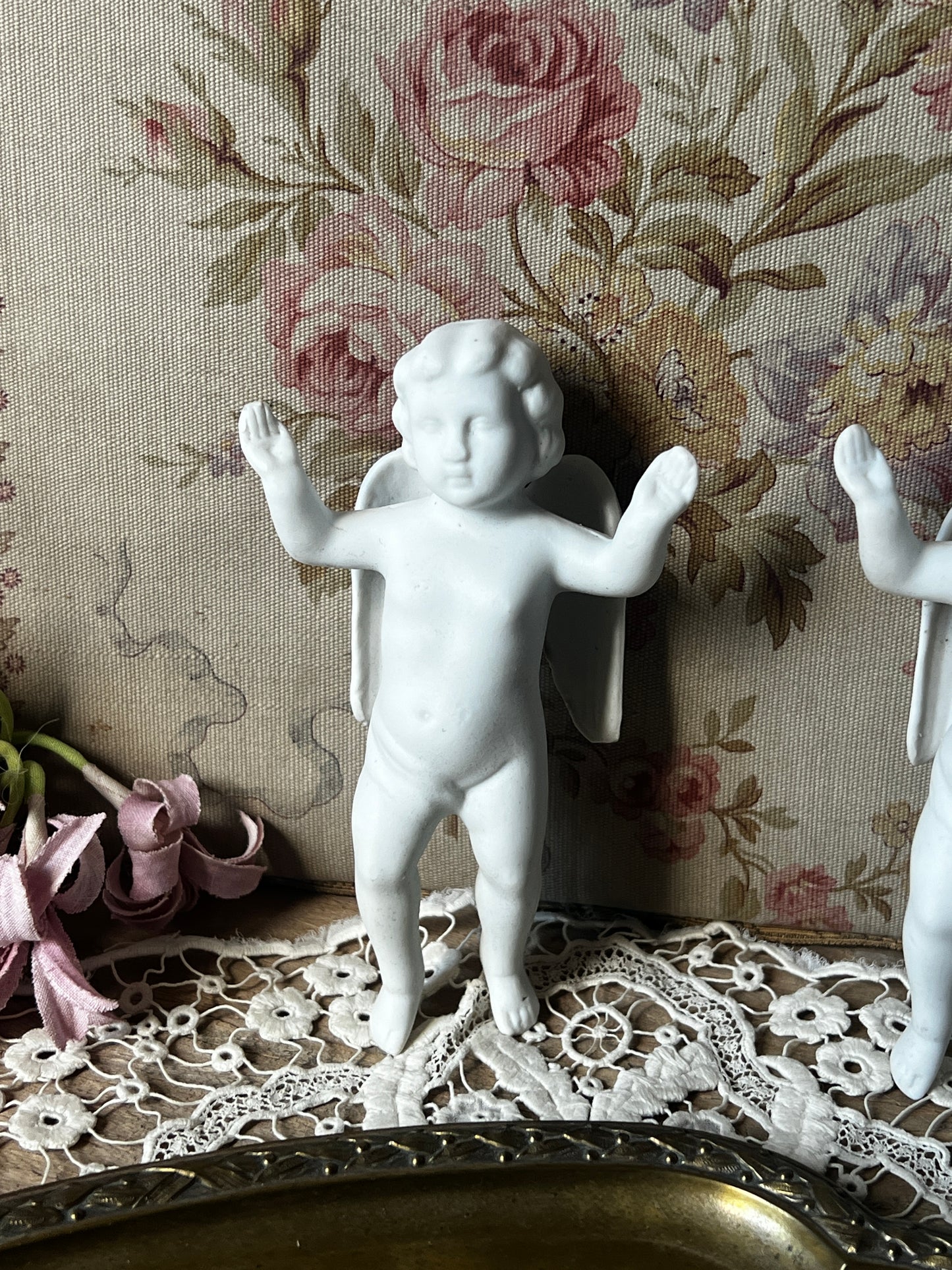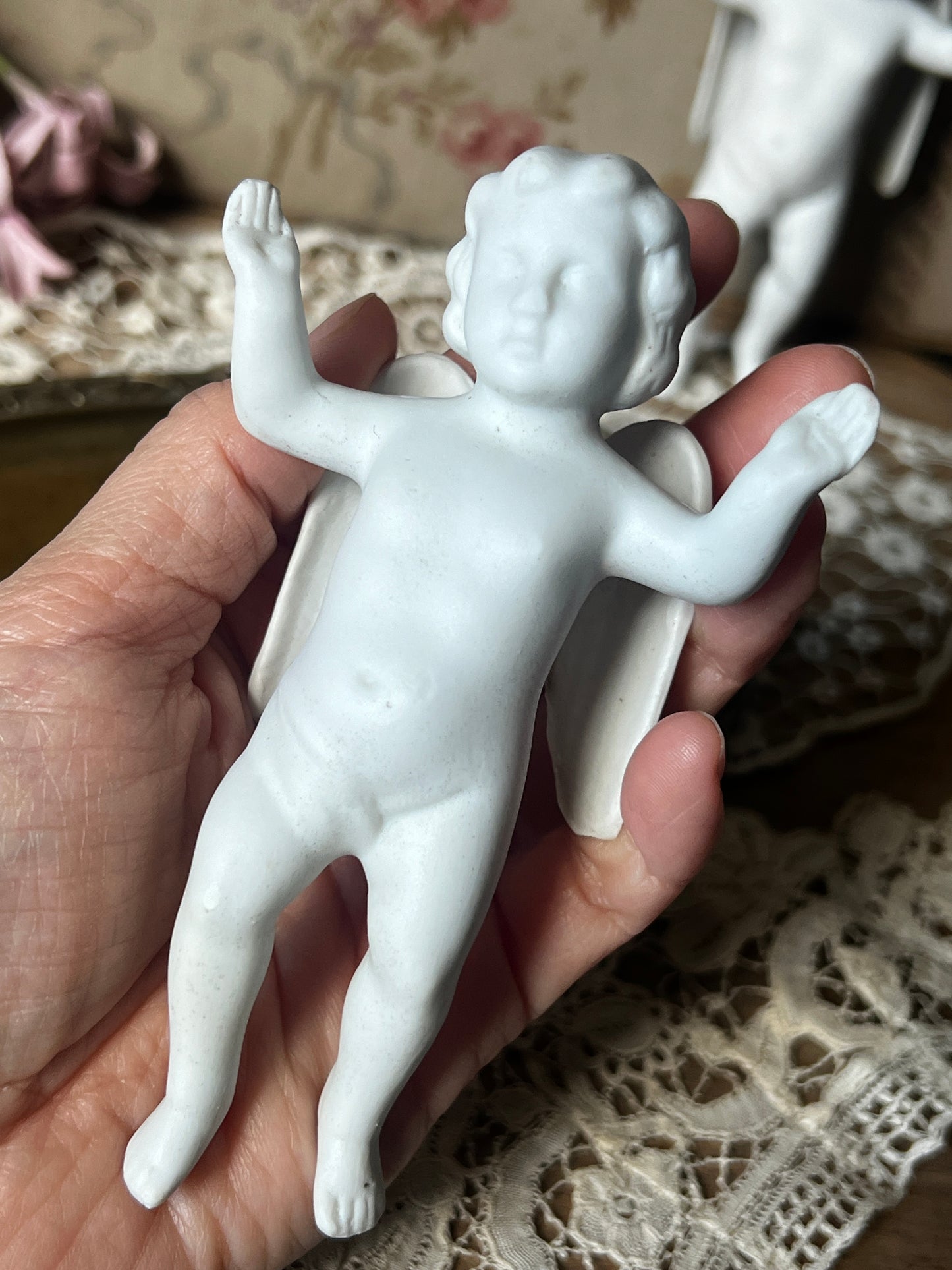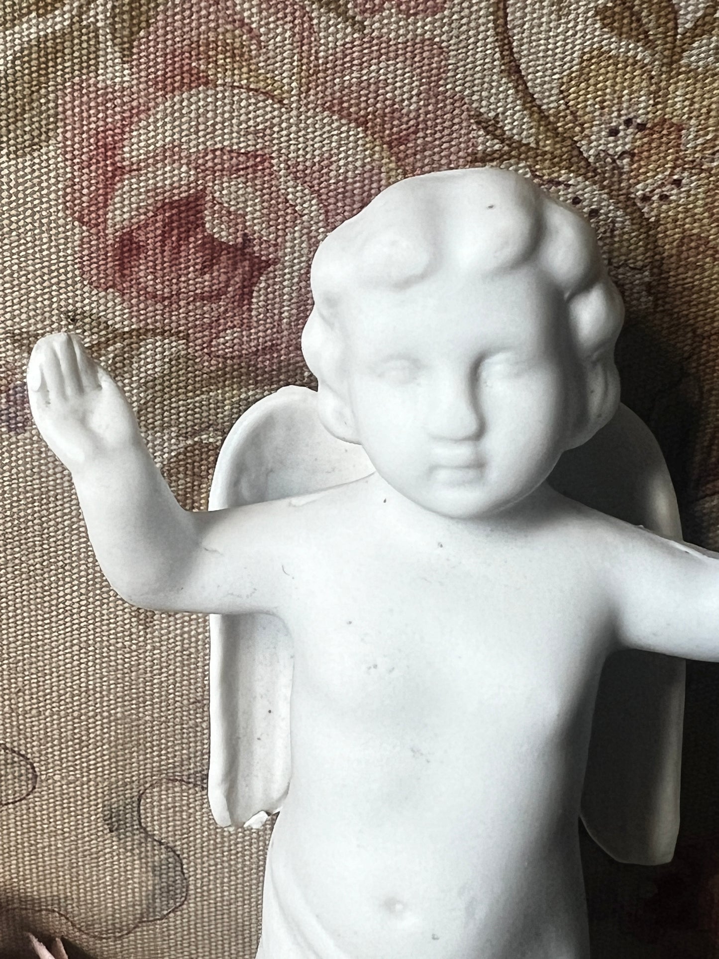 両手を広げ掲げたポーズの天使をかたどった飾りです。背面の羽の部分に壁掛け用の穴があります。背面にやや汚れが残っていますがお顔などはきれいな状態です。※天使1体ずつの販売です。