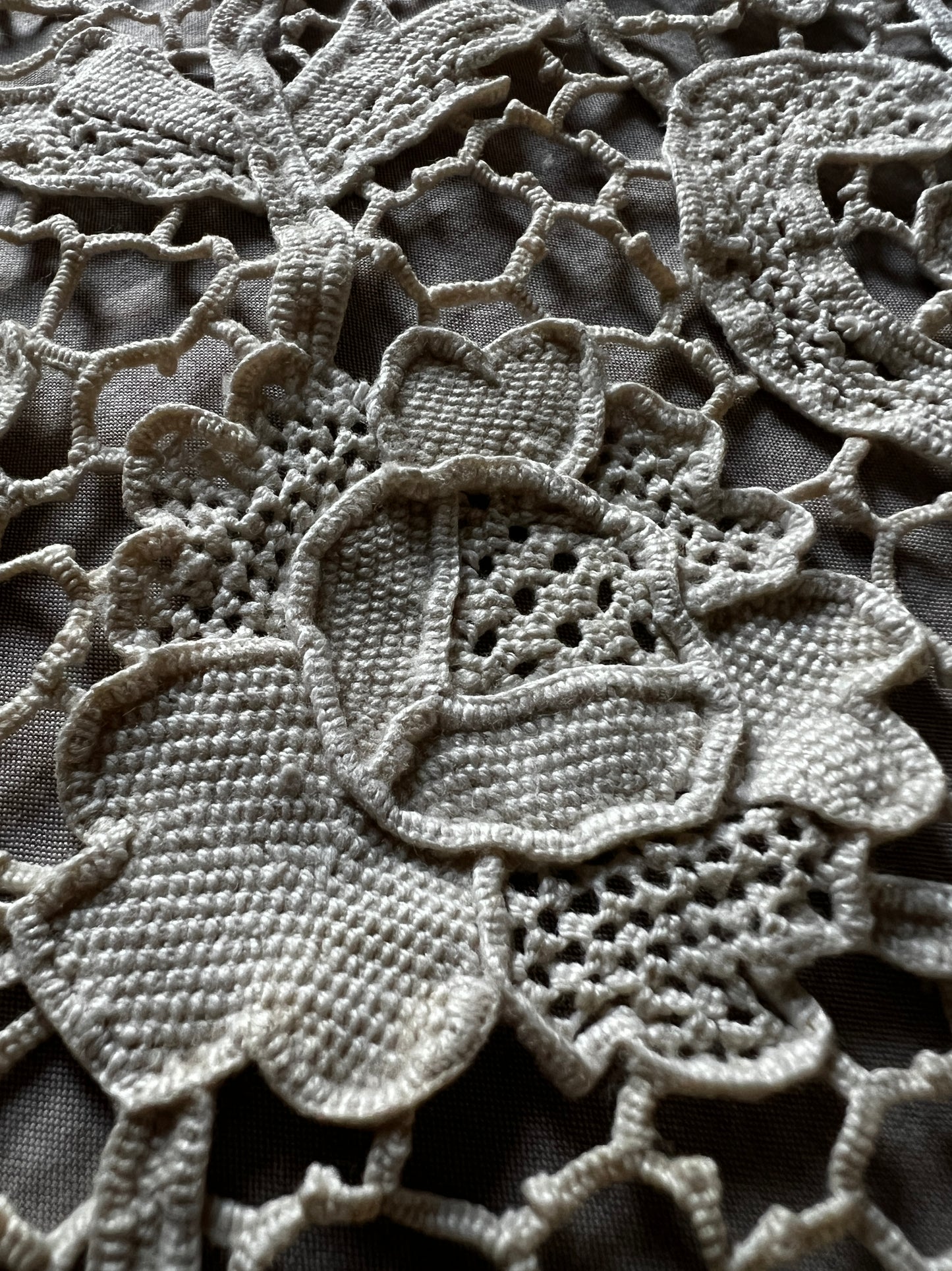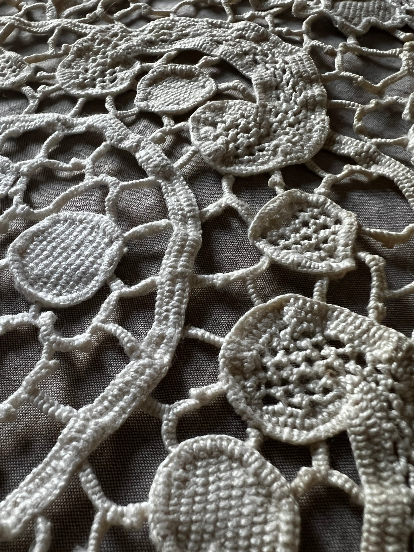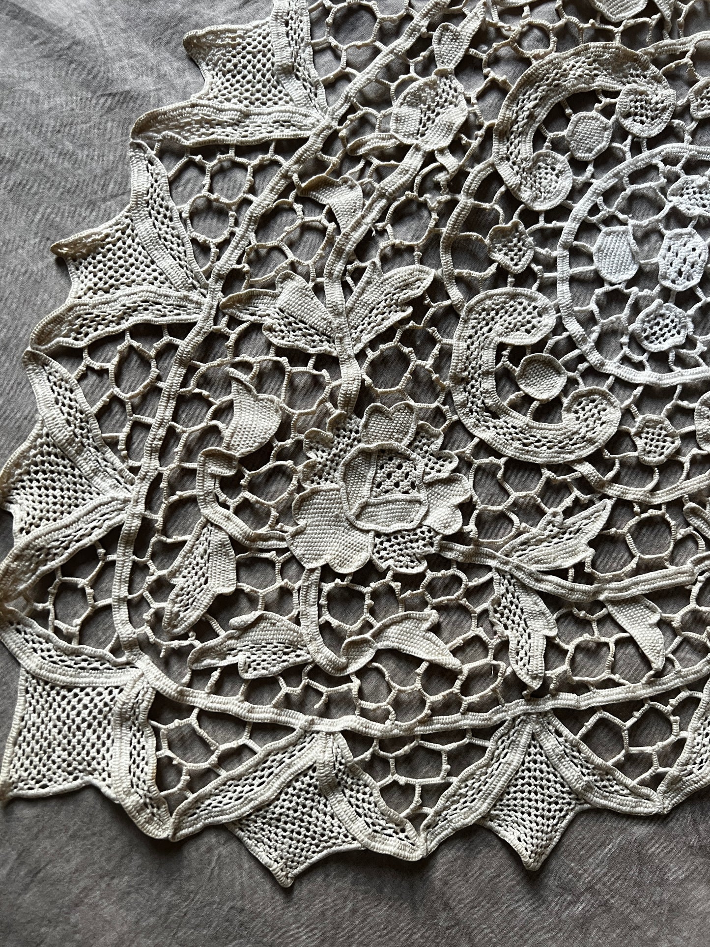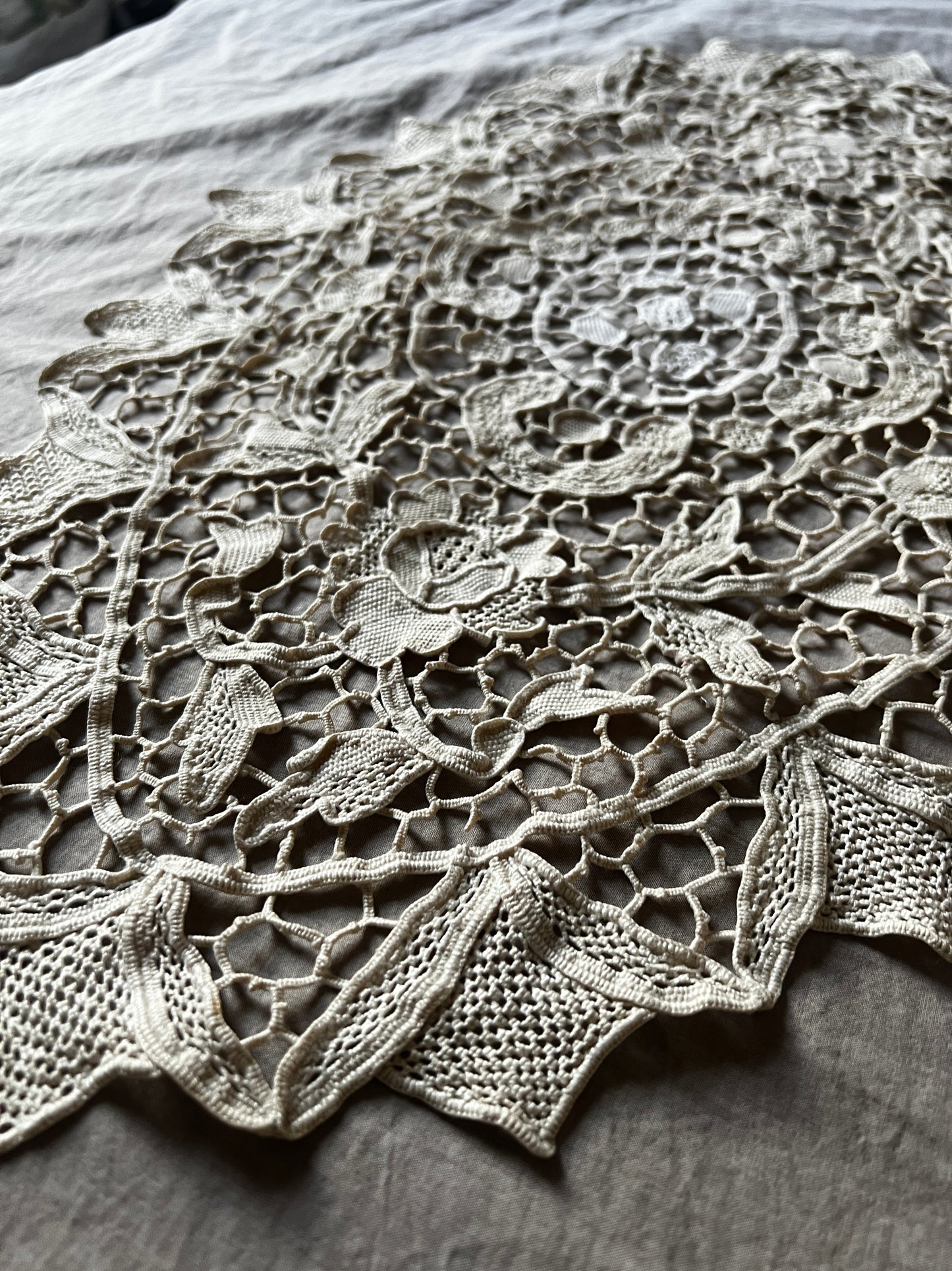 密なステッチで仕上げられたニードルレースのオーバル型クロスです