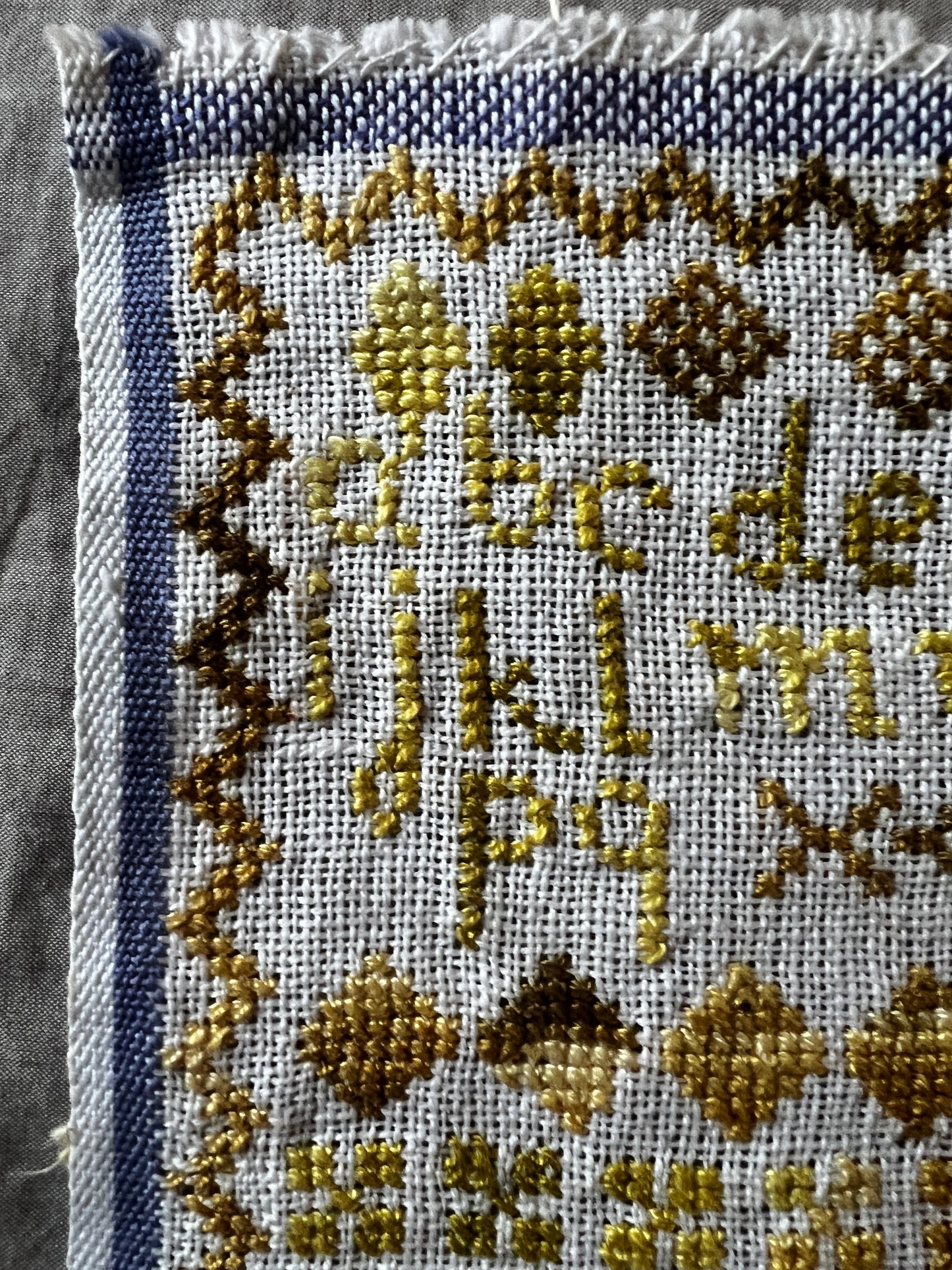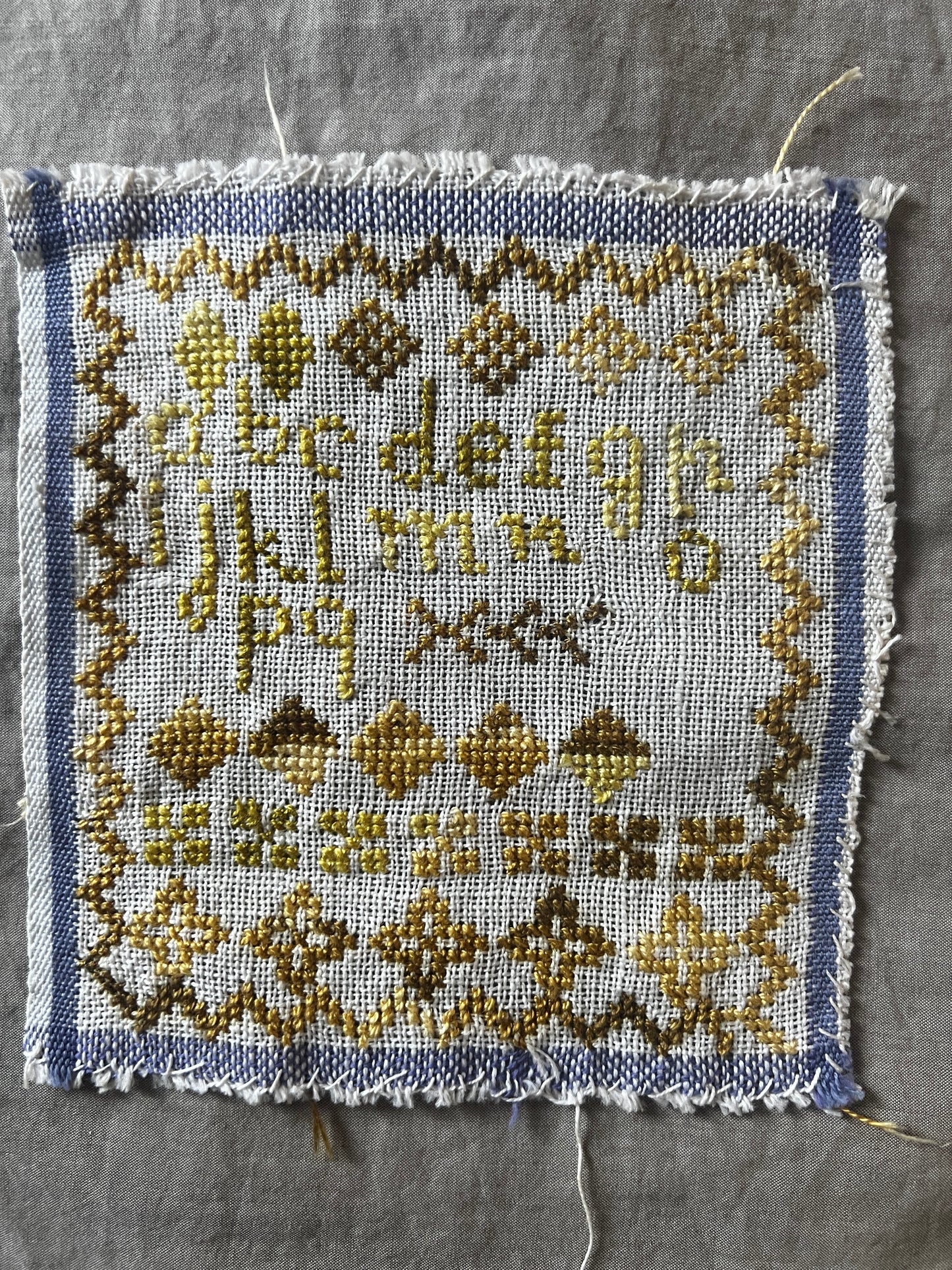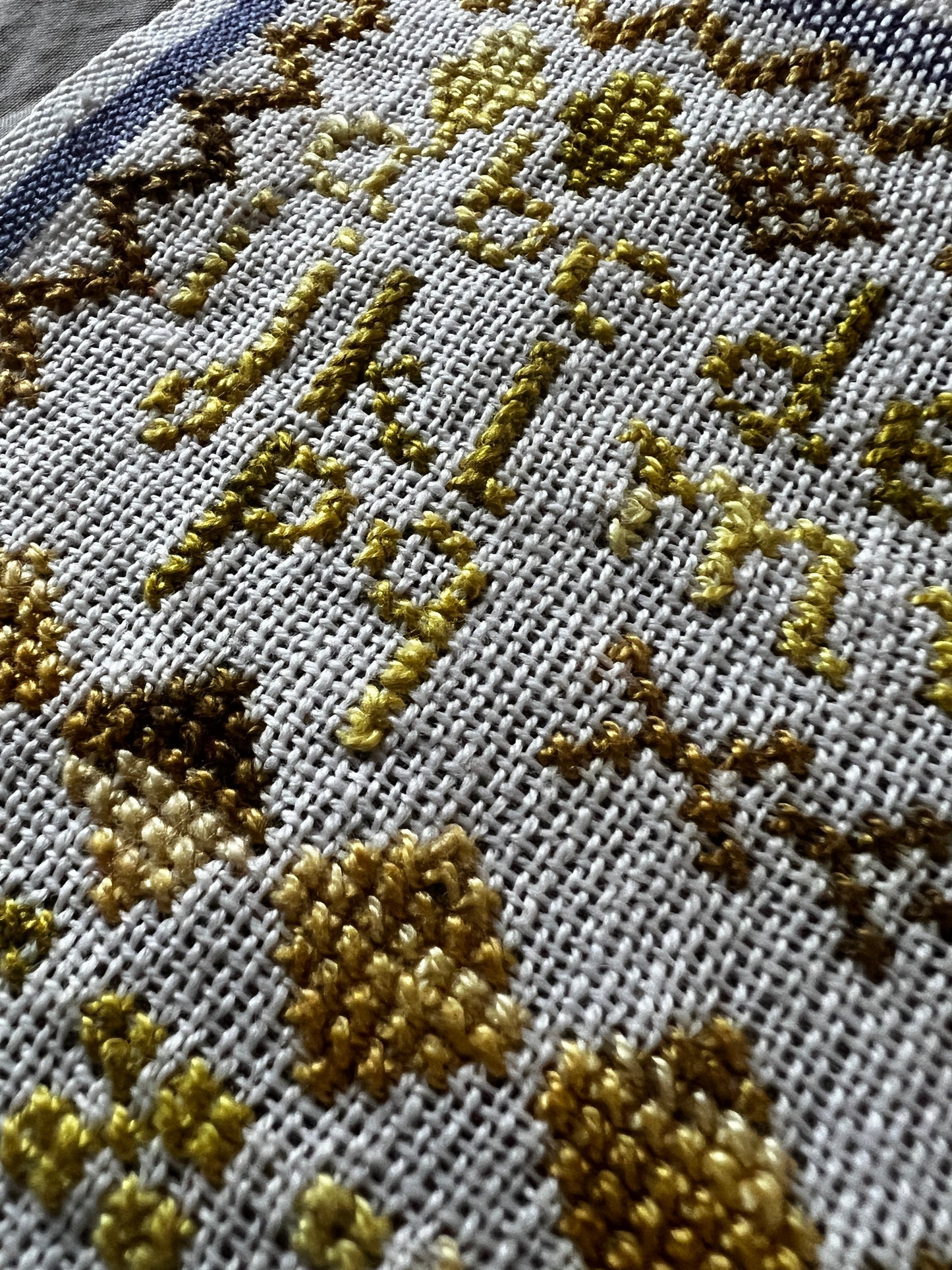 ブルーの縁取りのある布地にイエロー~ベージュのグラデーションでステッチの入ったサンプラーです