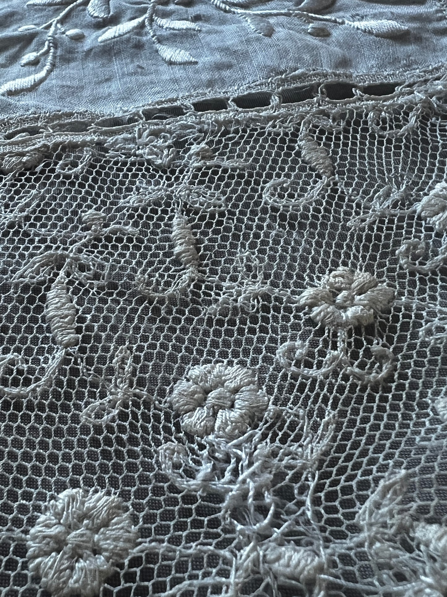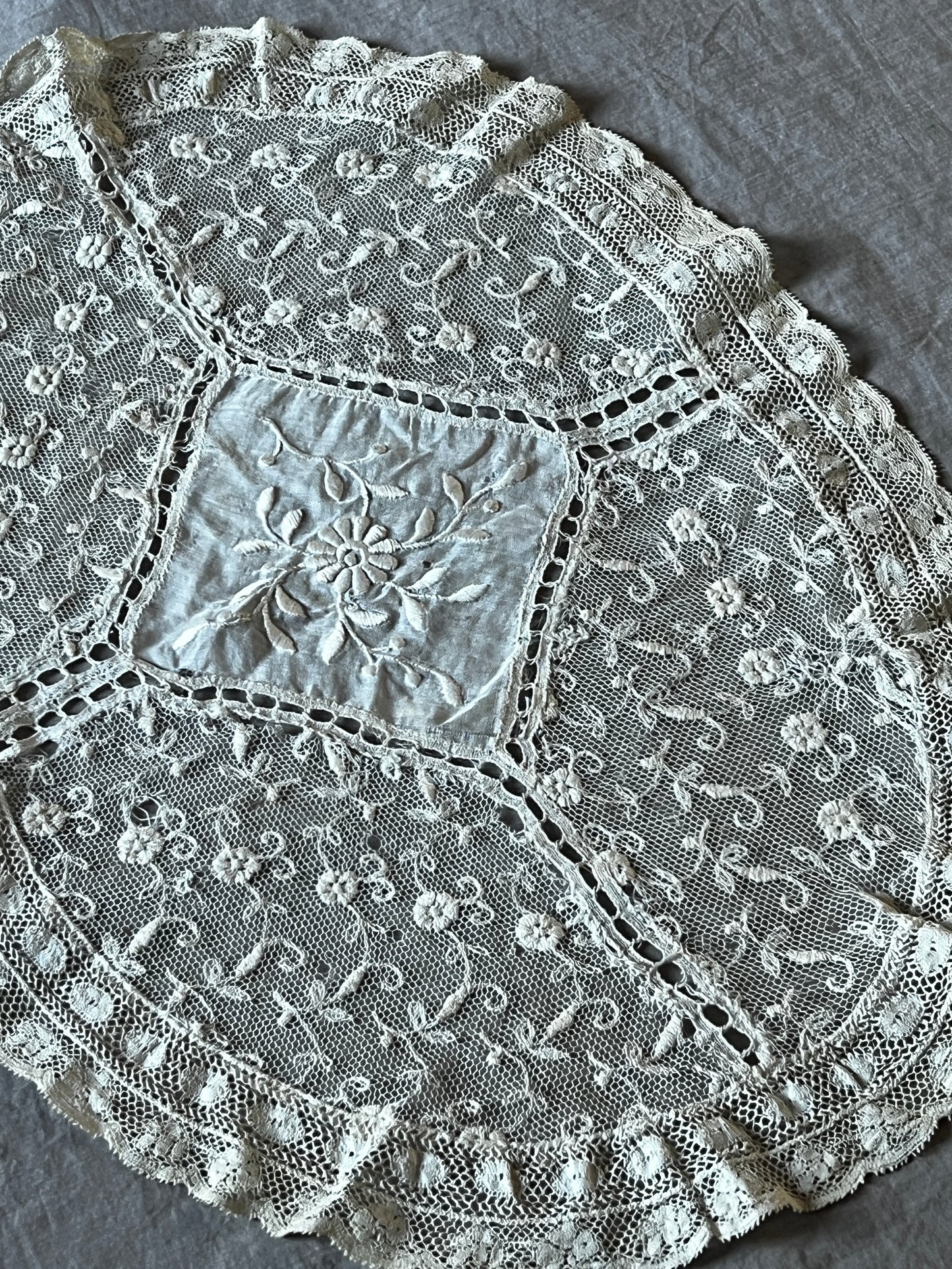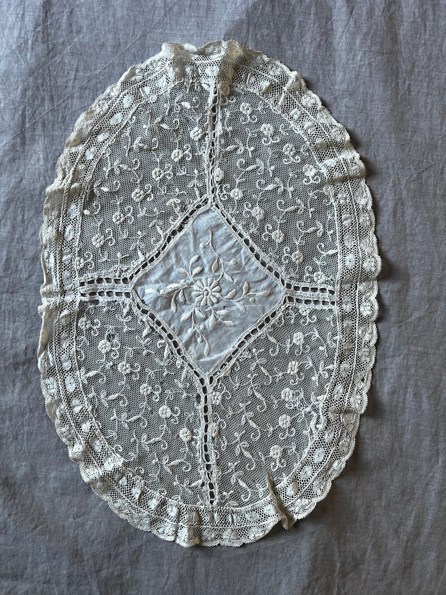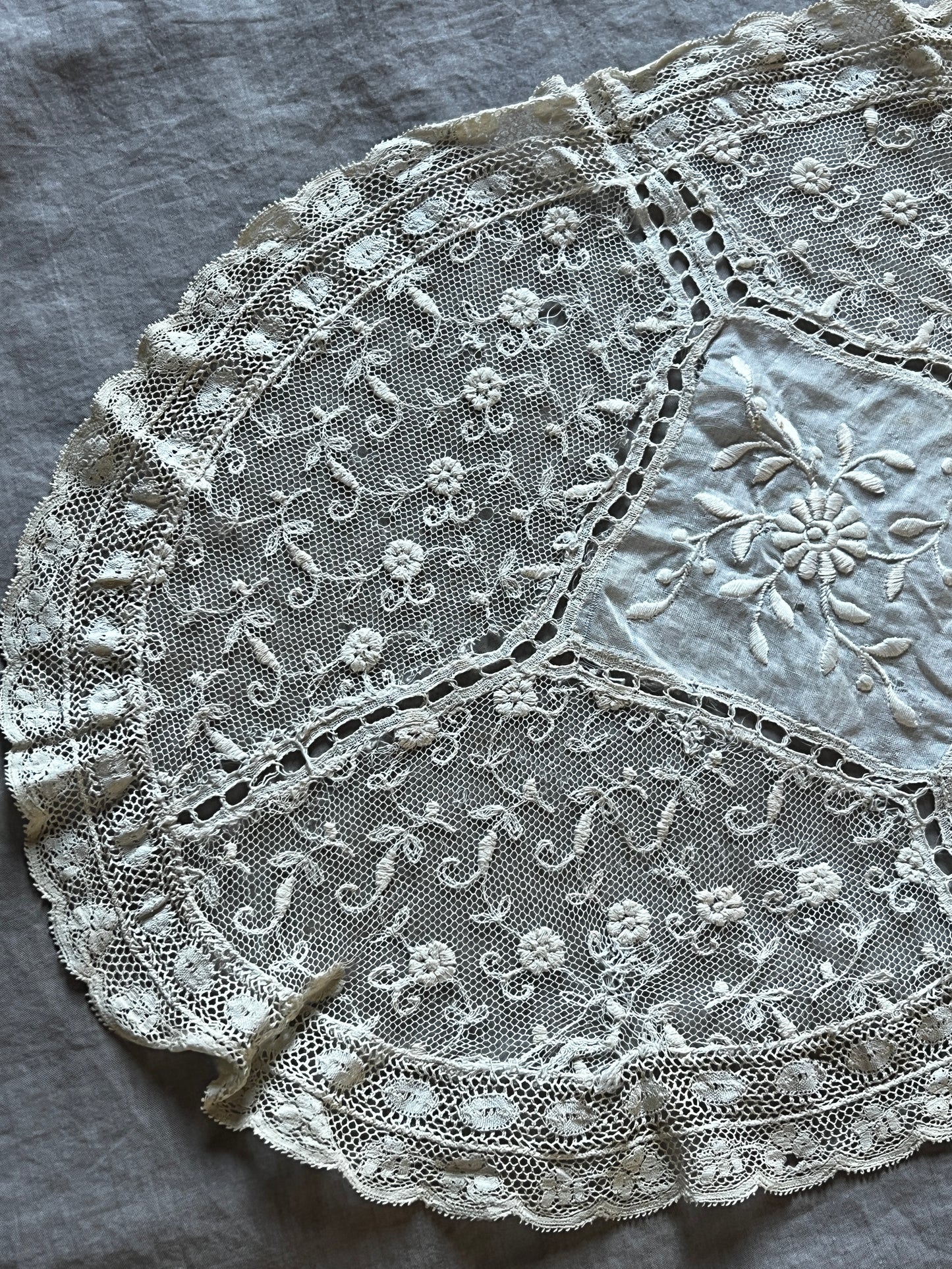 数種類のレースや刺繍布をパッチワークのようにつなぎ合わせてデザインされたノルマンディレースの楕円形クロスです