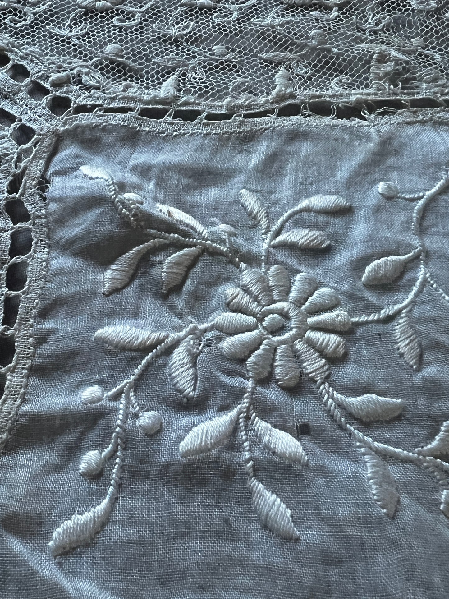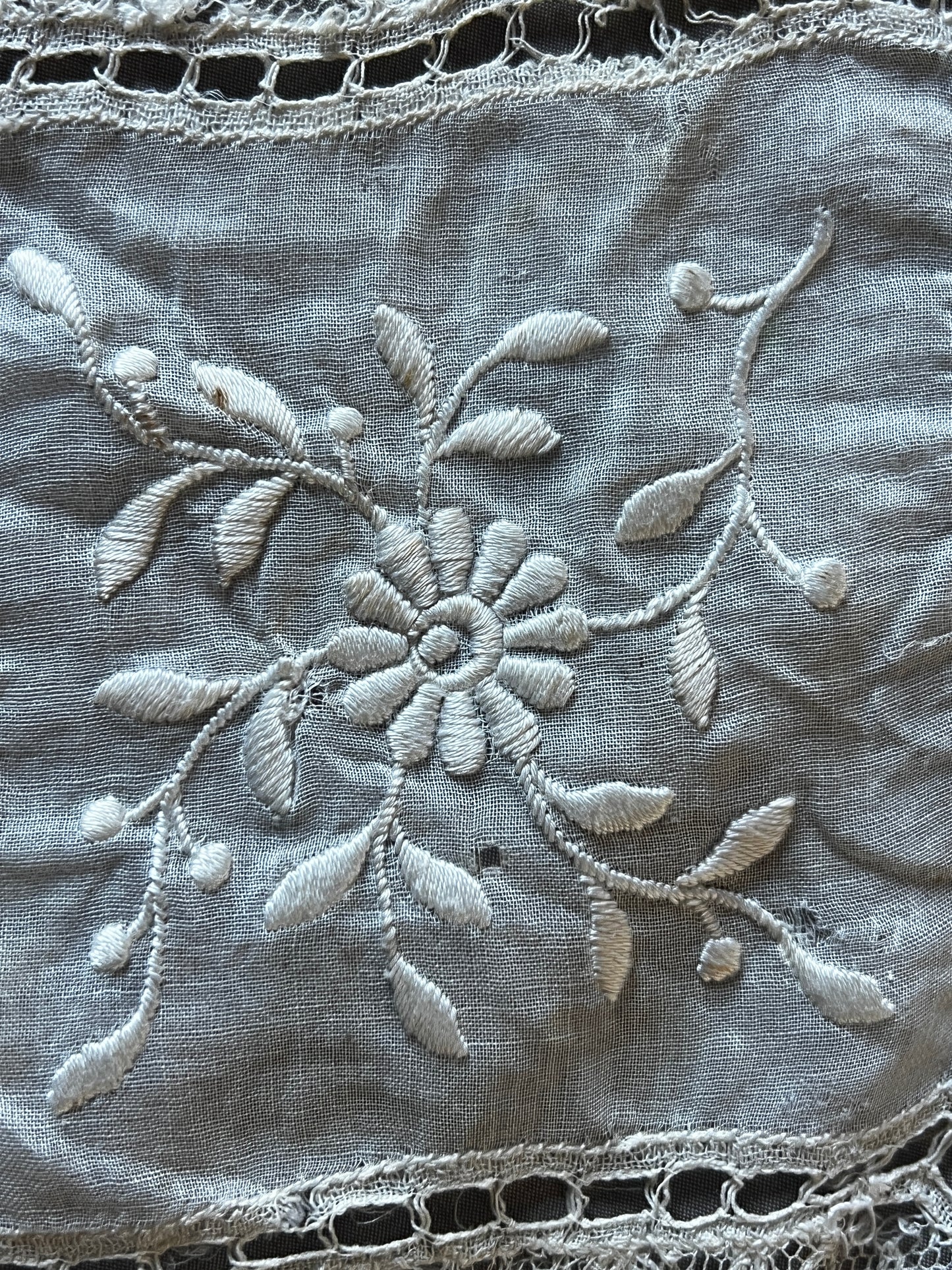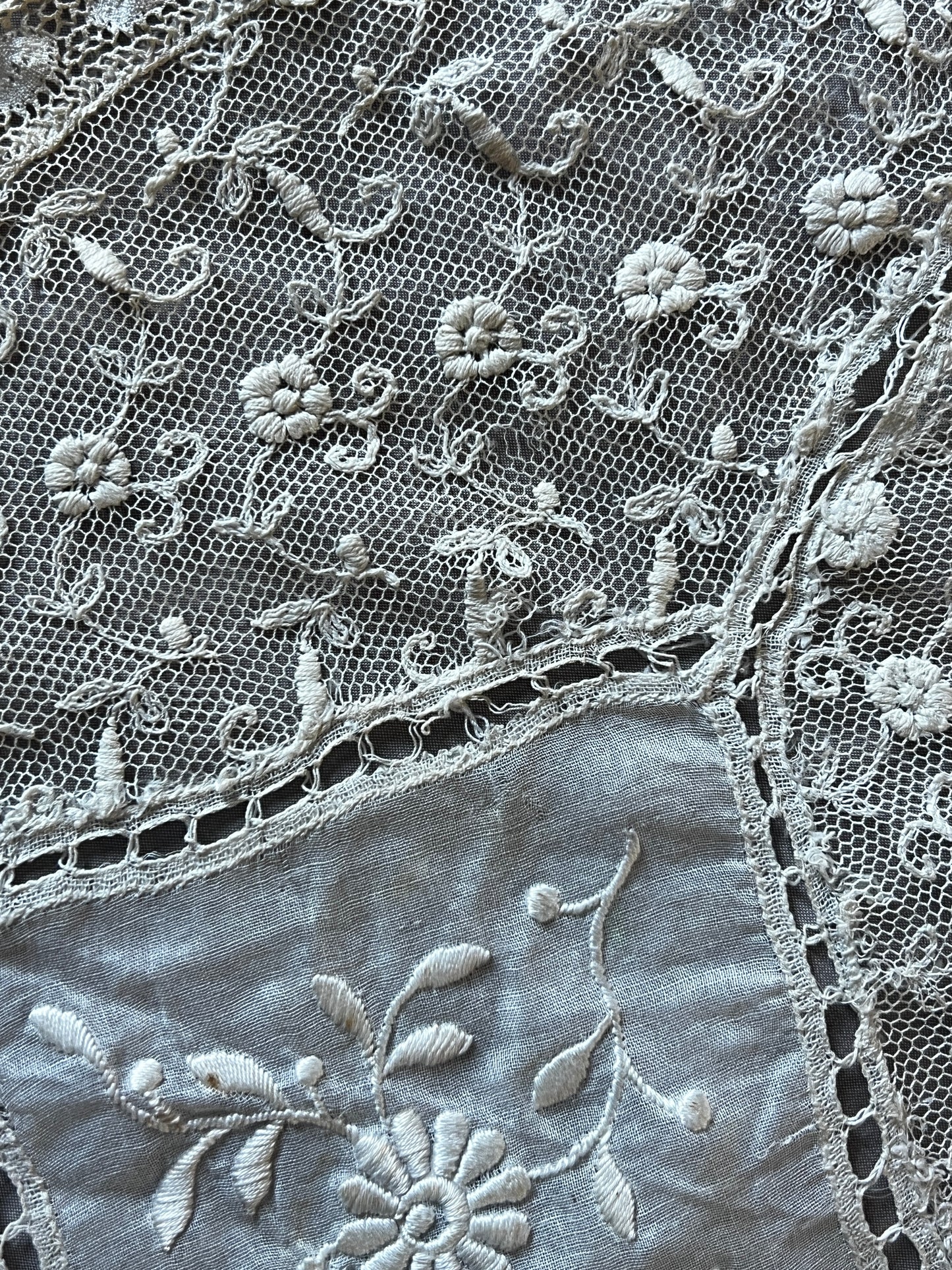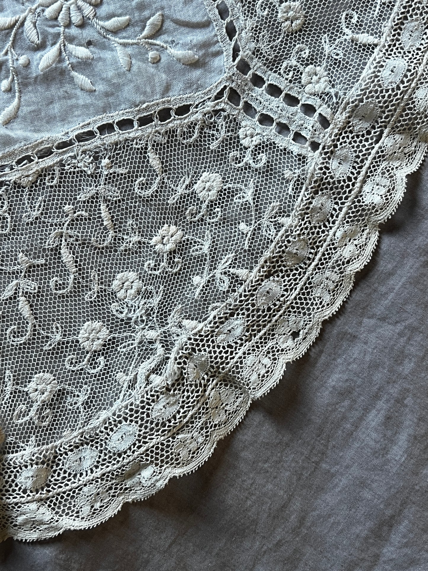 数種類のレースや刺繍布をパッチワークのようにつなぎ合わせてデザインされたノルマンディレースの楕円形クロスです