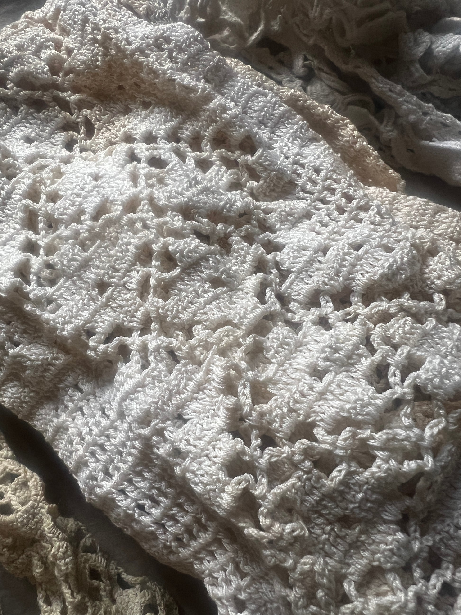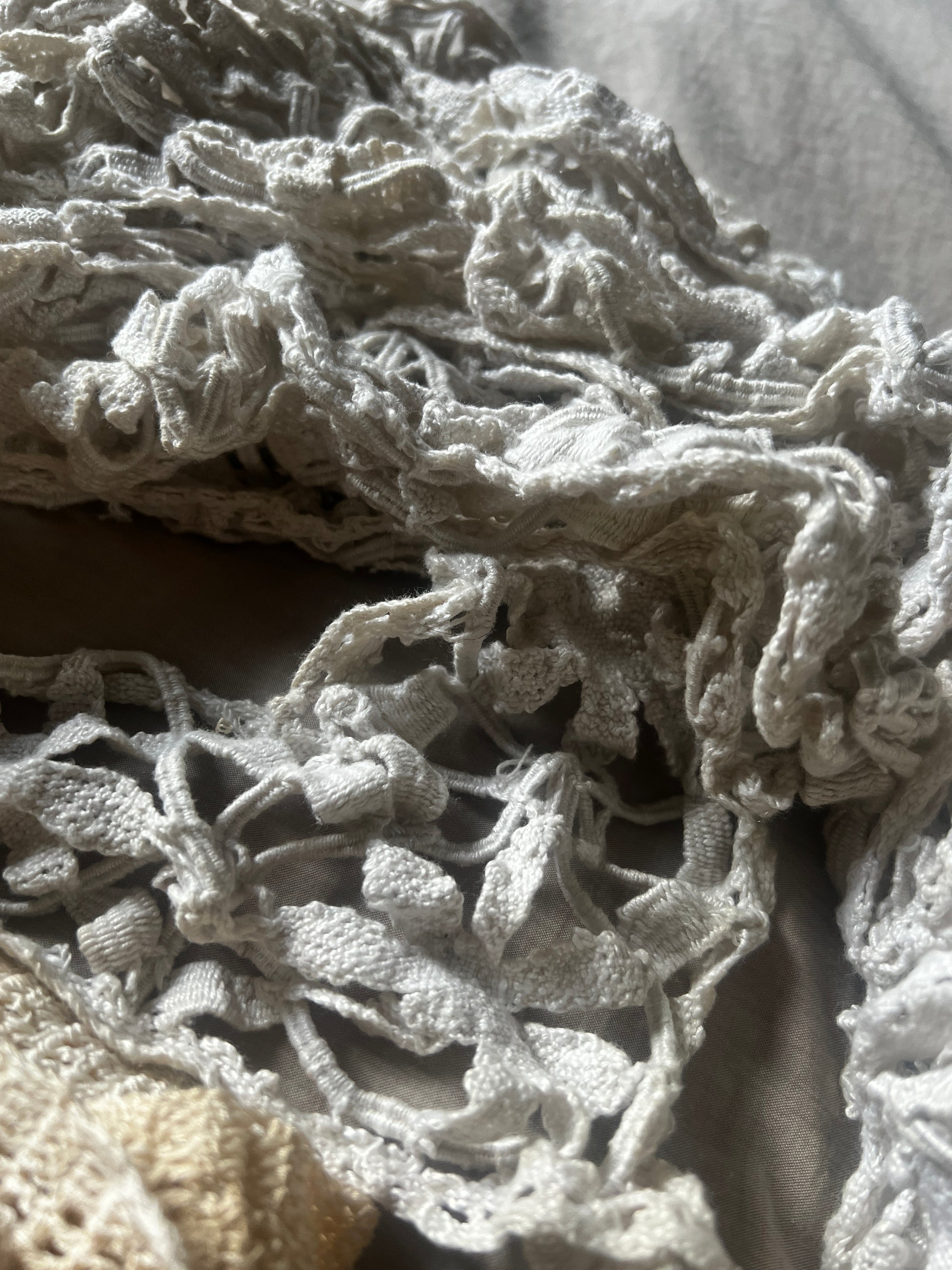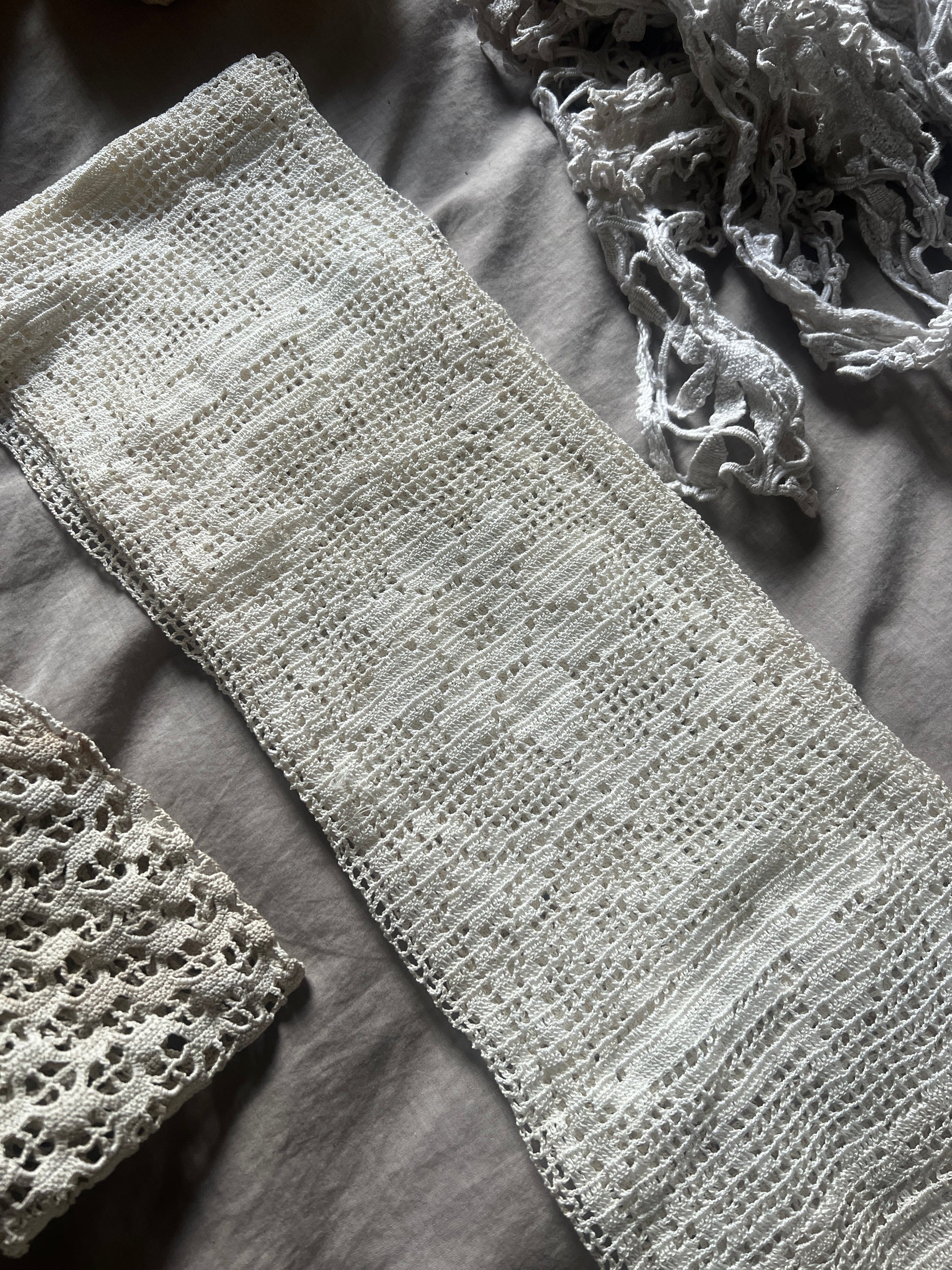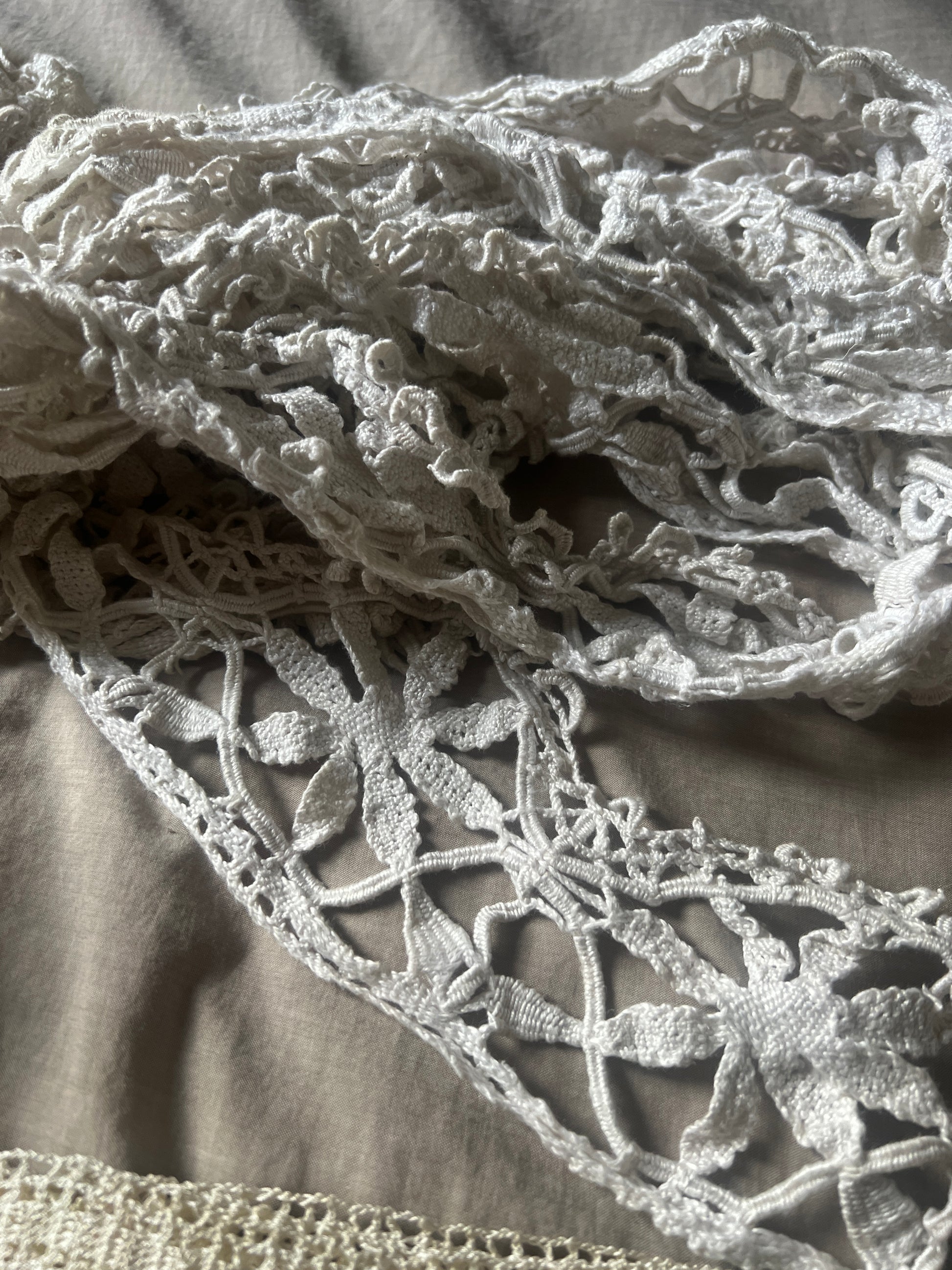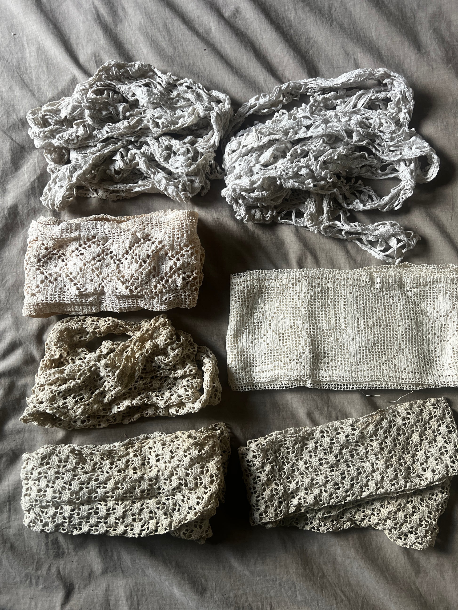 7点セット クロシェ、ボビンのボリュームのある素朴なレースのセットです