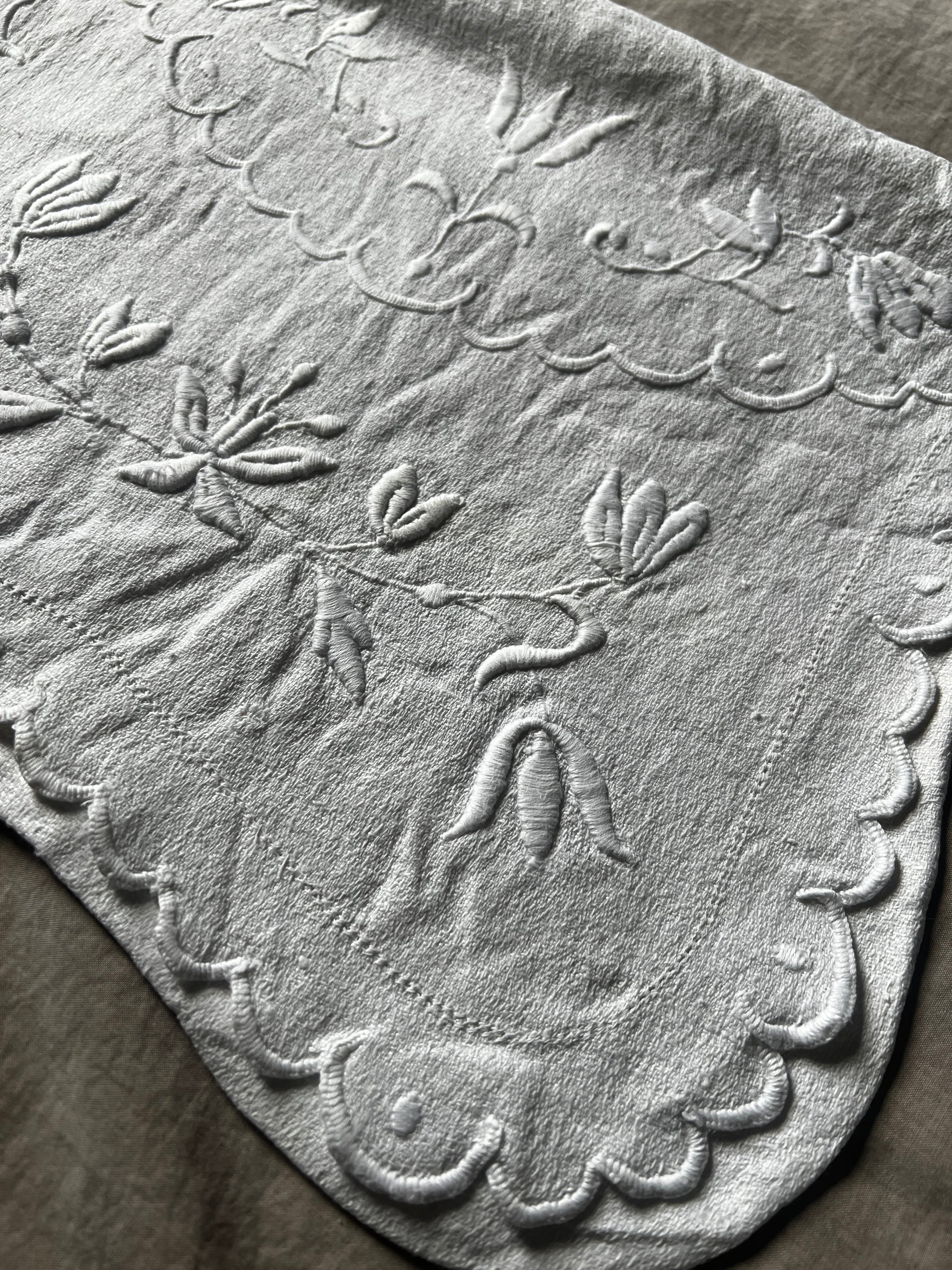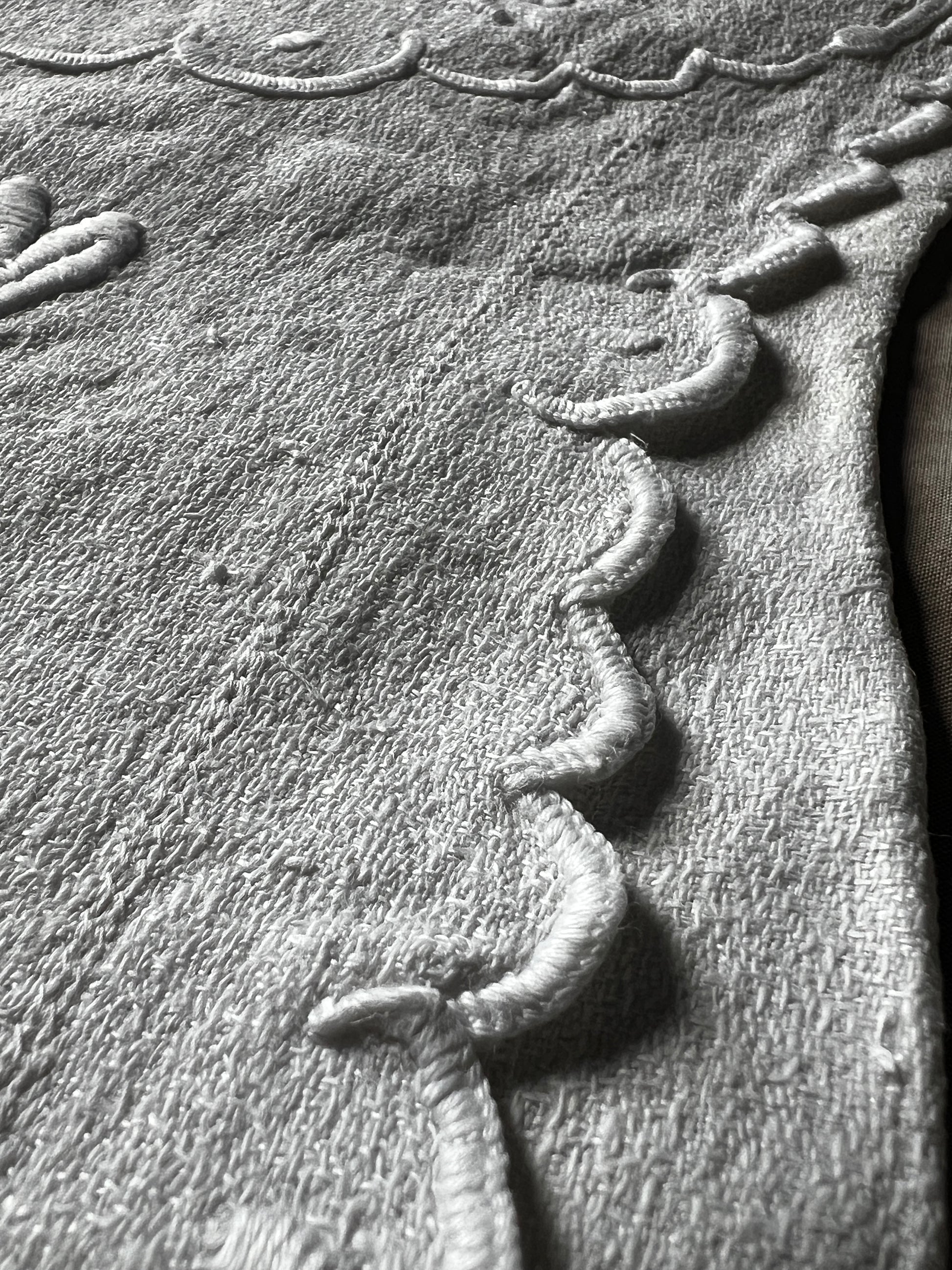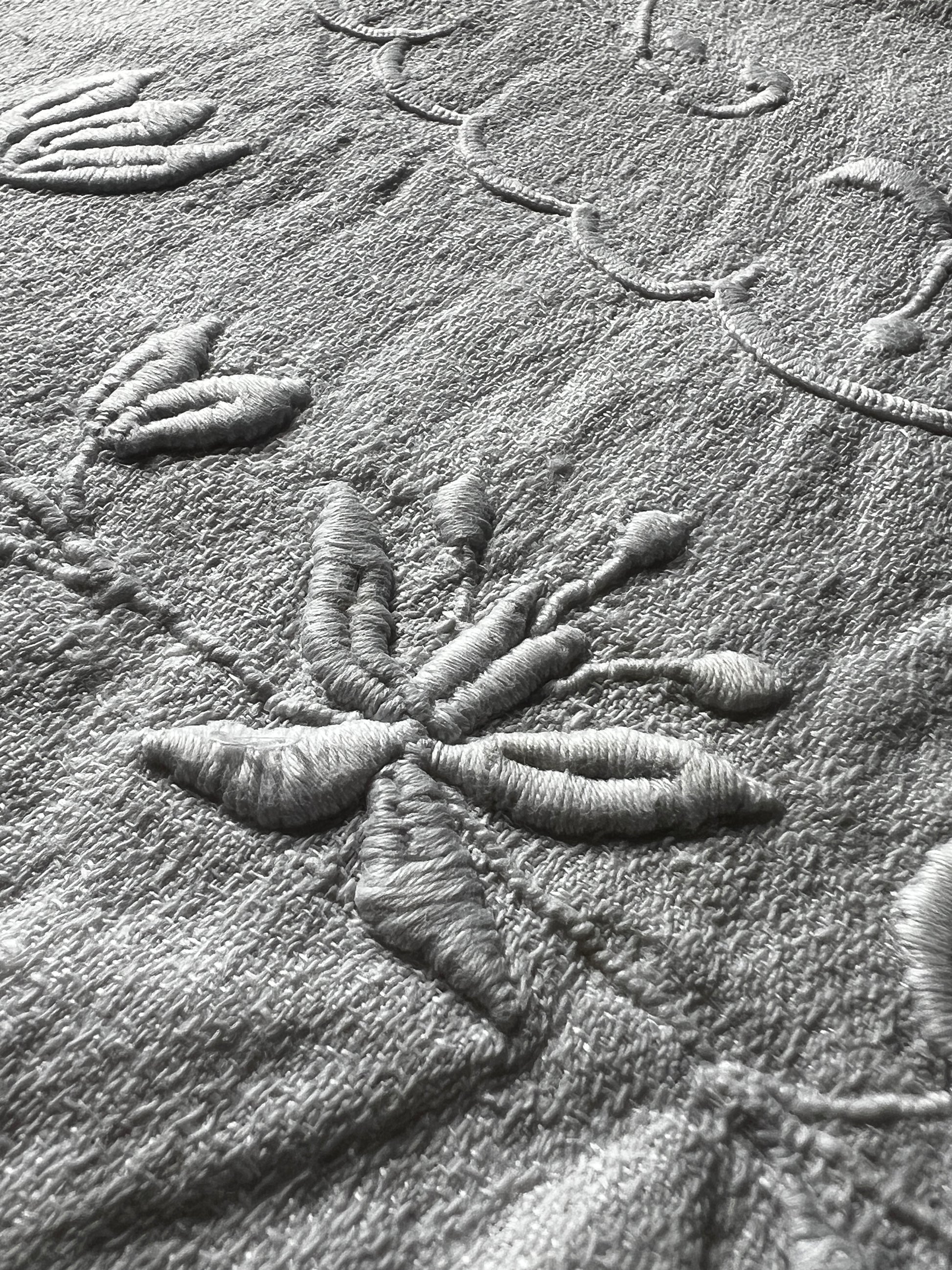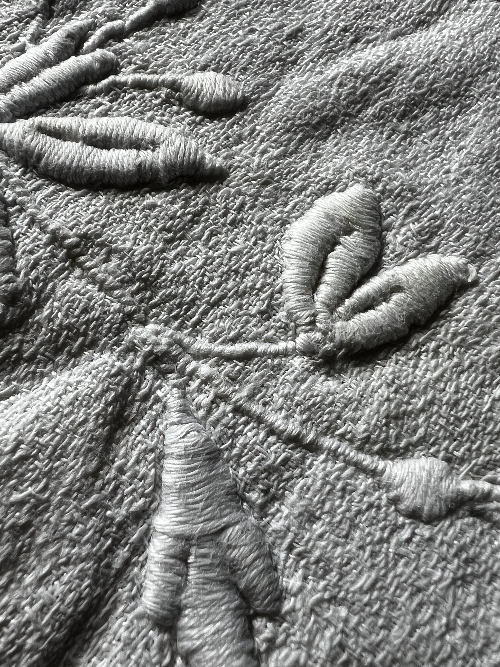 ボリュームのあるステッチで白刺繍が施されたランジェリーサックです