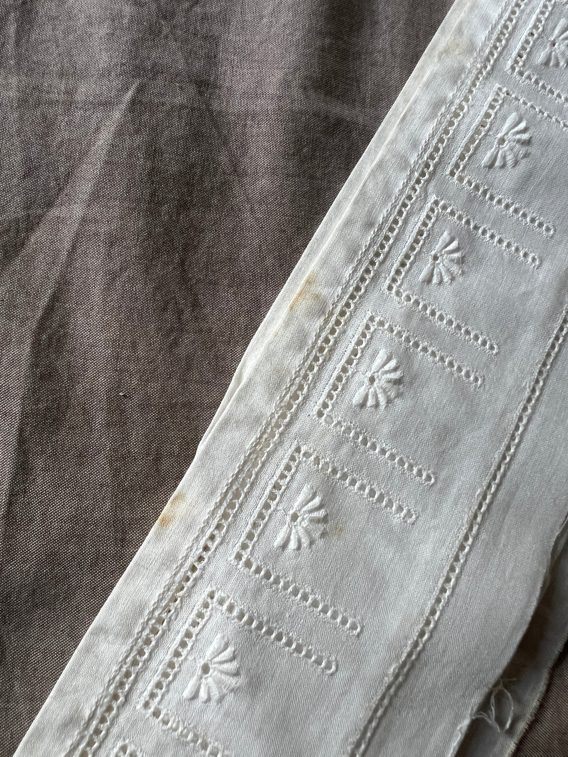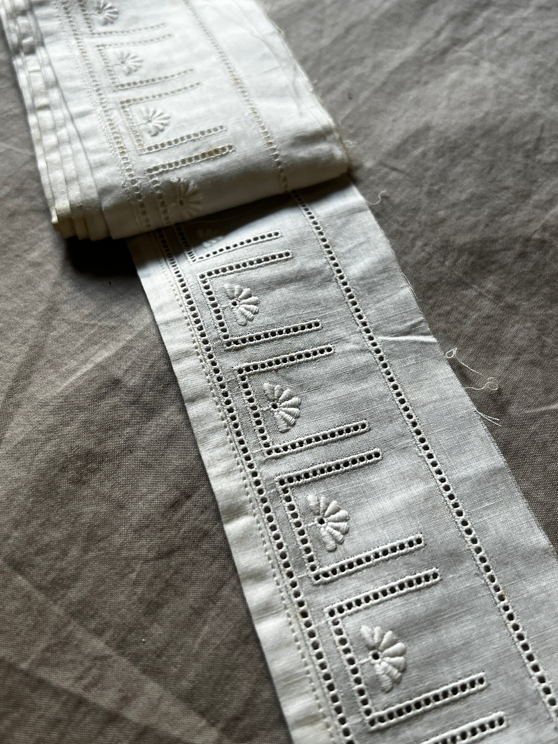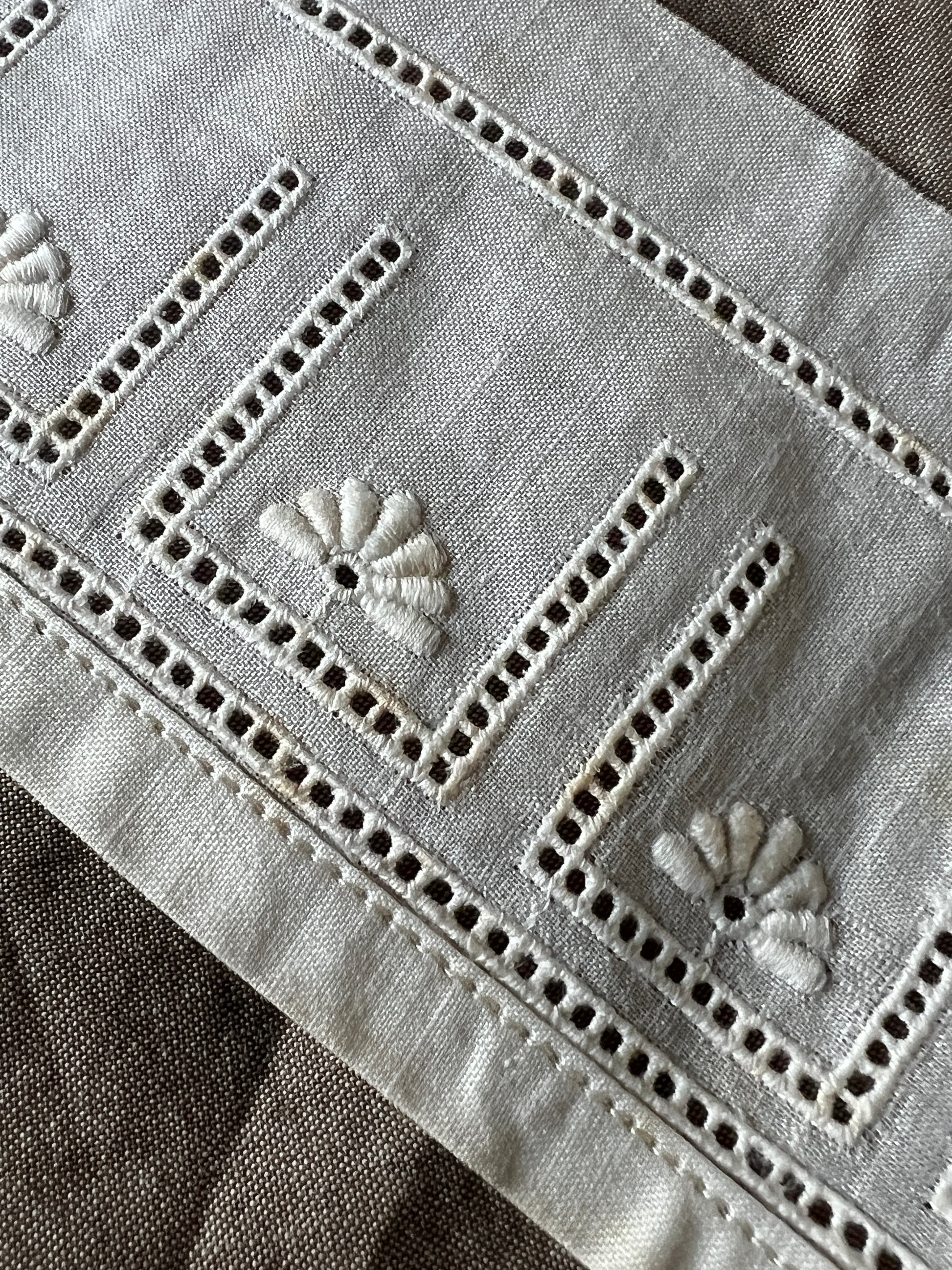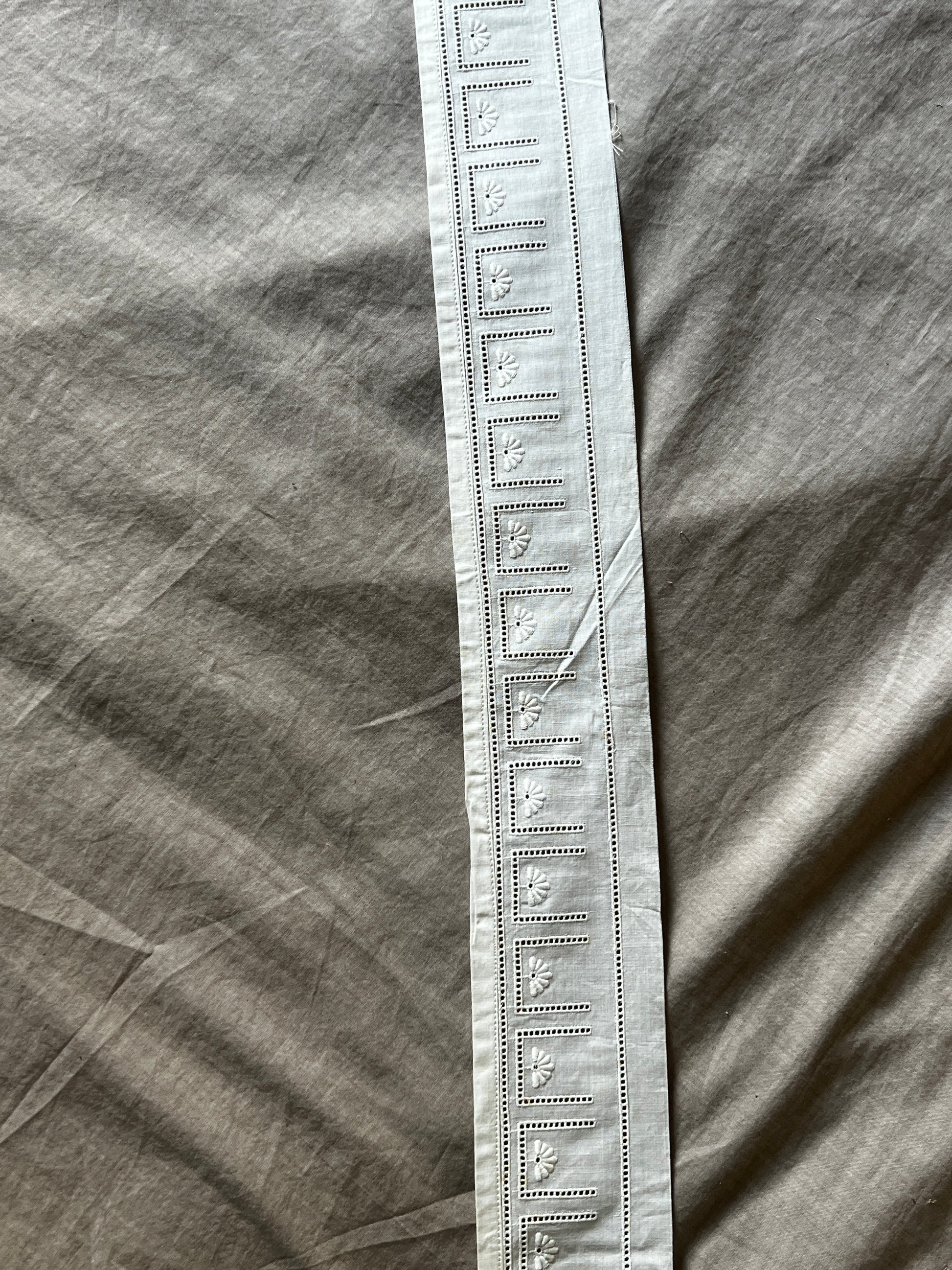 小花模様が端正で可憐な印象を与えるデザインで、リネンやハンドメイド作品の装飾、リメイク素材としてもおすすめの一品です