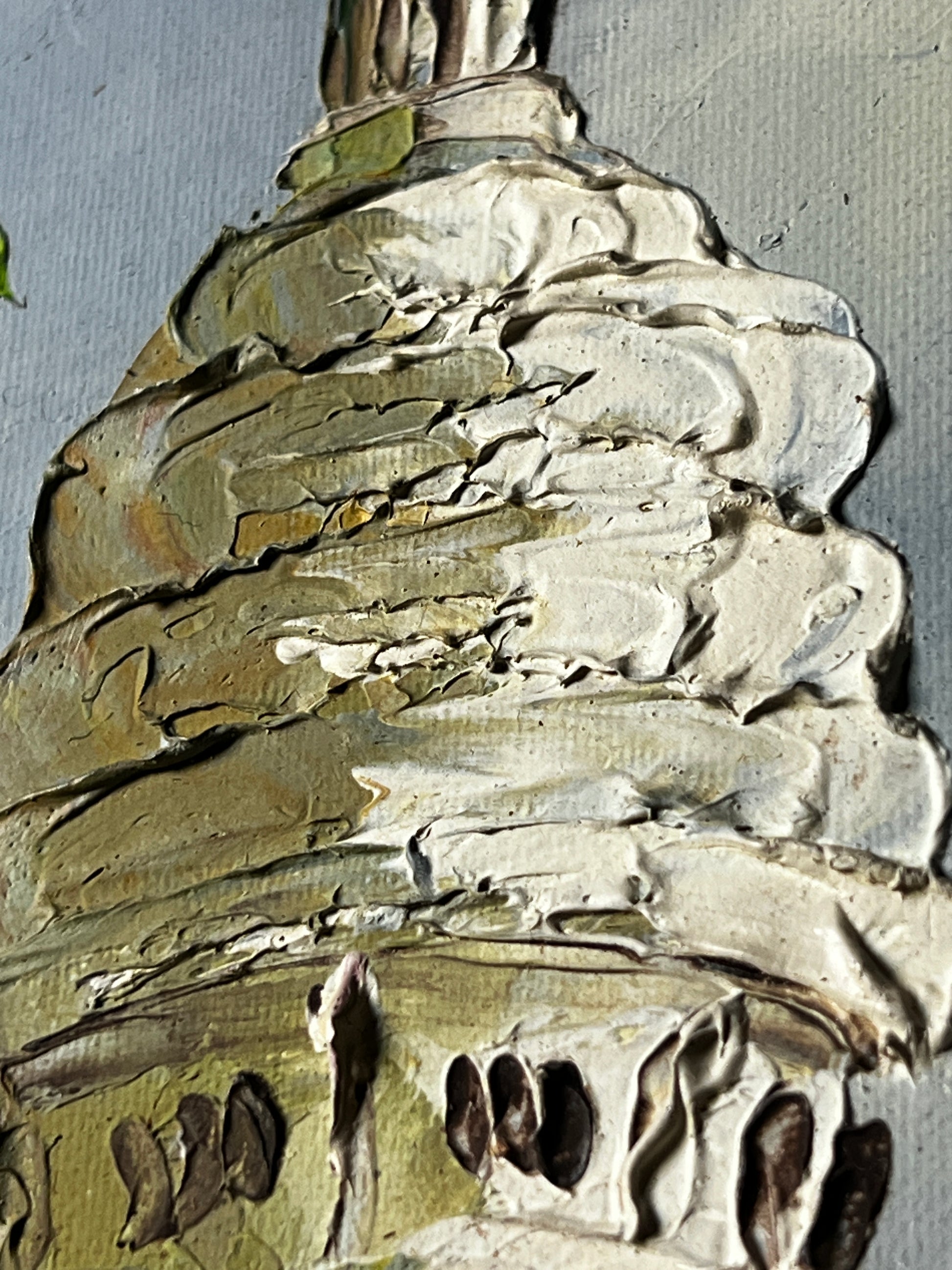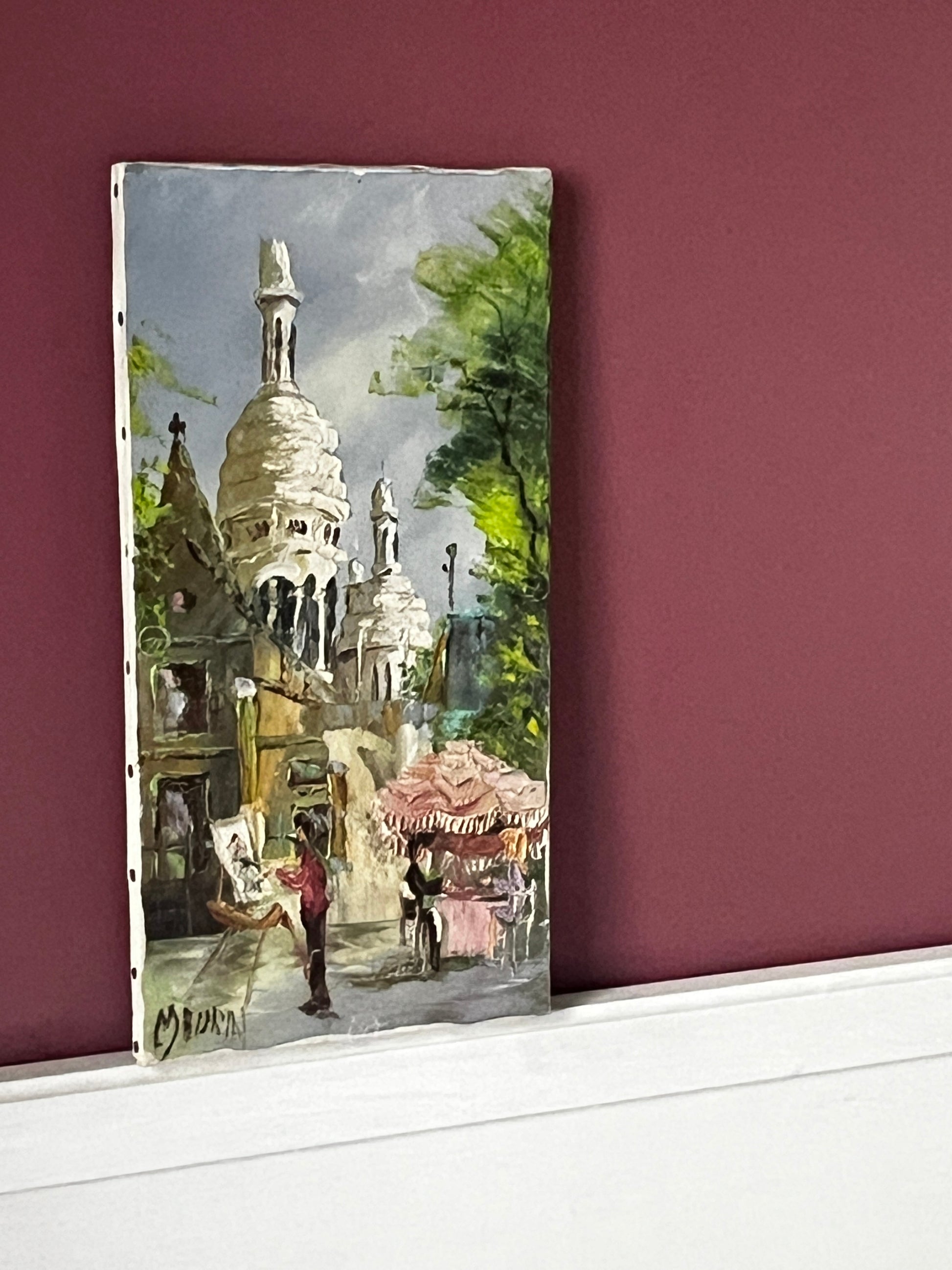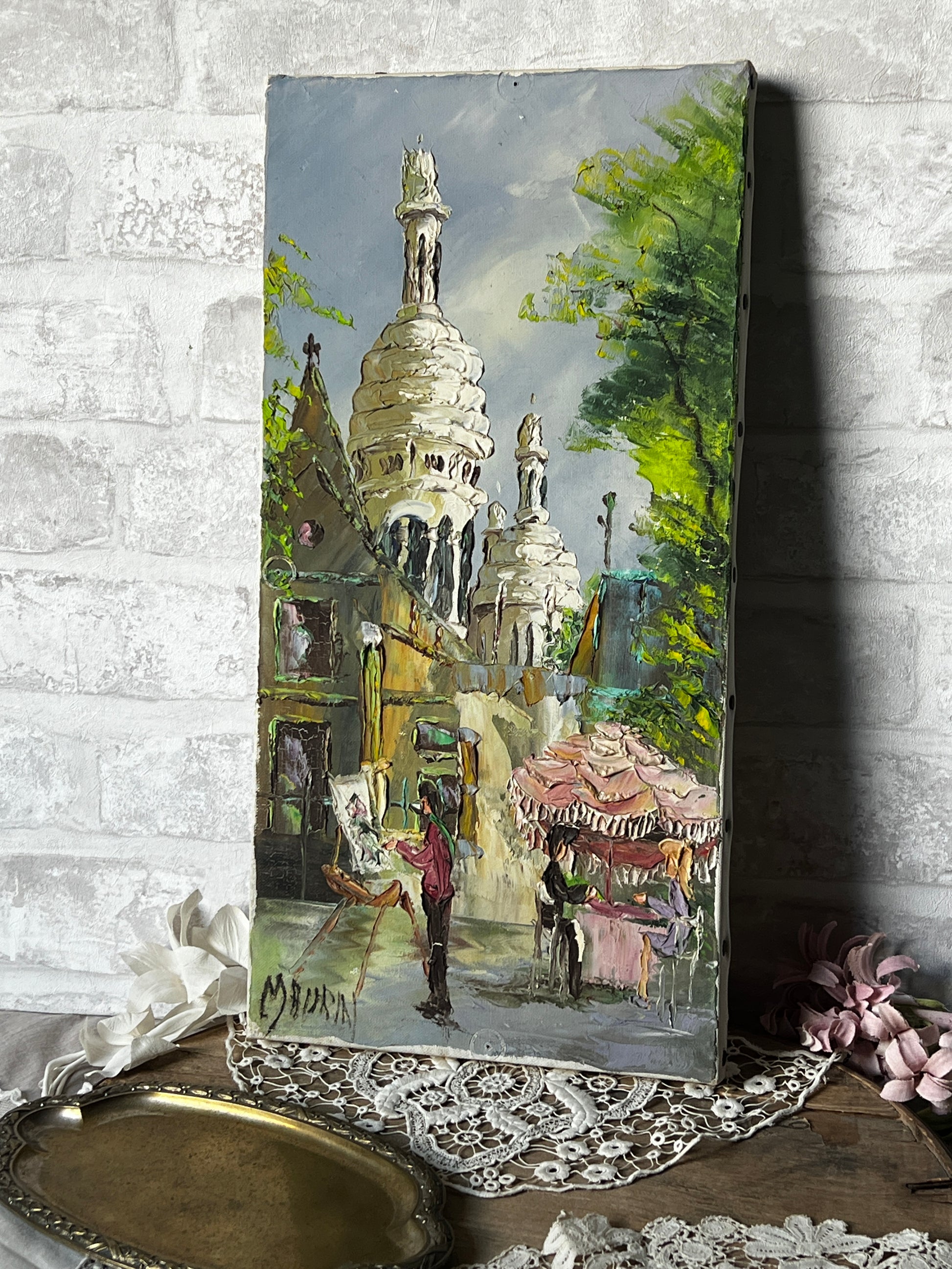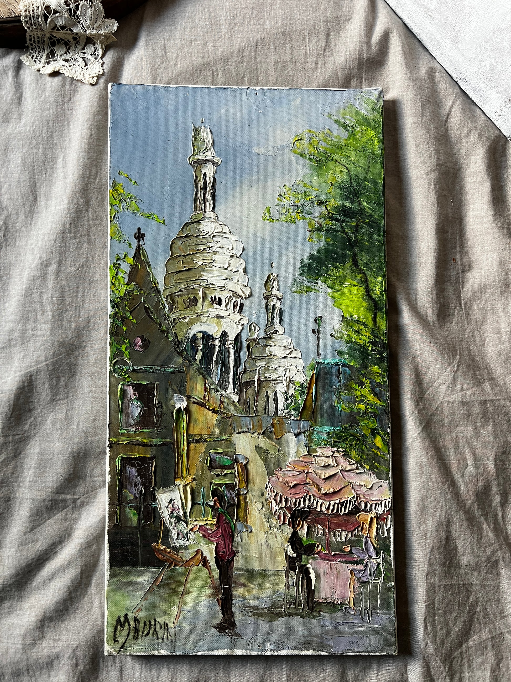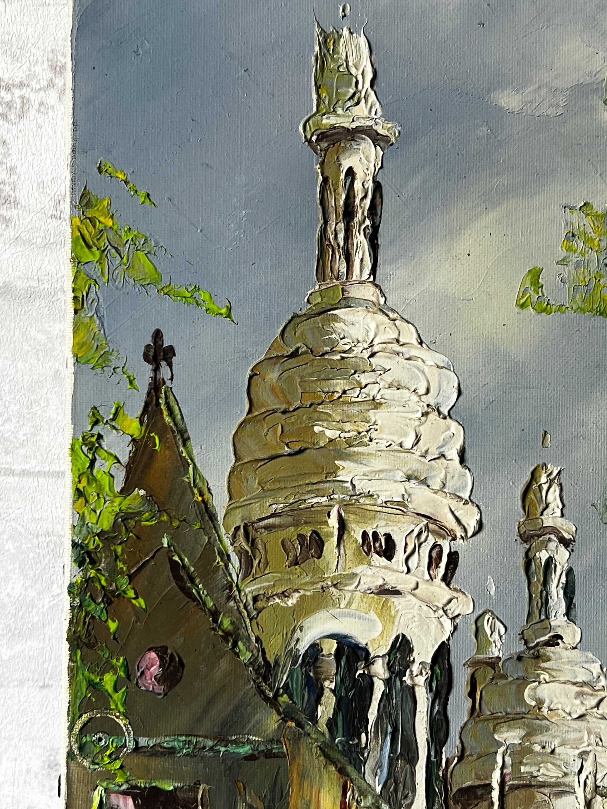 フランス・パリ、モンマルトルの丘にそびえる「サクレ・クール寺院」を描いた、存在感あふれる厚塗りの油絵です