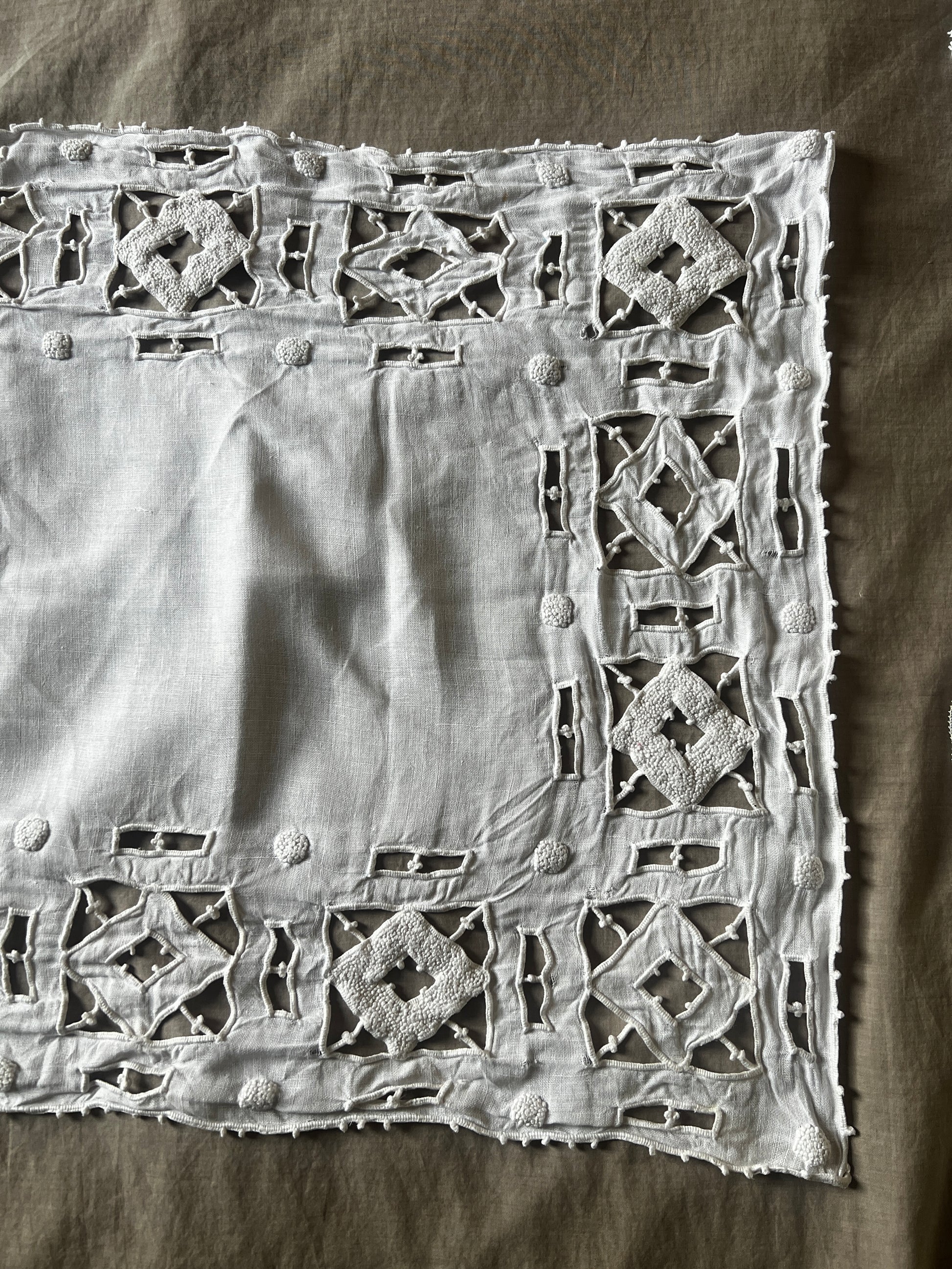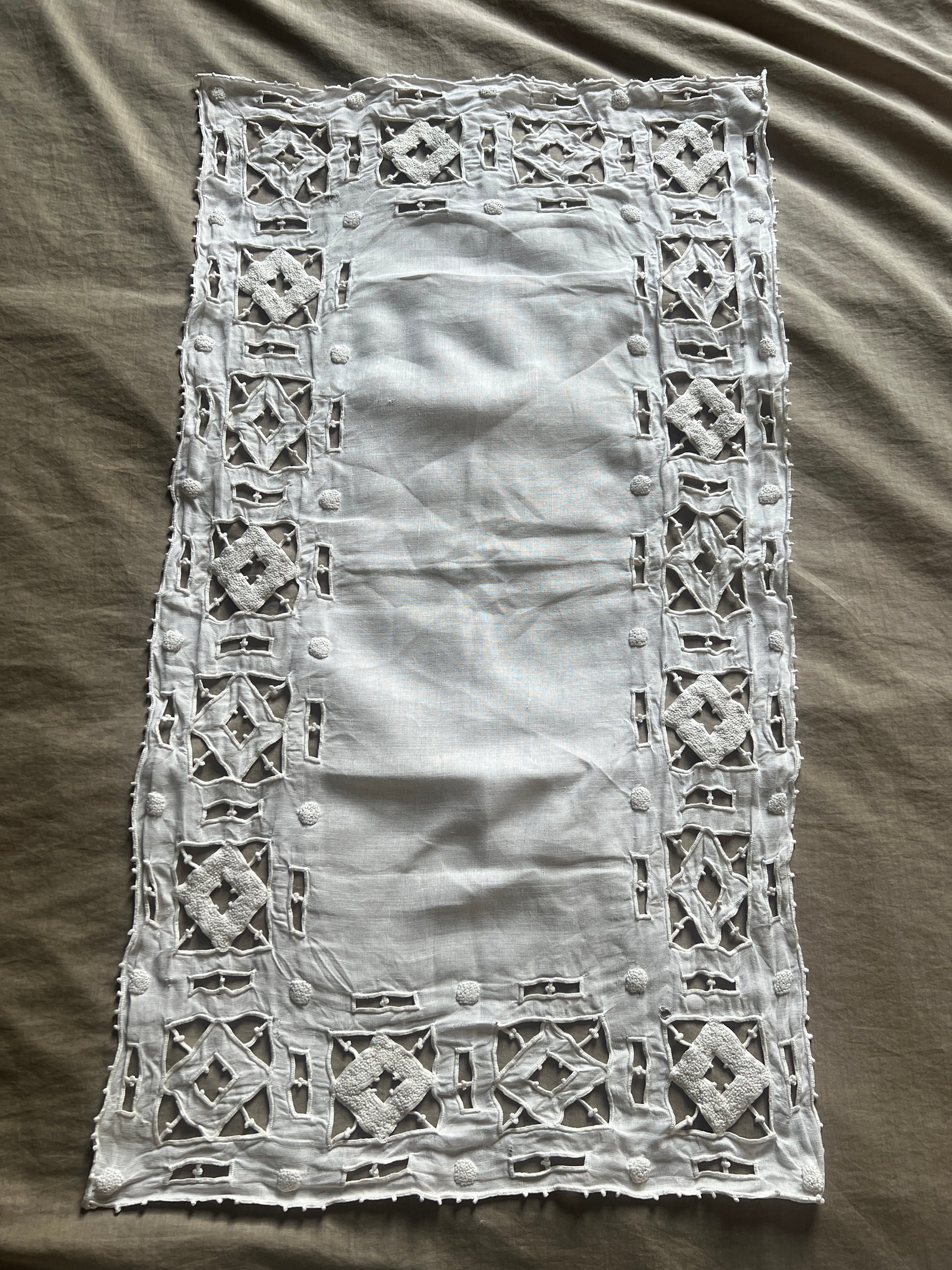上品なカットワーク刺繍が施されたリネンクロスです
