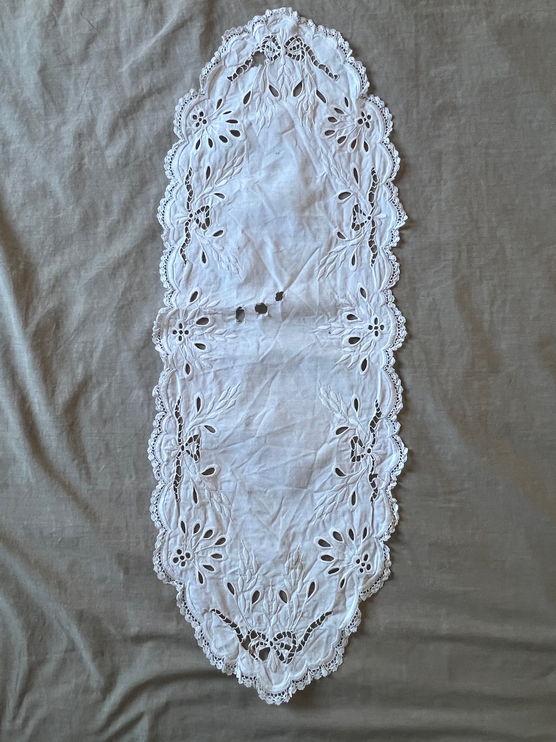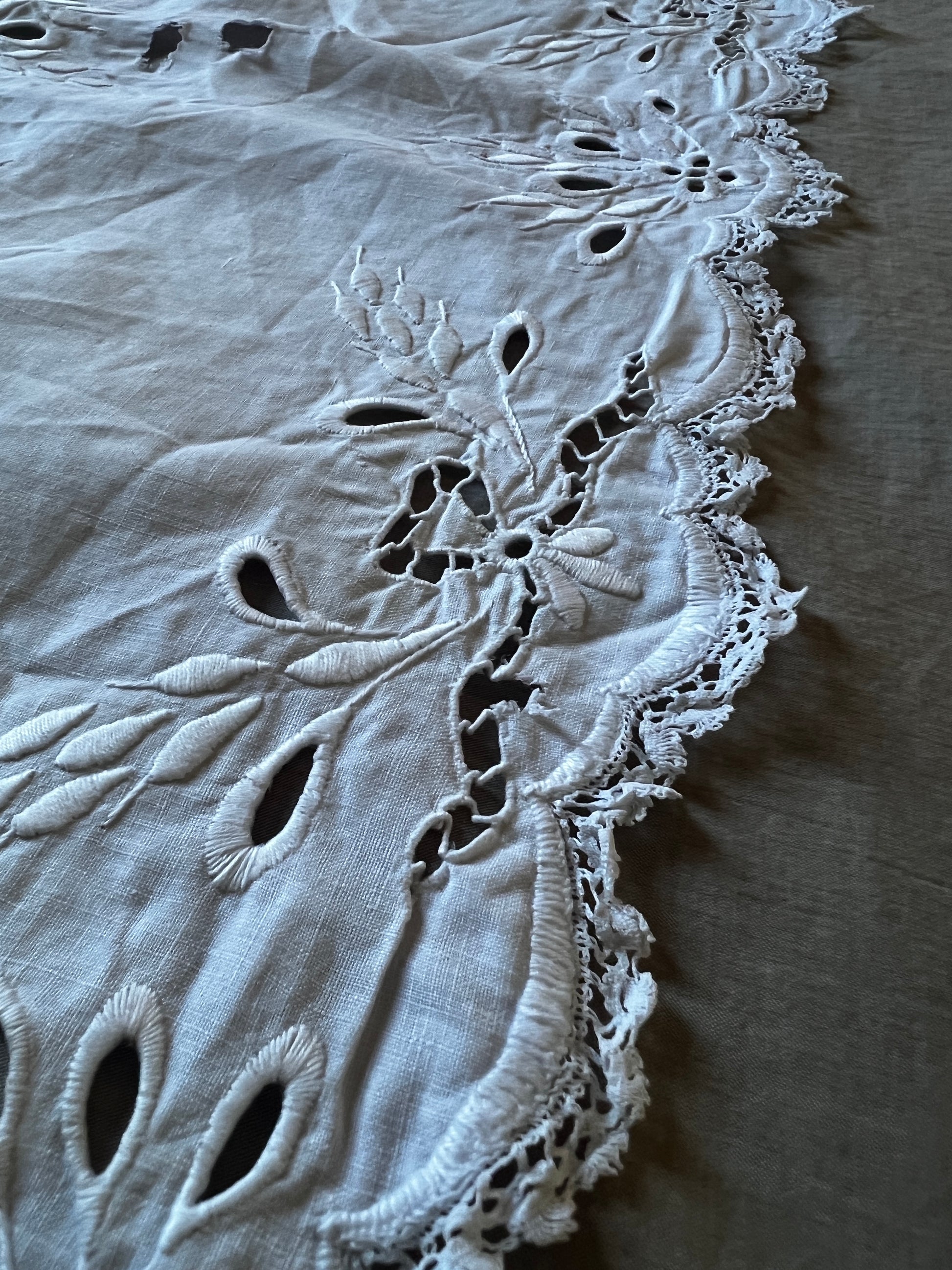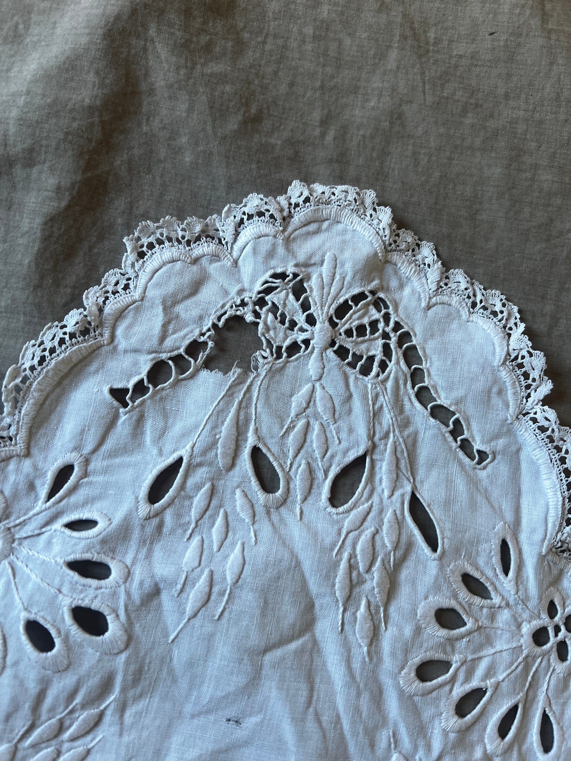 カットワークと白刺繍が美しい、楕円形のアンティーククロスです