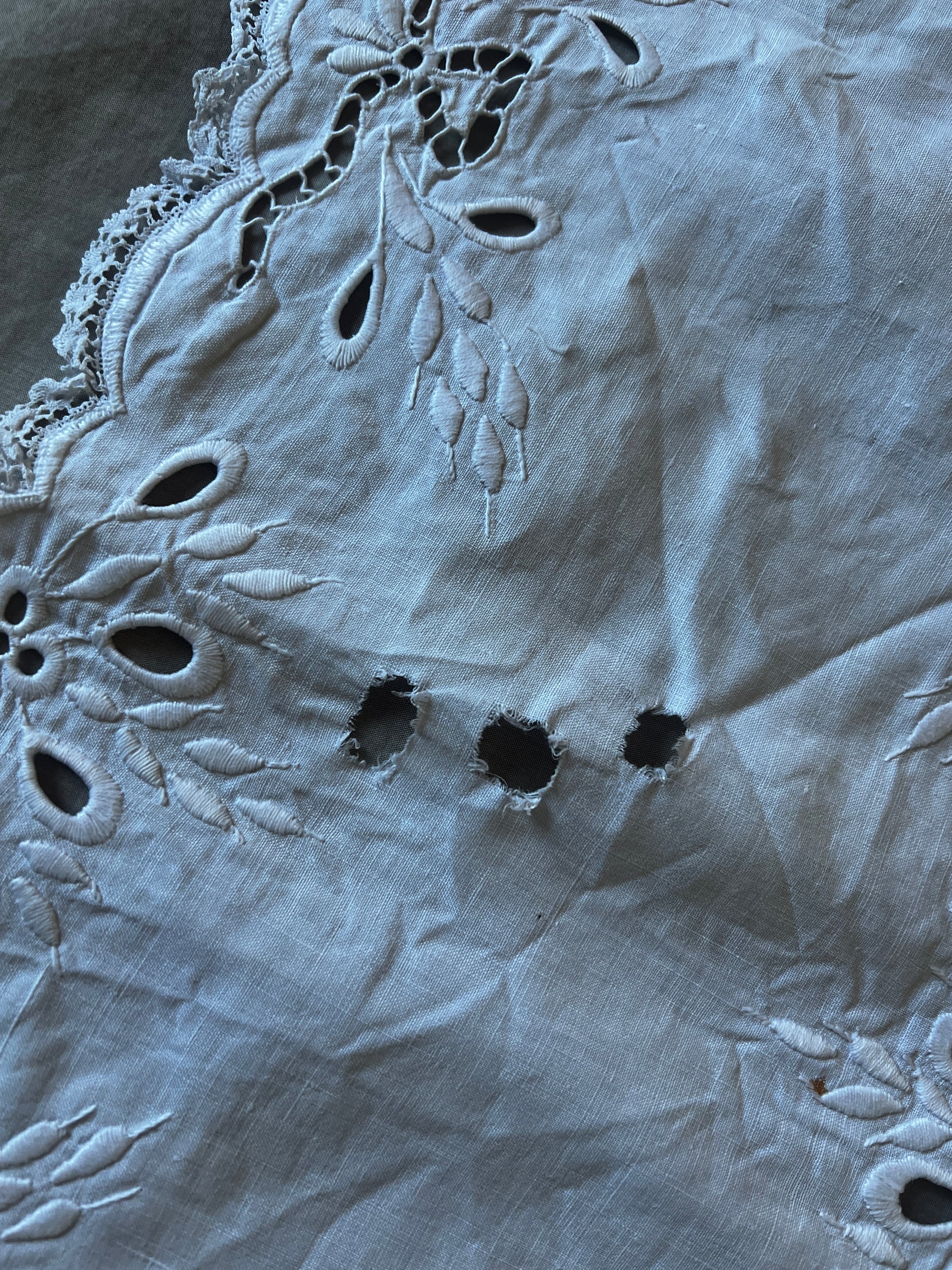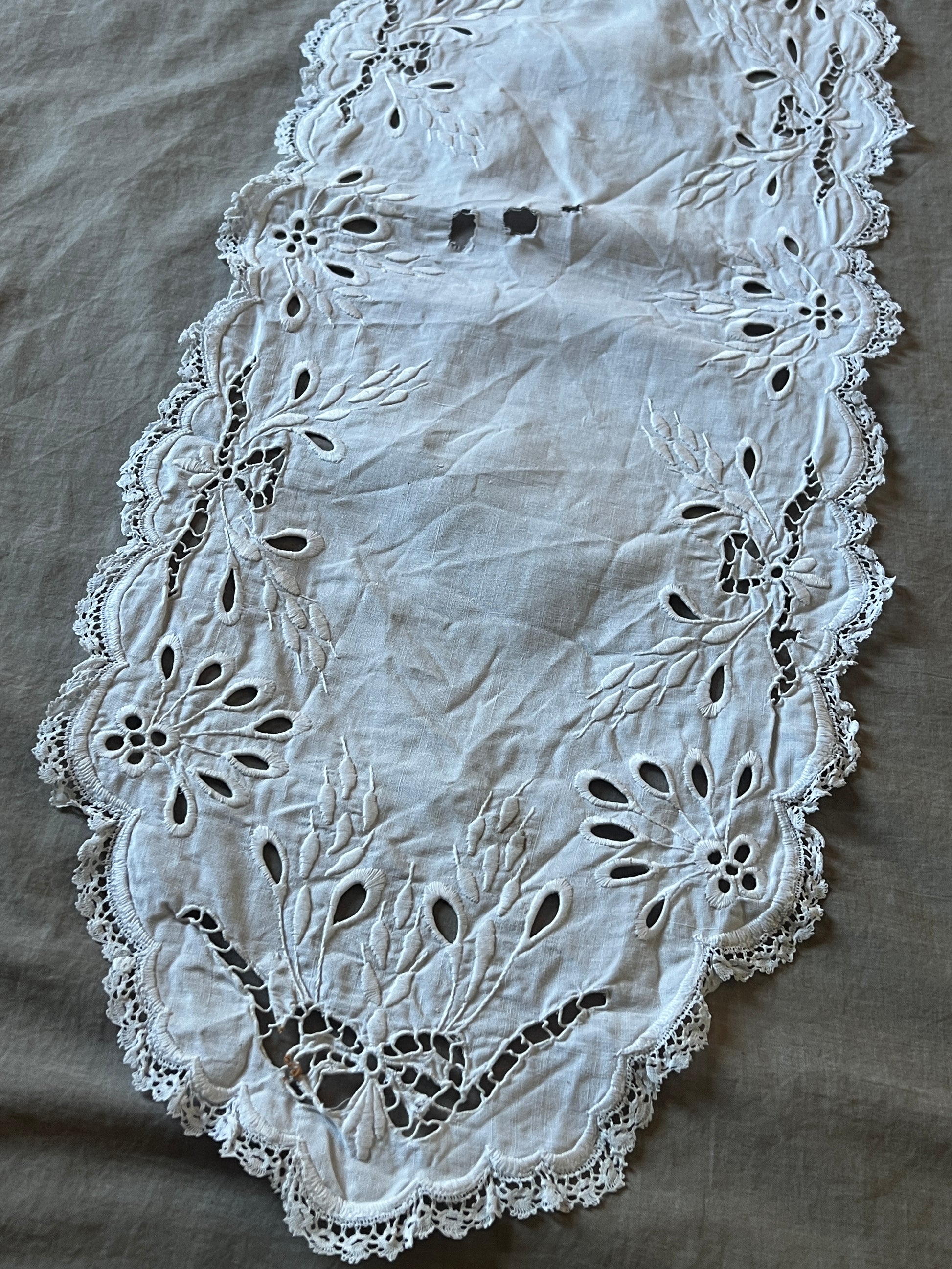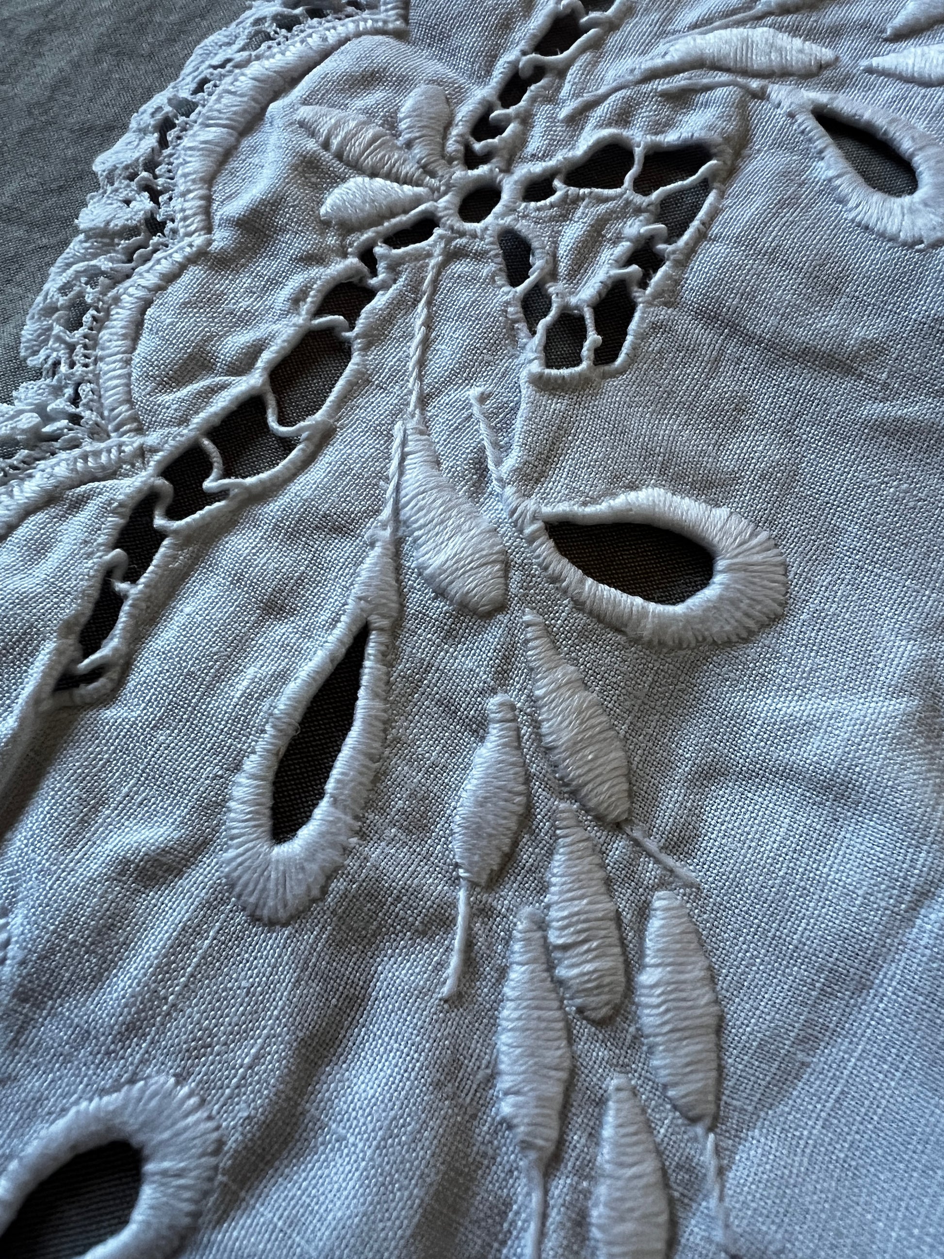 カットワークと白刺繍が美しい、楕円形のアンティーククロスです
