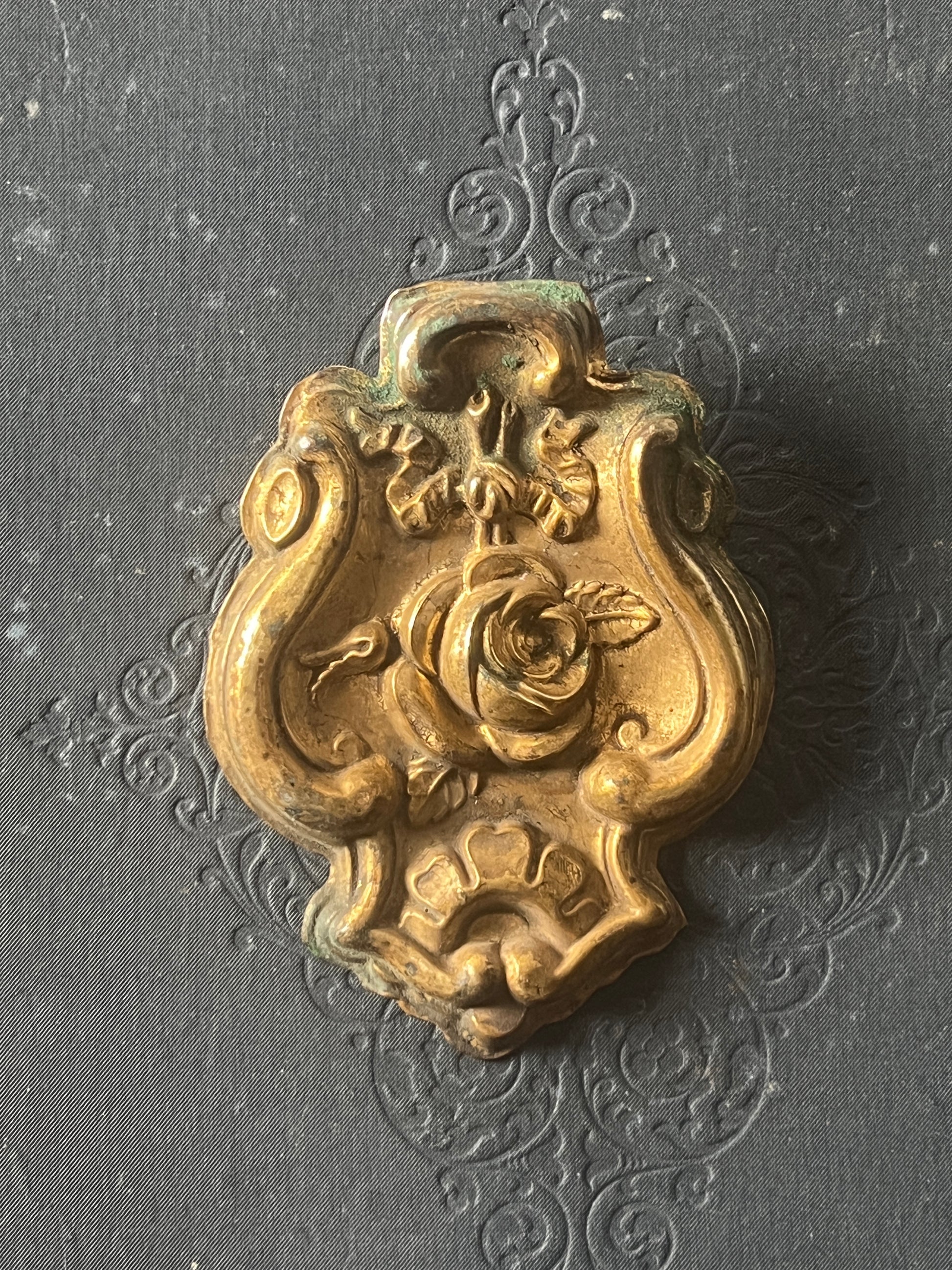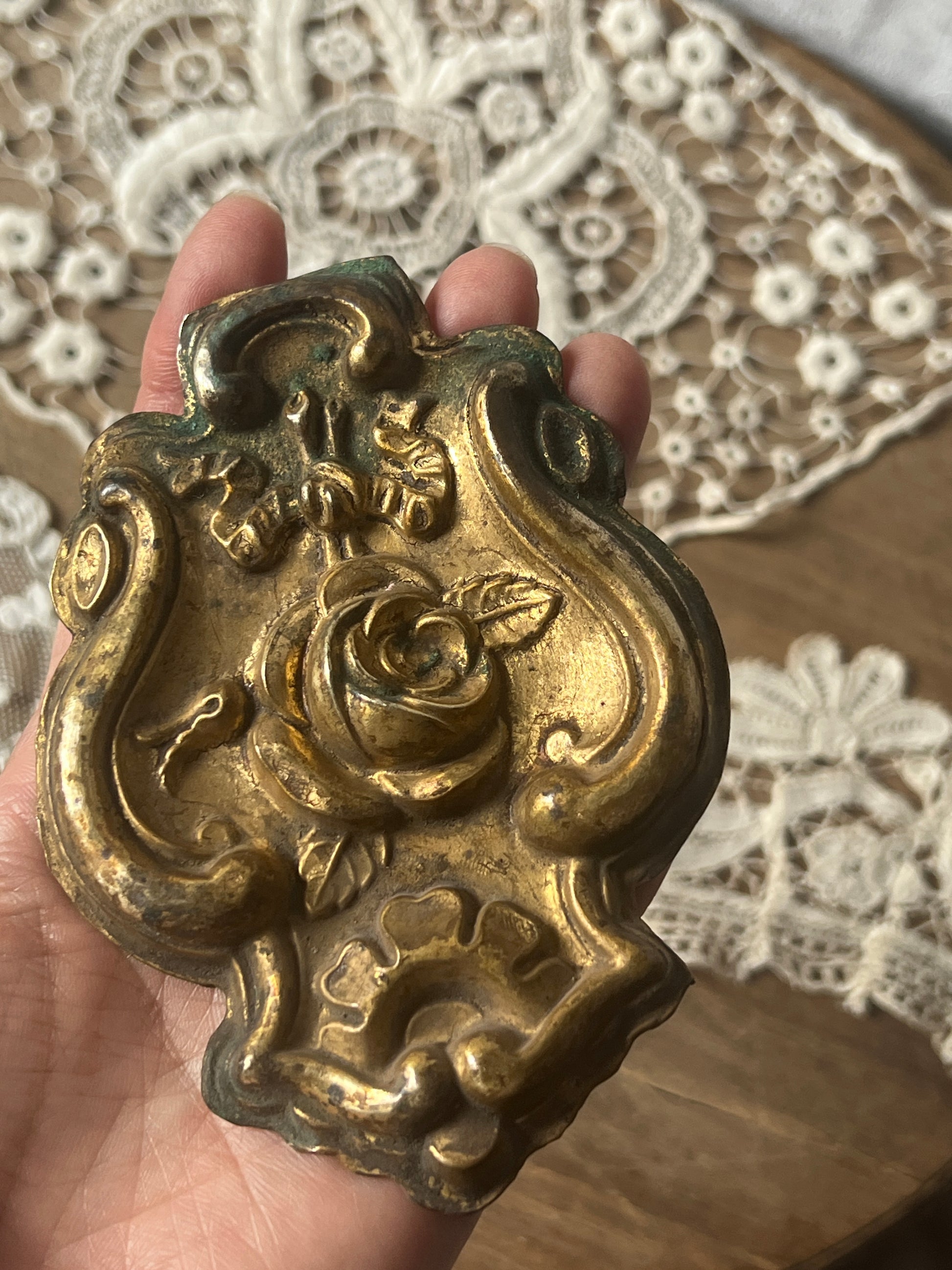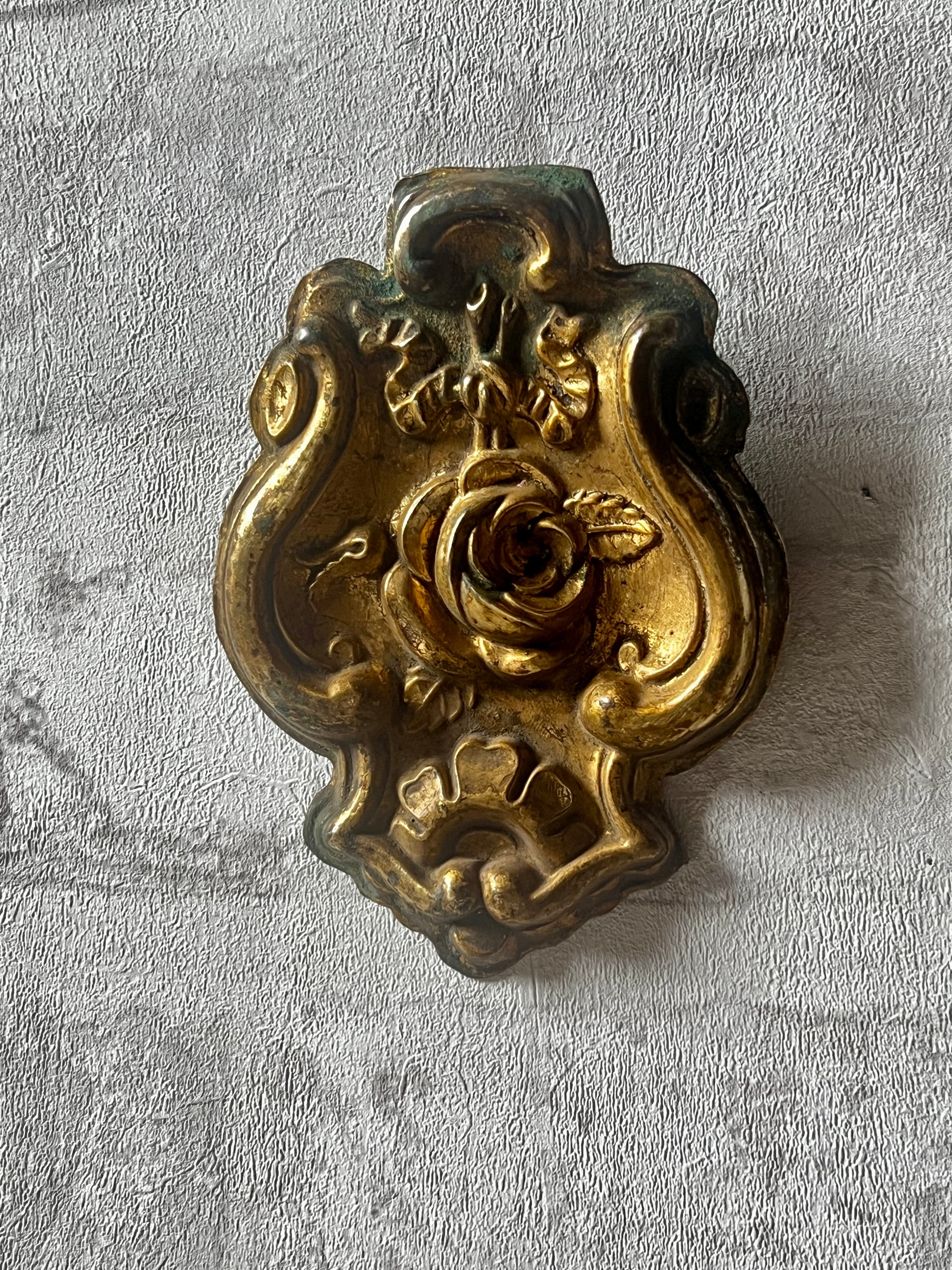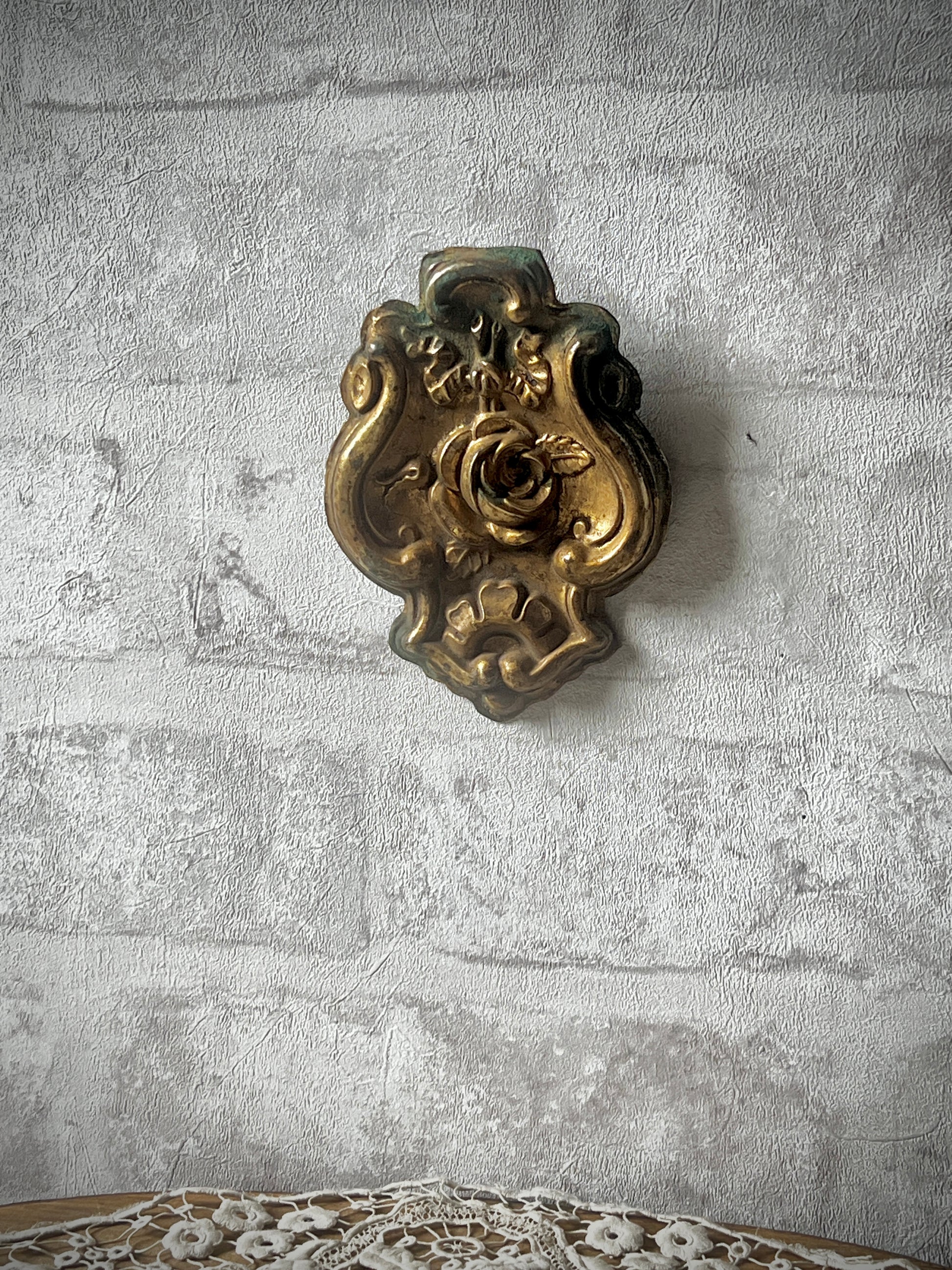 薔薇とリボンのモチーフがエレガントな雰囲気を漂わせる、真鍮製の飾りパーツです