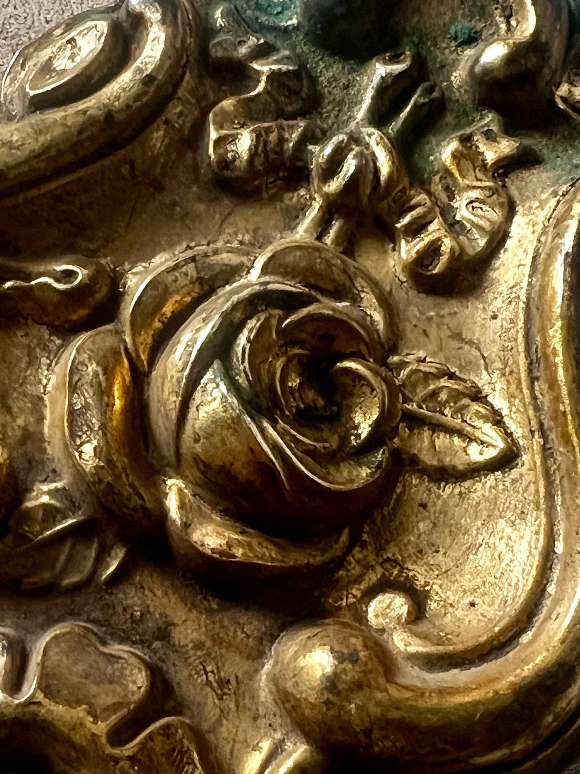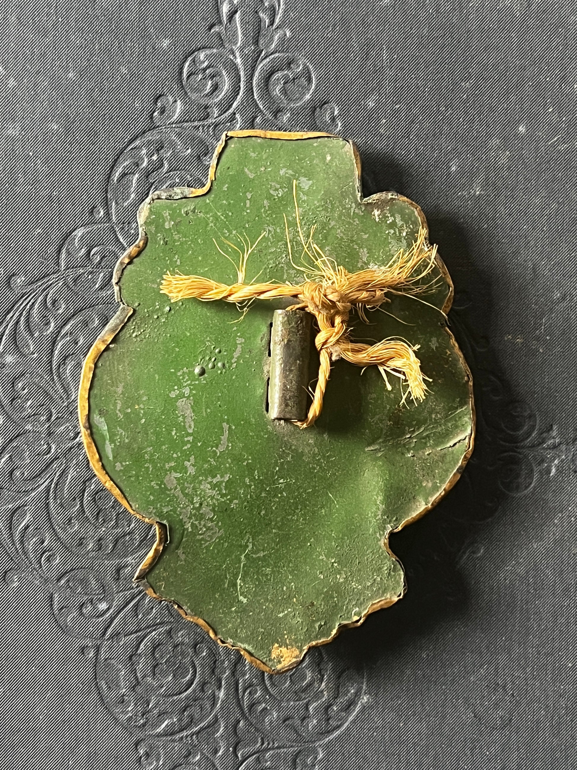 背面には取付金具のような突起があり、経年の汚れと緑青の残る箇所が見られます
