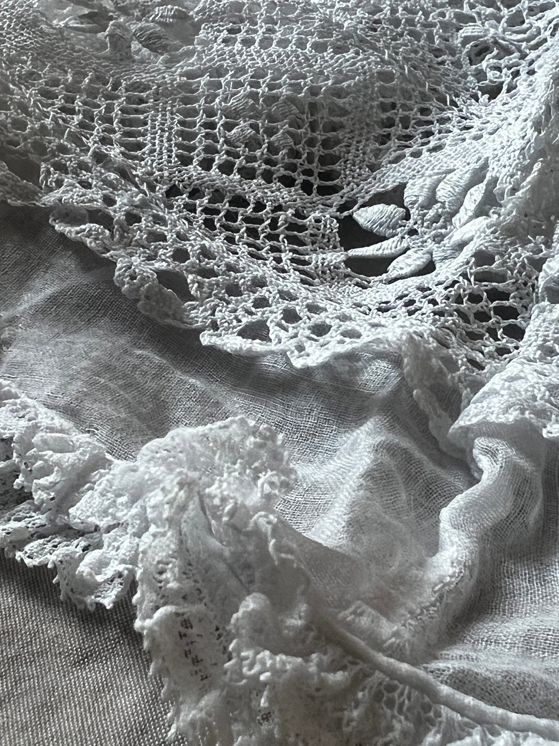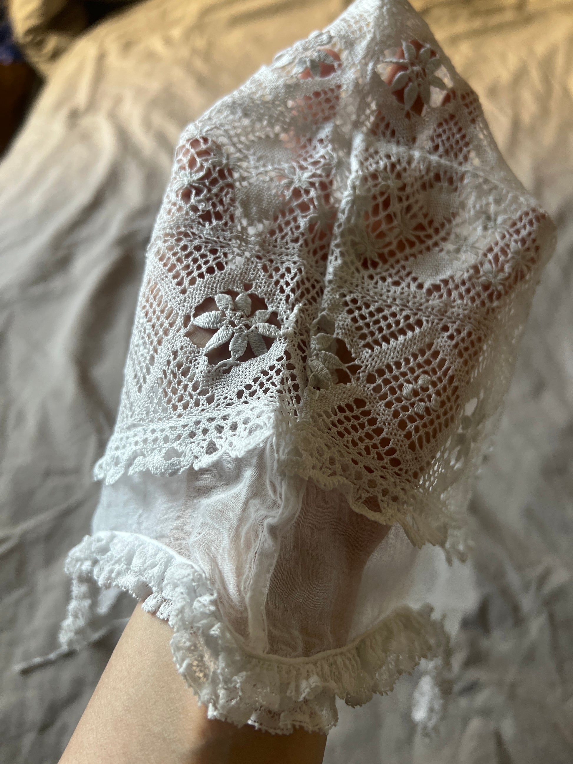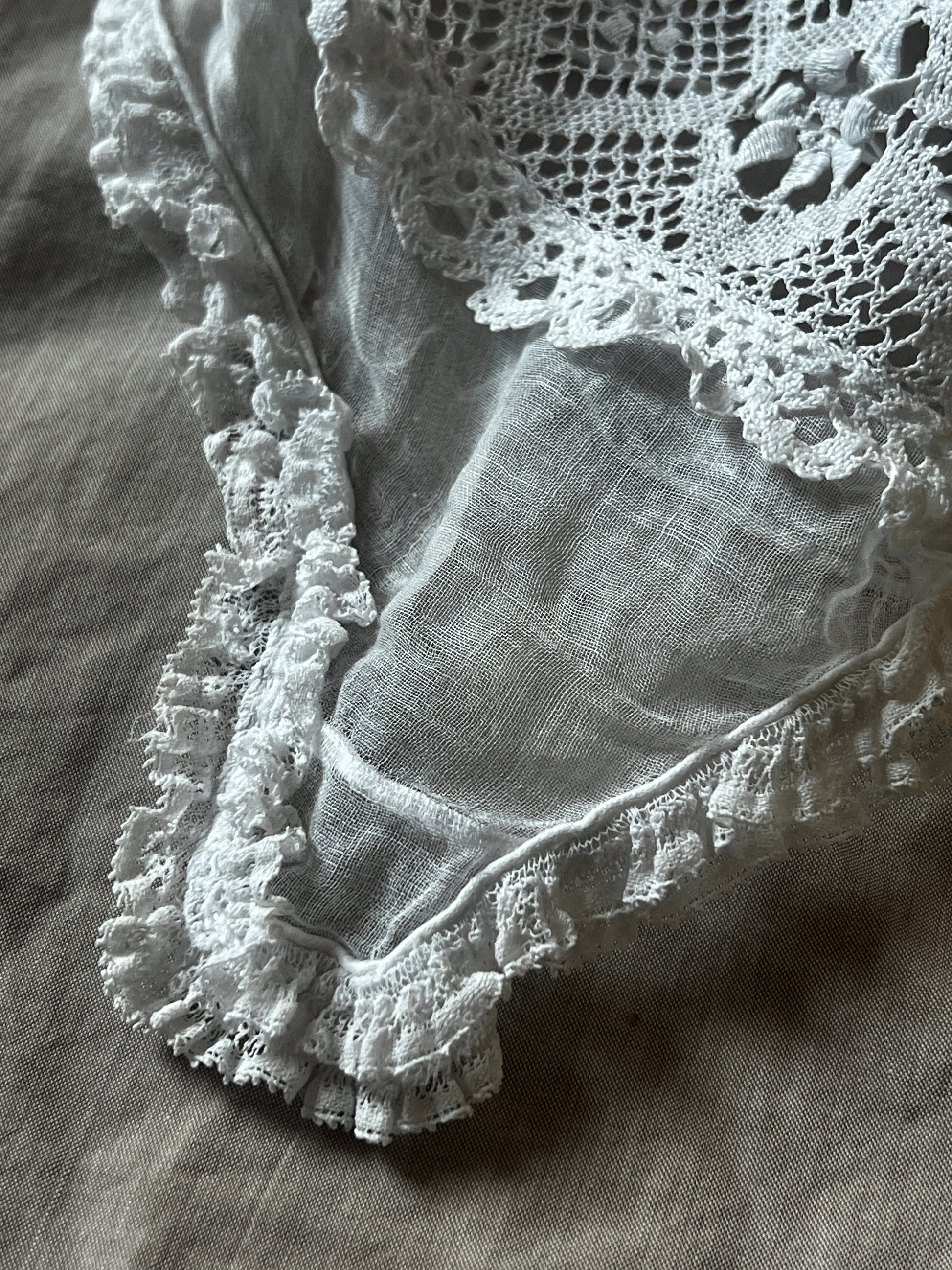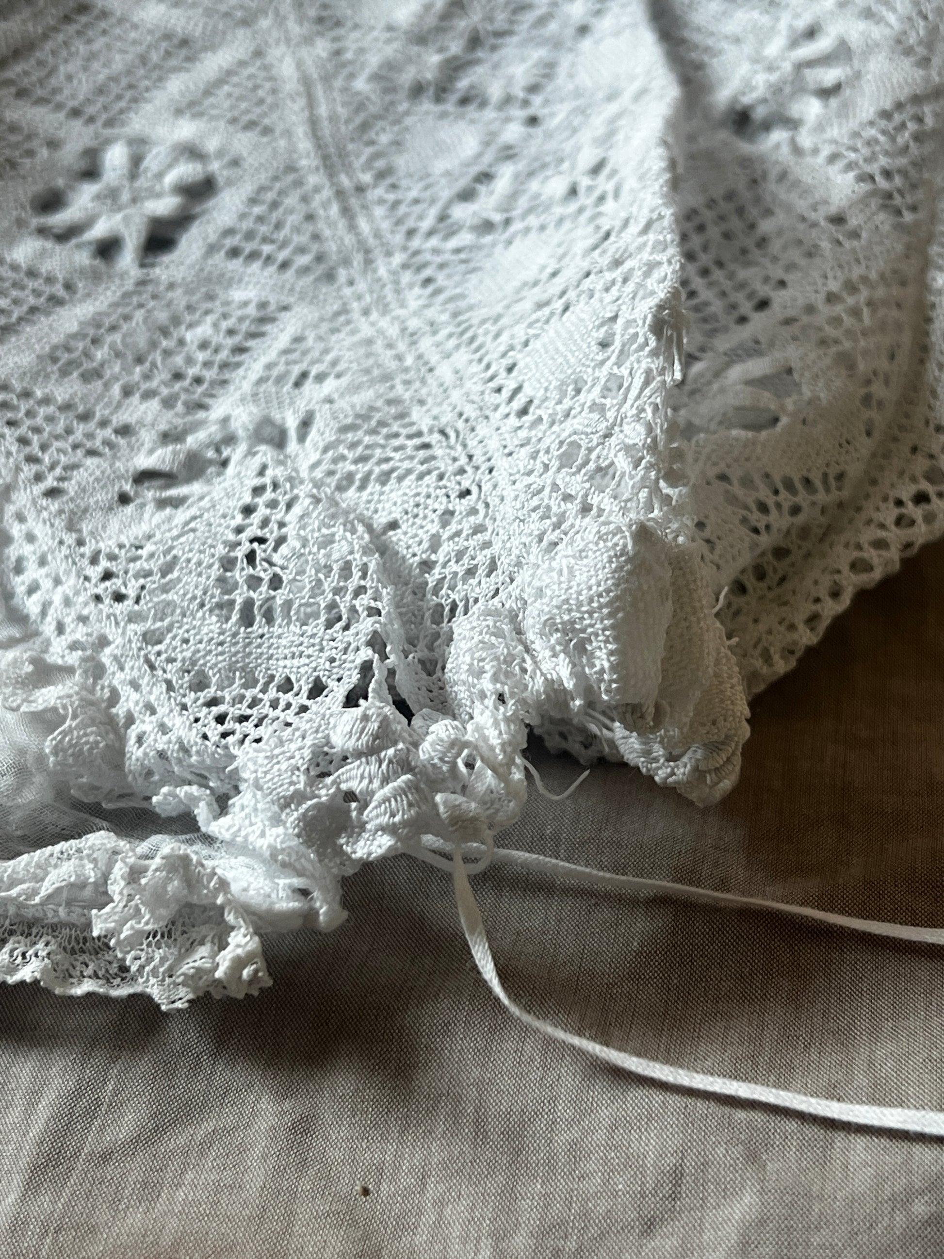 ボビンレースの組み合わせでデザインされた素朴な印象のボネです