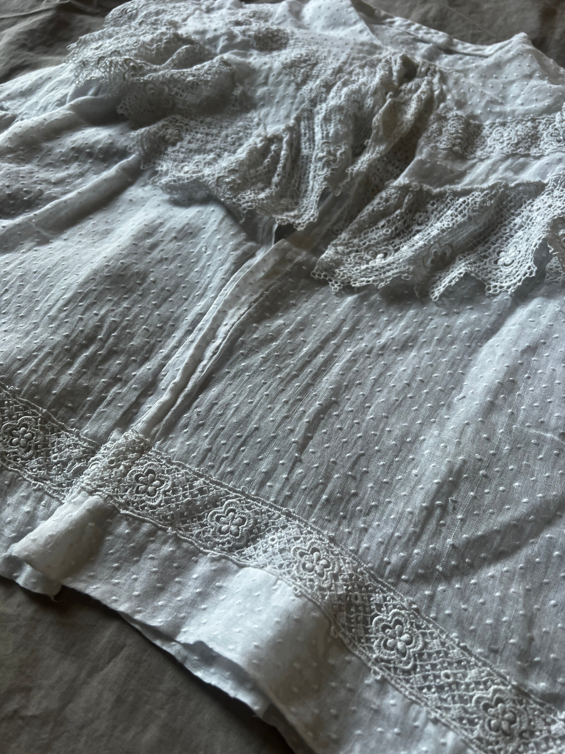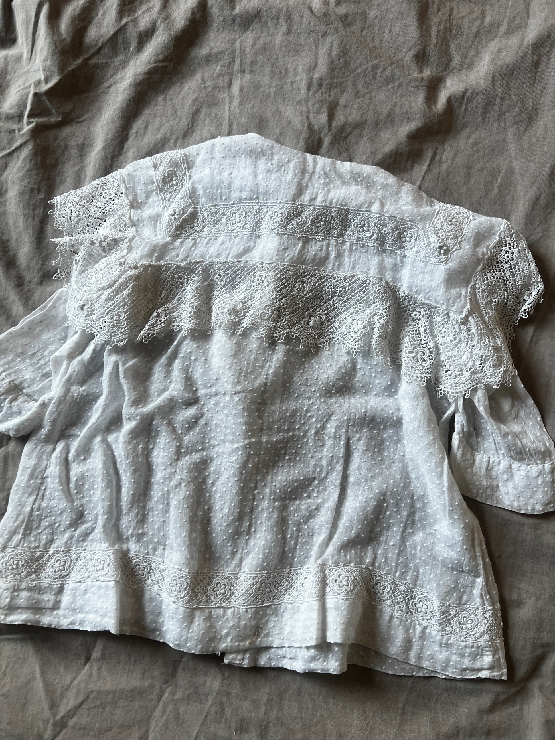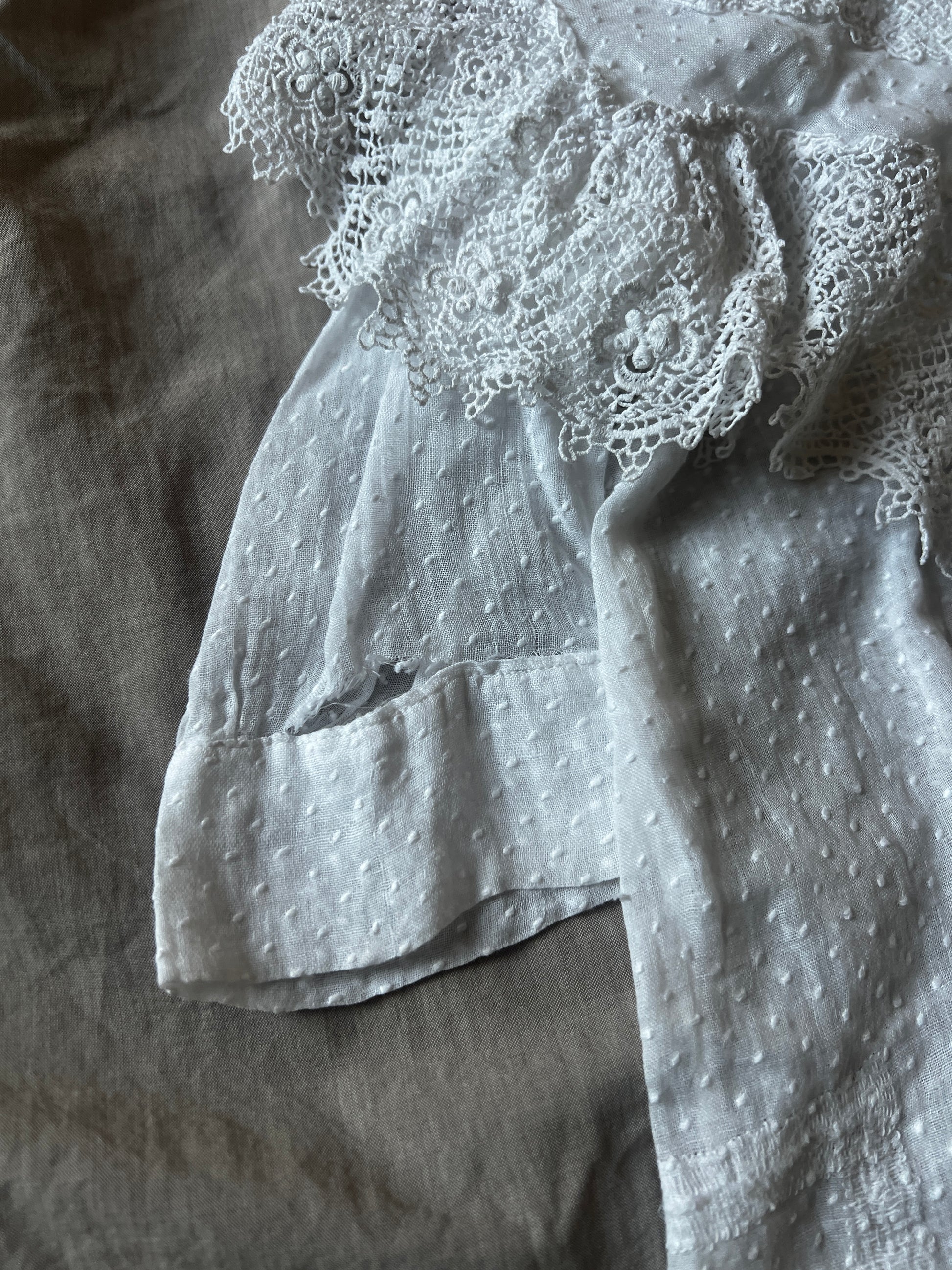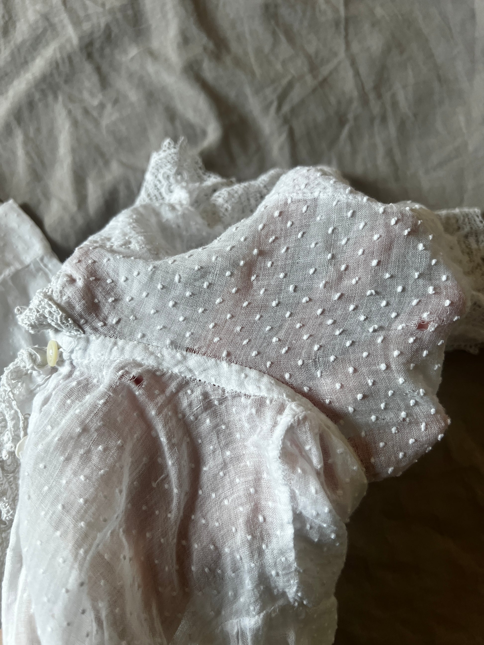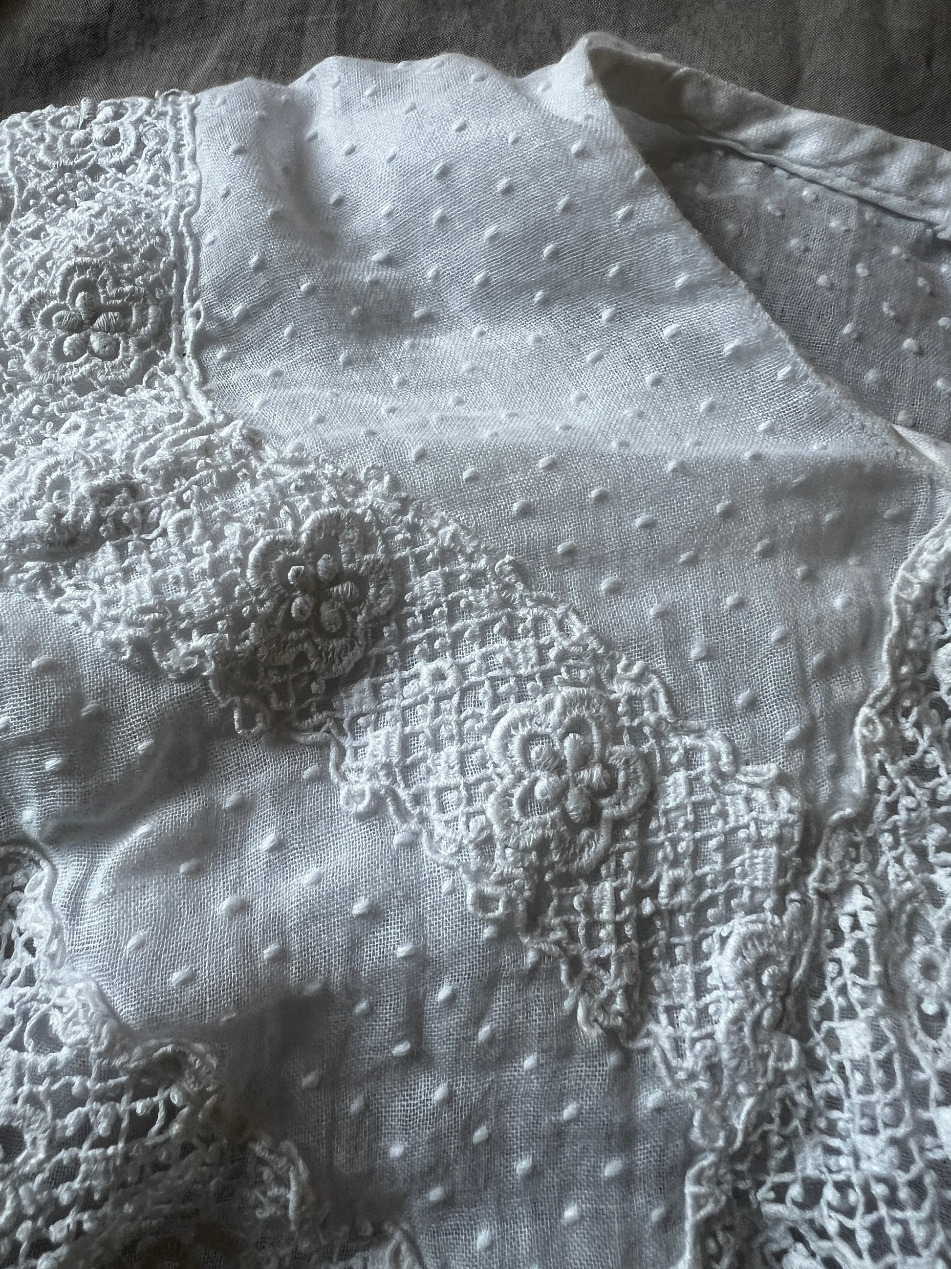大きな襟とドット刺繍の布地がとてもかわいらしい印象のベビードレスです