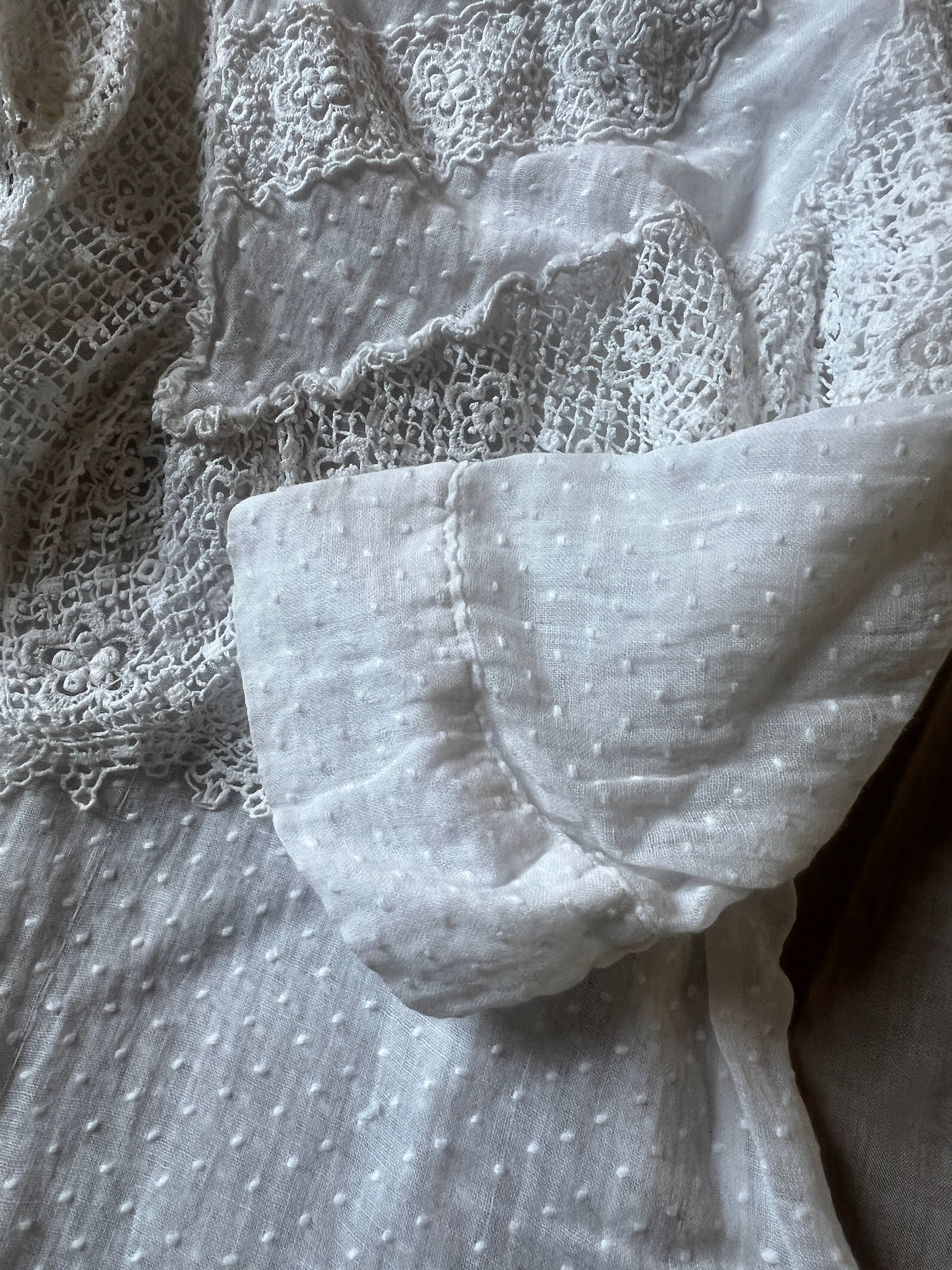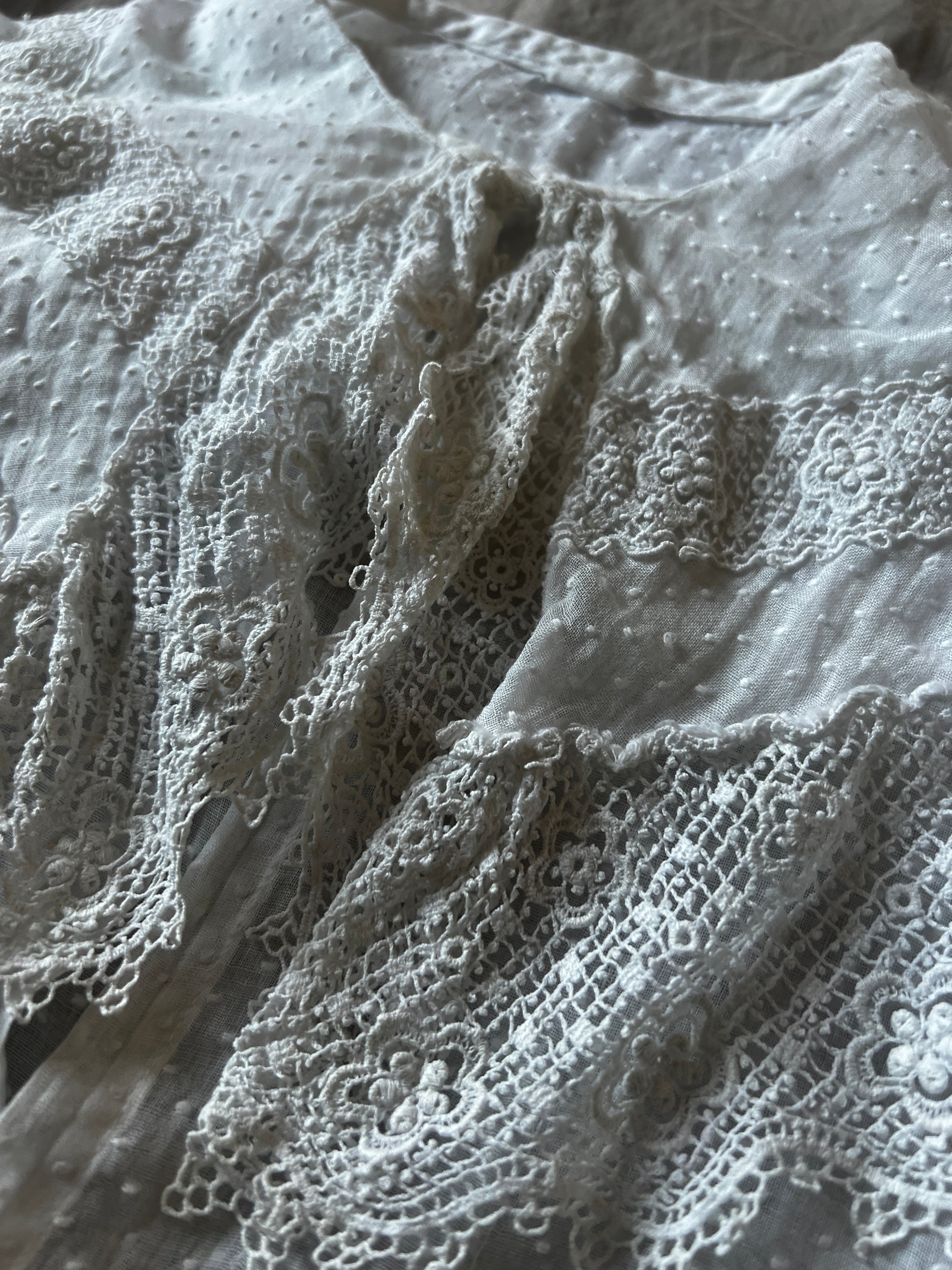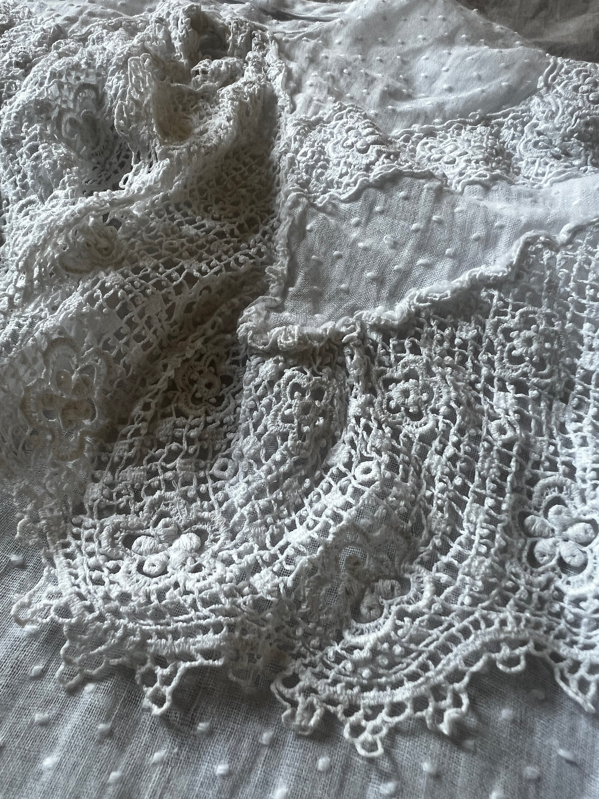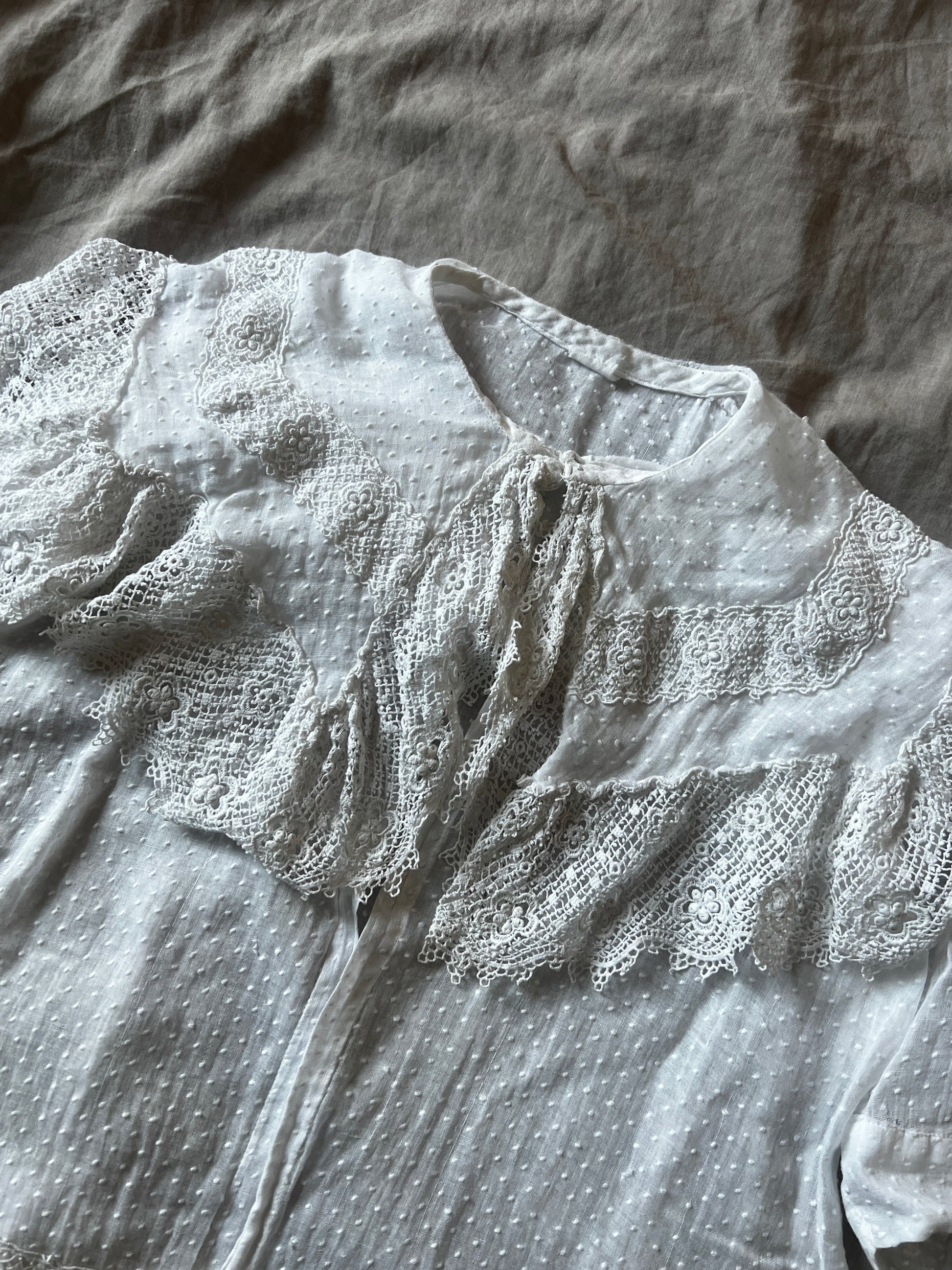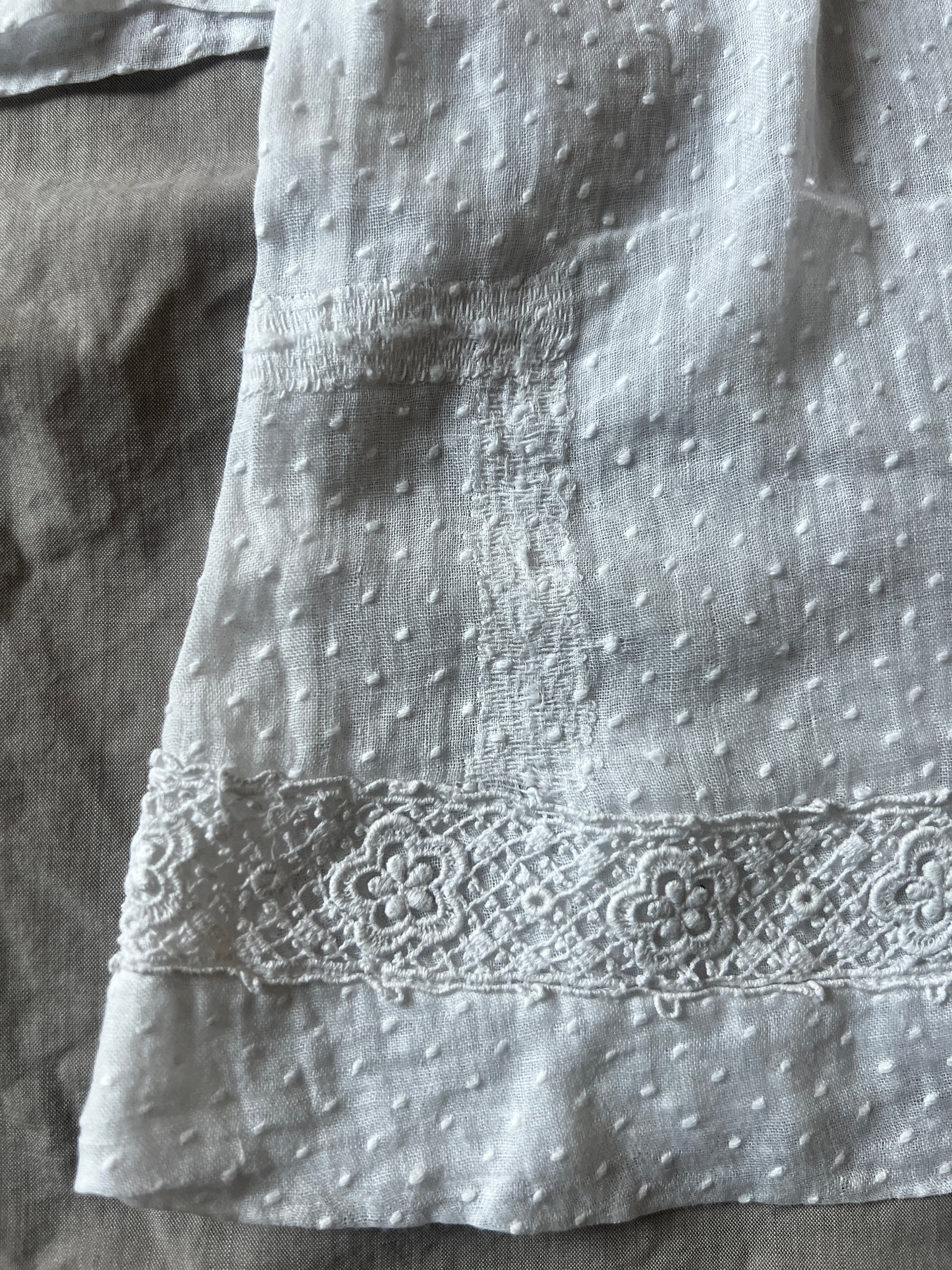 大きな襟とドット刺繍の布地がとてもかわいらしい印象のベビードレスです