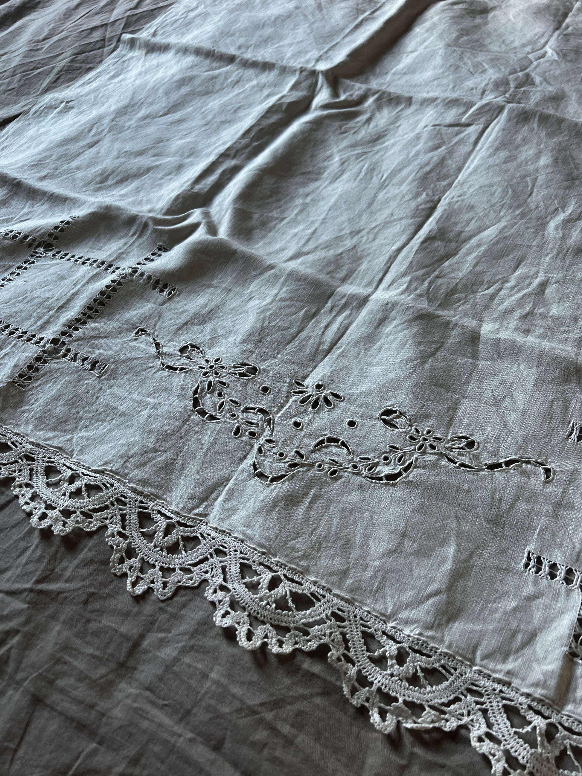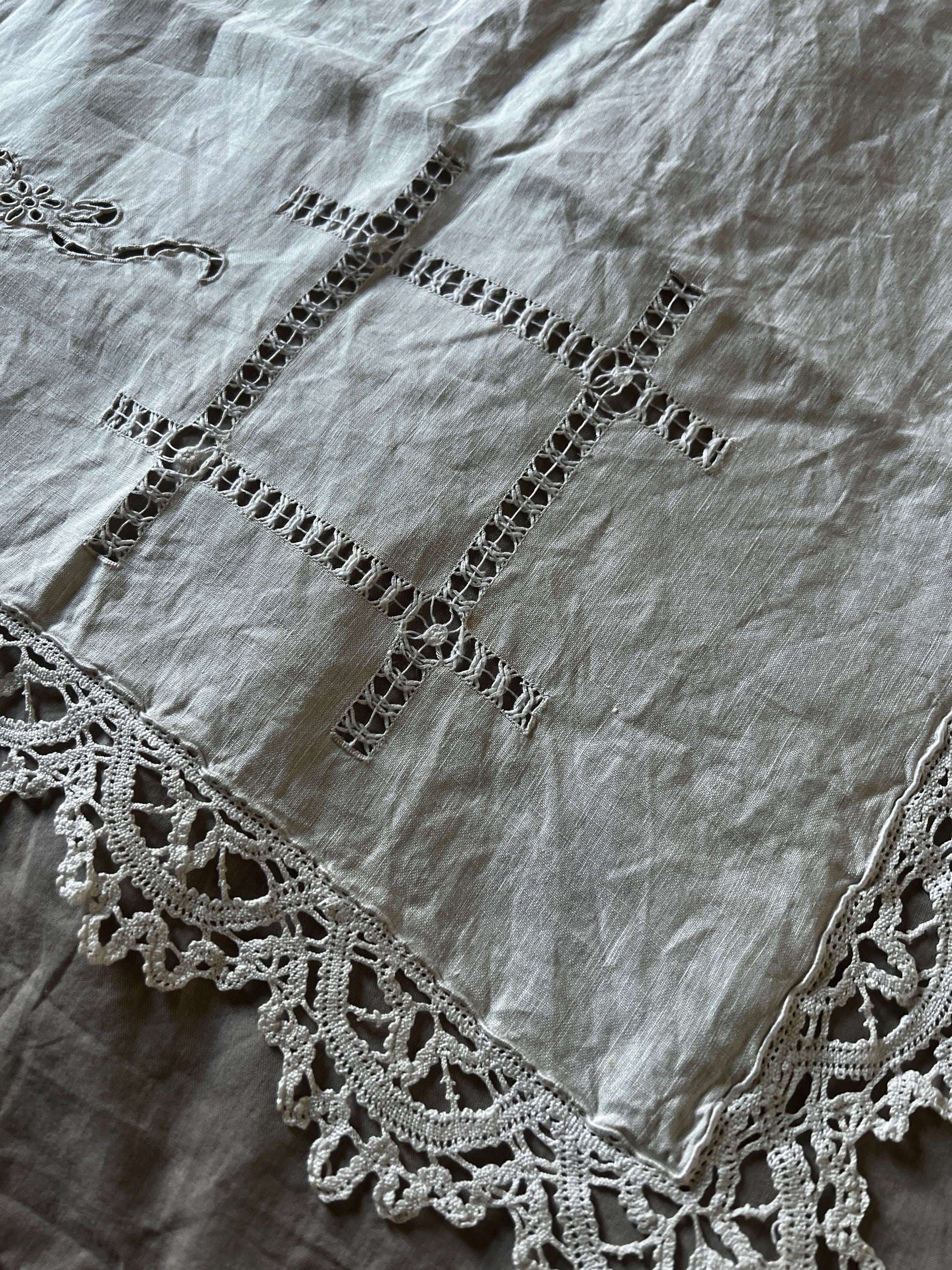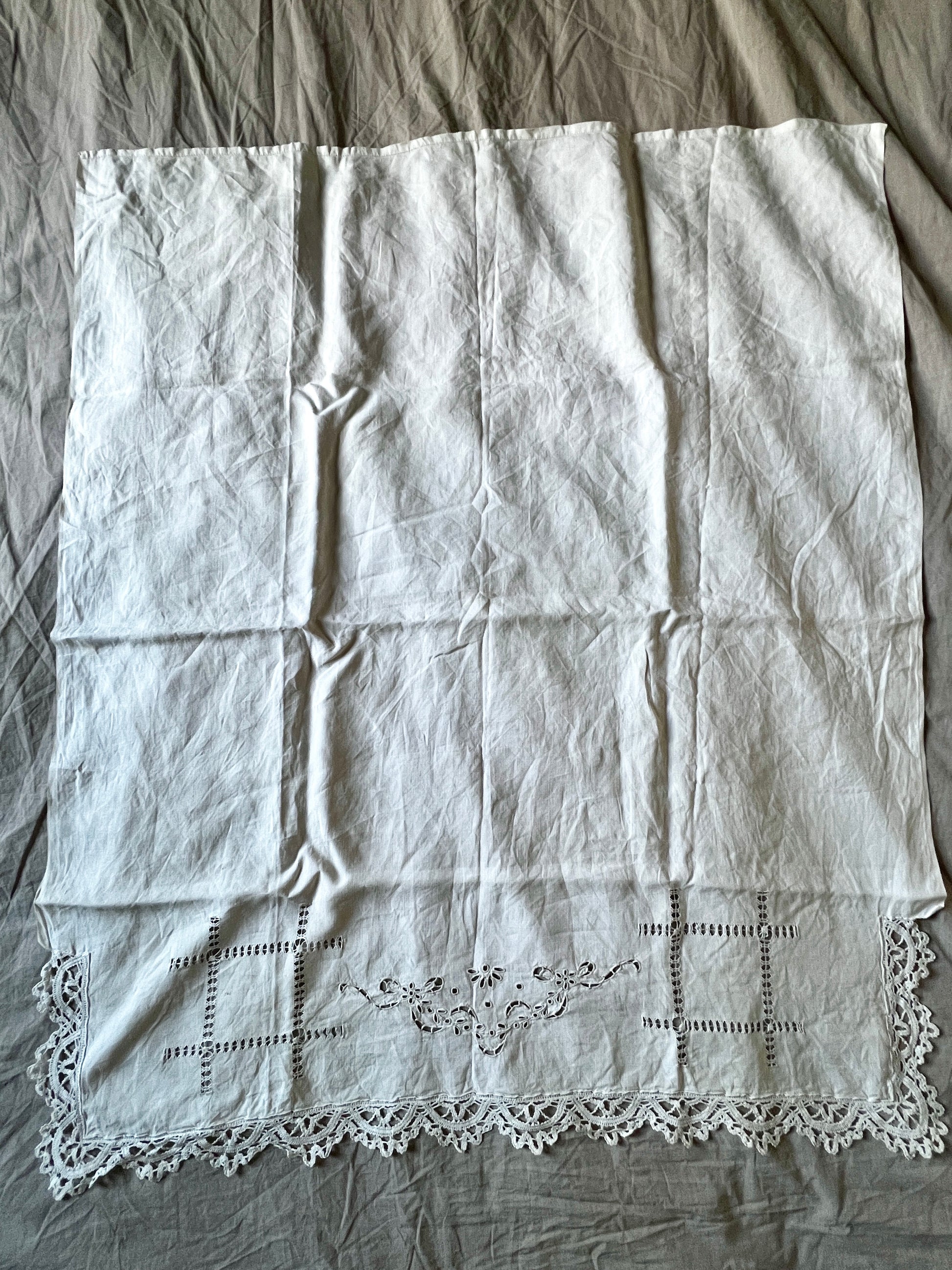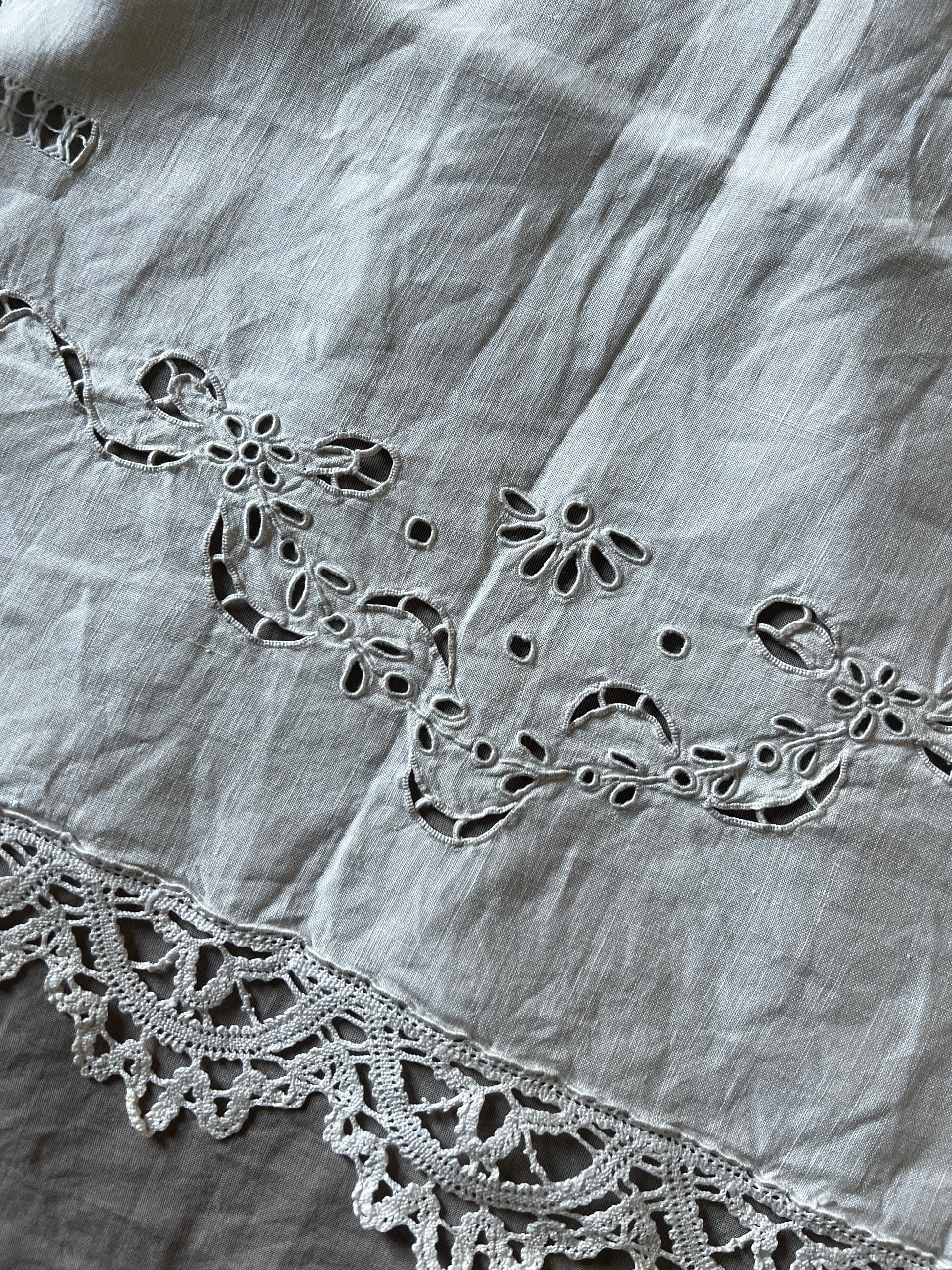 端部分に刺繍とレース飾りがあしらわれたべべ用のベッドリネンです