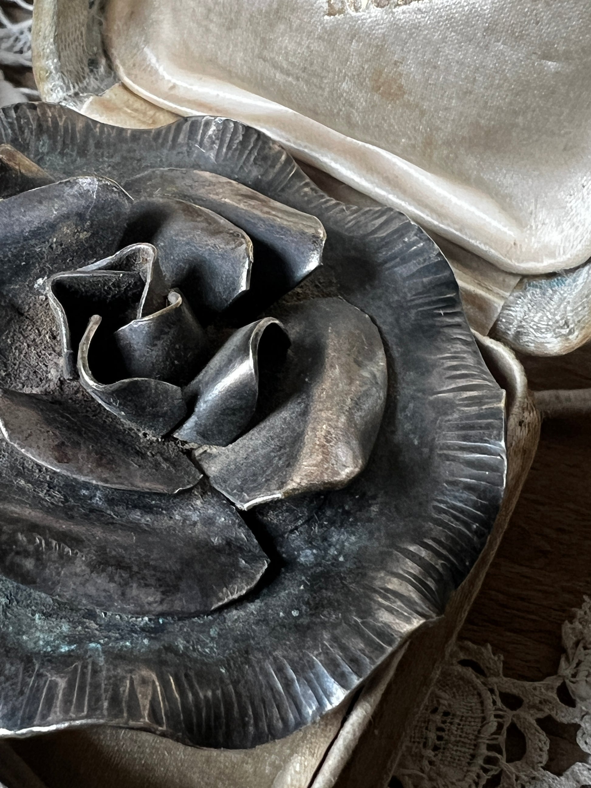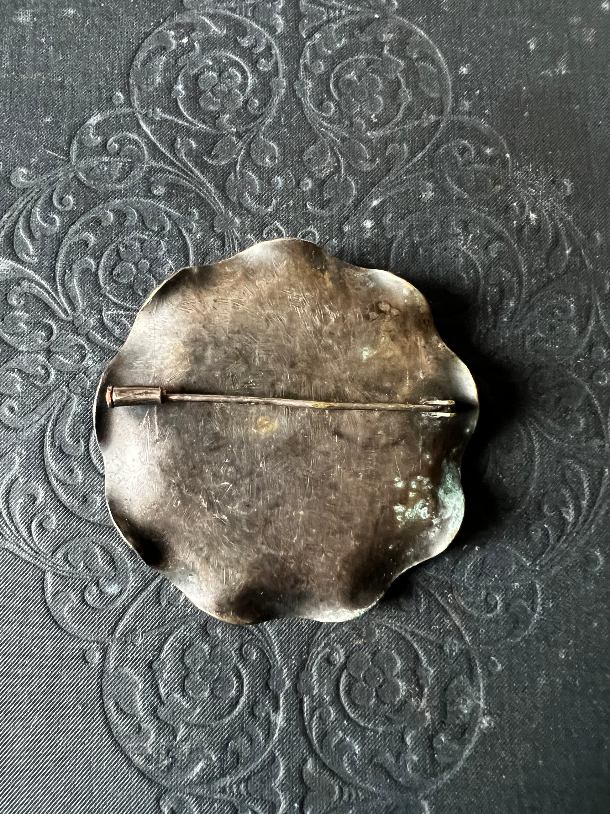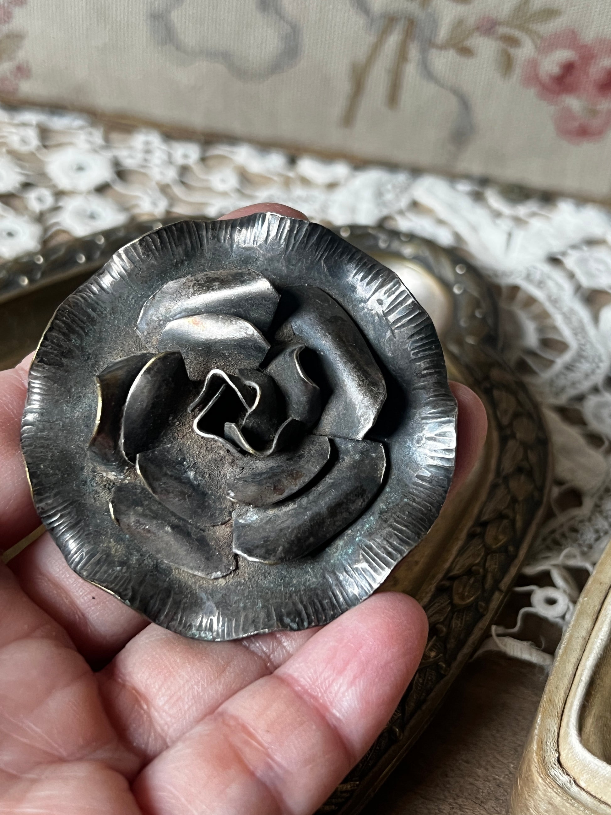 立体的な花びらのデザインが目を引く、メタル製のアンティークブローチです