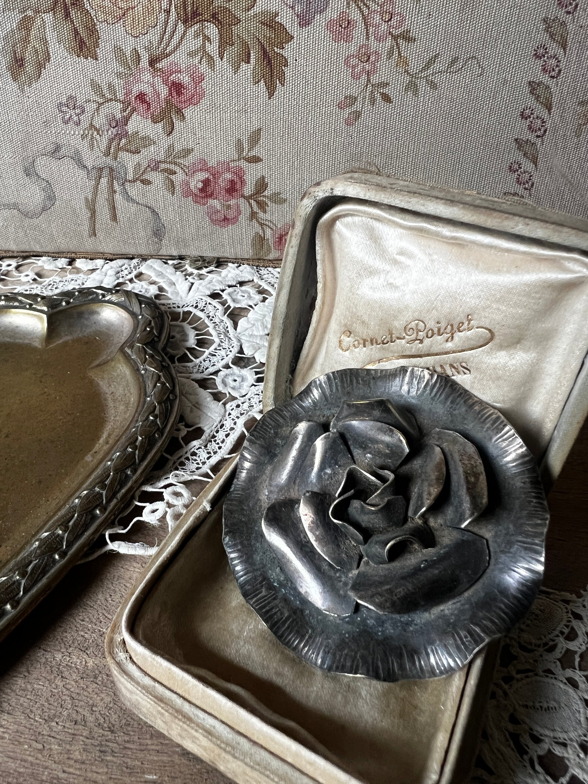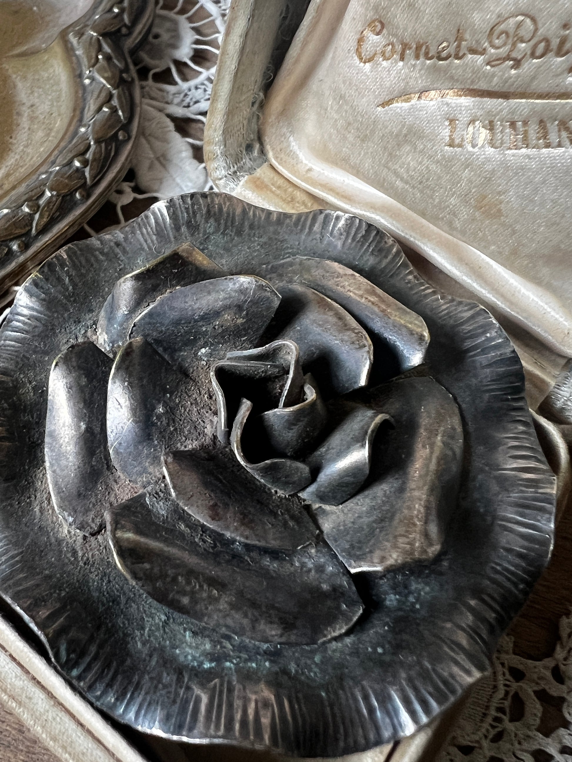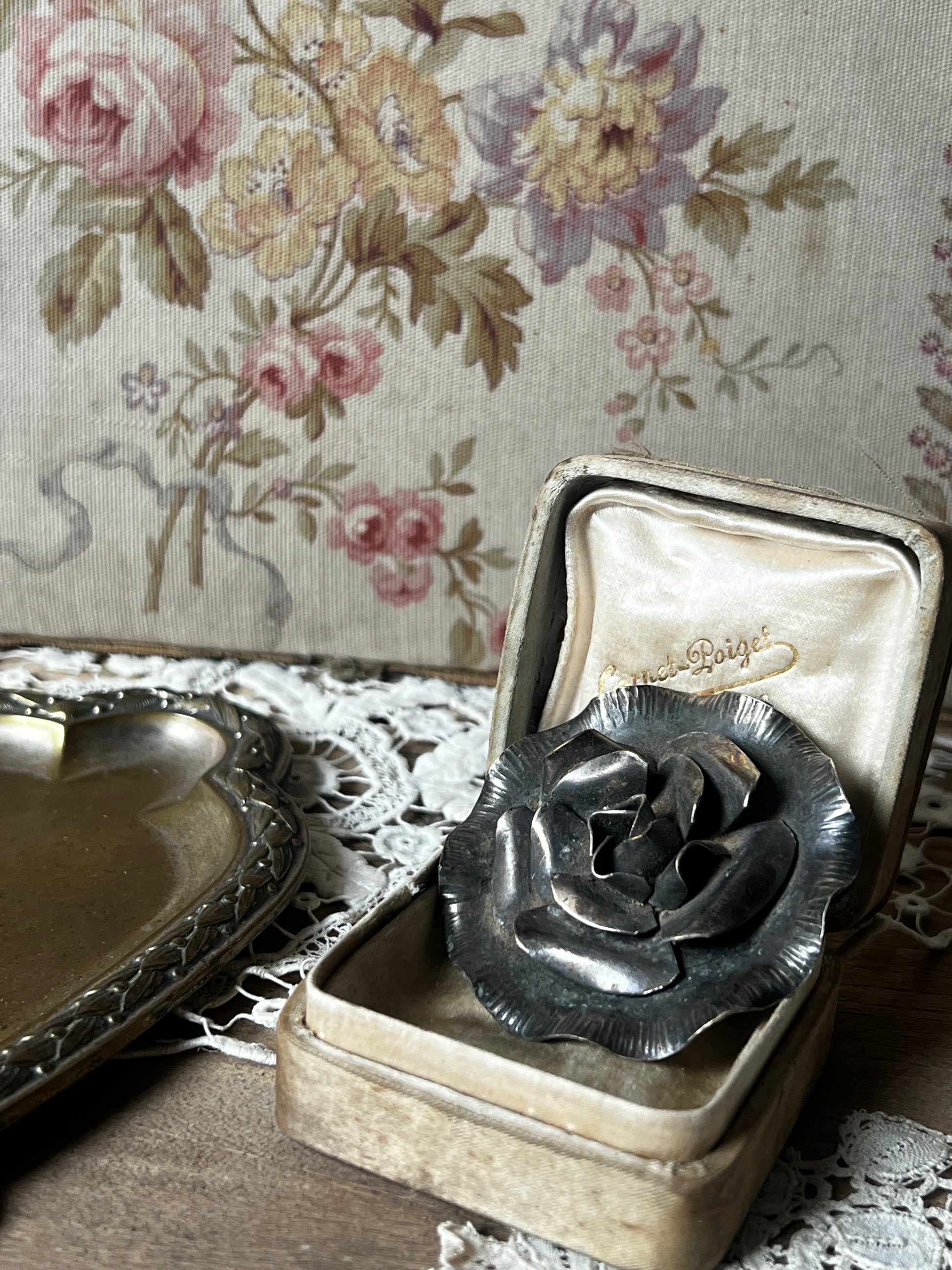 立体的な花びらのデザインが目を引く、メタル製のアンティークブローチです