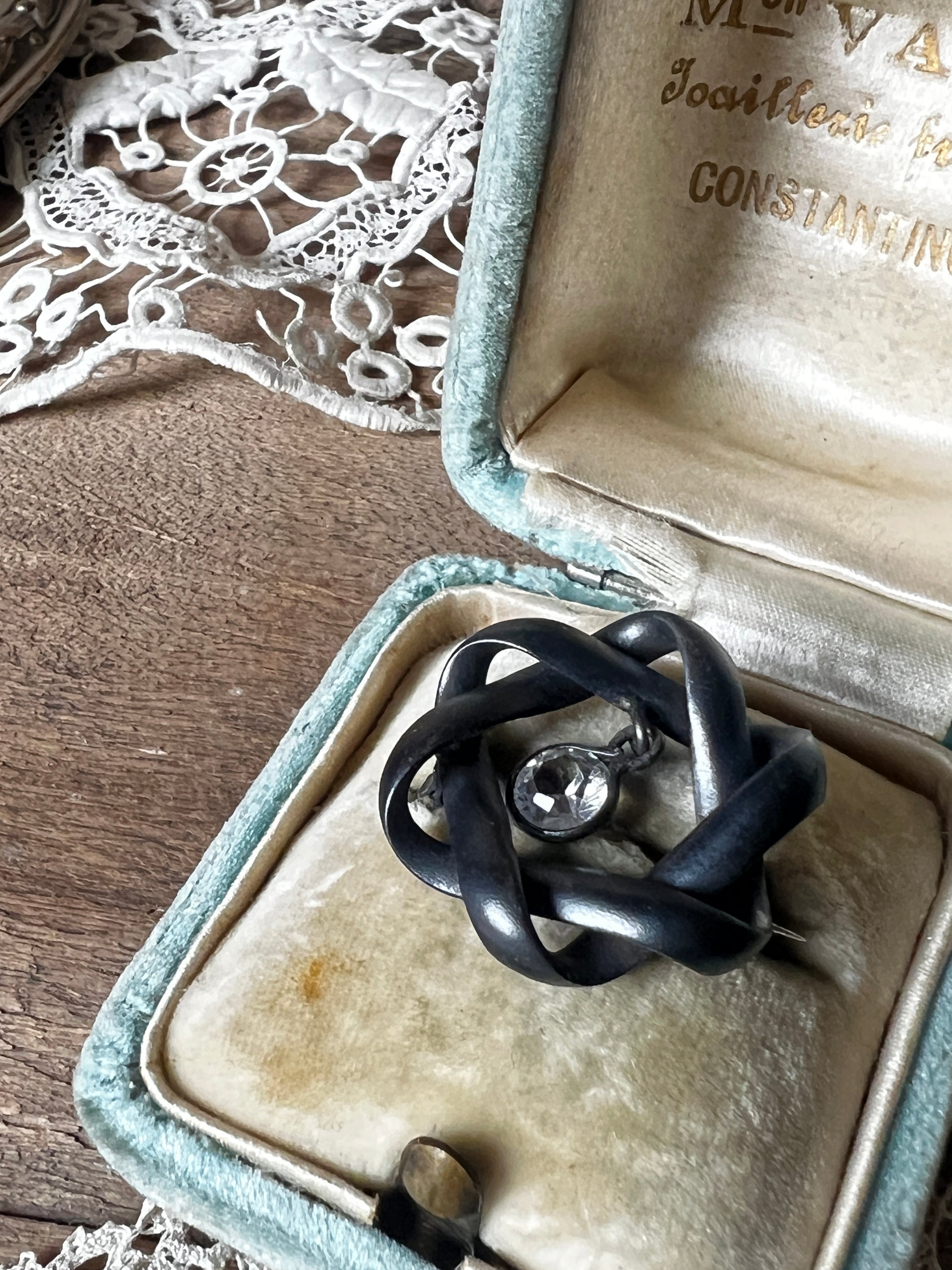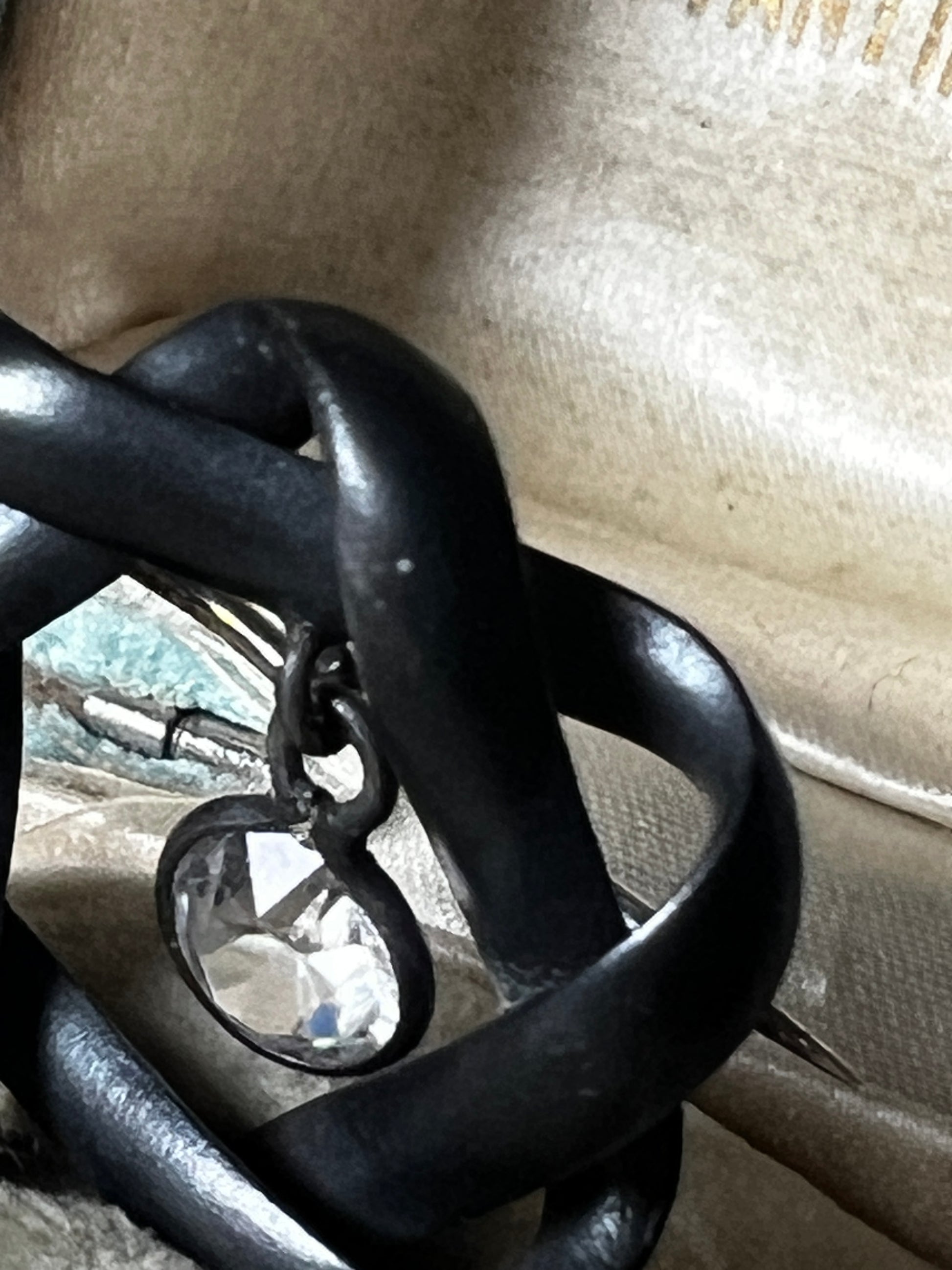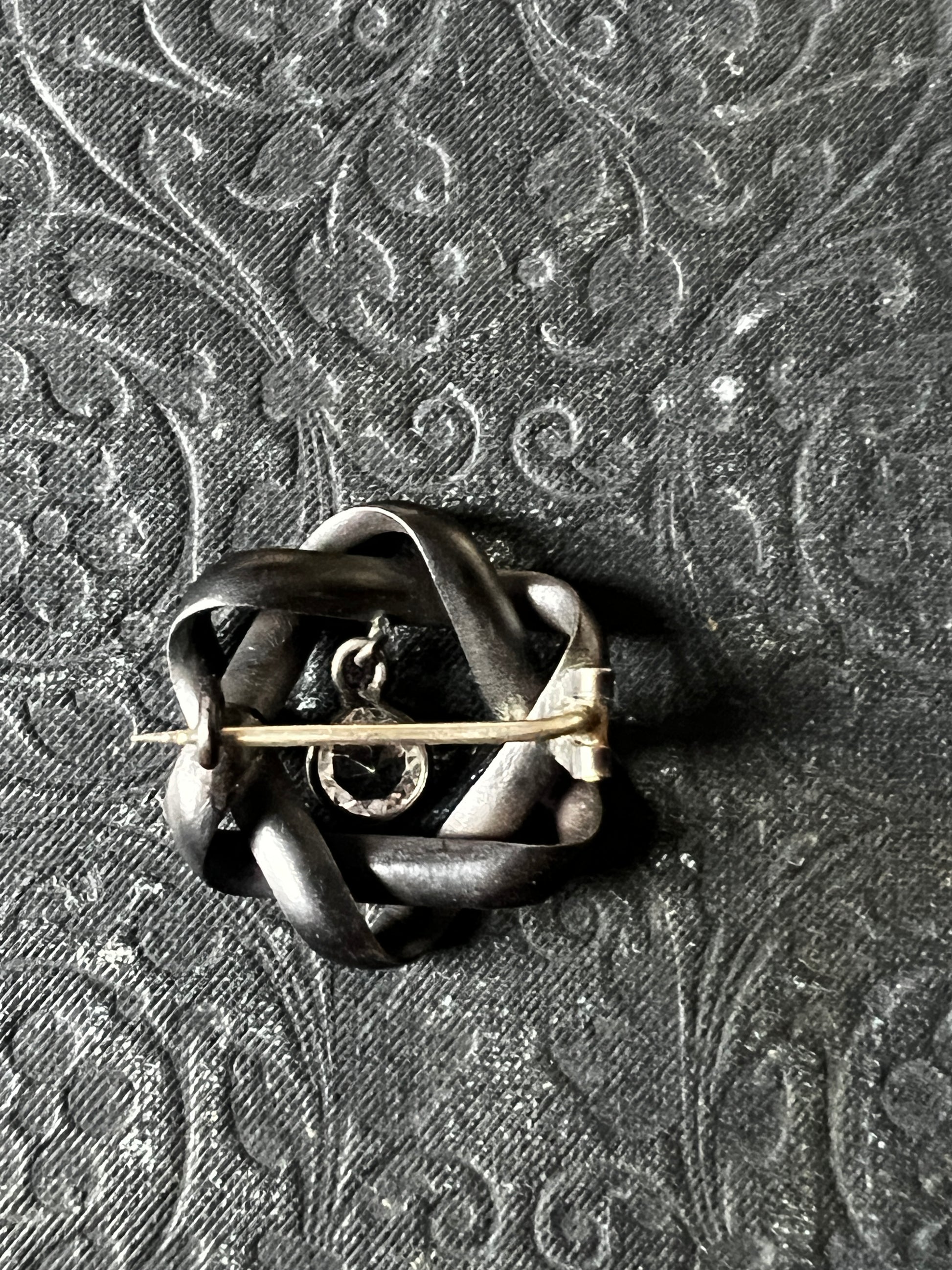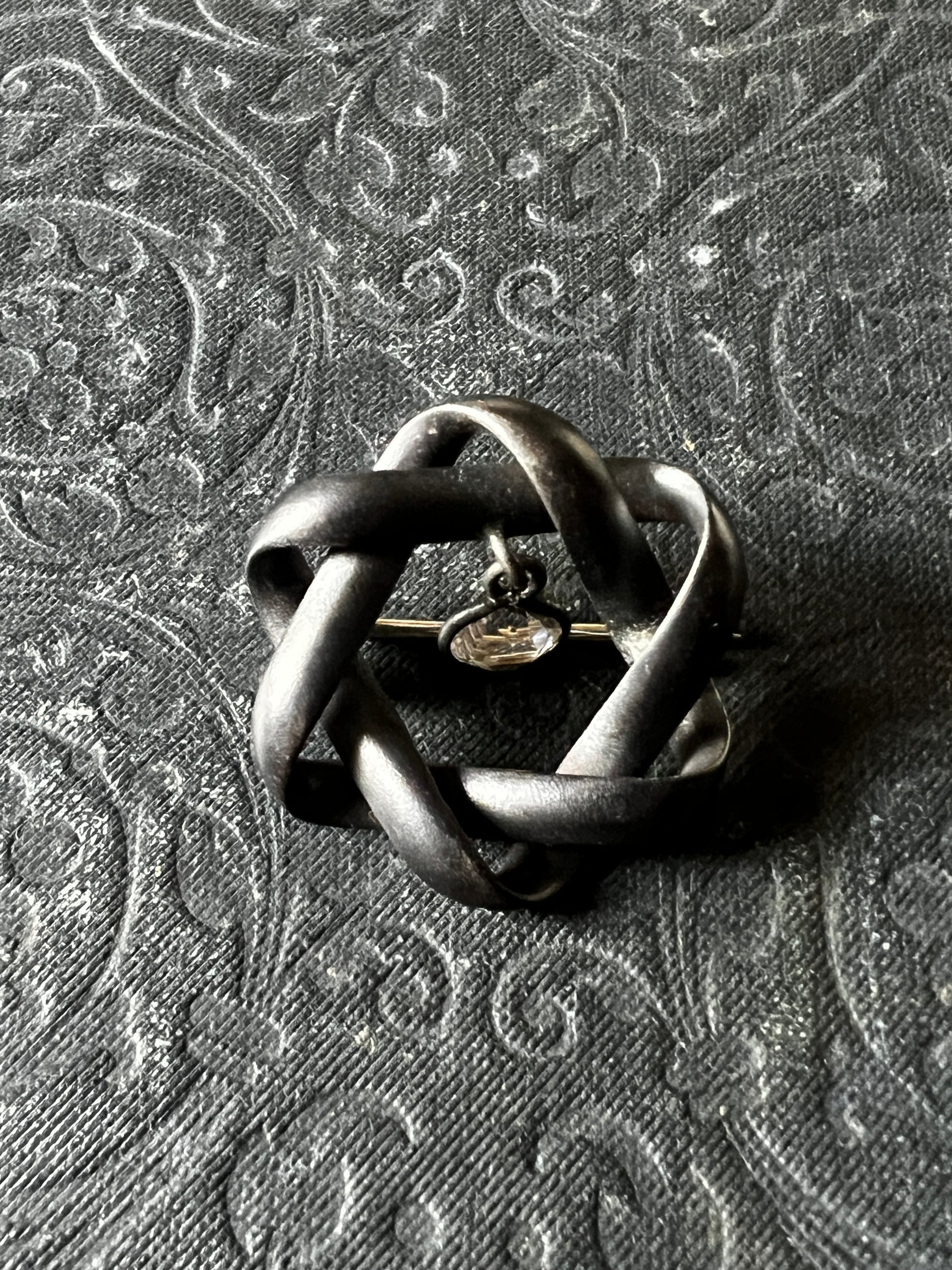 中央に揺れるストラスチャームがあしらわれた、小ぶりながら印象的なブローチです