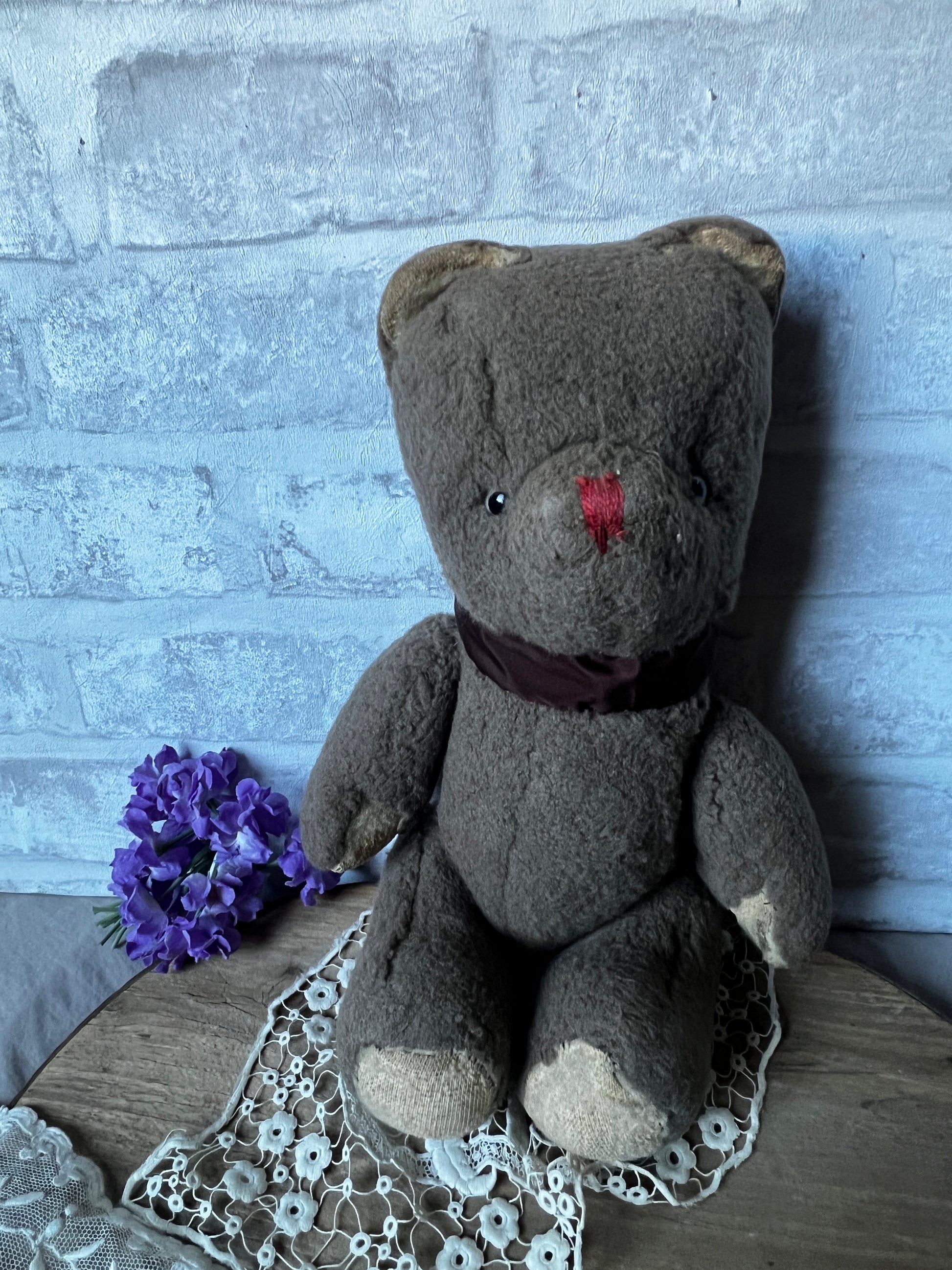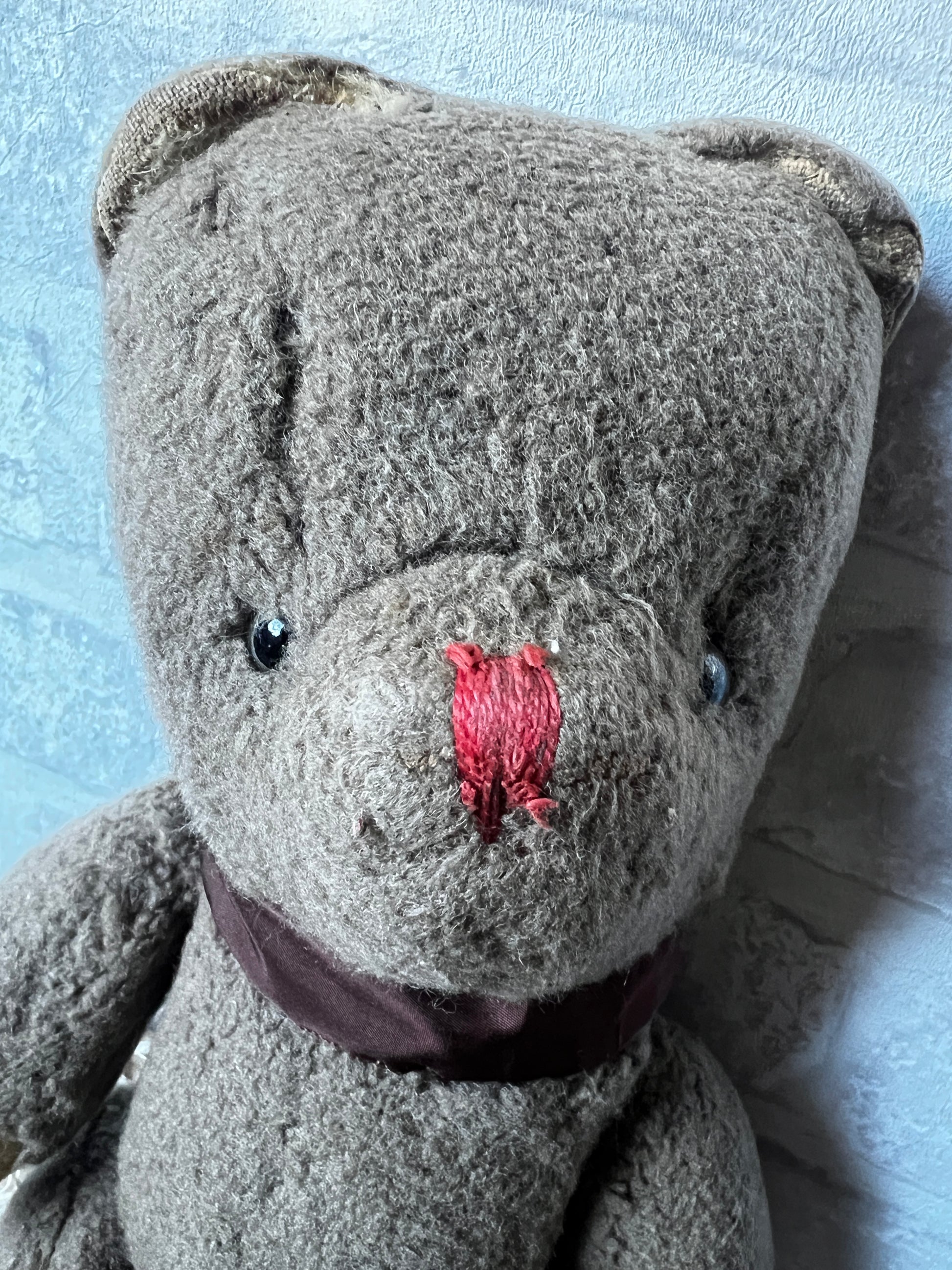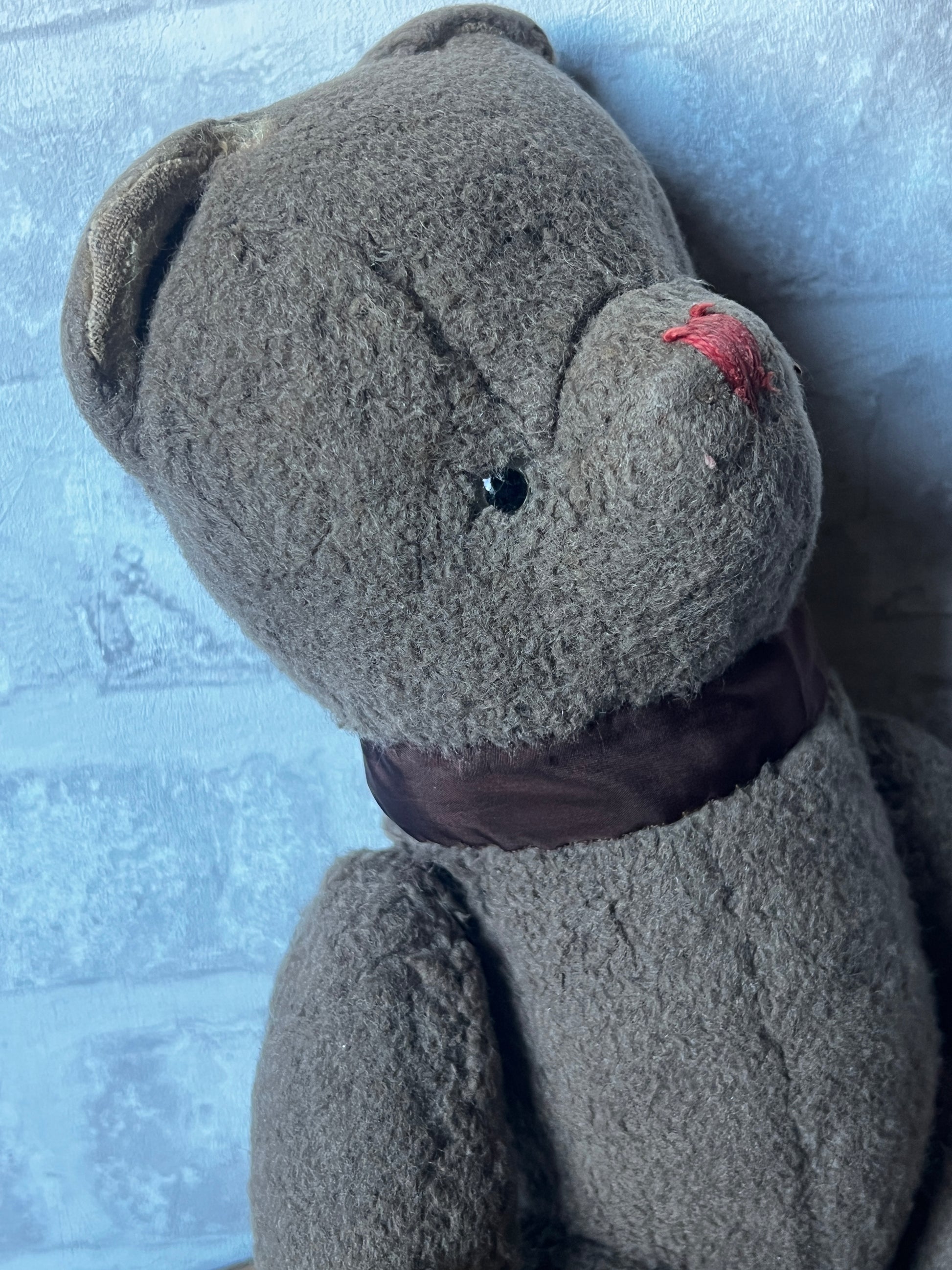 ややグレーがかった優しい色合いと、ふわふわとした手触りが魅力のくまのぬいぐるみです