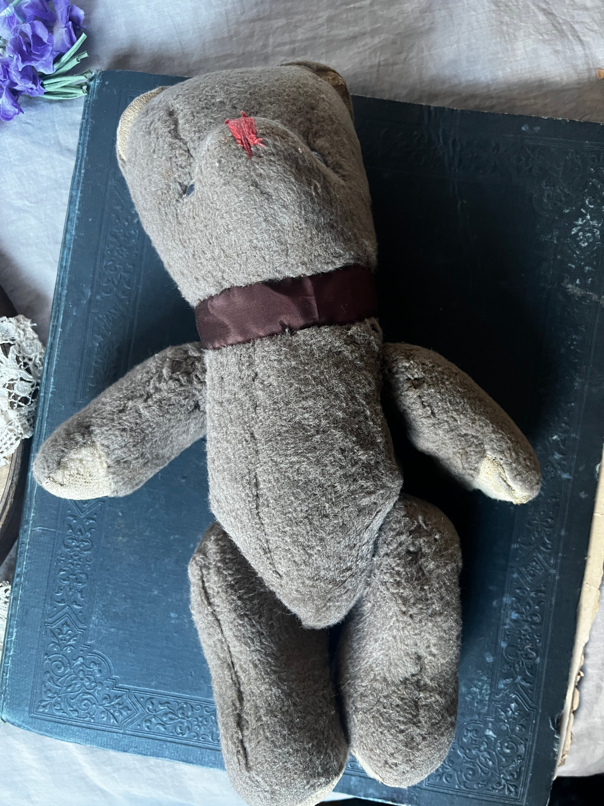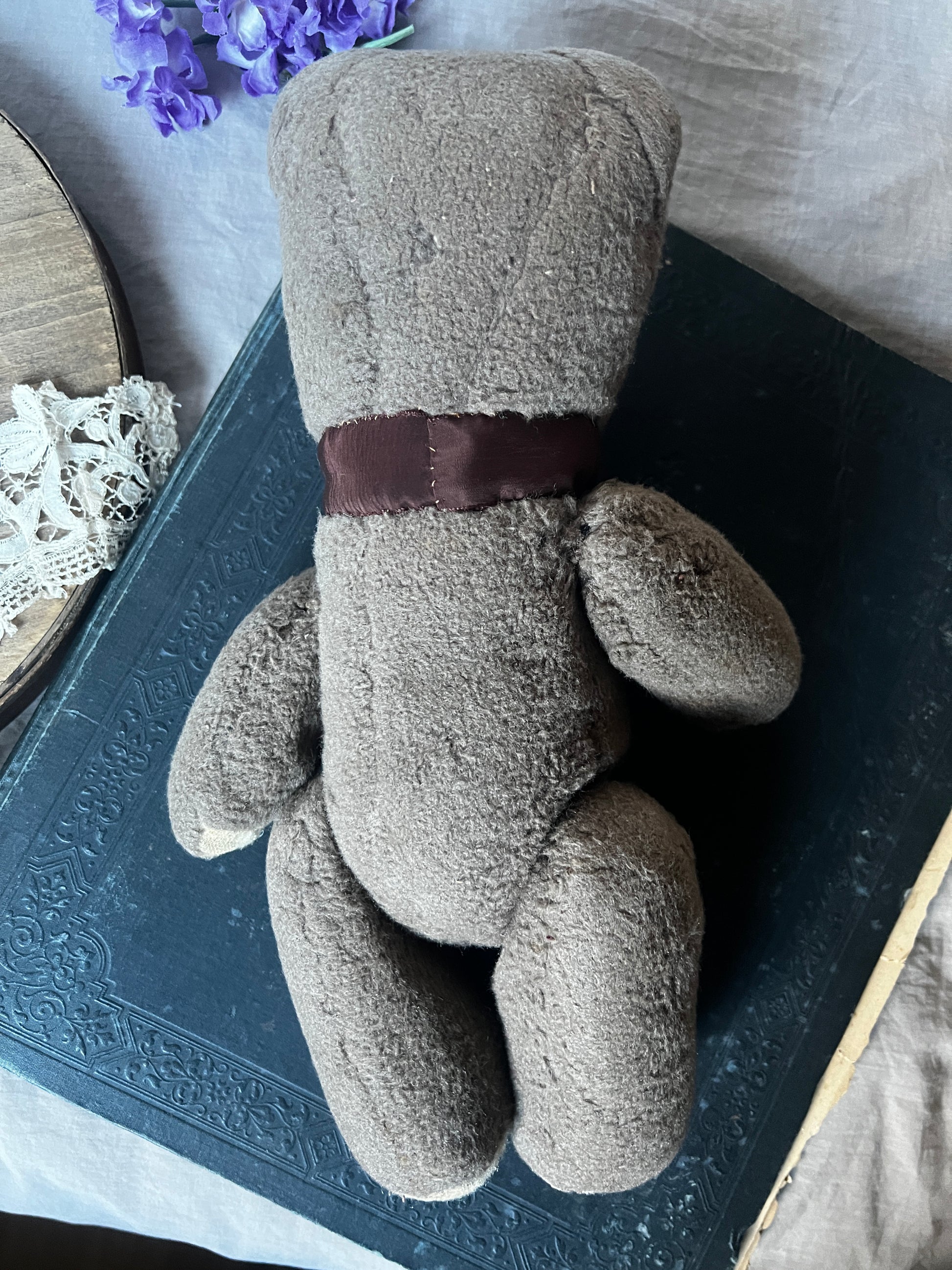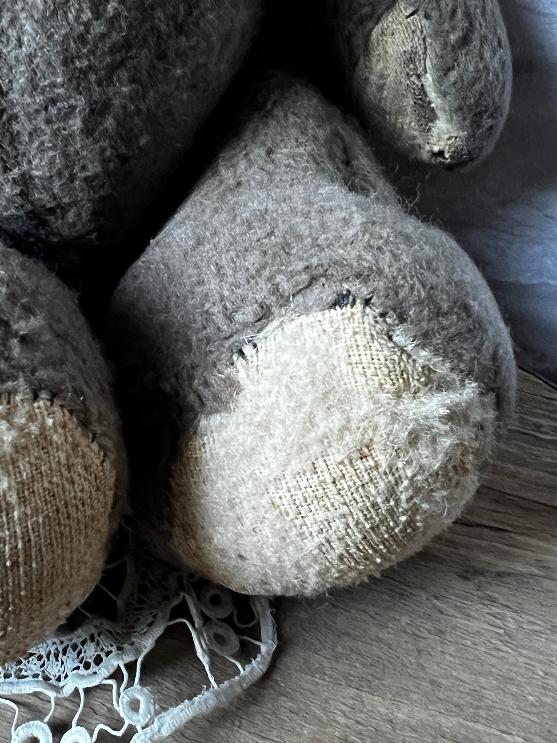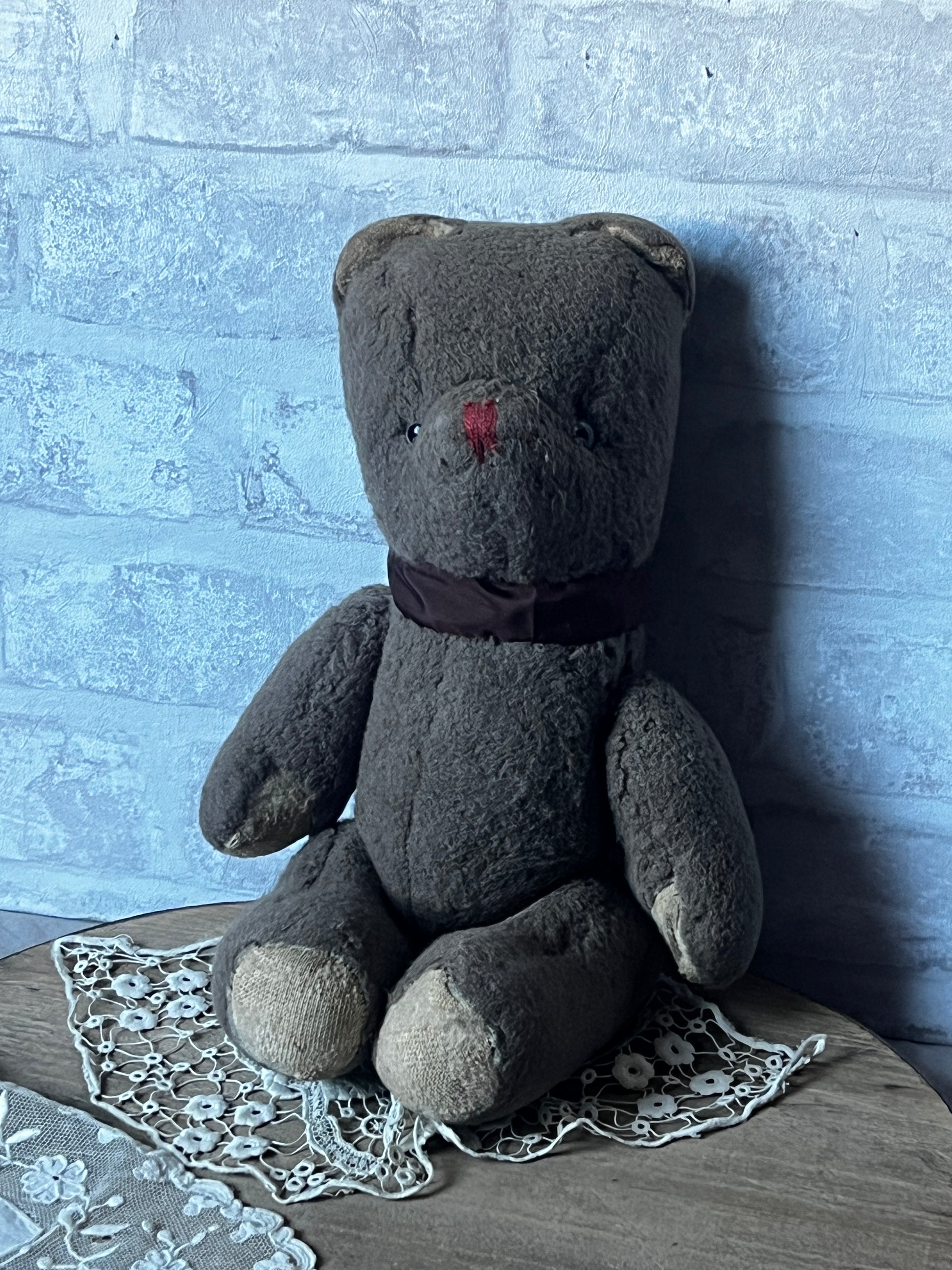 ややグレーがかった優しい色合いと、ふわふわとした手触りが魅力のくまのぬいぐるみです