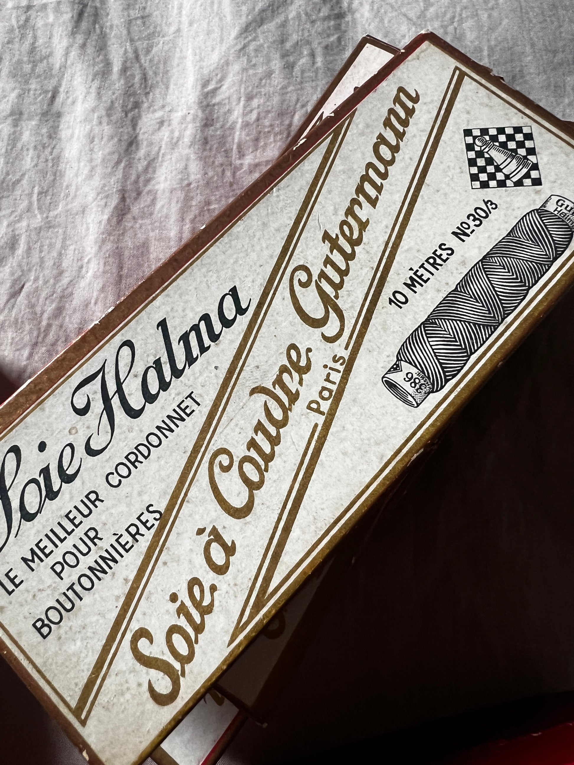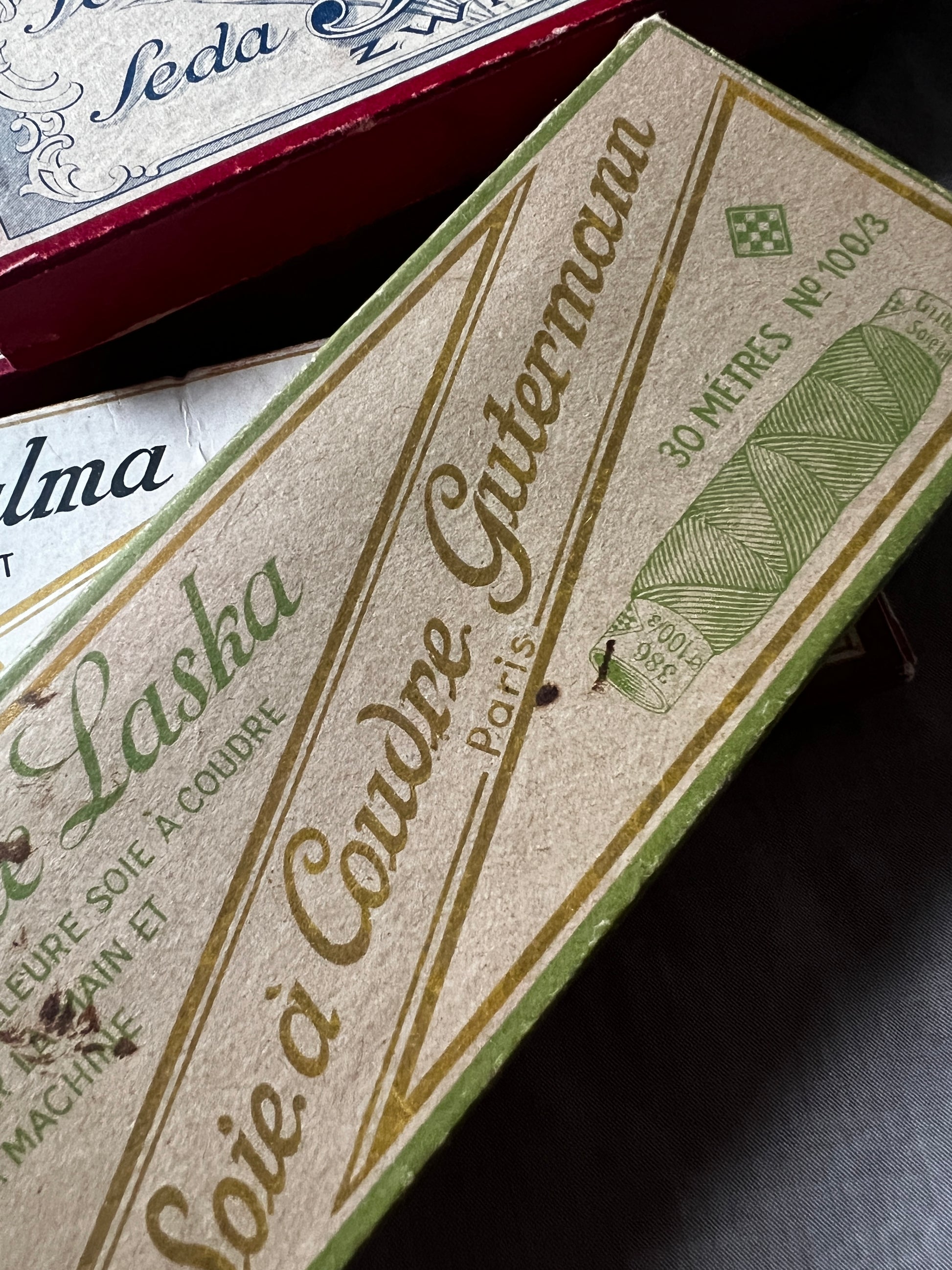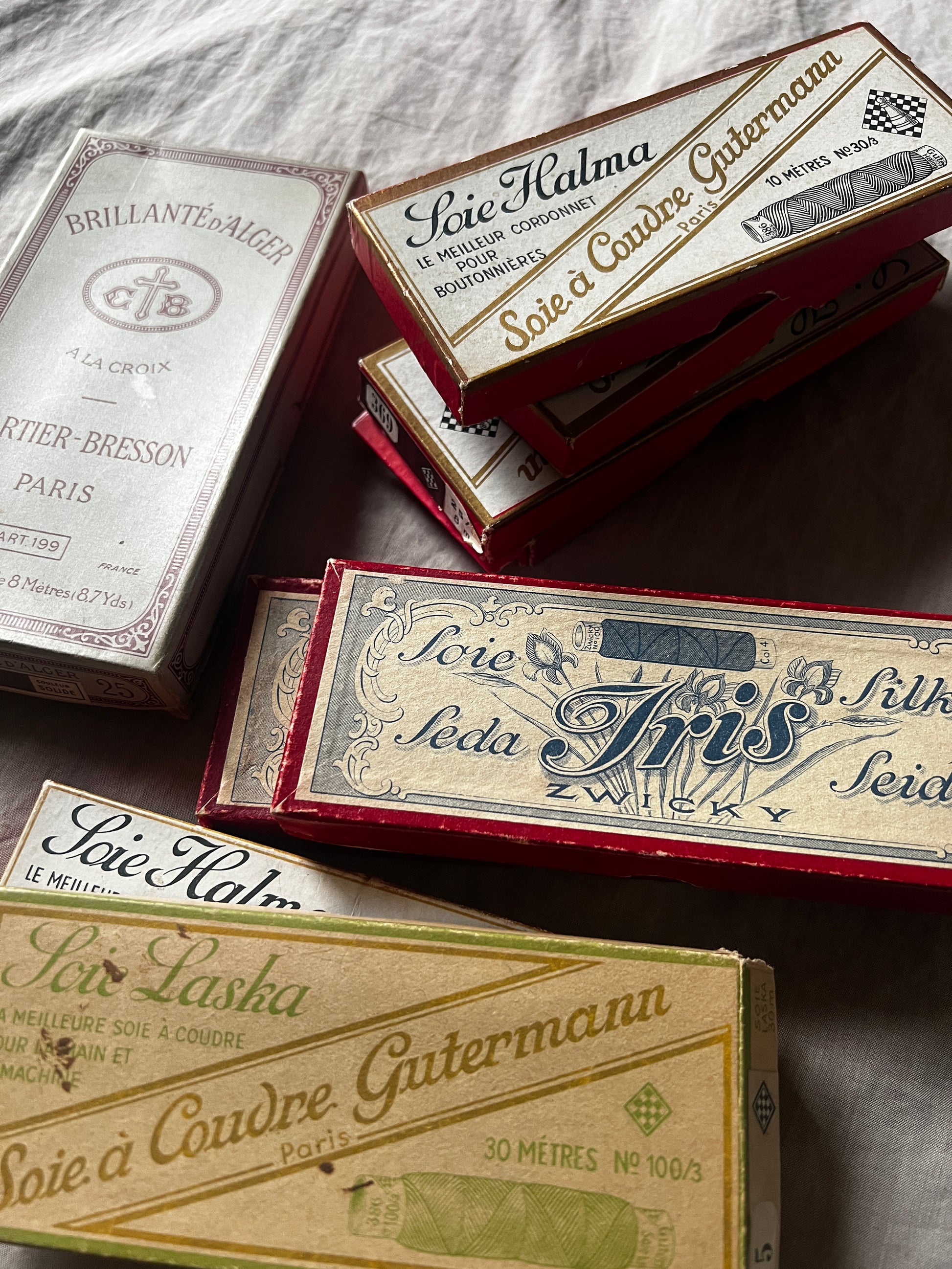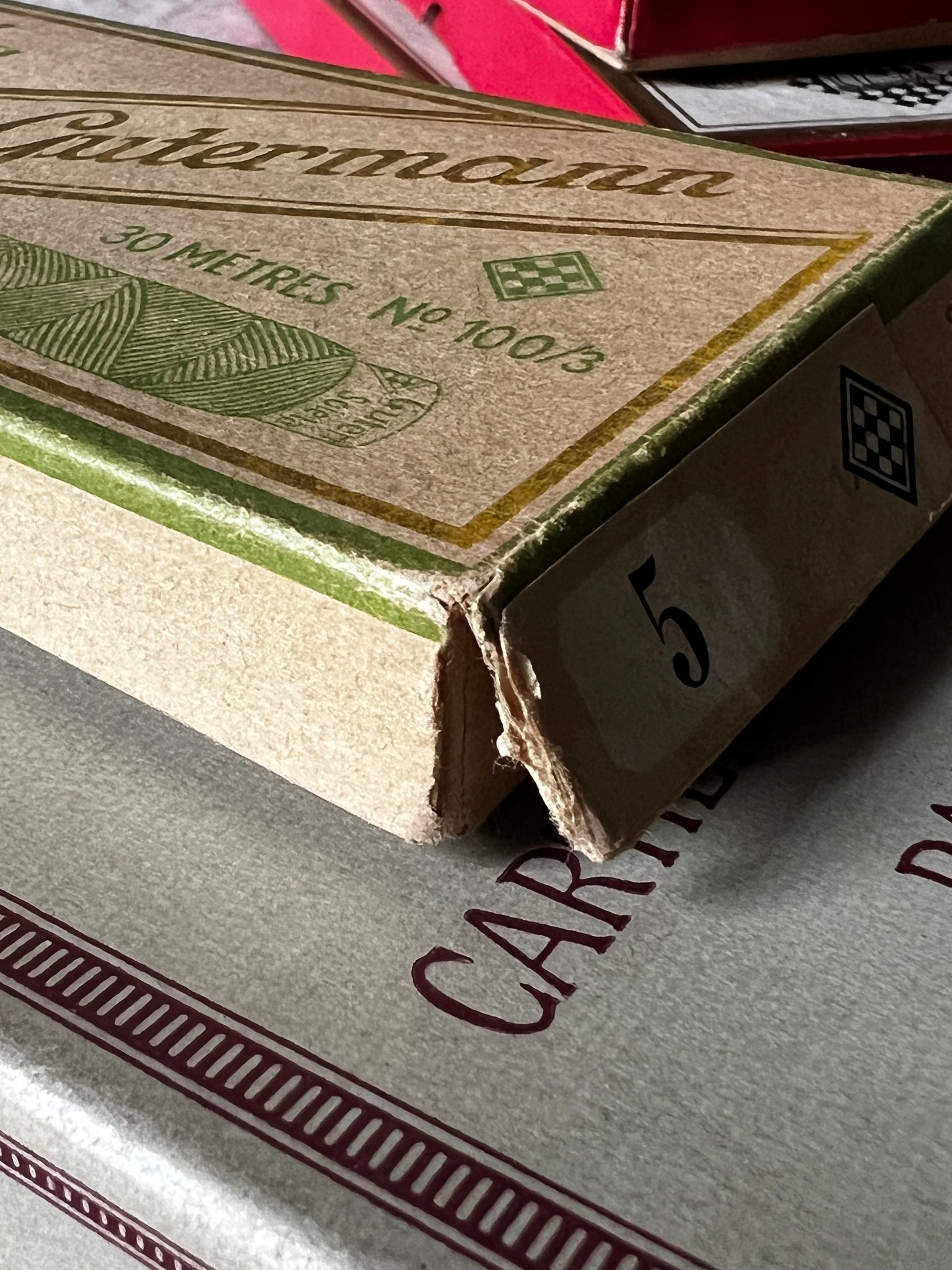 古く味わい深いロゴデザインの紙箱に収められた筒ボビンや刺繍糸かせセットです