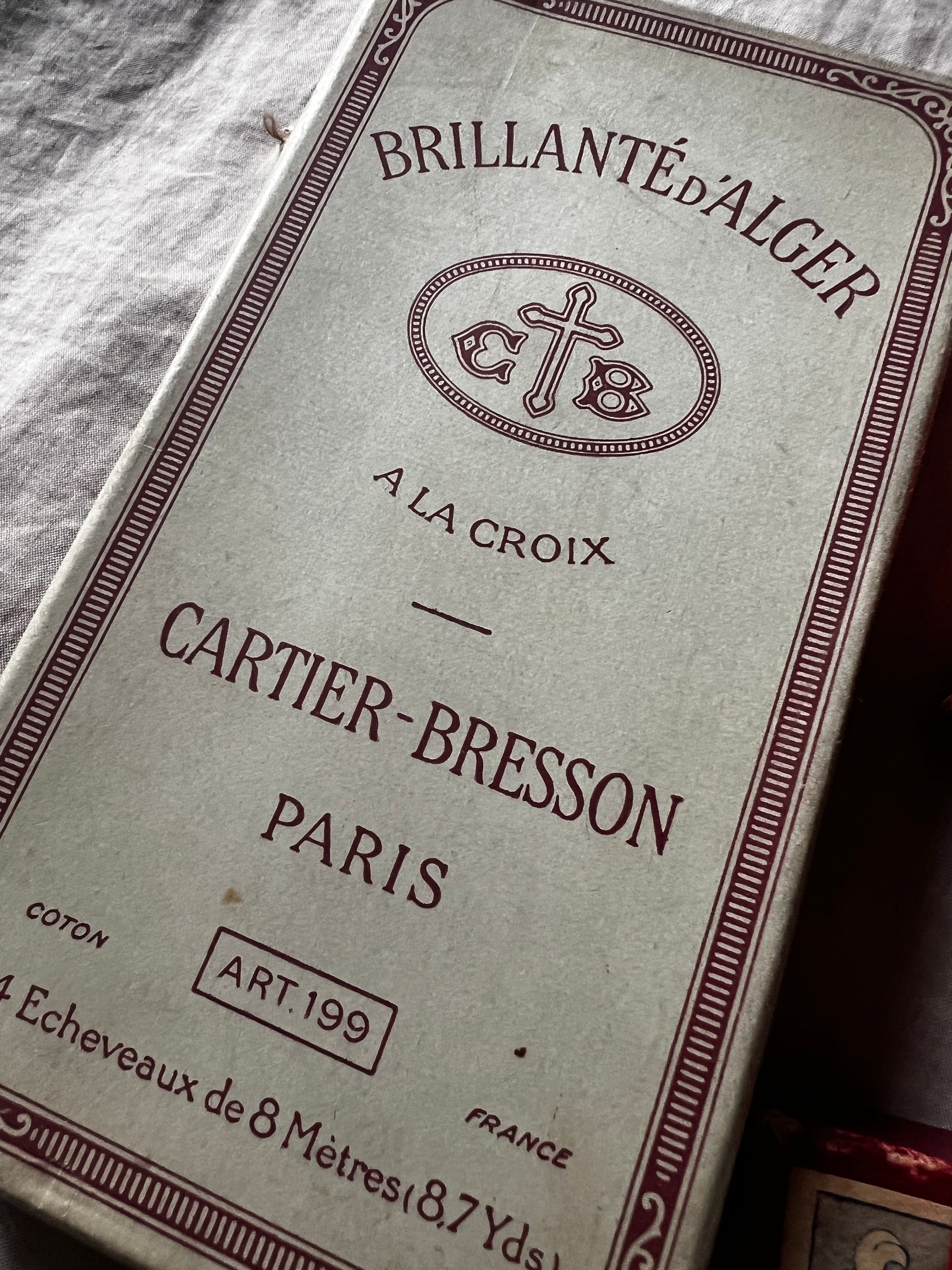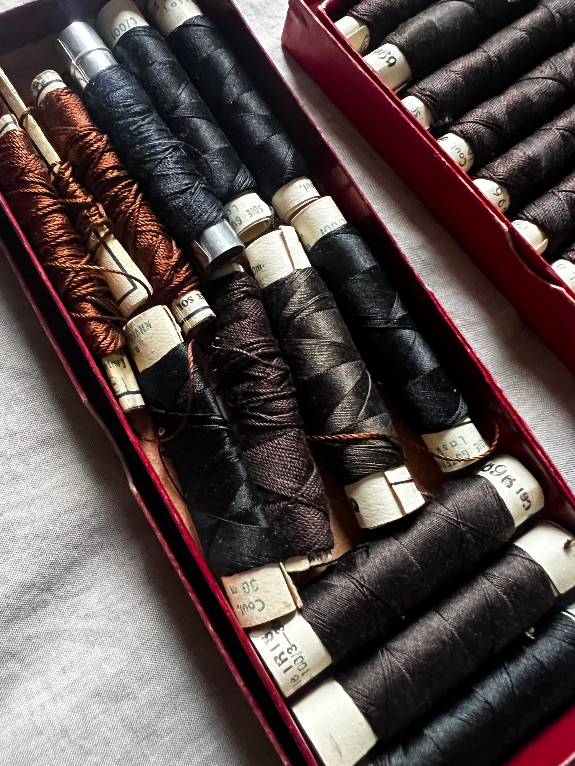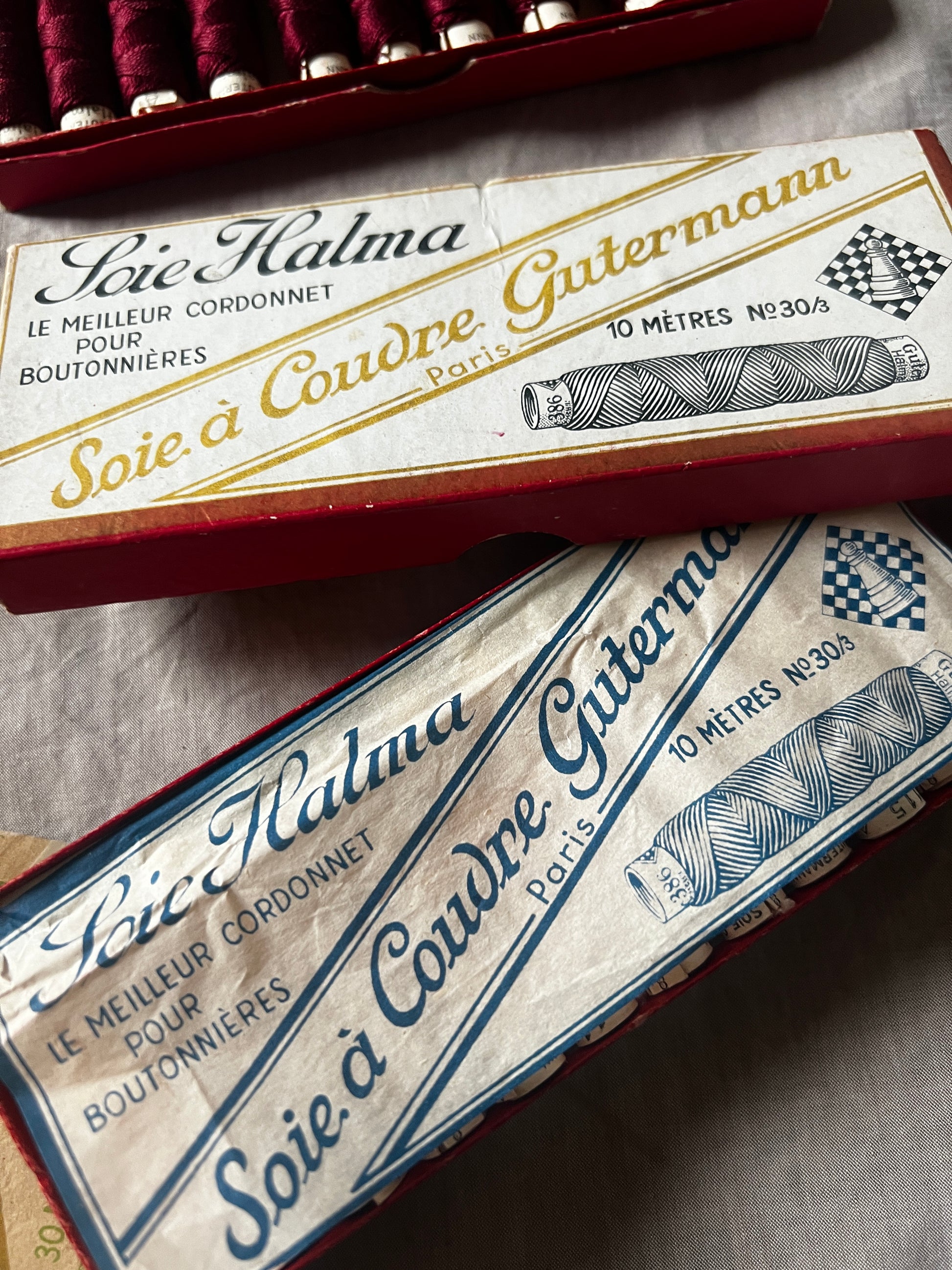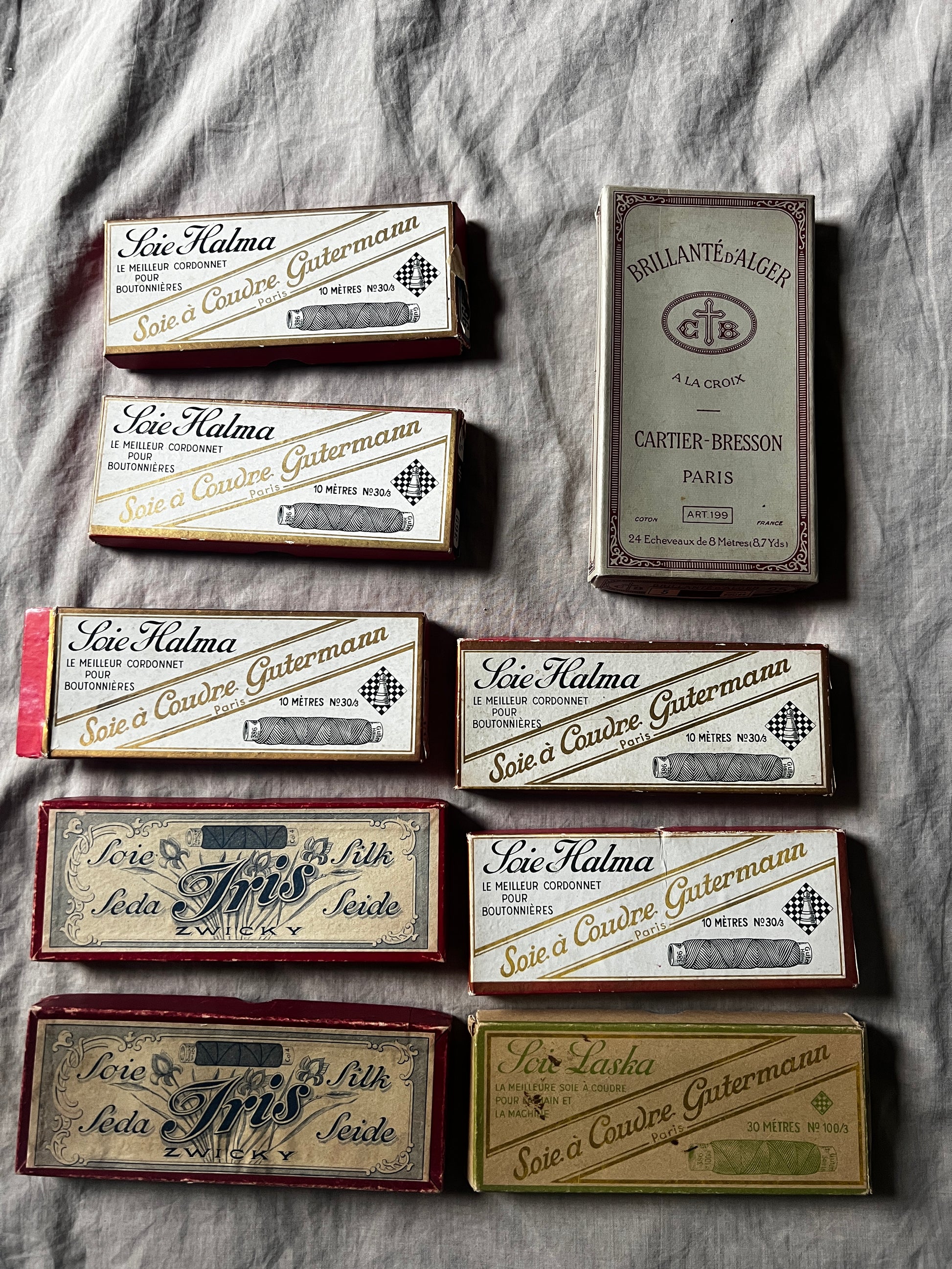 古く味わい深いロゴデザインの紙箱に収められた筒ボビンや刺繍糸かせセットです