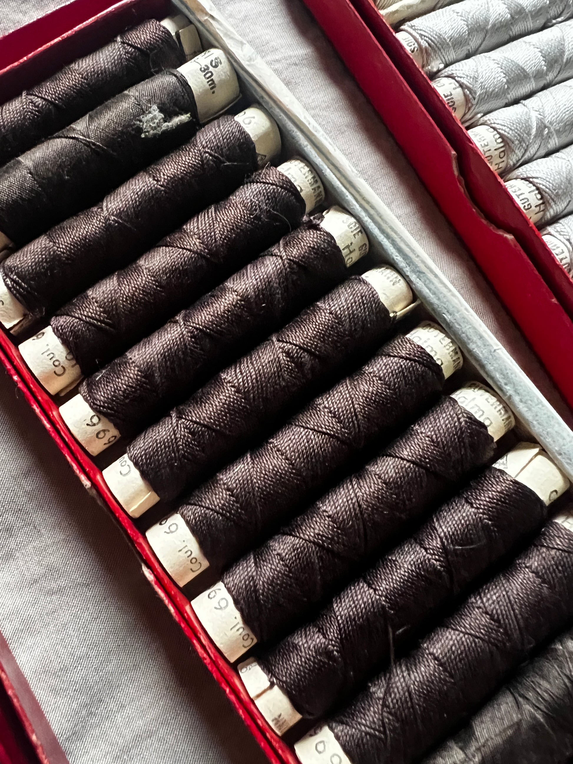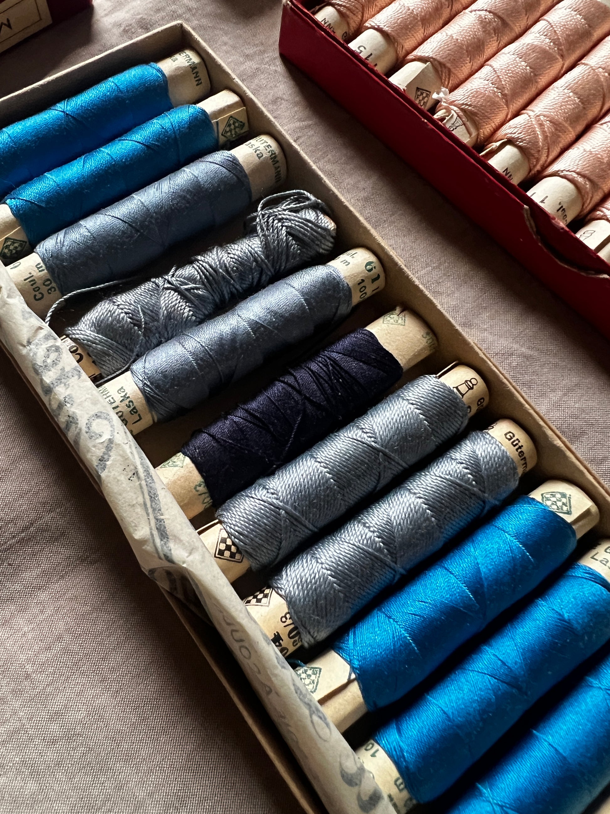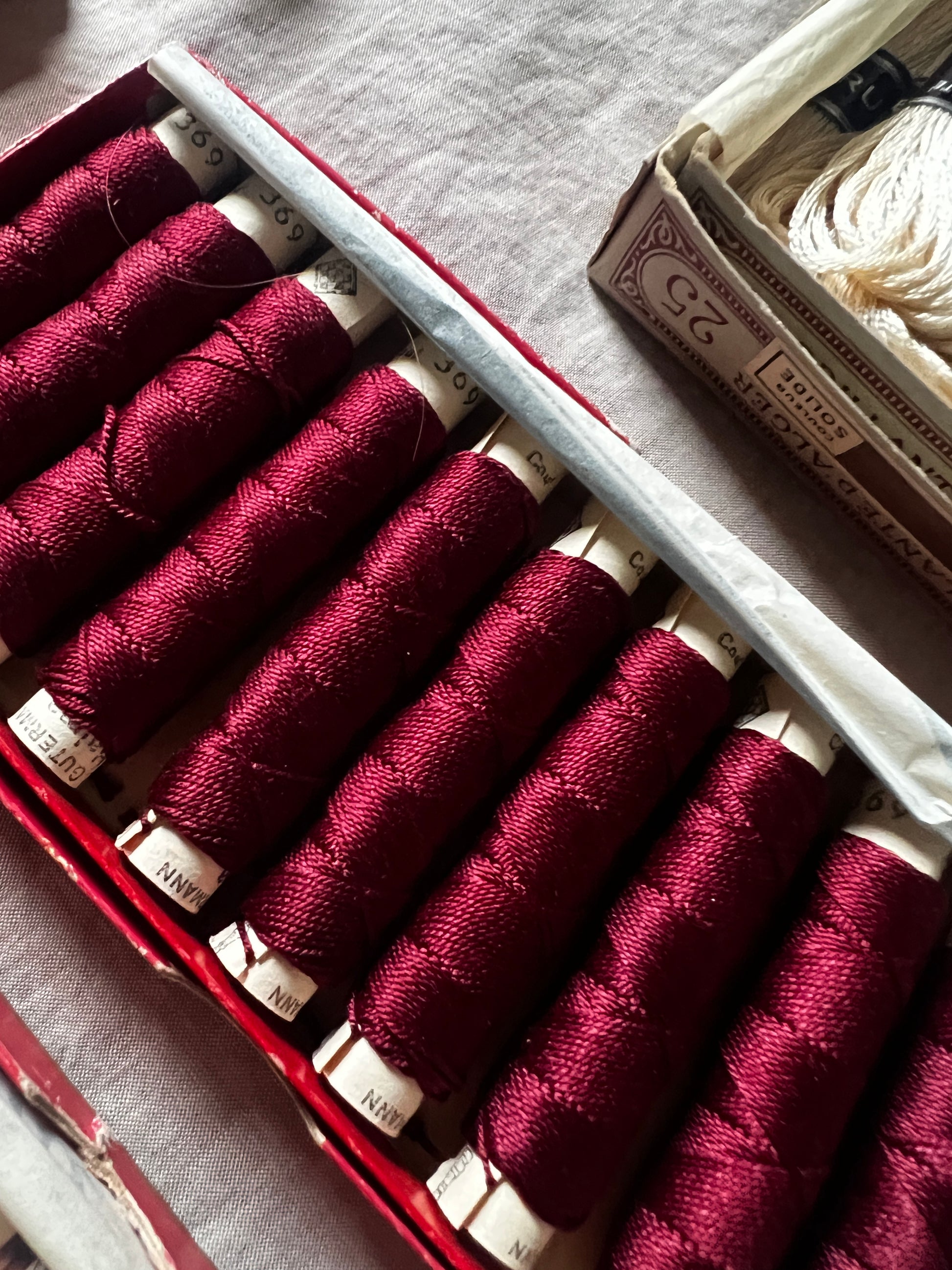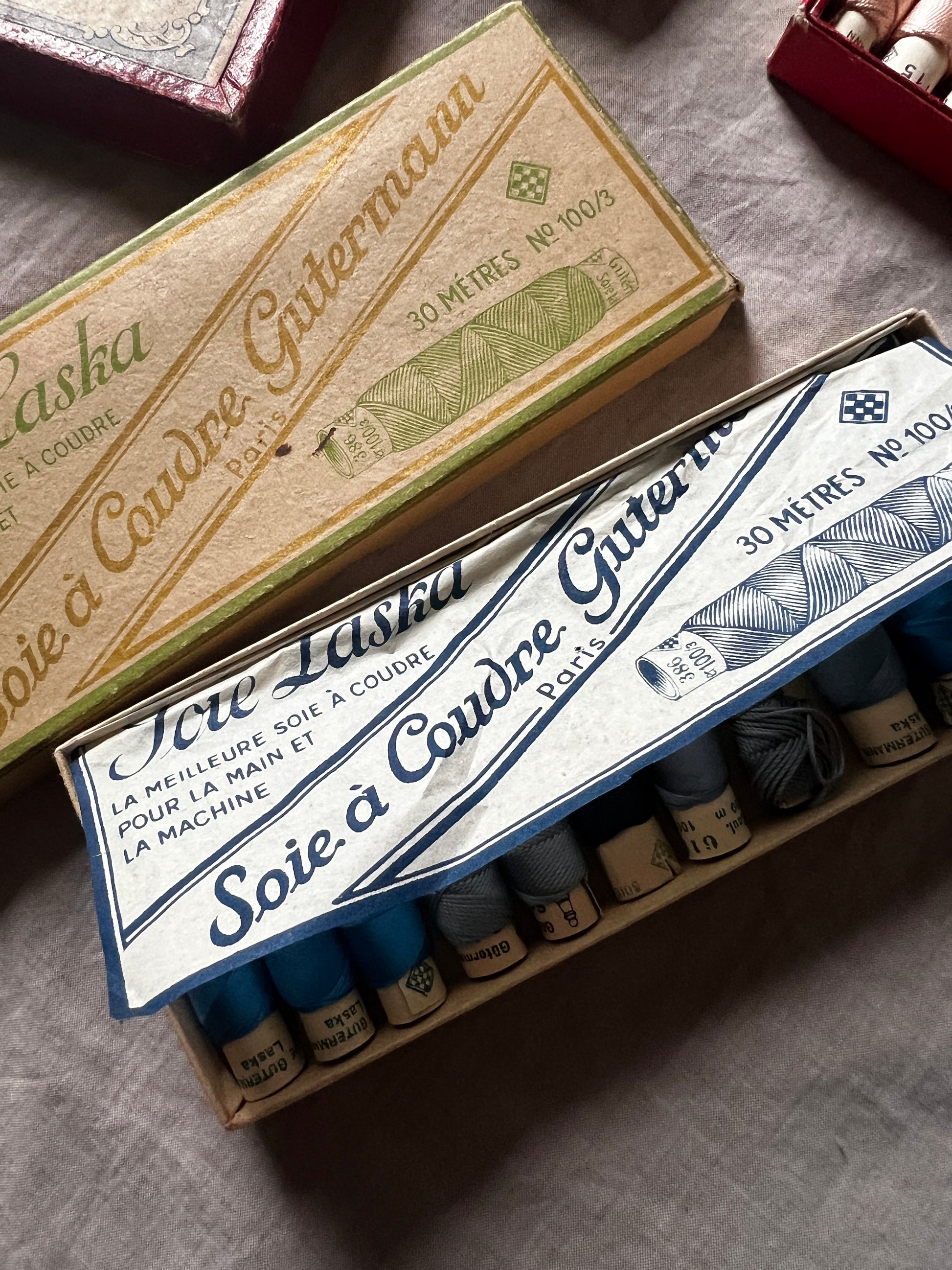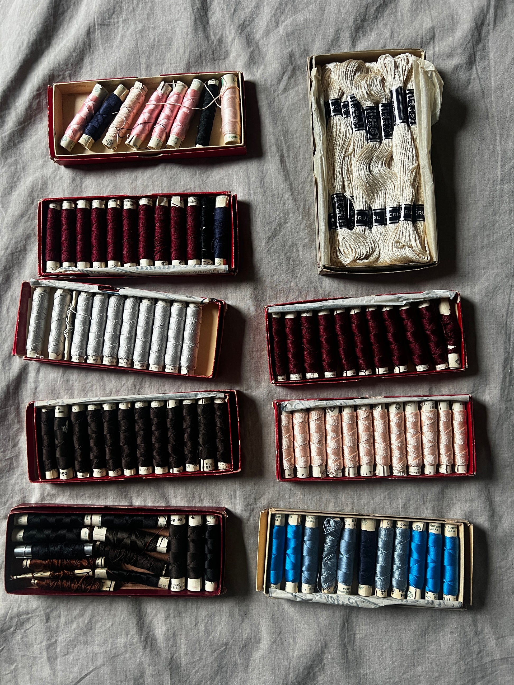 古く味わい深いロゴデザインの紙箱に収められた筒ボビンや刺繍糸かせセットです