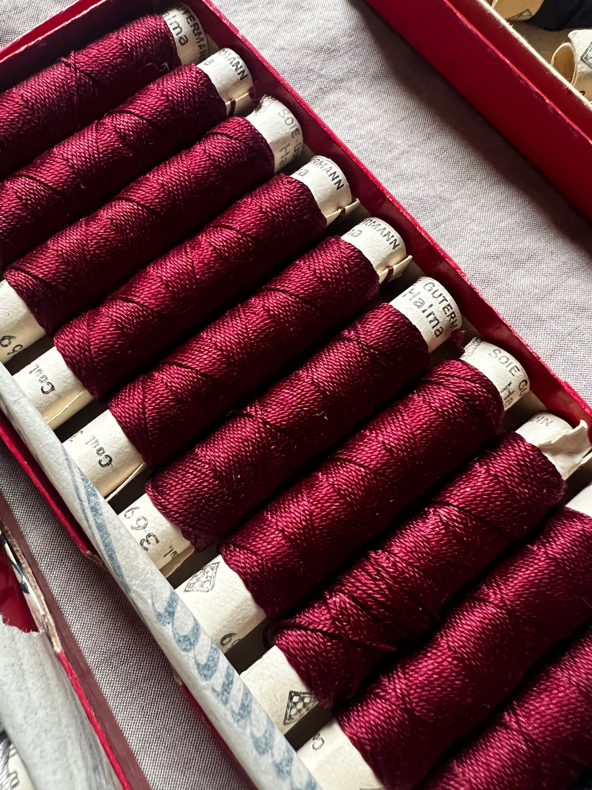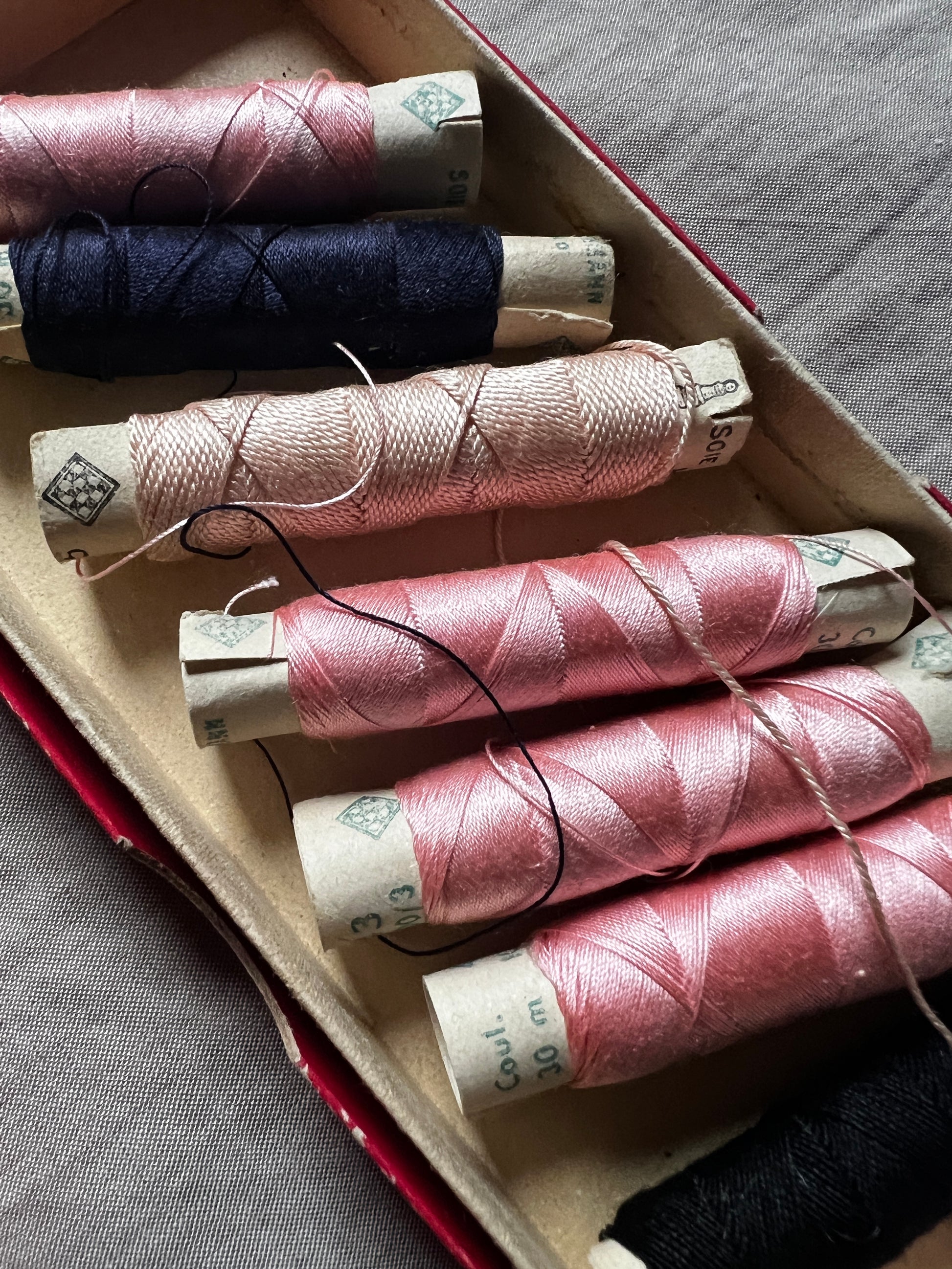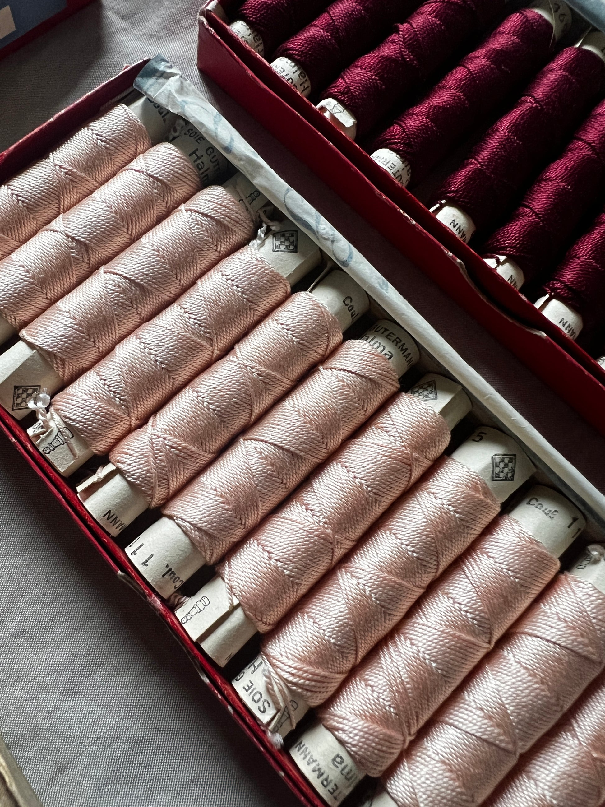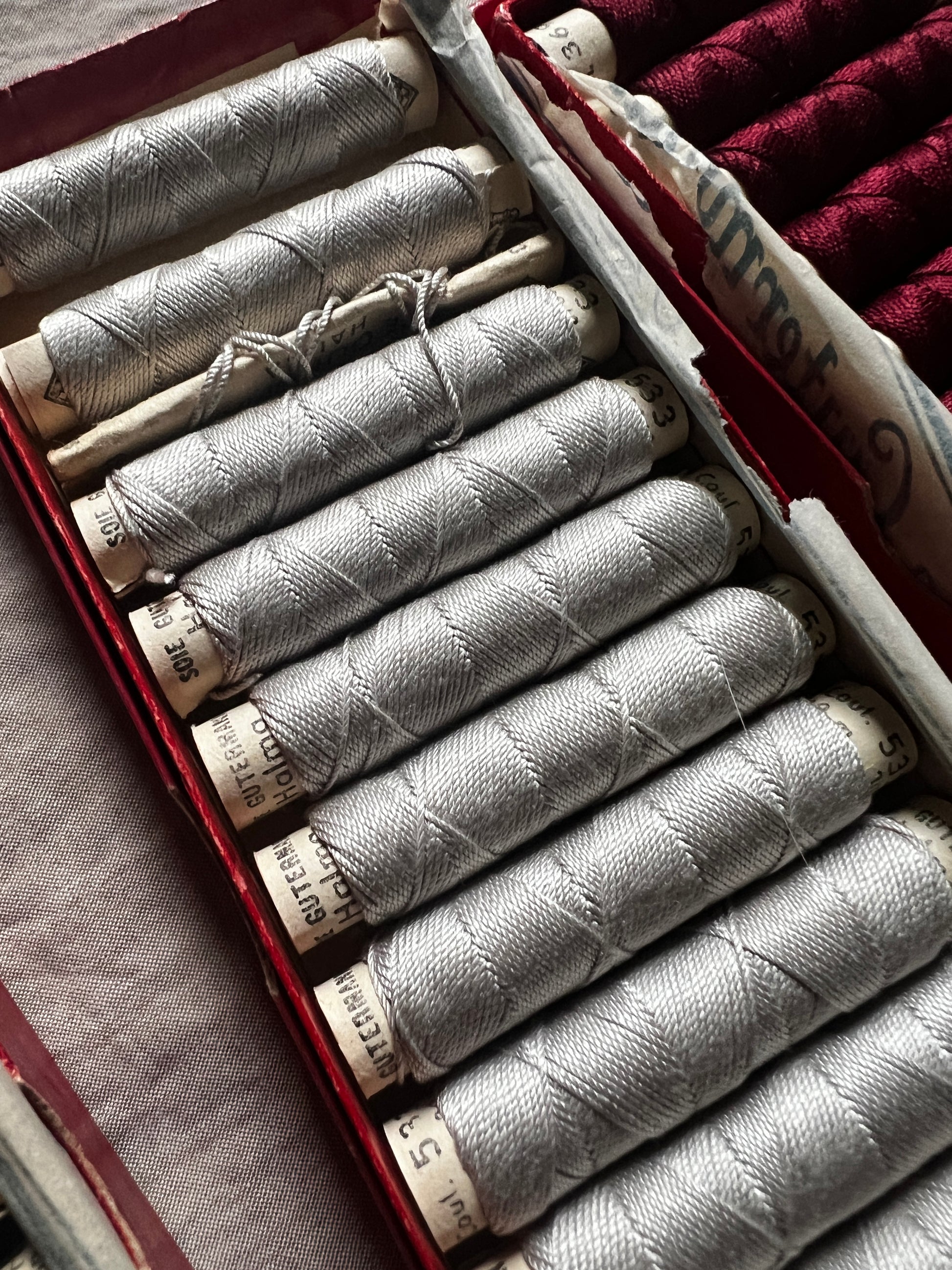 古く味わい深いロゴデザインの紙箱に収められた筒ボビンや刺繍糸かせセットです