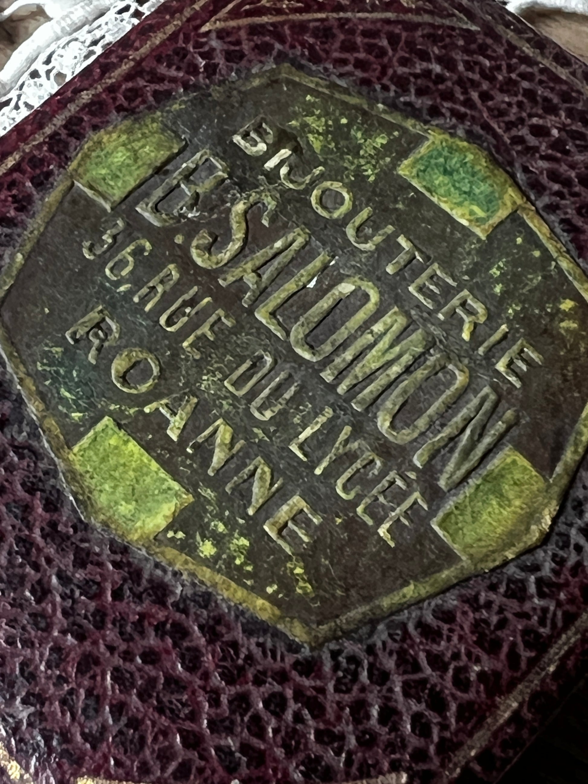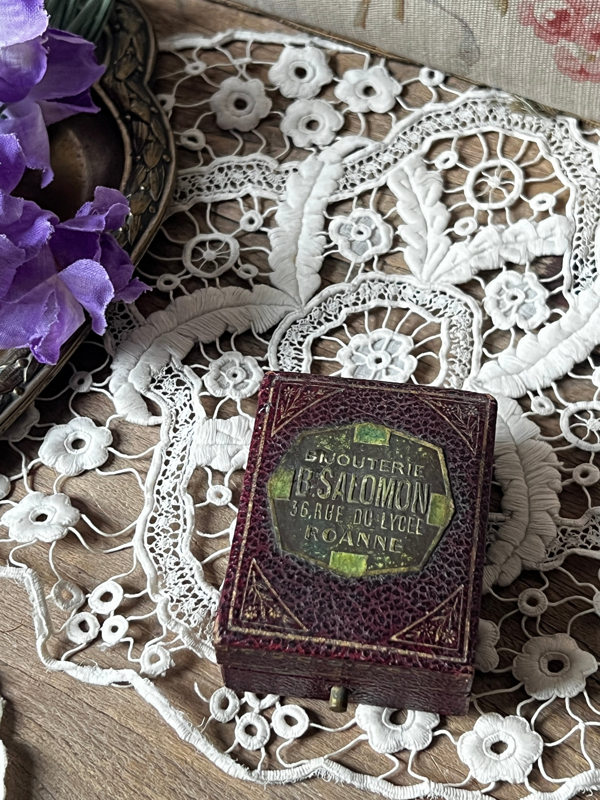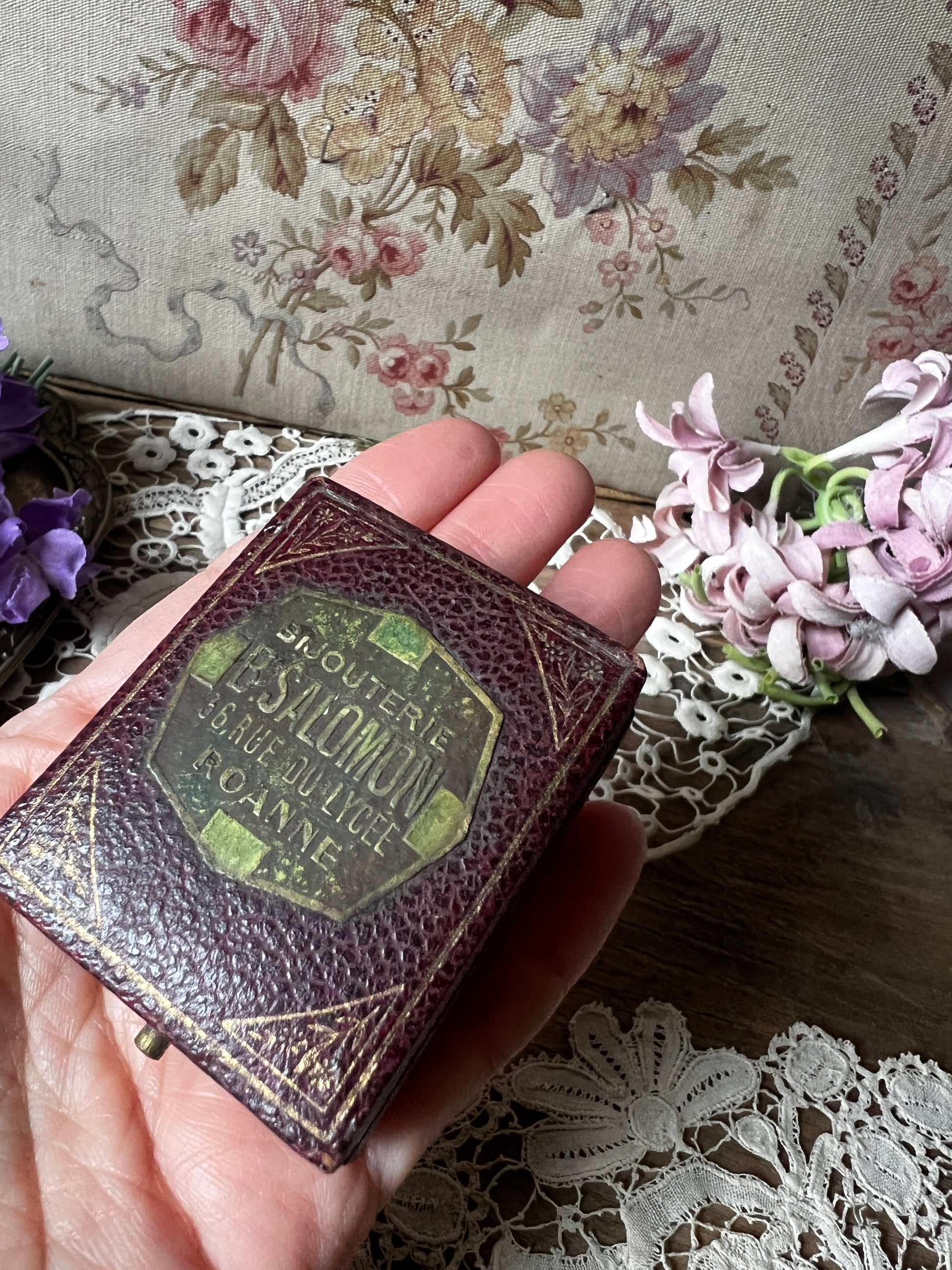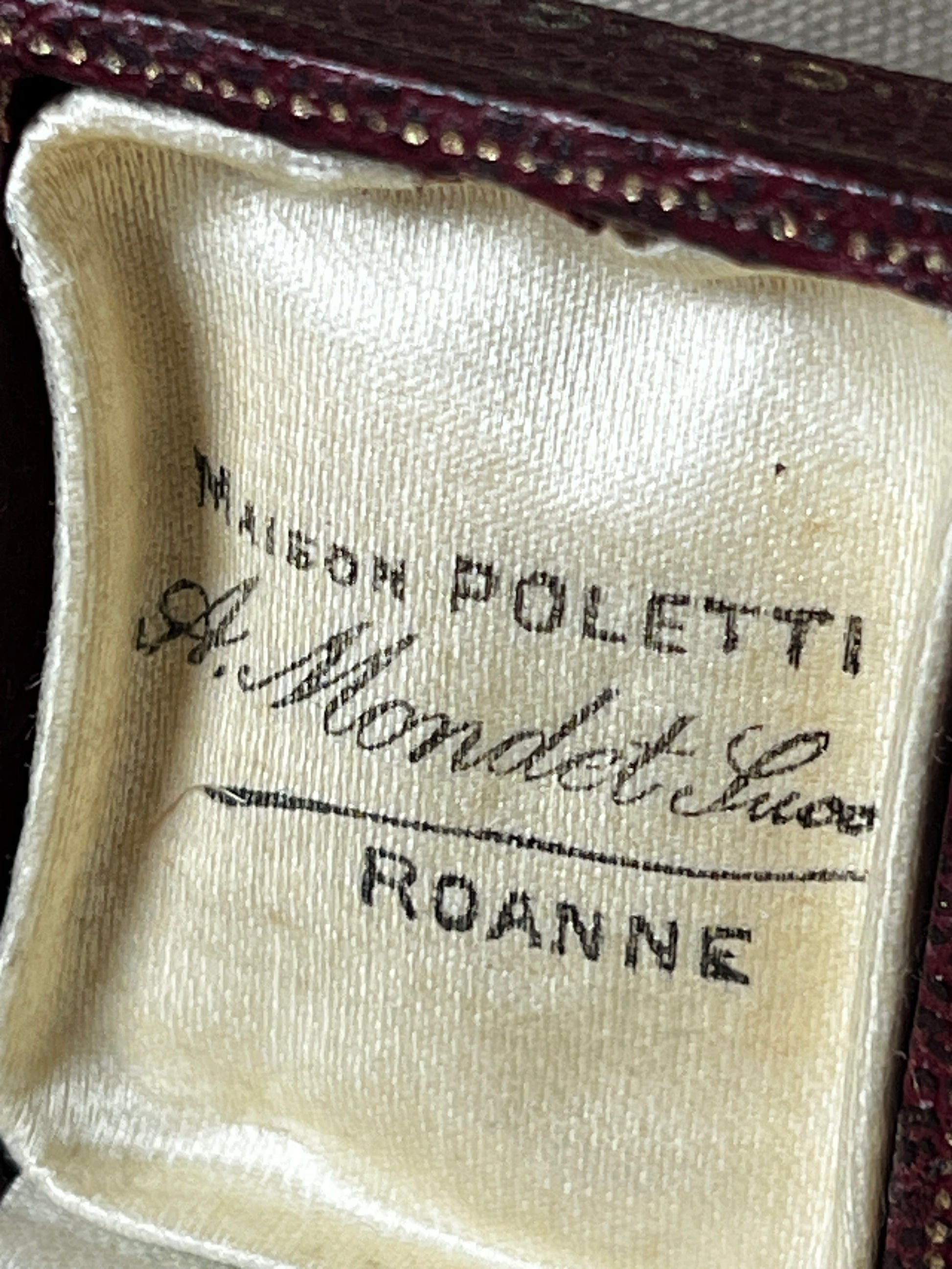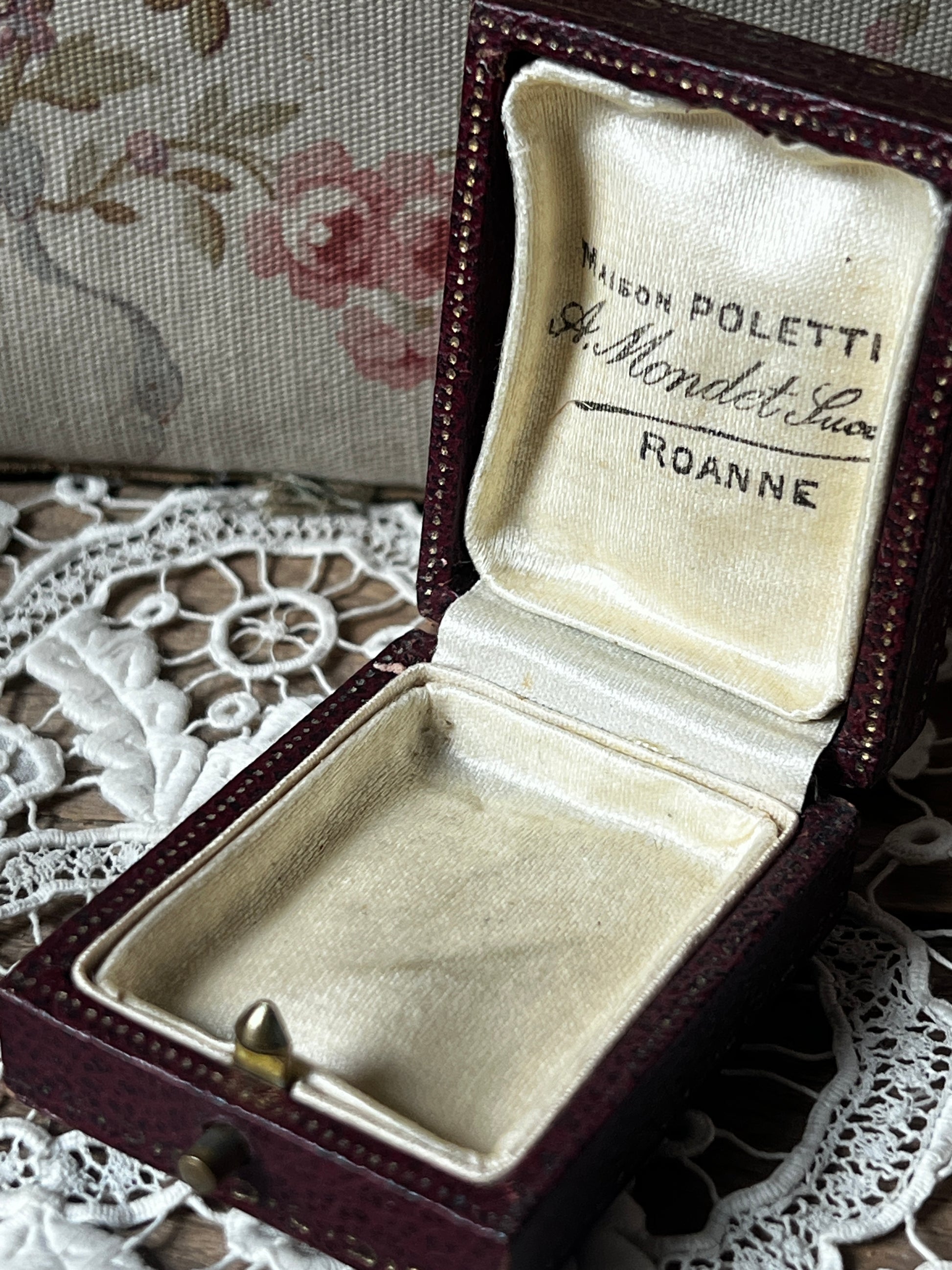 内部は上品なサテン張りで、蓋裏にもアトリエ名が記されており、細部まで丁寧に仕上げられています