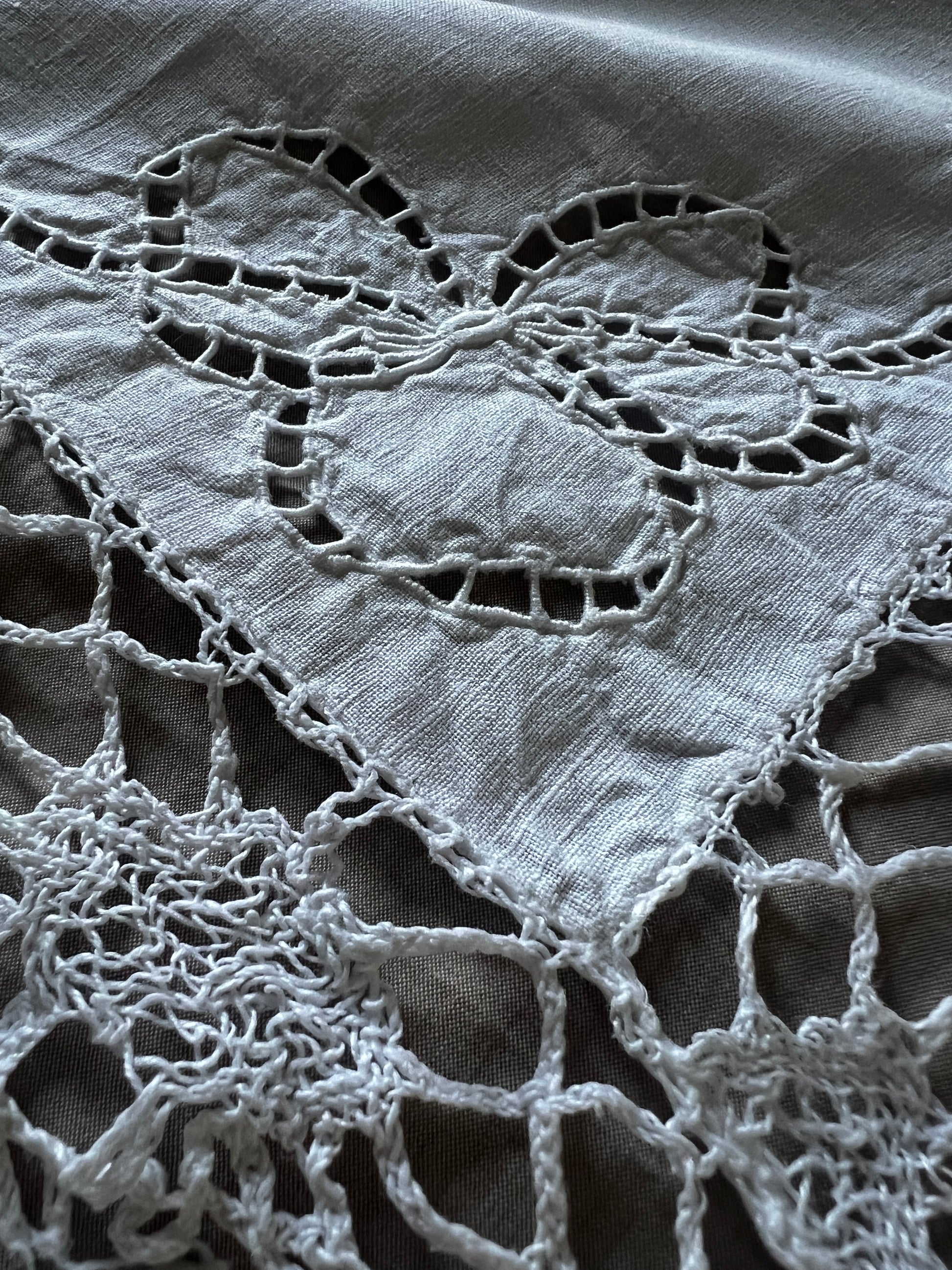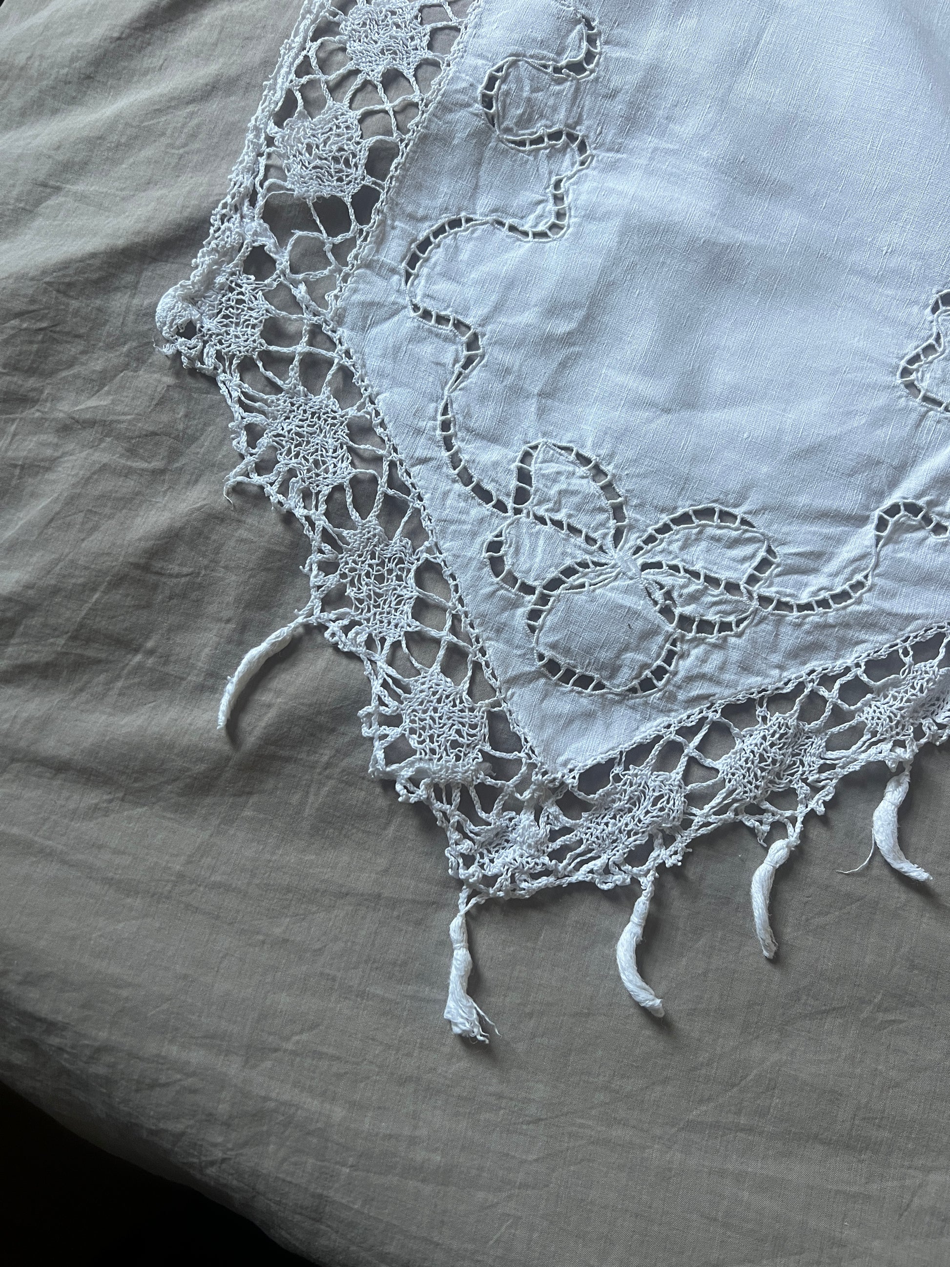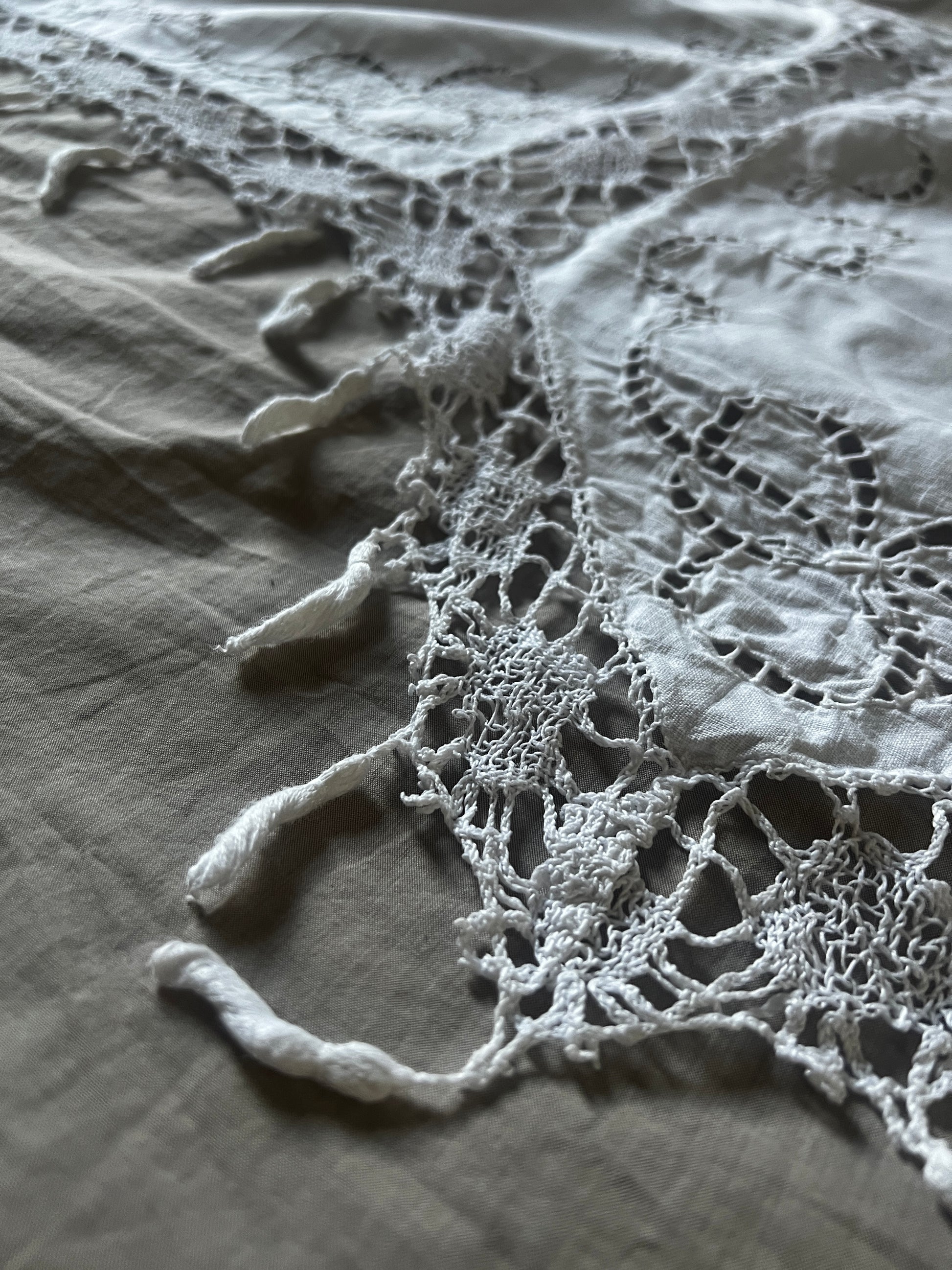 カットワーク刺繍とボビンレースが組み合わさった棚板飾り布です