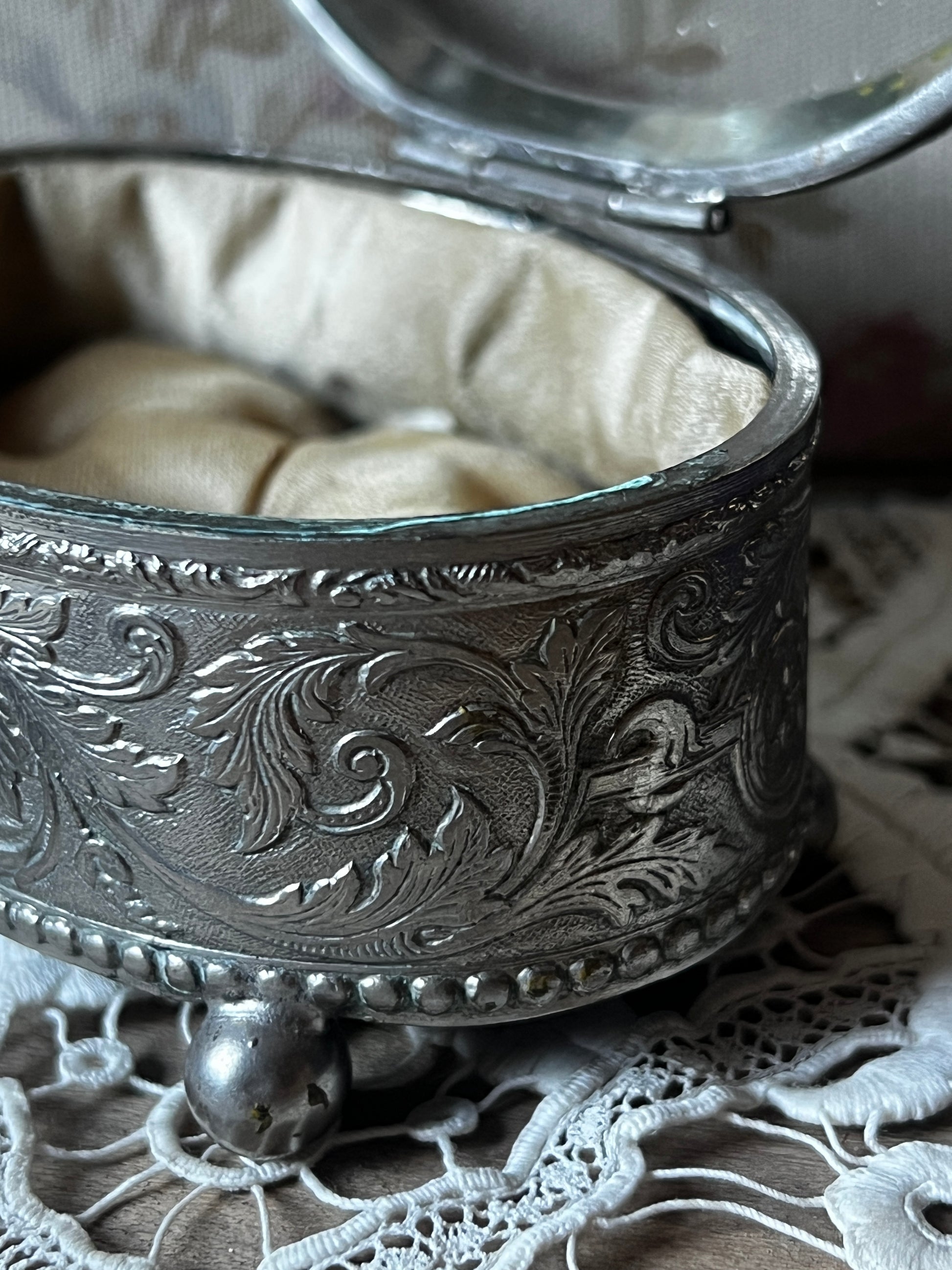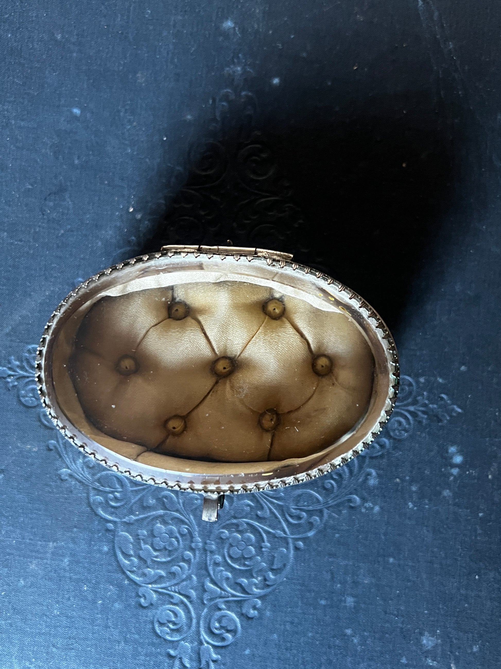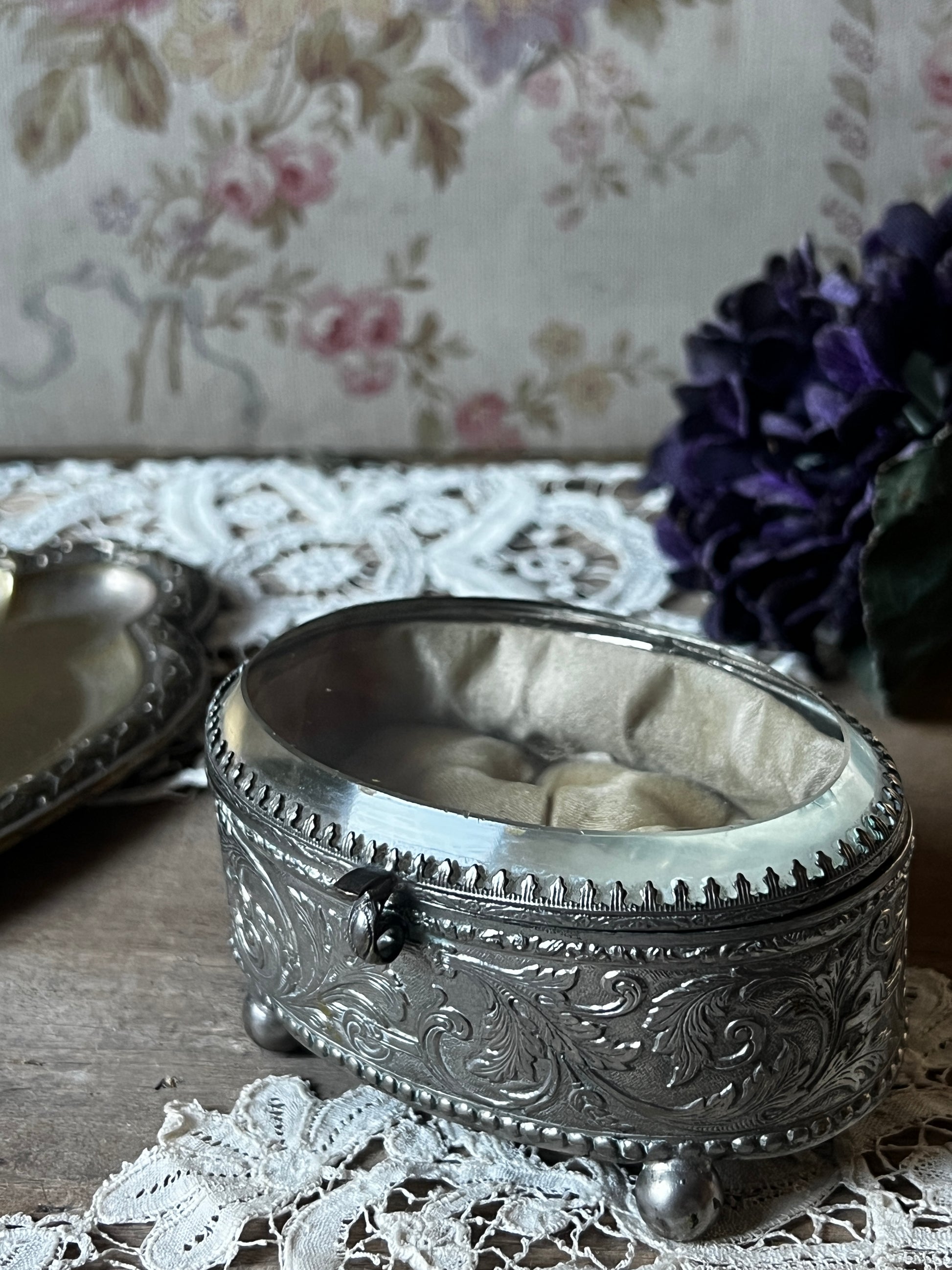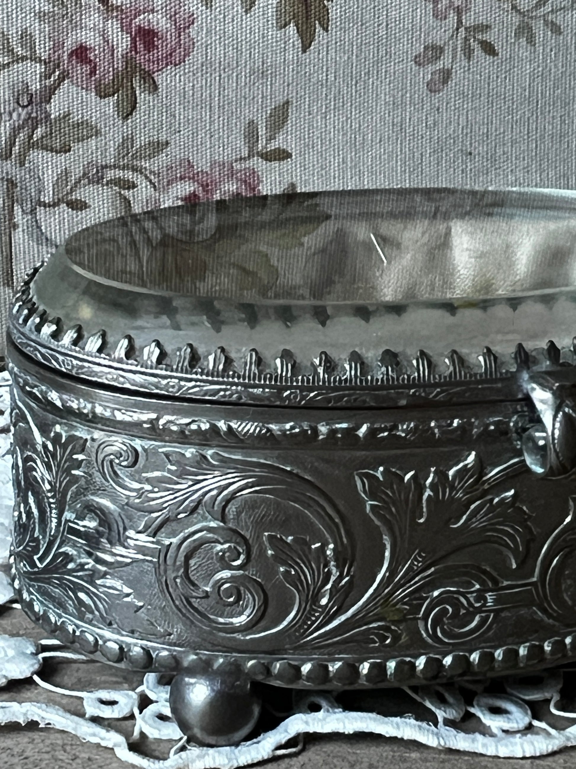 上部蓋に厚みのあるガラスを用いたクラシックな雰囲気漂うメタル製のジュエリーボックスです