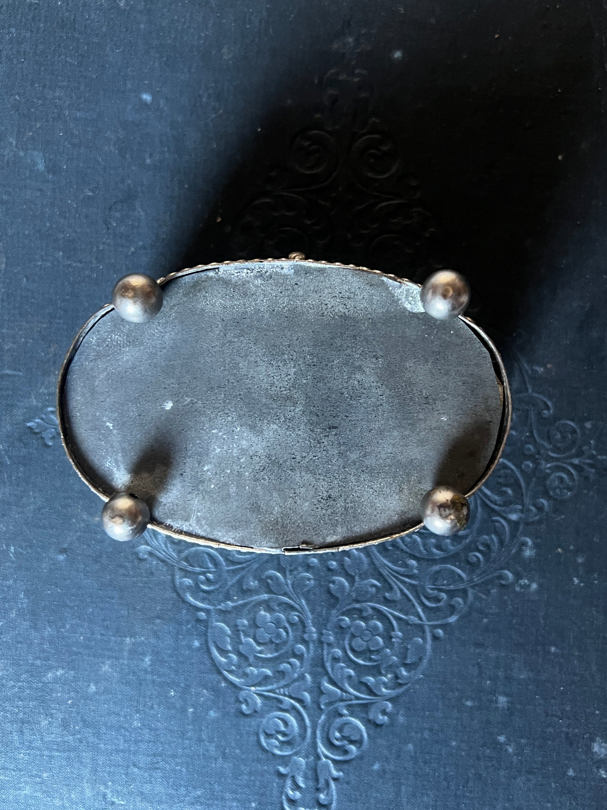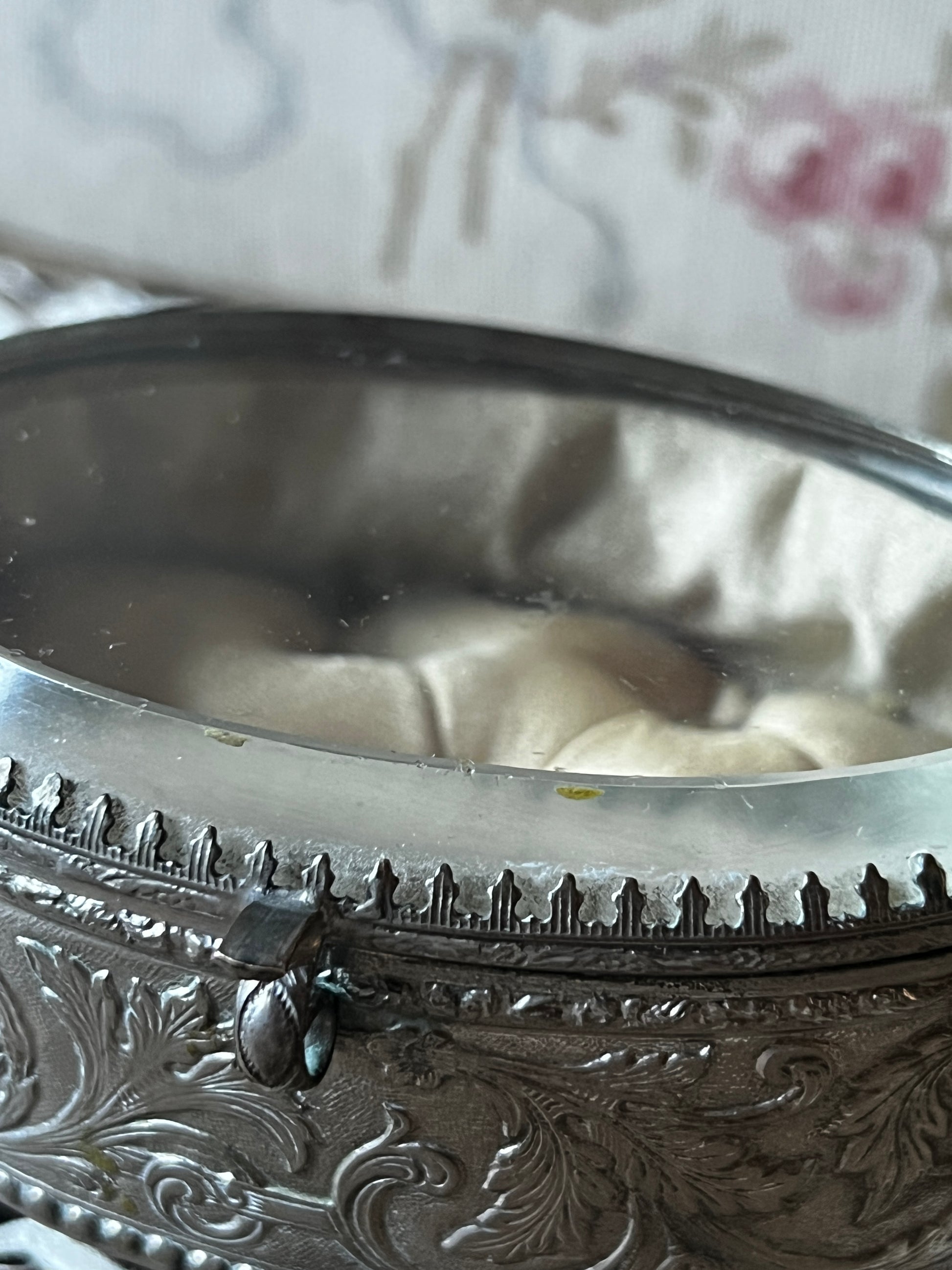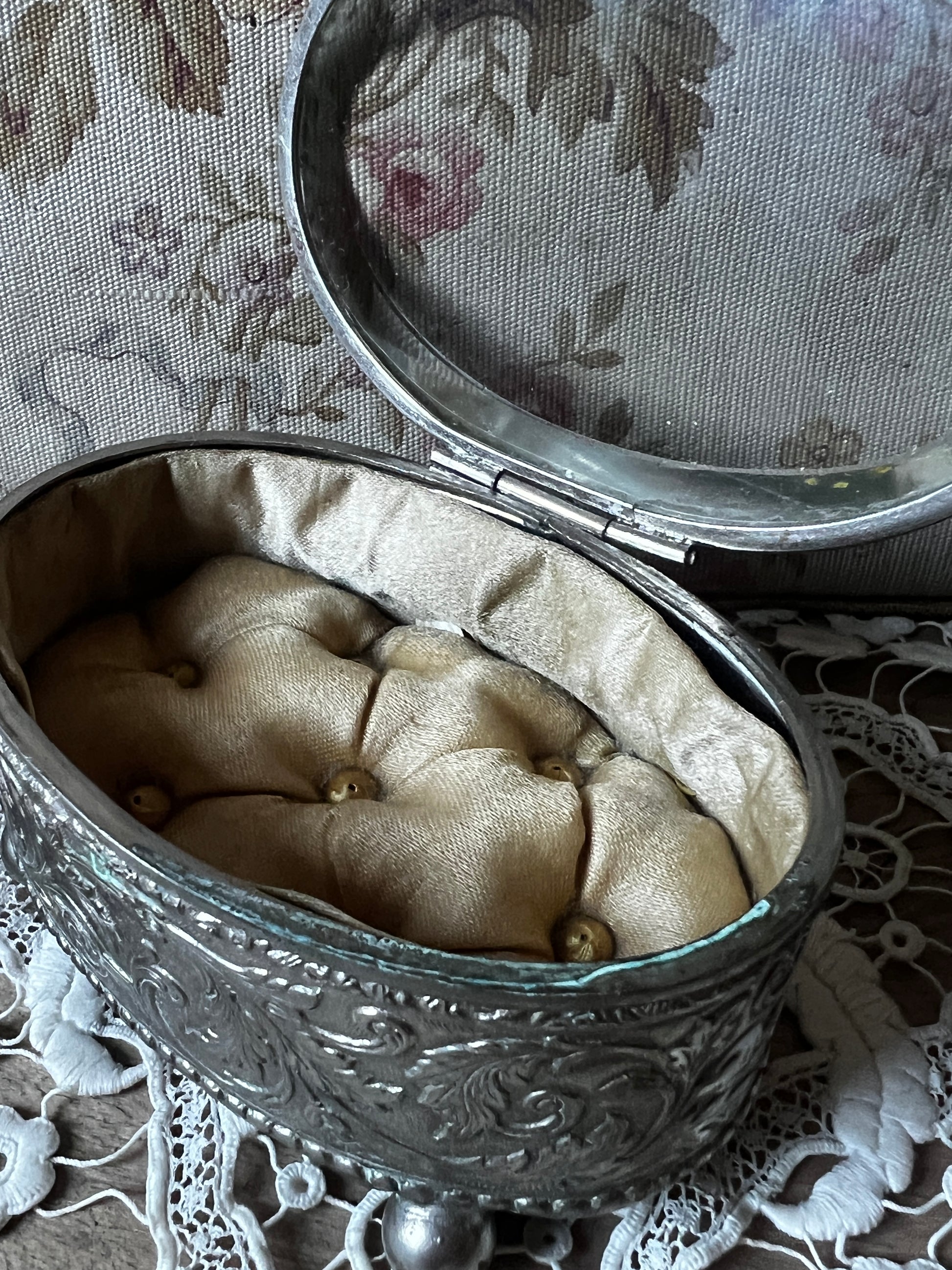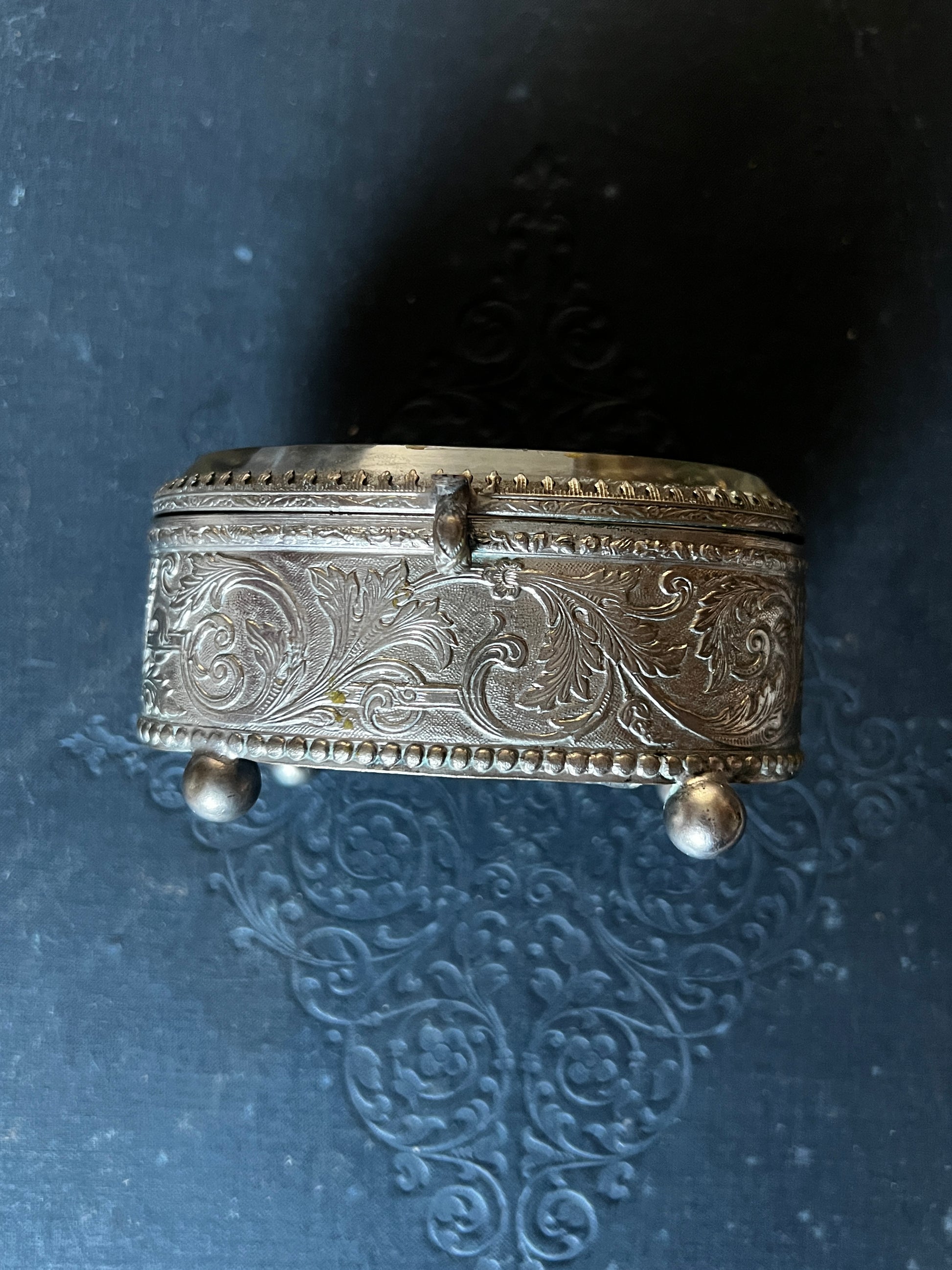 上部蓋に厚みのあるガラスを用いたクラシックな雰囲気漂うメタル製のジュエリーボックスです