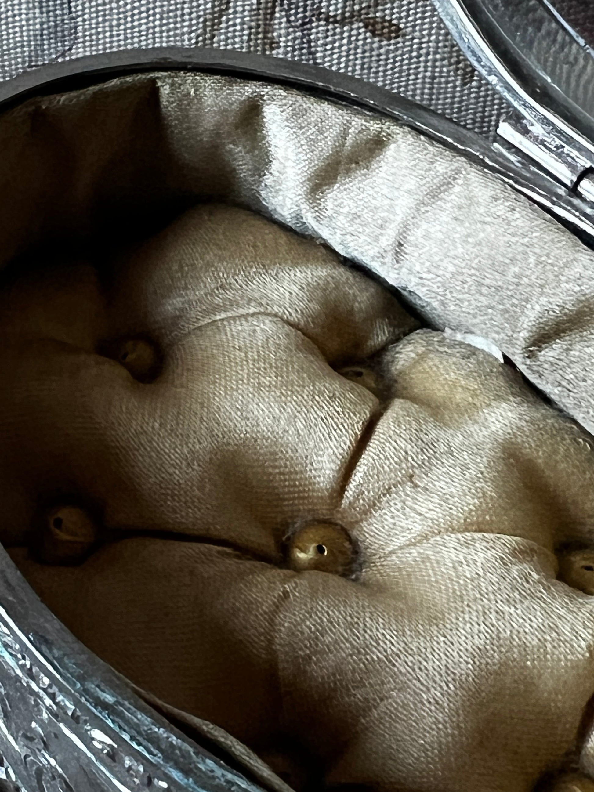 ガラス越しに見える内部には優しい光沢を持つサテン布がクッション状にあしらわれており、大切なアクセサリーをやさしく包み込みます