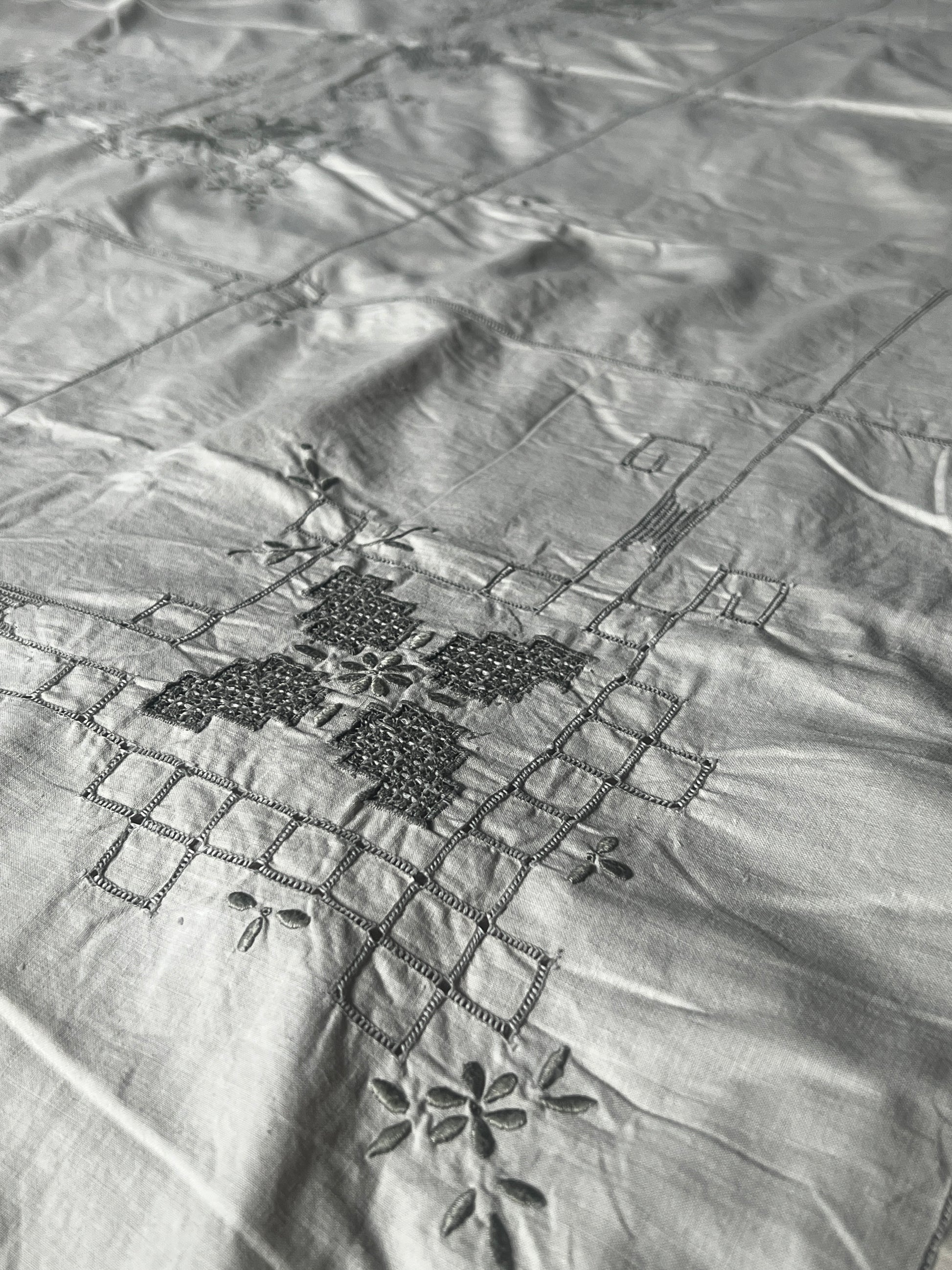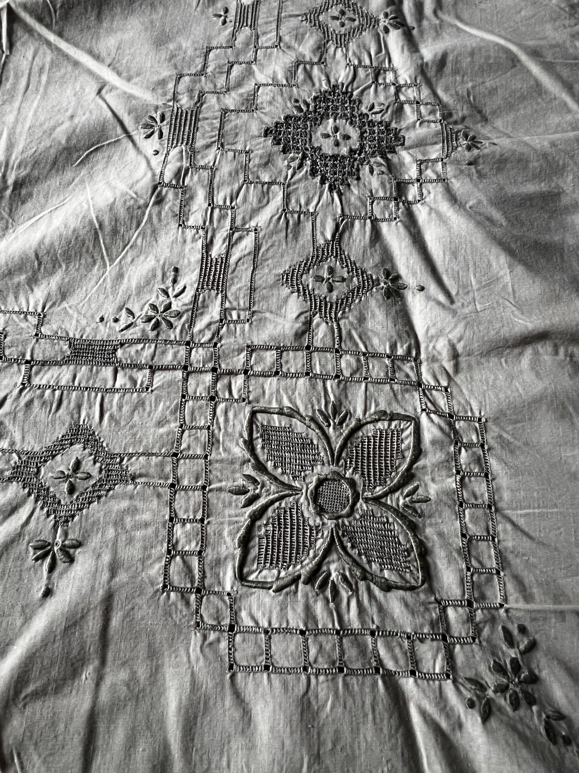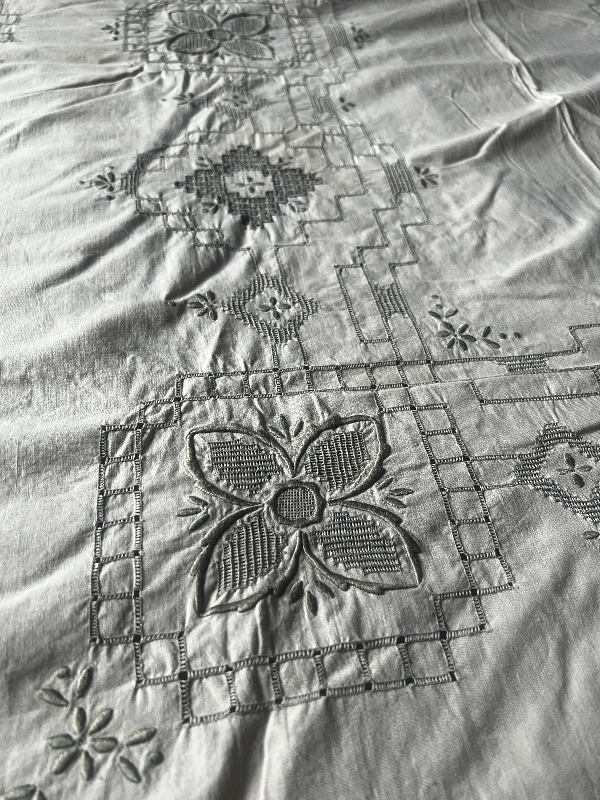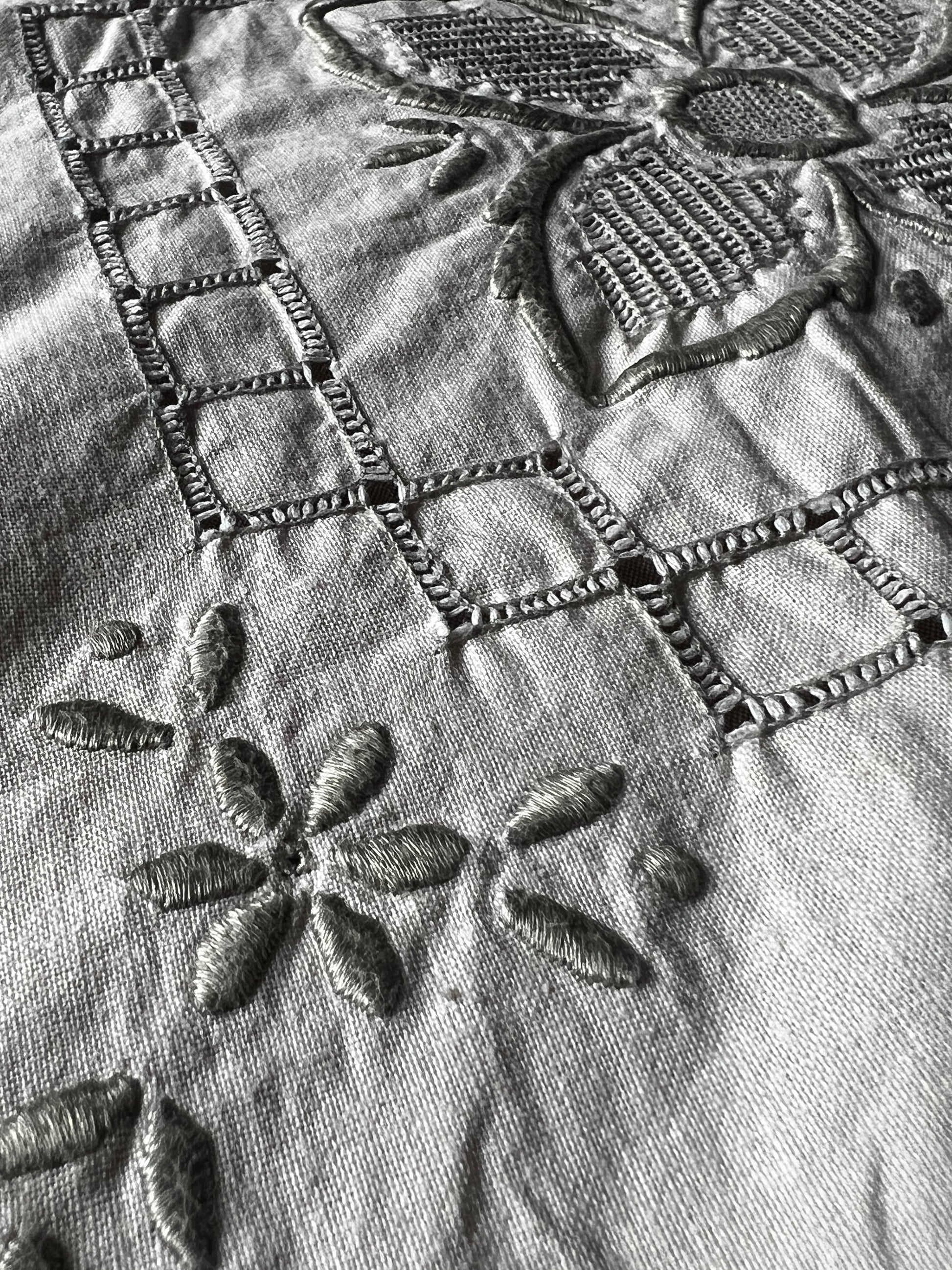 アイボリーカラーのコットン地にグレイベージュの糸で丁寧に刺繍が施された、マデイラ刺繍の大判クロスです