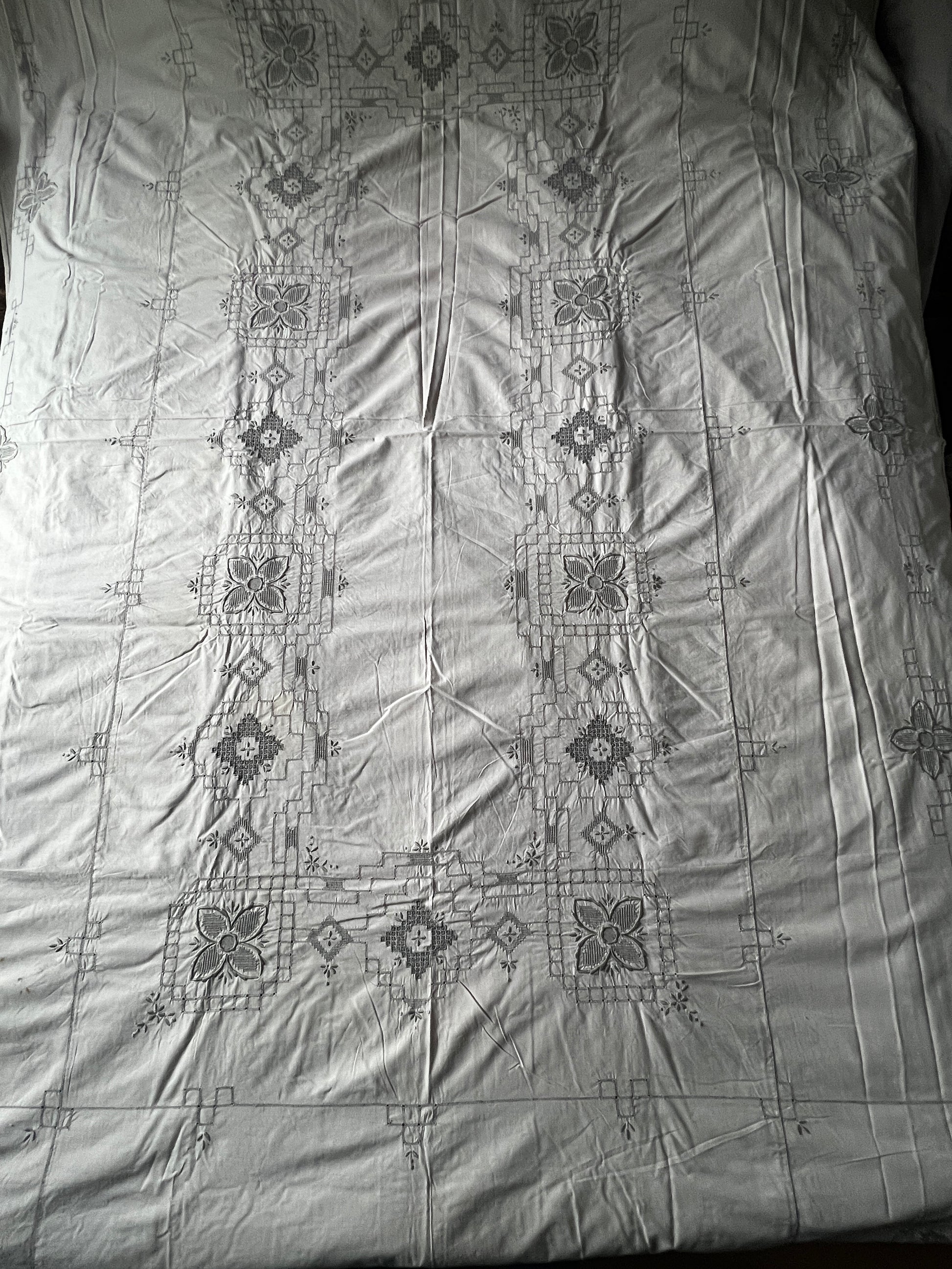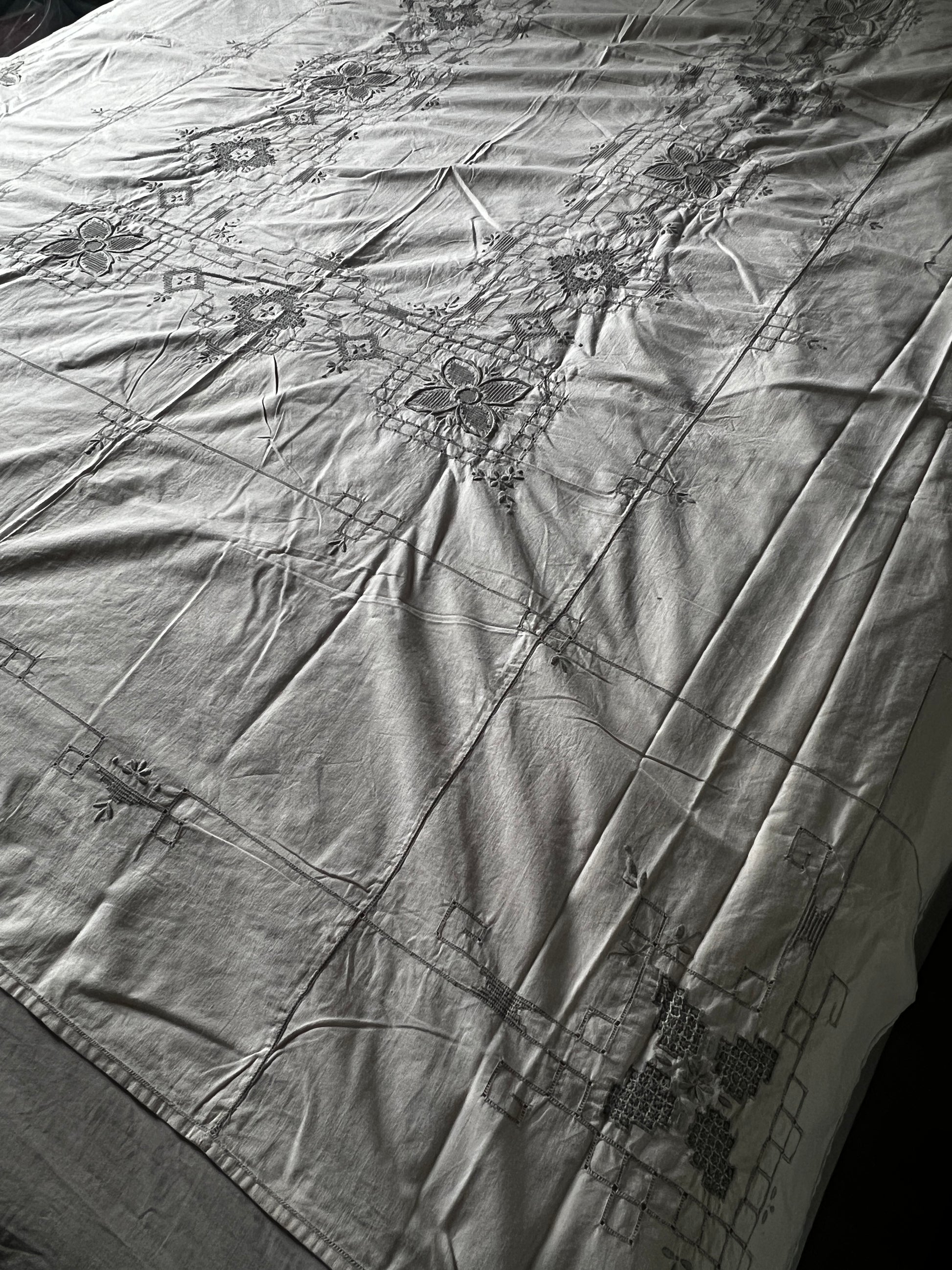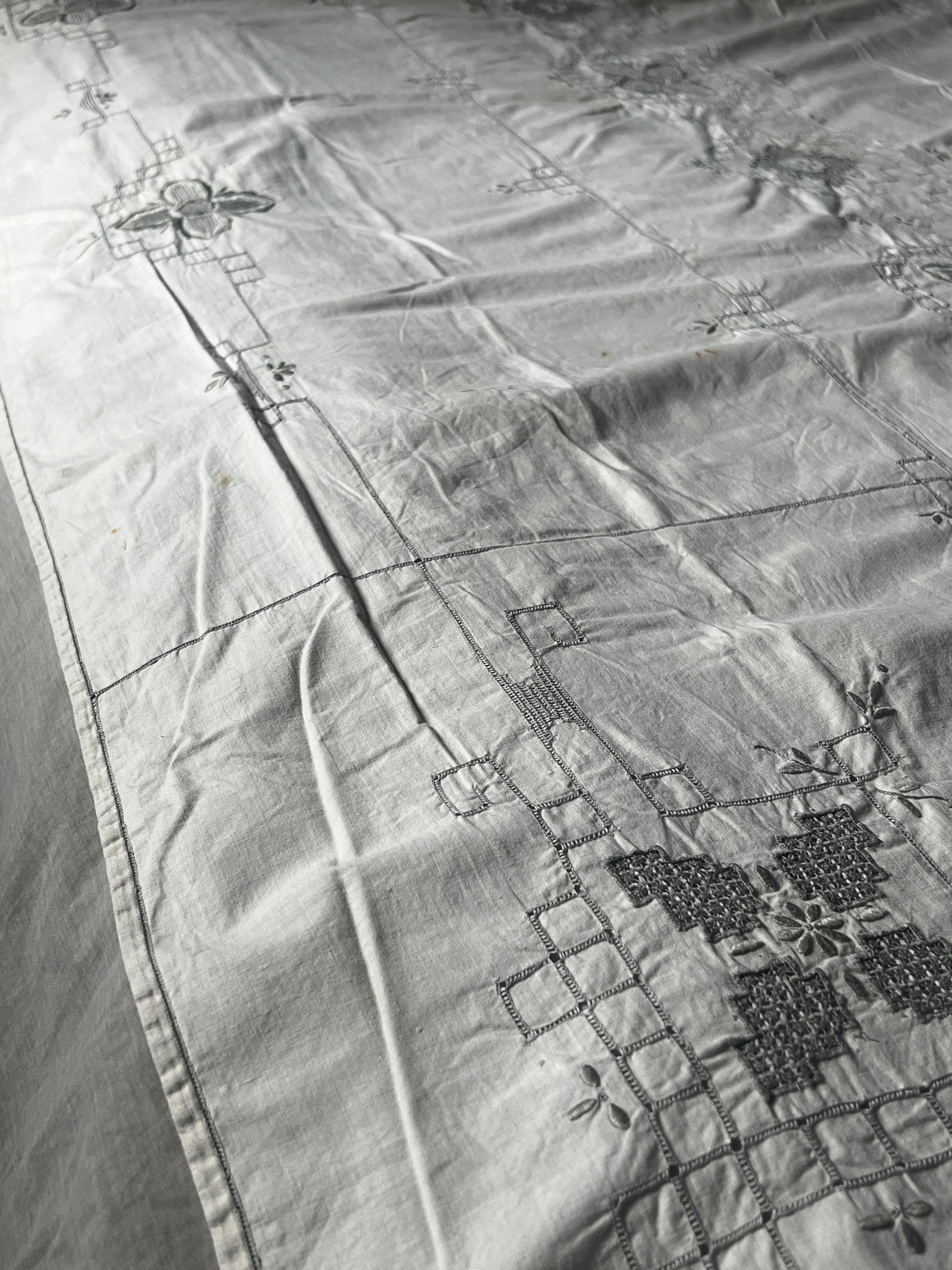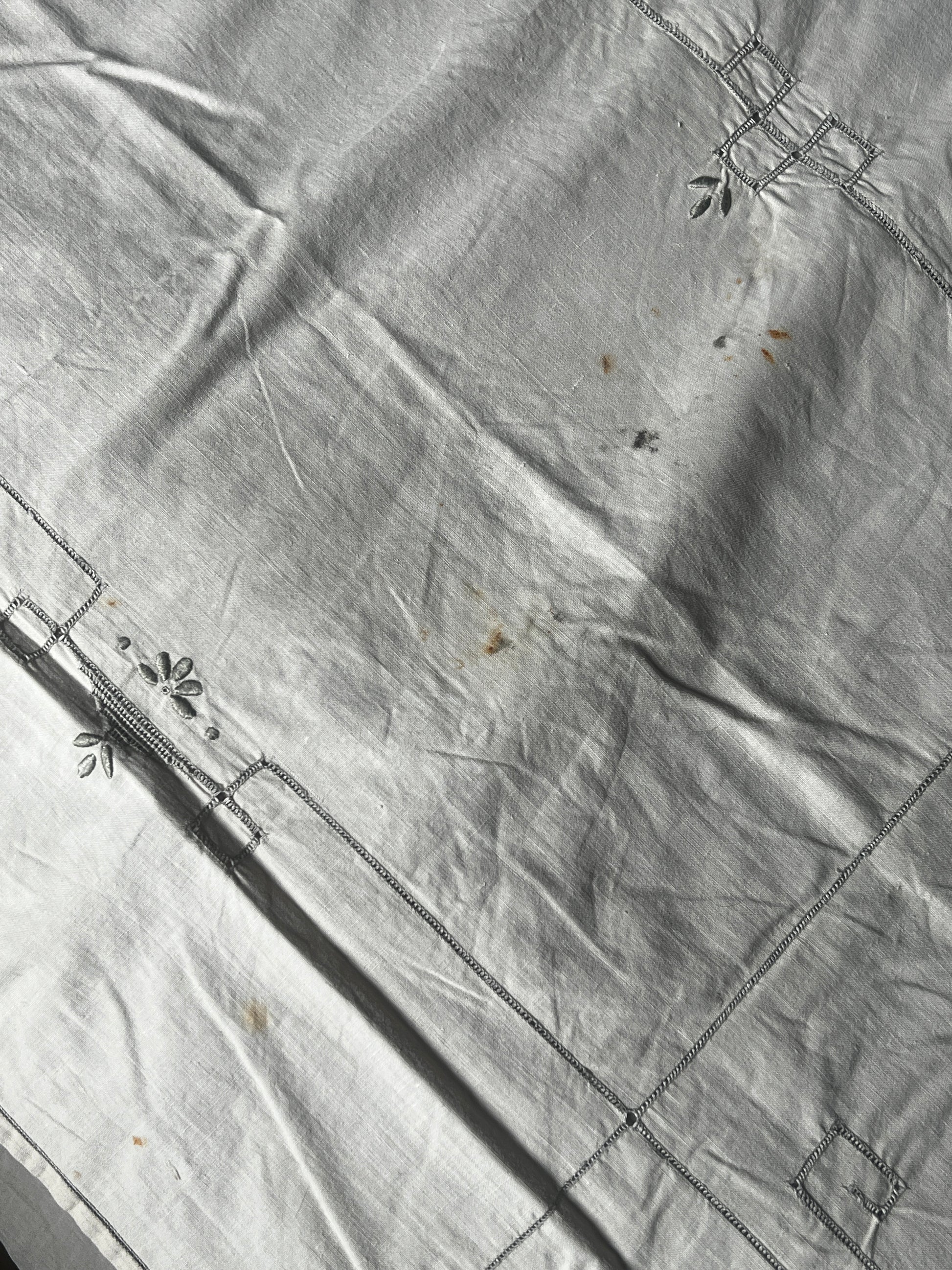 アイボリーカラーのコットン地にグレイベージュの糸で丁寧に刺繍が施された、マデイラ刺繍の大判クロスです