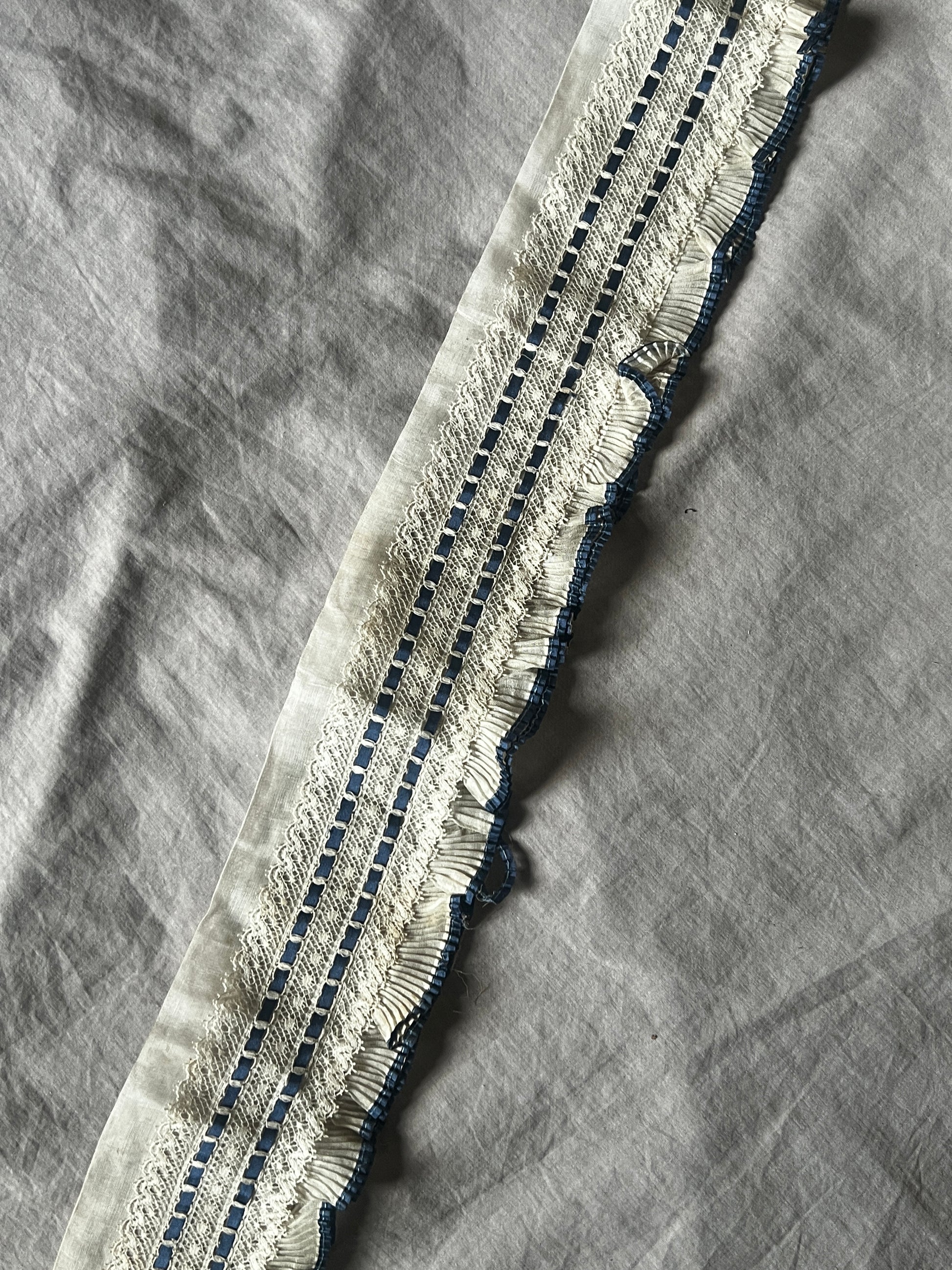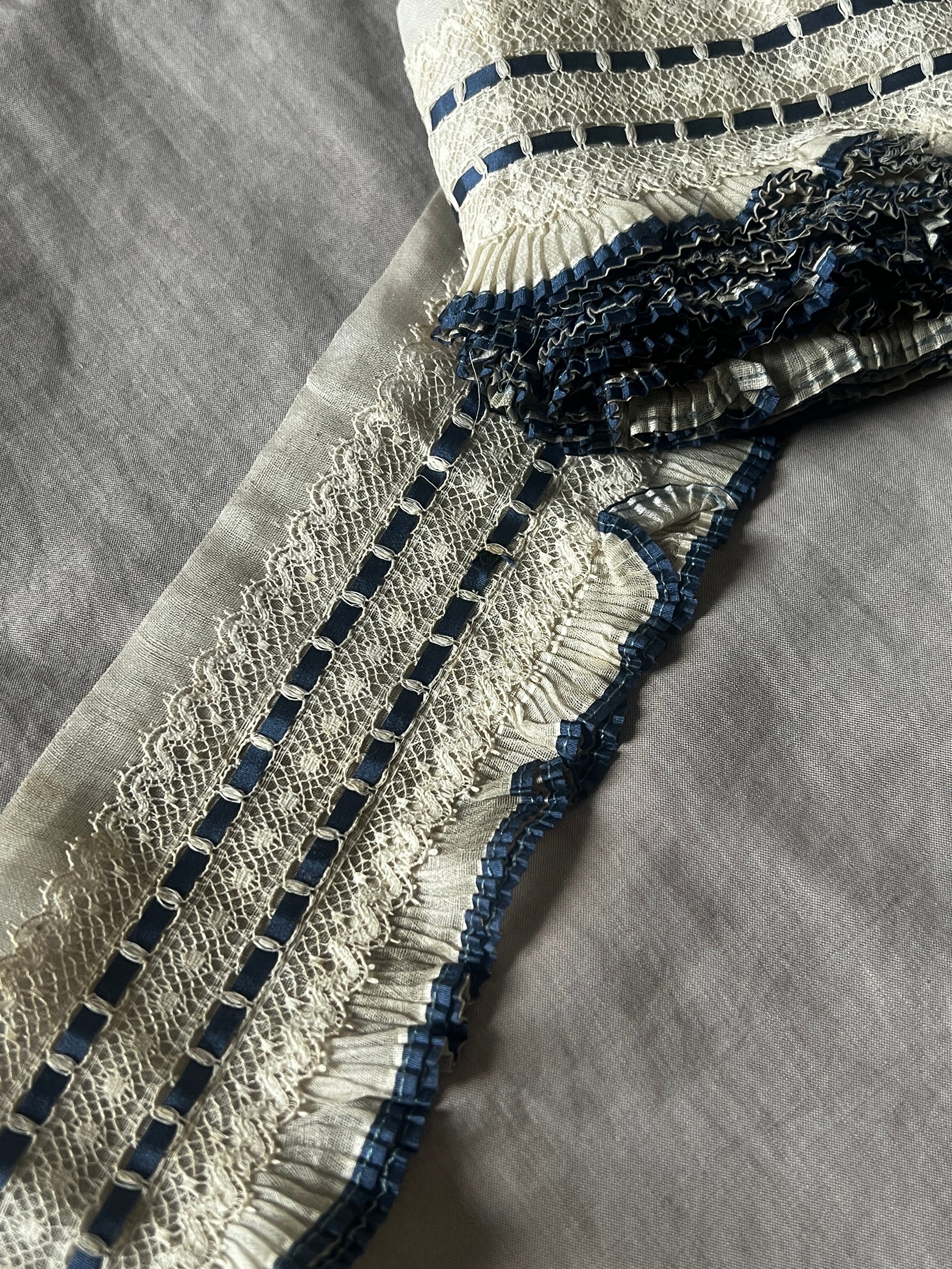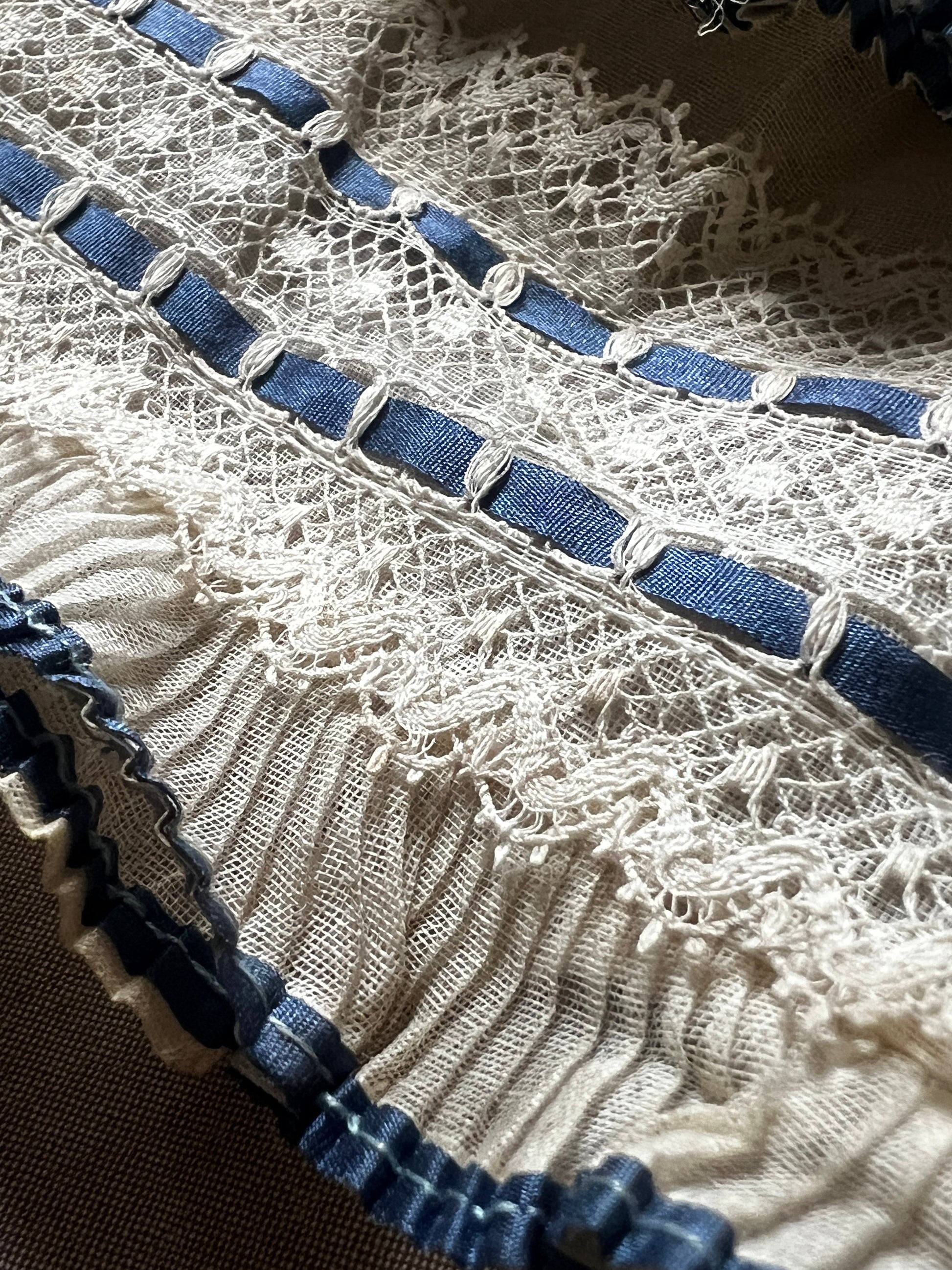 透け感のあるオーガンジー素材のプリーツに繊細なレースが重なり、深みのあるブルーのサテンリボンが静かに彩りを添える、優美な印象のデコラティブパーツです
