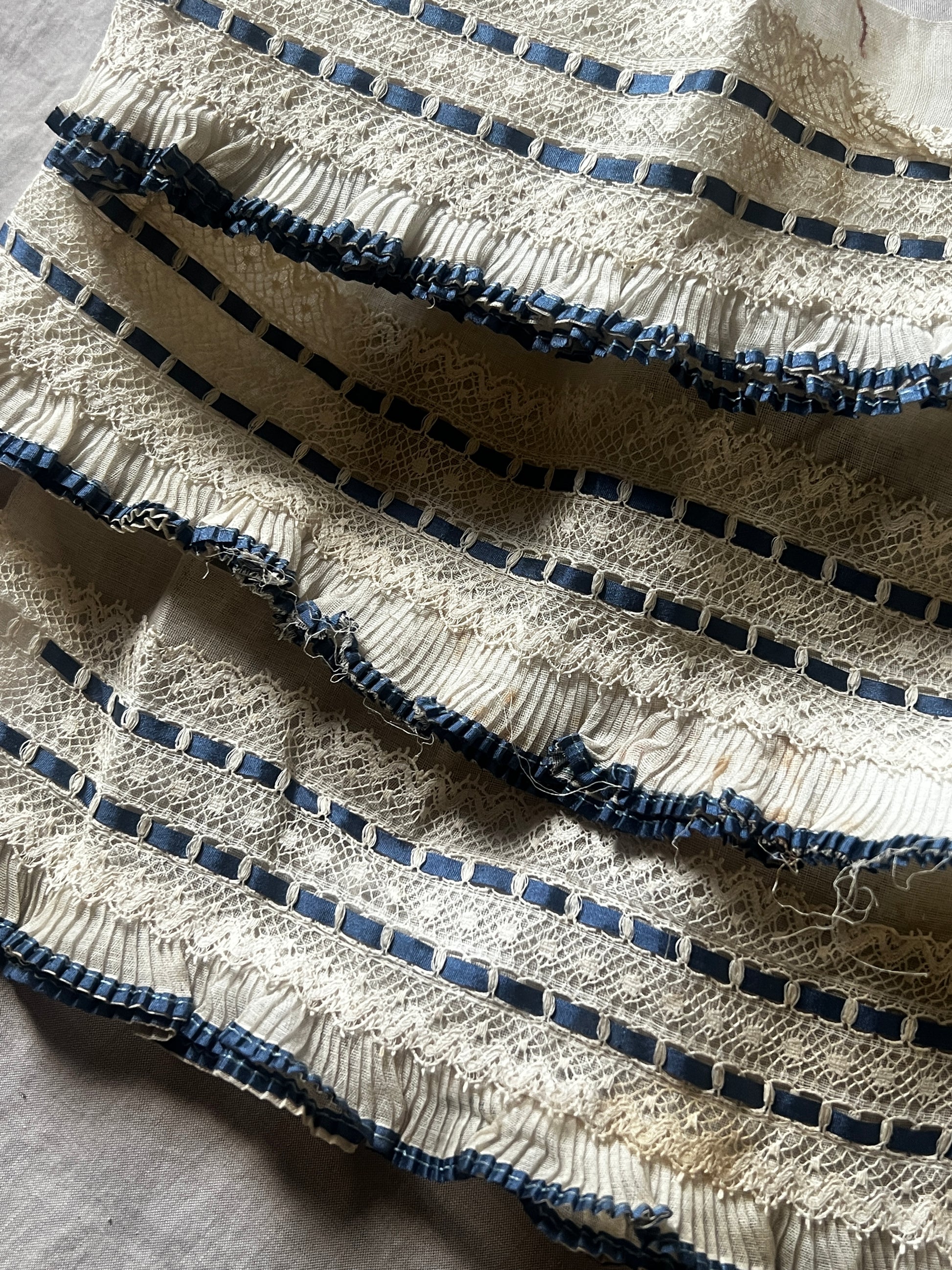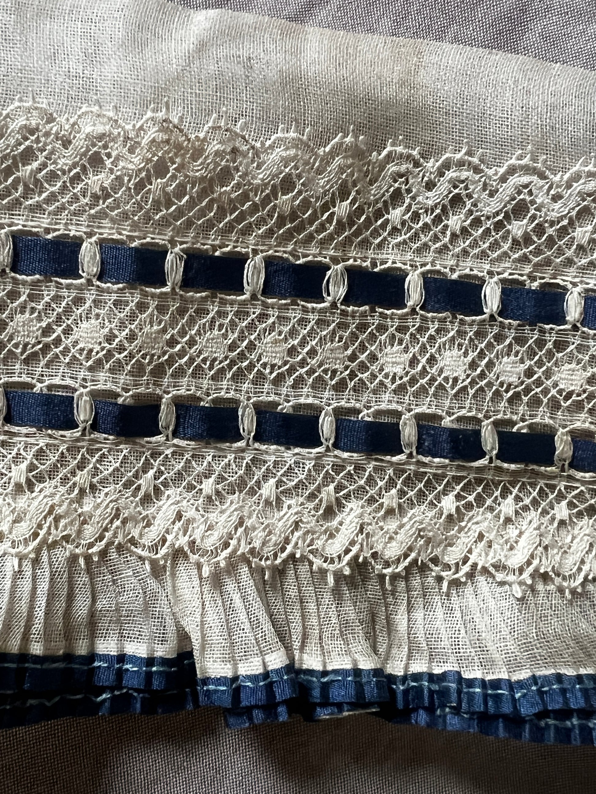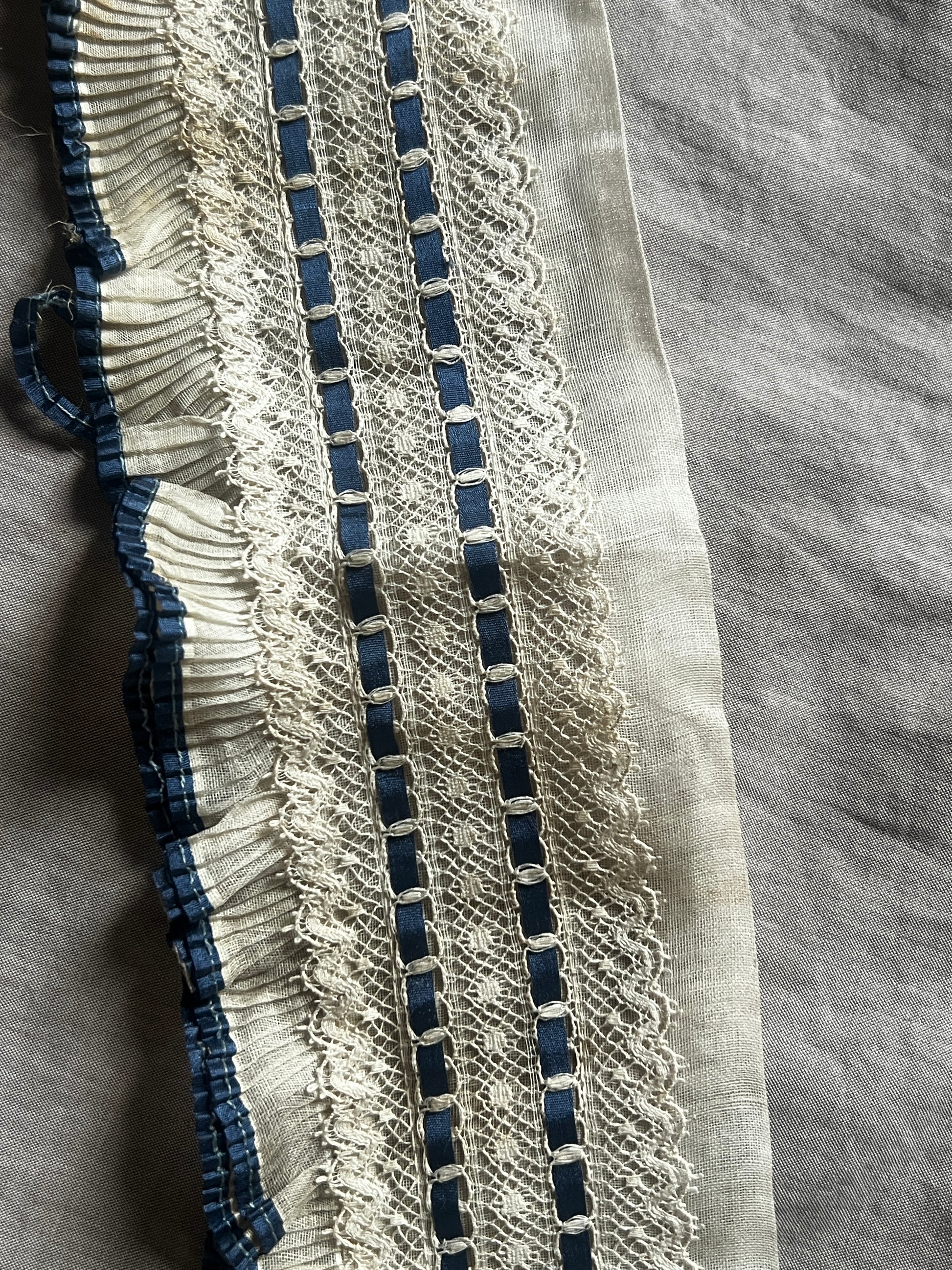 透け感のあるオーガンジー素材のプリーツに繊細なレースが重なり、深みのあるブルーのサテンリボンが静かに彩りを添える、優美な印象のデコラティブパーツです