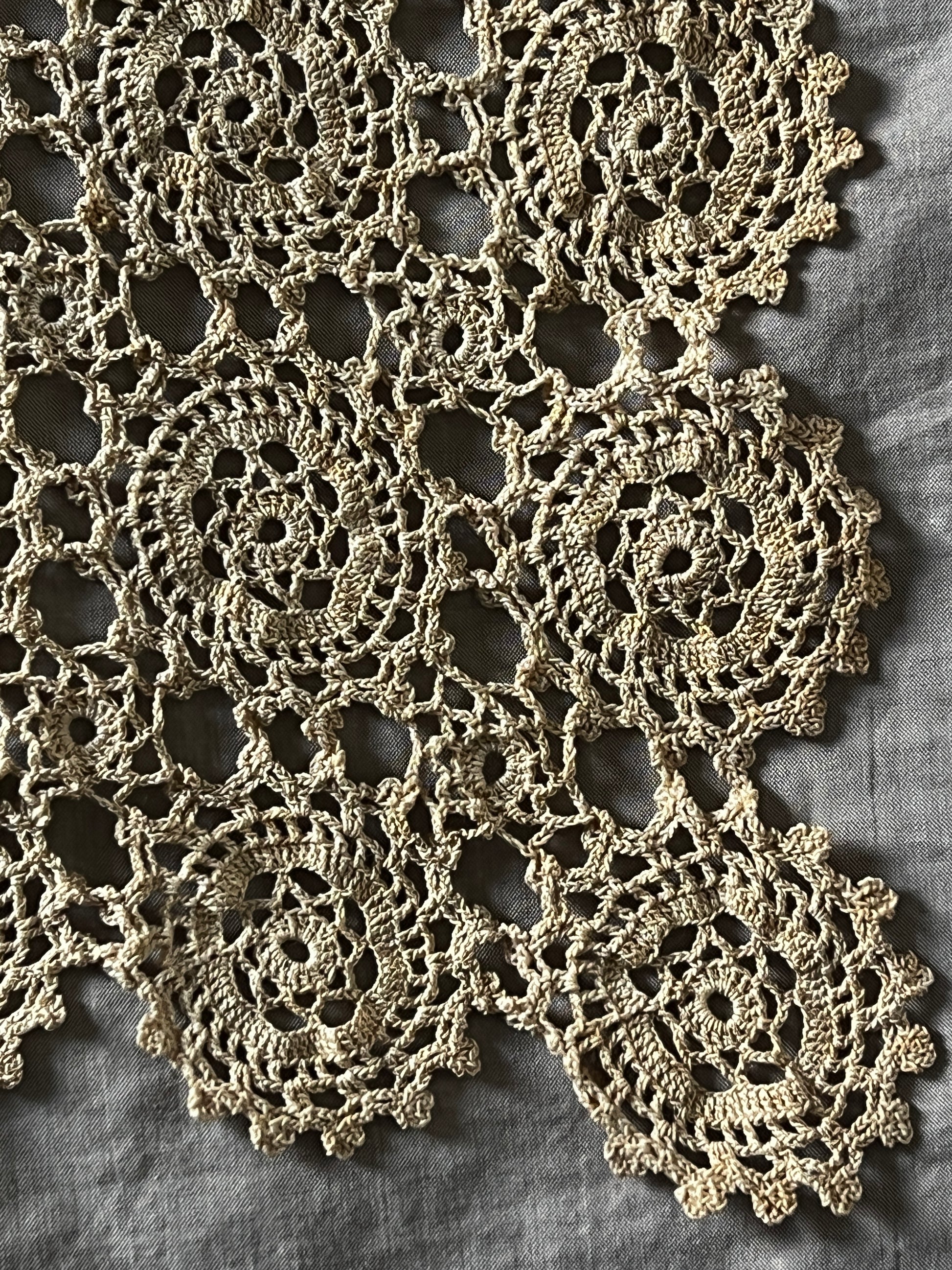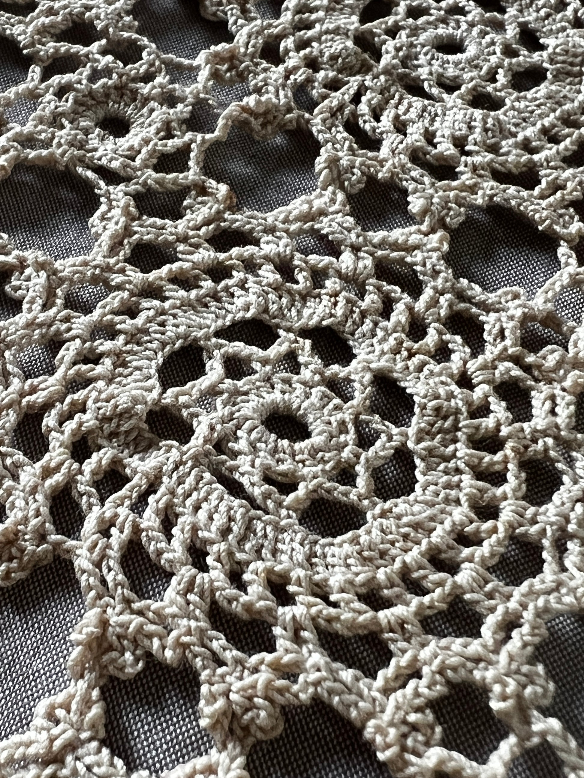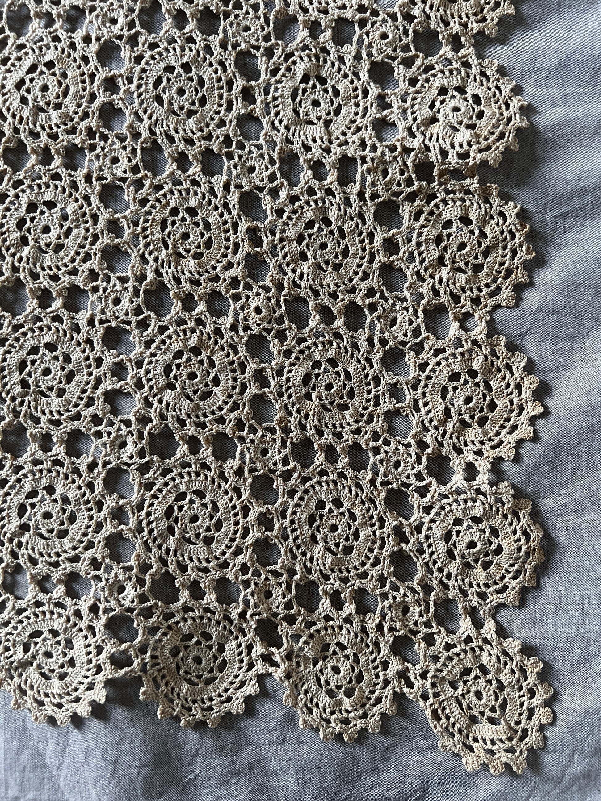 カフェオレカラーの糸で端正に編まれたクロシェレースのモチーフを、ひとつひとつ丁寧につなぎ合わせて作られた大判のクロスです