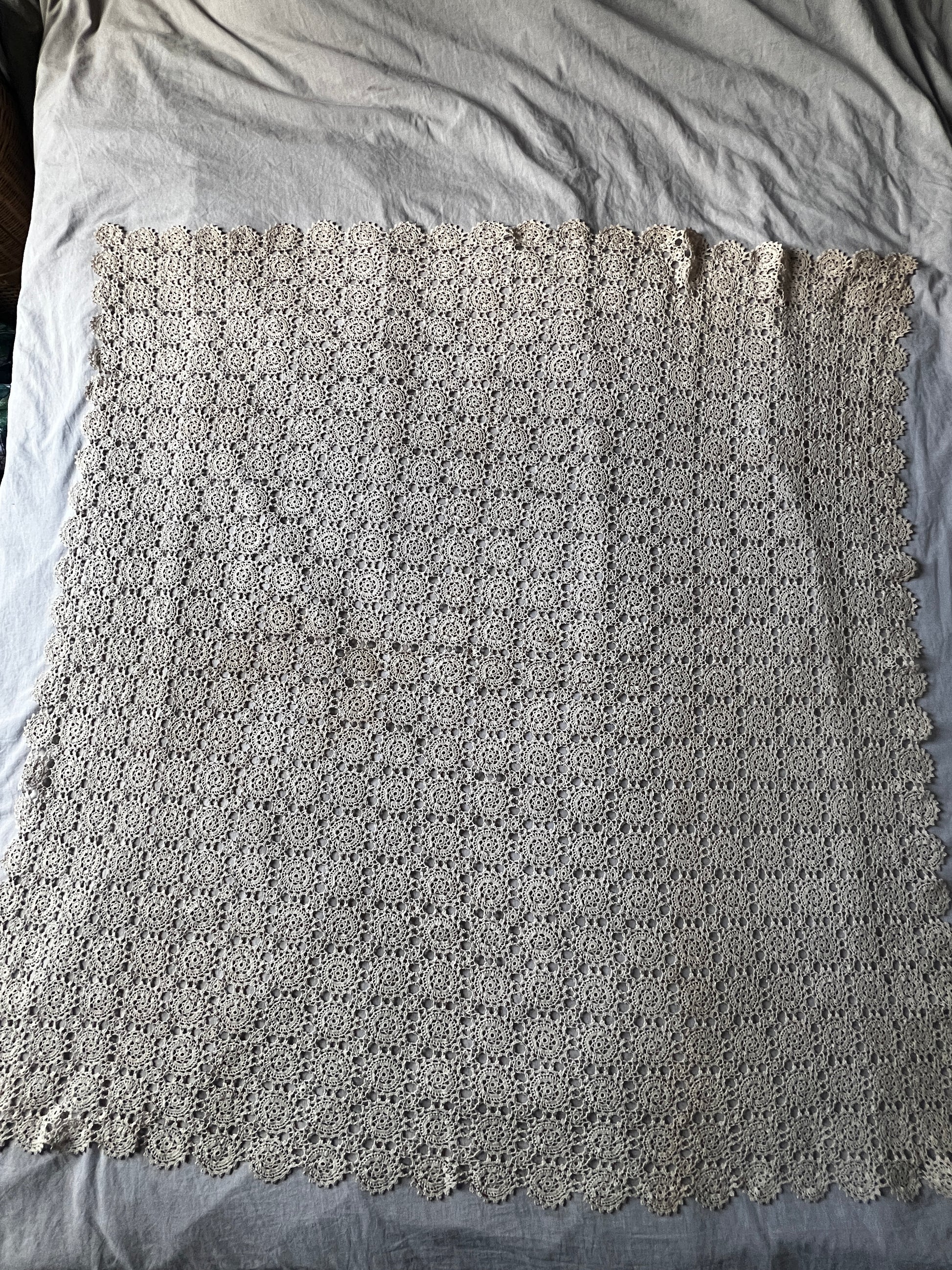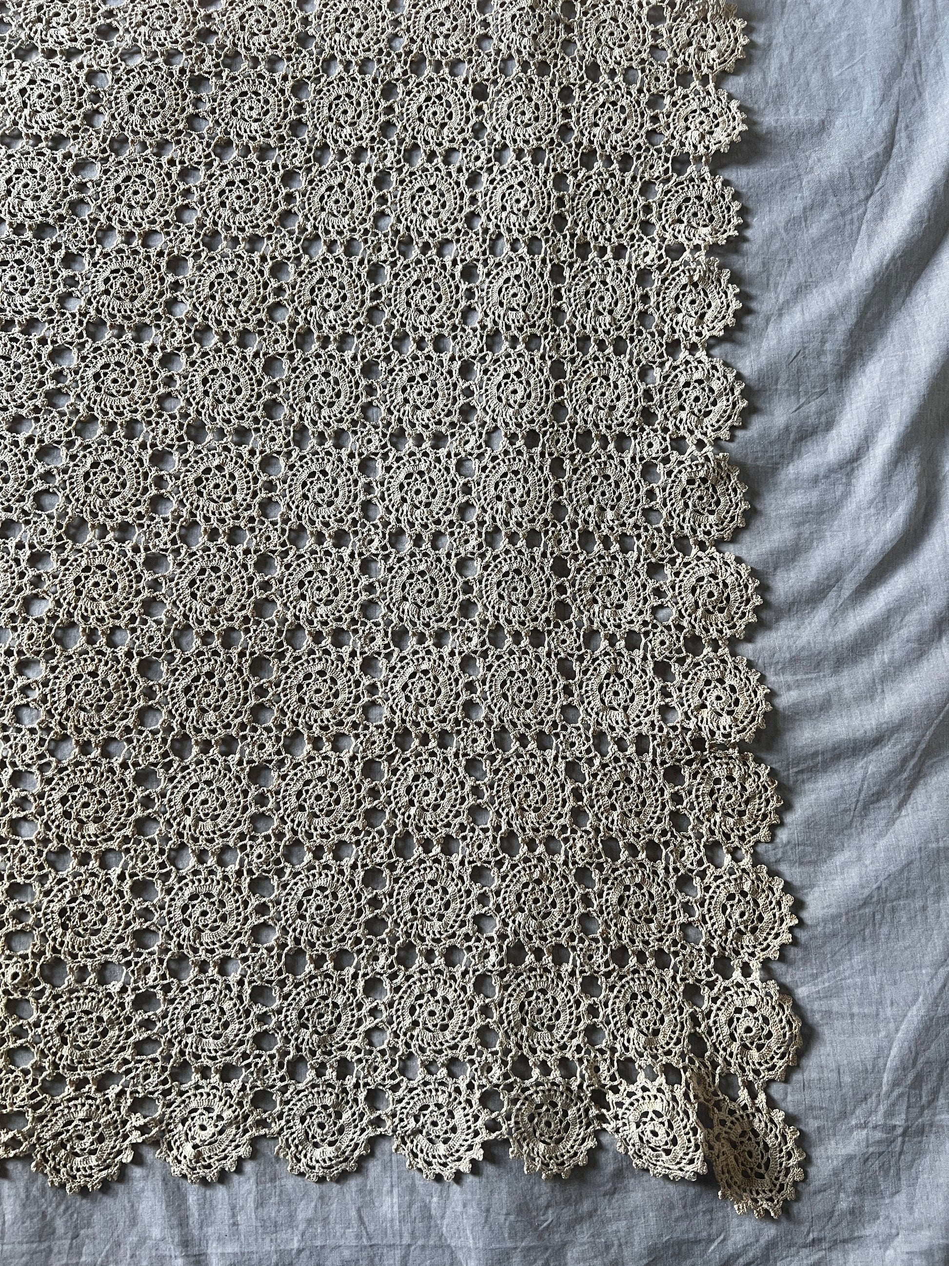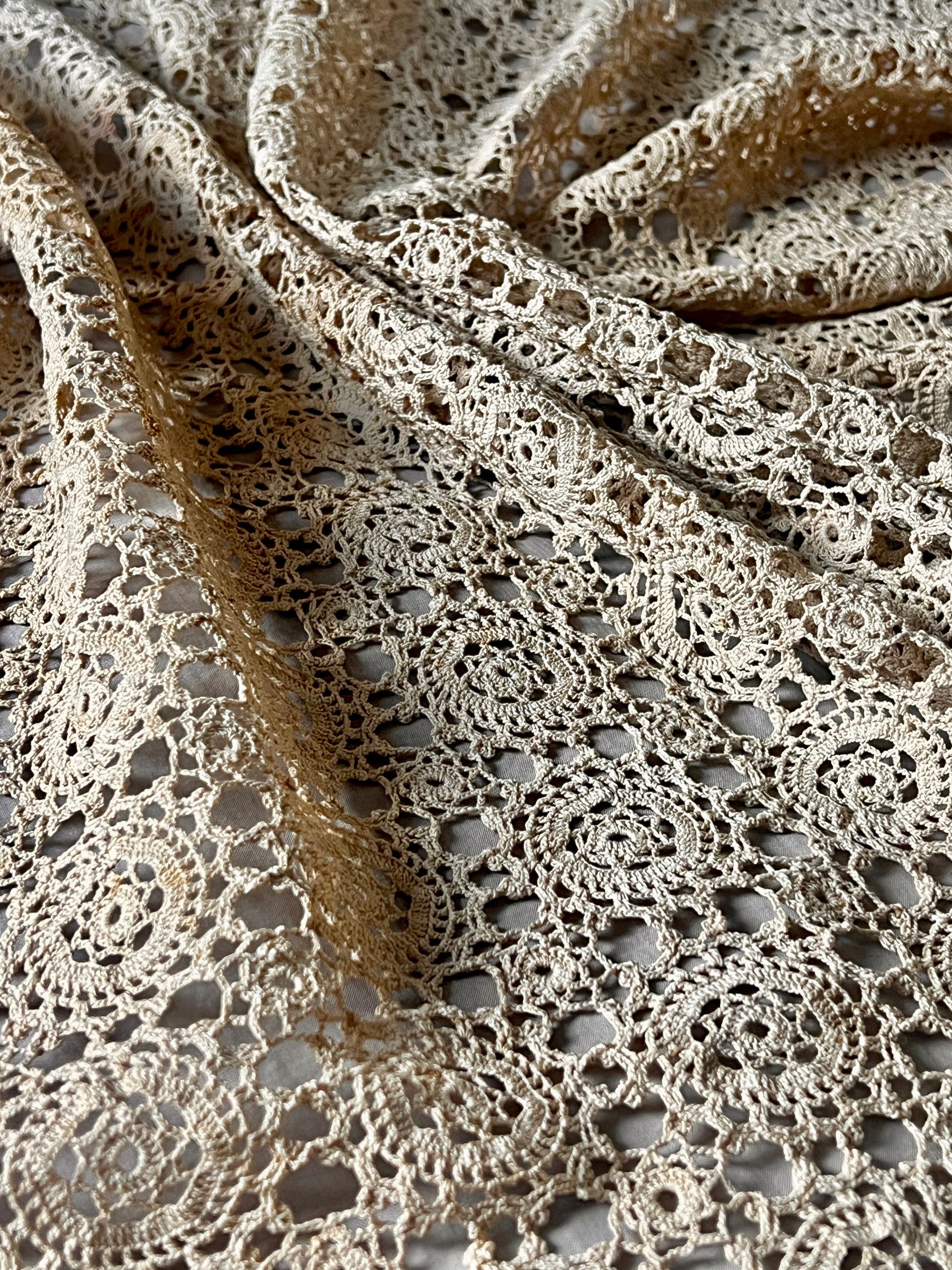 カフェオレカラーの糸で端正に編まれたクロシェレースのモチーフを、ひとつひとつ丁寧につなぎ合わせて作られた大判のクロスです